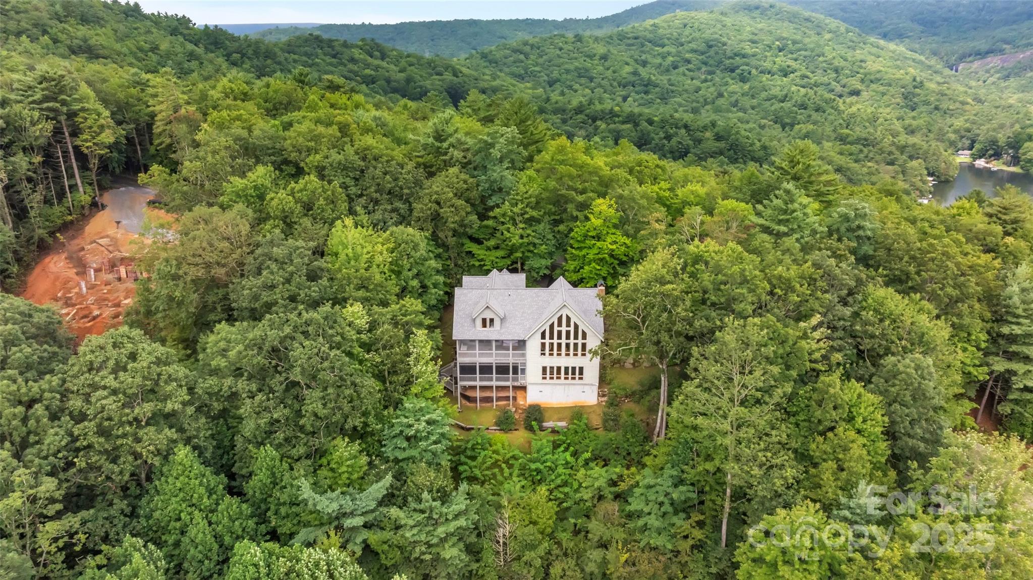 Spacious 4 BR, 4.5 BA custom home with panoramic views of Lake Toxaway, the Blue Ridge Parkway, and surrounding mountains. Conveniently located on Lakeside Mountain, this stunning home features a new roof, extensive wood paneling, heart pine floors, two massive stone fireplaces, an open floor plan with vaulted ceilings, two large covered, screened porches, covered parking, and an expansive circular drive. This is the perfect full-time home or vacation getaway in beautiful Lake Toxaway.