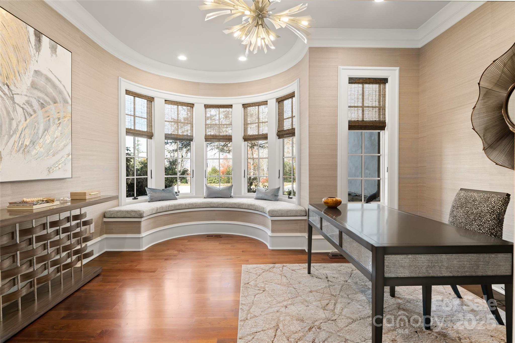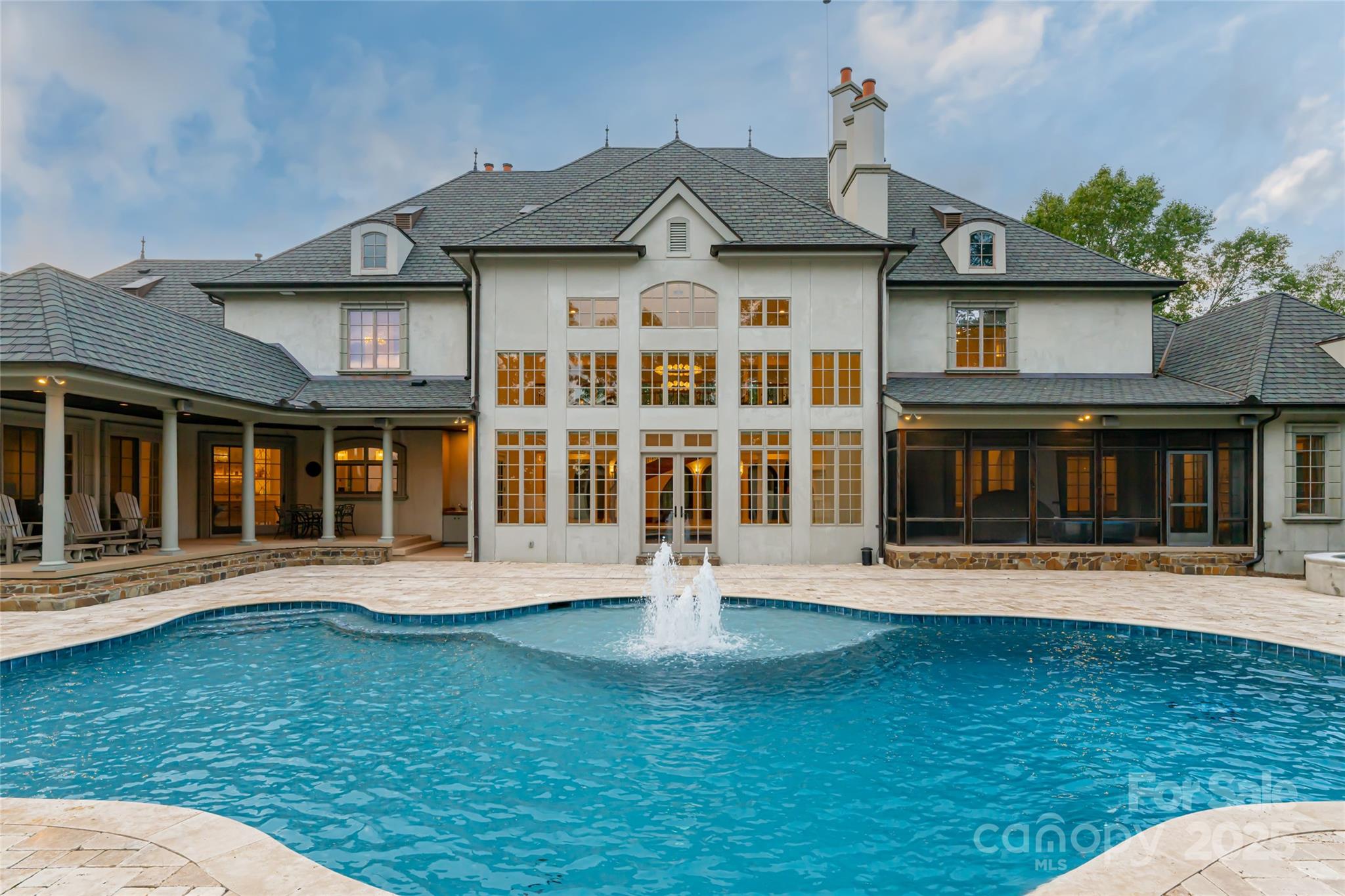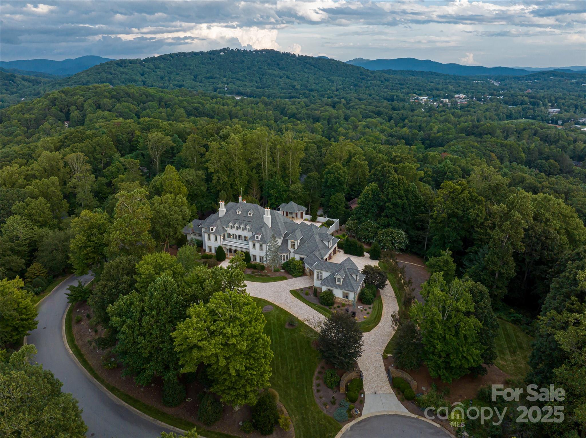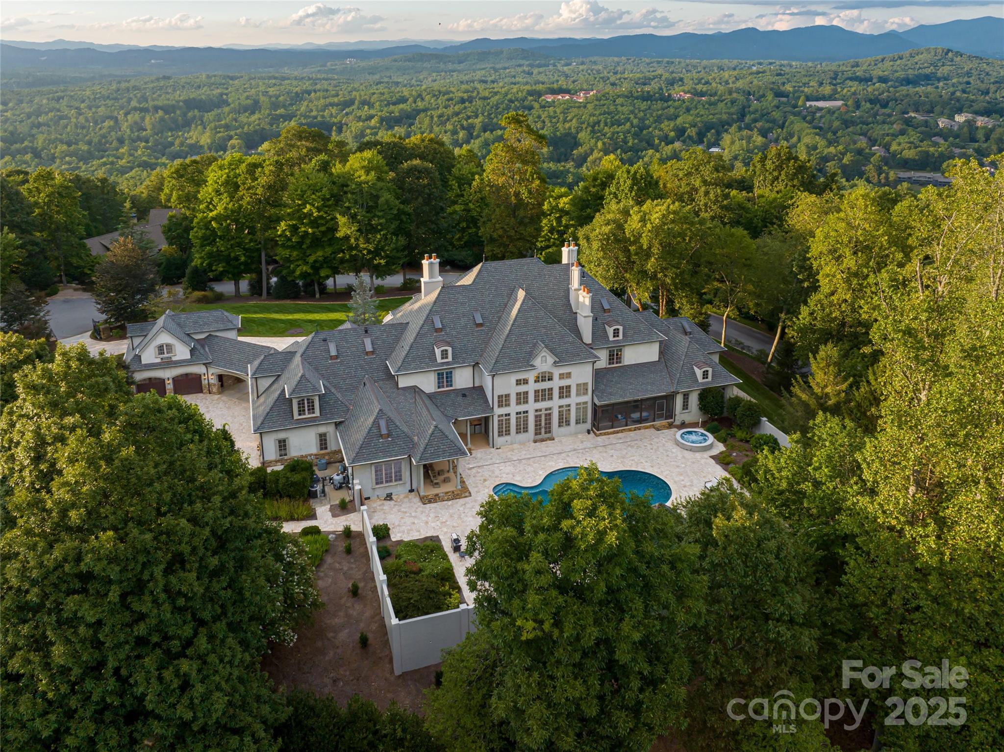 Set atop a quiet ridge in Biltmore Park, this estate spans 2.51 acres of level, landscaped land with seasonal mountain views. Designed with the timeless appeal of a French château, the residence has been fully upgraded to balance classical architecture with refined modern interiors. The two-story foyer opens to a dramatic spiral staircase, floor-to-ceiling fireplace, and expansive windows. The living room connects seamlessly to a private outdoor retreat featuring a newly refinished pool and spa, pool house, and covered porch—ideal for relaxing or entertaining. The main-level owner’s wing includes new black walnut hardwood floors, a parlor with marble fireplace, and an elegant primary bath with a backlit Cristallo quartzite wall, whirlpool tub, marble walk-in shower, quartzite benches, dual vanities, and dual closets with an in-suite washer and dryer. The re-imagined kitchen features custom cabinetry, new appliances, tower wine refrigerator, mixed-metal range hood, and a blend of granite and quartzite countertops. It opens to a cozy keeping room with fireplace and direct access to the poolside living area. Upstairs are four en-suite bedrooms, a bonus room, and a secondary laundry room. A cobblestone circular drive leads to an attached three-car garage and a detached two-car garage with a bonus room above. You will find the perfect harmony of classic architectural beauty and modern luxury within this estate, offering a lifestyle that’s unparalleled in both elegance and comfort. Welcome home to your private retreat at the pinnacle of Biltmore Park~