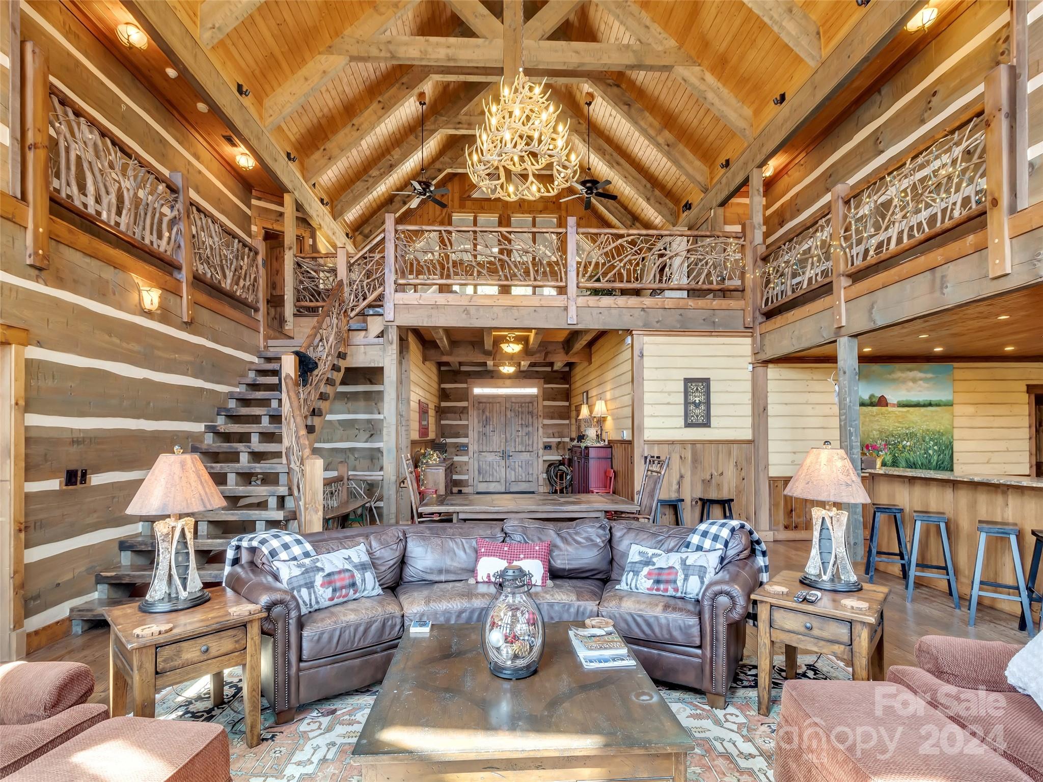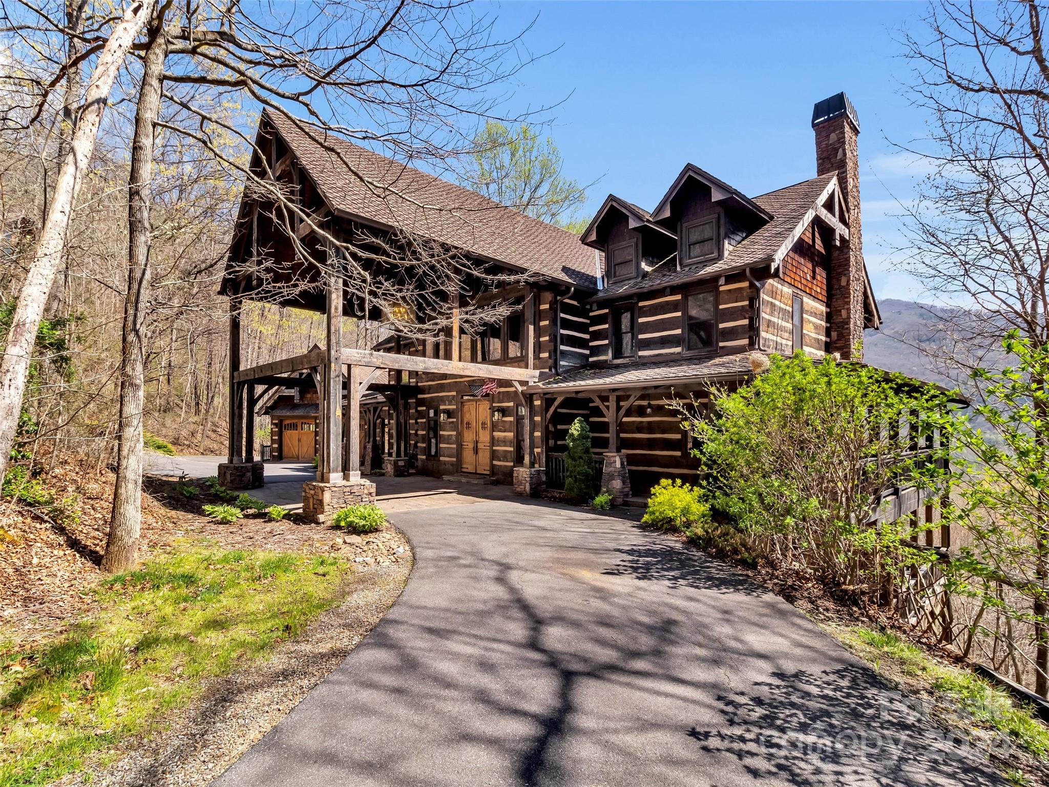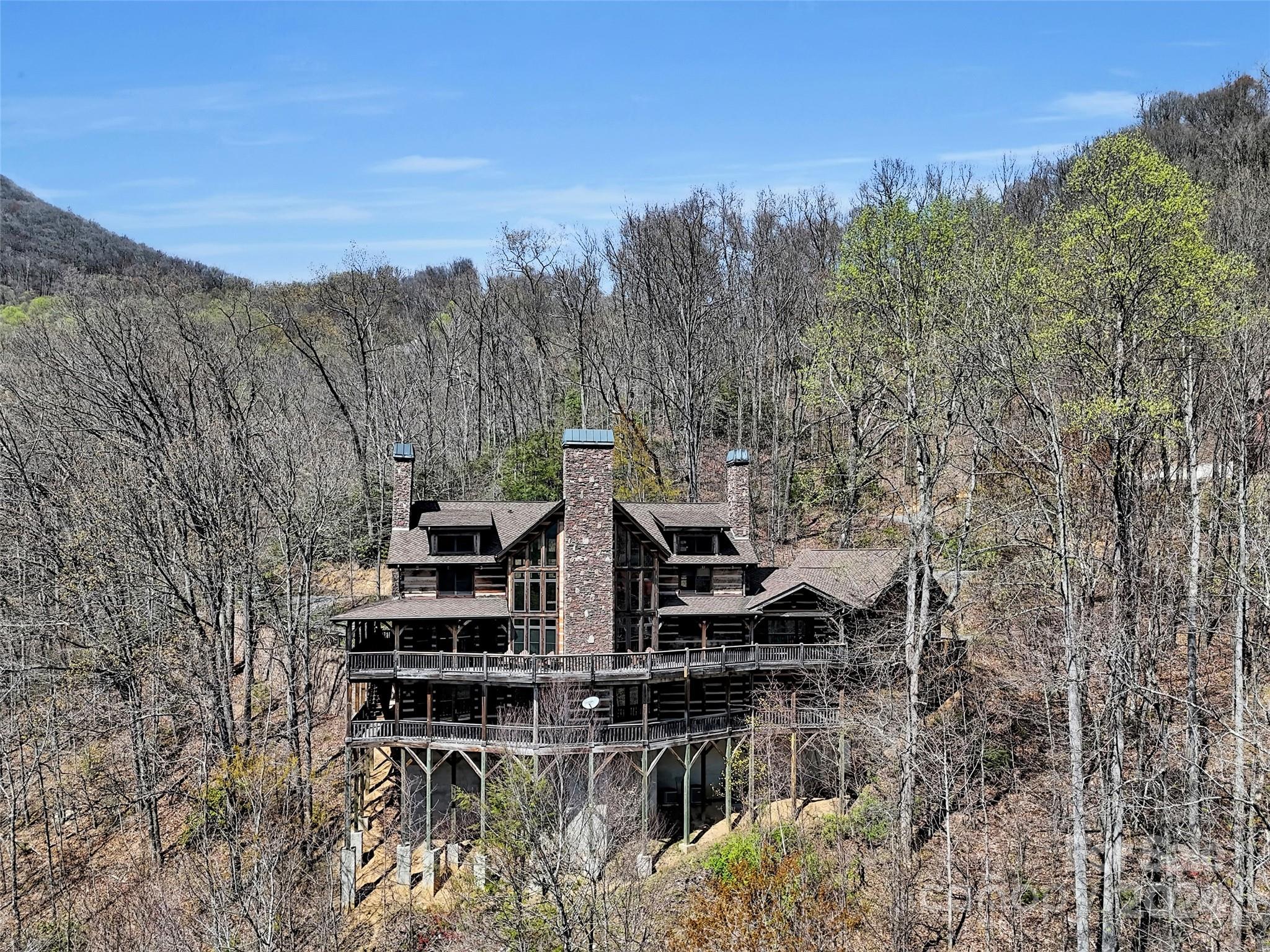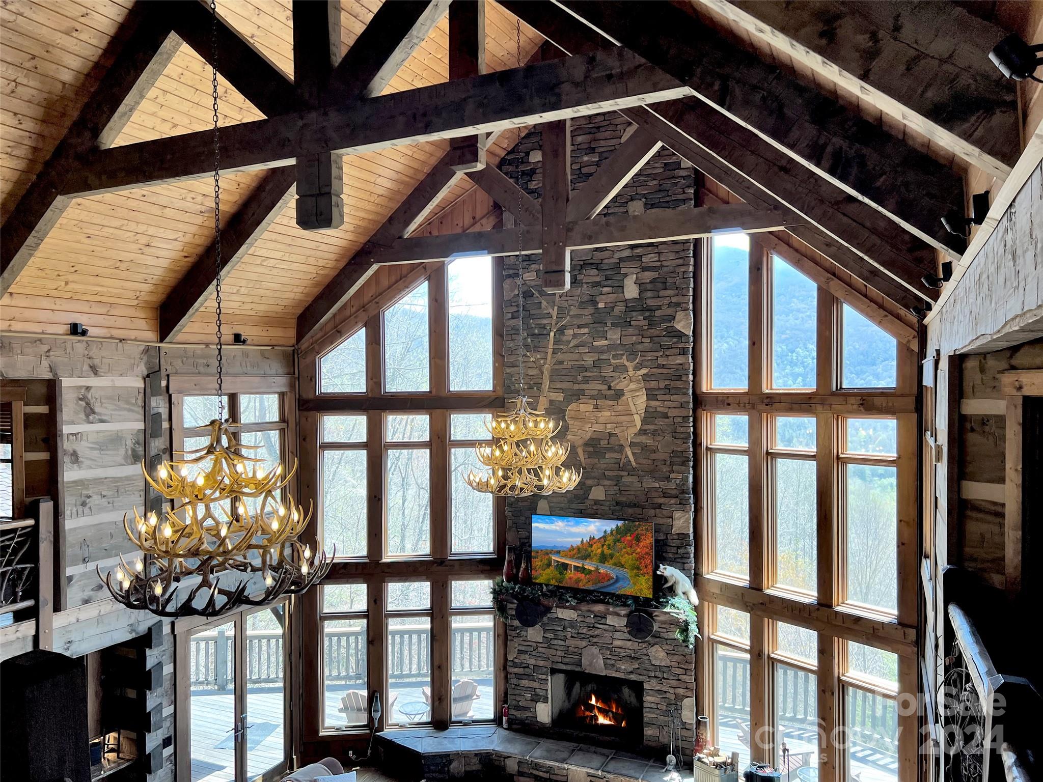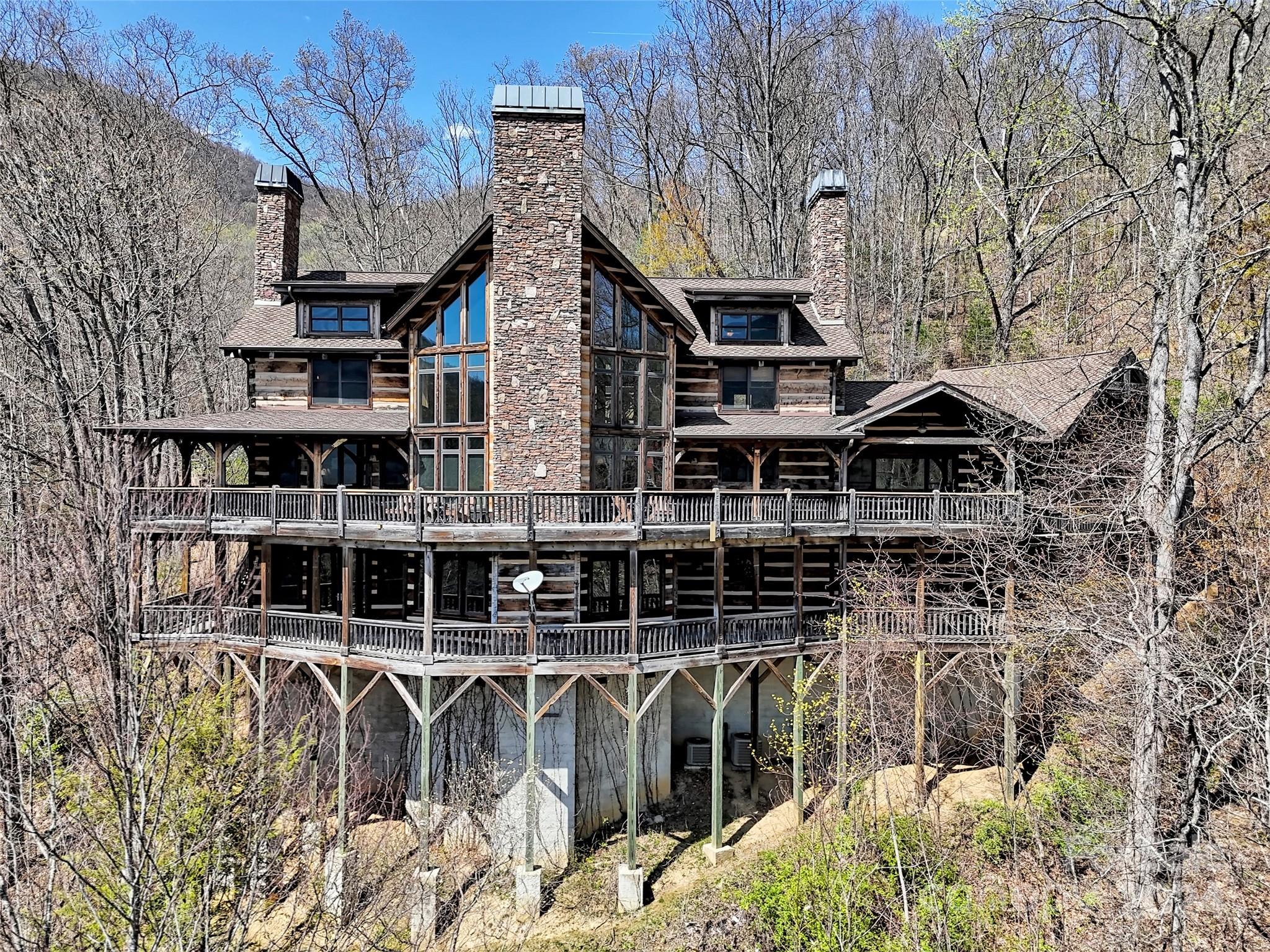 Price drop $555k/($3.3m+ recent appraisal), IMMEDIATE EQUITY & STR $100k+ per year,extraordinary 5 BR/5.5 bath log home, sprawling 8,300+ sq ft on 2.11-acres in tranquil Scarlet Oaks community nestled within Maggie Valley CC amenities. This architectural masterpiece embodies luxurious mtn. living w/open, airy floor plan, private library, bathed in natural light, complements the awe-inspiring 29+ ft floor-to-ceiling custom stone FP, gourmet kitchen features grand island w/built-in wine rack, bespoke cabinetry, granite counter tops, breakfast bar, & top-tier appliances, flowing effortlessly to generous din area & great rm showcasing panoramic mountain vistas. The primary suite is a sanctuary w/own stone FP, decadent jet soaker tub,spacious walk-in shower. Upper level offers 3 BR 2 baths, versatile open loft overlooking the expansive great rm. The basement elevates entertainment w/large family rm featuring another striking stone fireplace,2 rec rooms, bonus room, & full bath.
