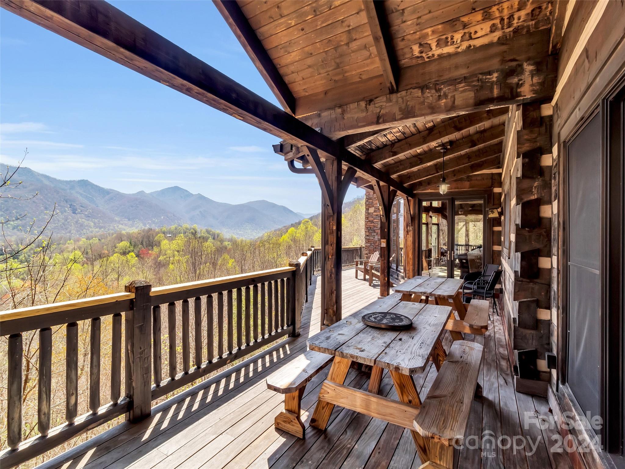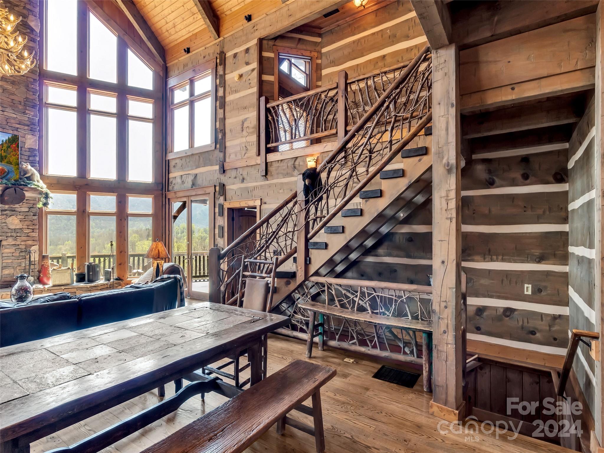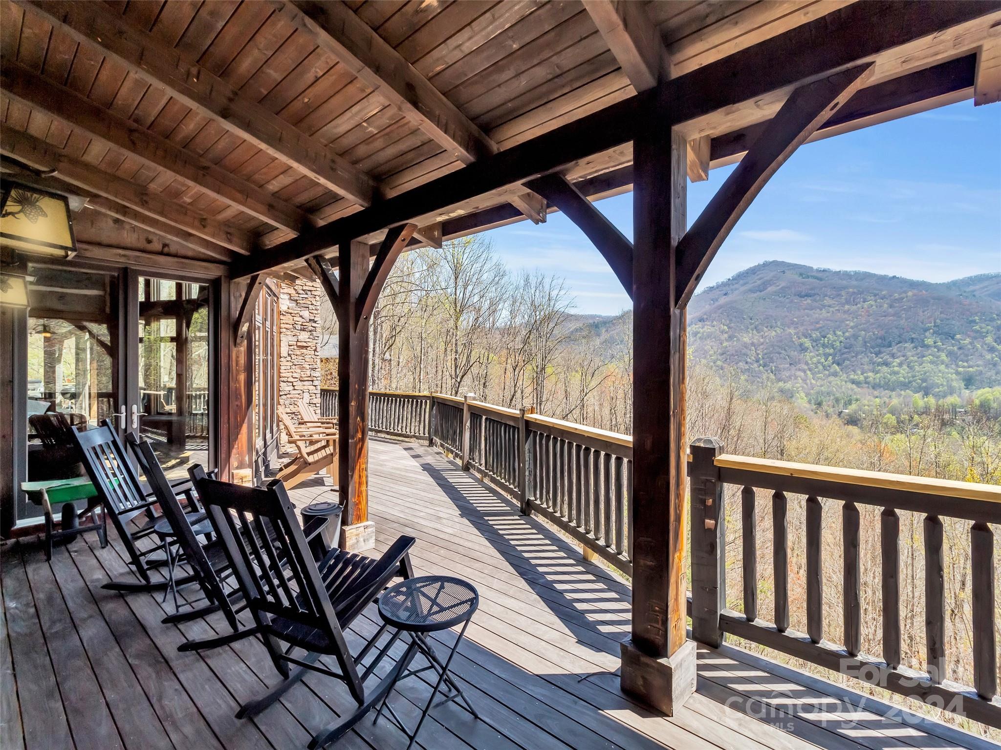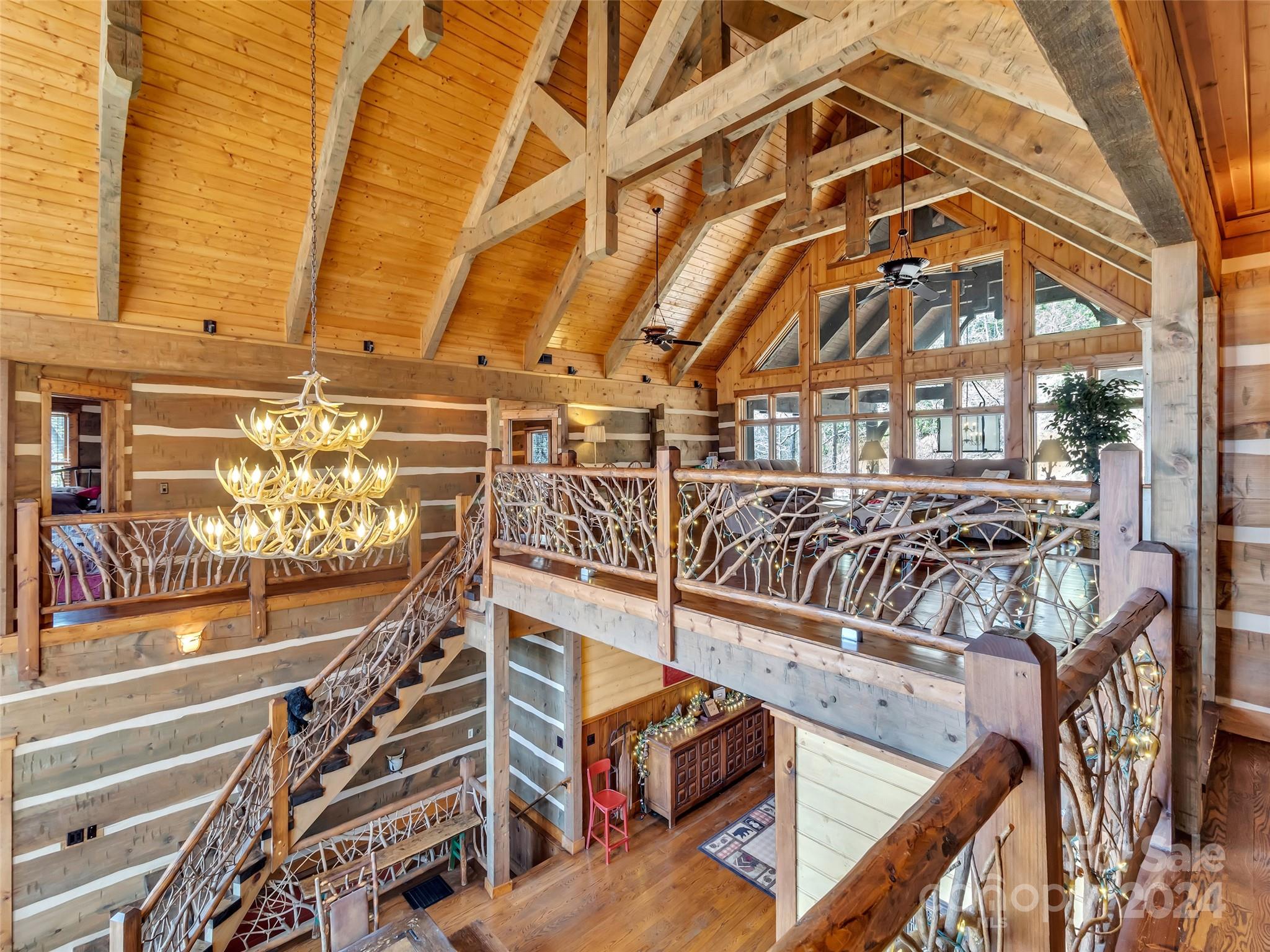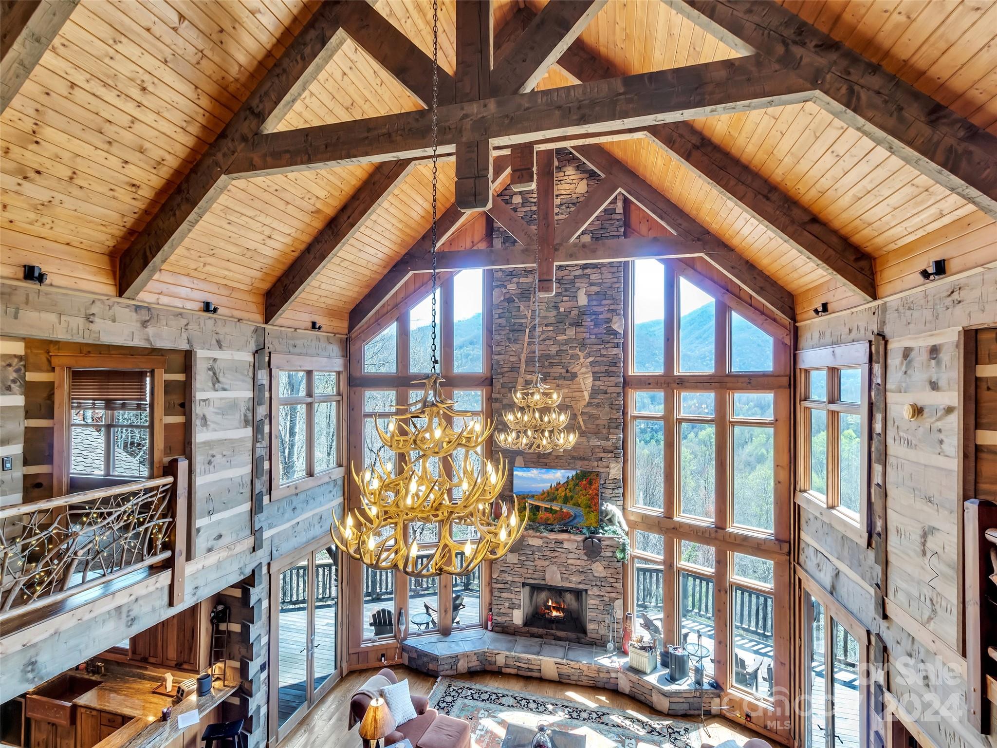 Price drop $555k/($3.3m+ recent appraisal), IMMEDIATE EQUITY & STR $100k+ per year,extraordinary 5 BR/5.5 bath log home, sprawling 8,300+ sq ft on 2.11-acres in tranquil Scarlet Oaks community nestled within Maggie Valley CC amenities. This architectural masterpiece embodies luxurious mtn. living w/open, airy floor plan, private library, bathed in natural light, complements the awe-inspiring 29+ ft floor-to-ceiling custom stone FP, gourmet kitchen features grand island w/built-in wine rack, bespoke cabinetry, granite counter tops, breakfast bar, & top-tier appliances, flowing effortlessly to generous din area & great rm showcasing panoramic mountain vistas. The primary suite is a sanctuary w/own stone FP, decadent jet soaker tub,spacious walk-in shower. Upper level offers 3 BR 2 baths, versatile open loft overlooking the expansive great rm. The basement elevates entertainment w/large family rm featuring another striking stone fireplace,2 rec rooms, bonus room, & full bath.