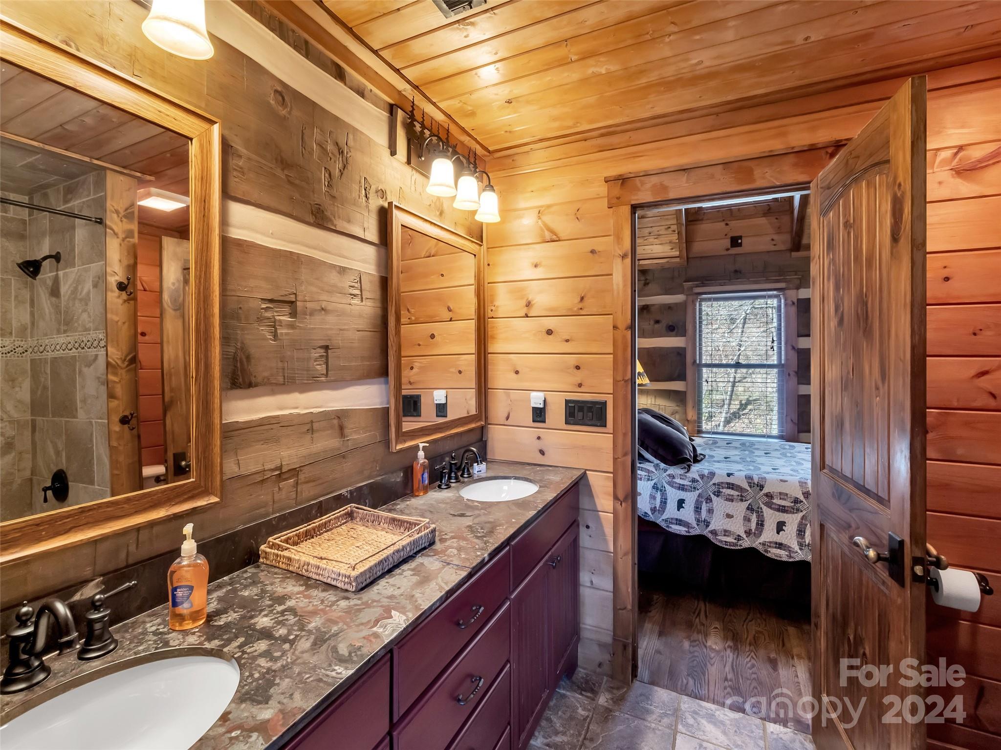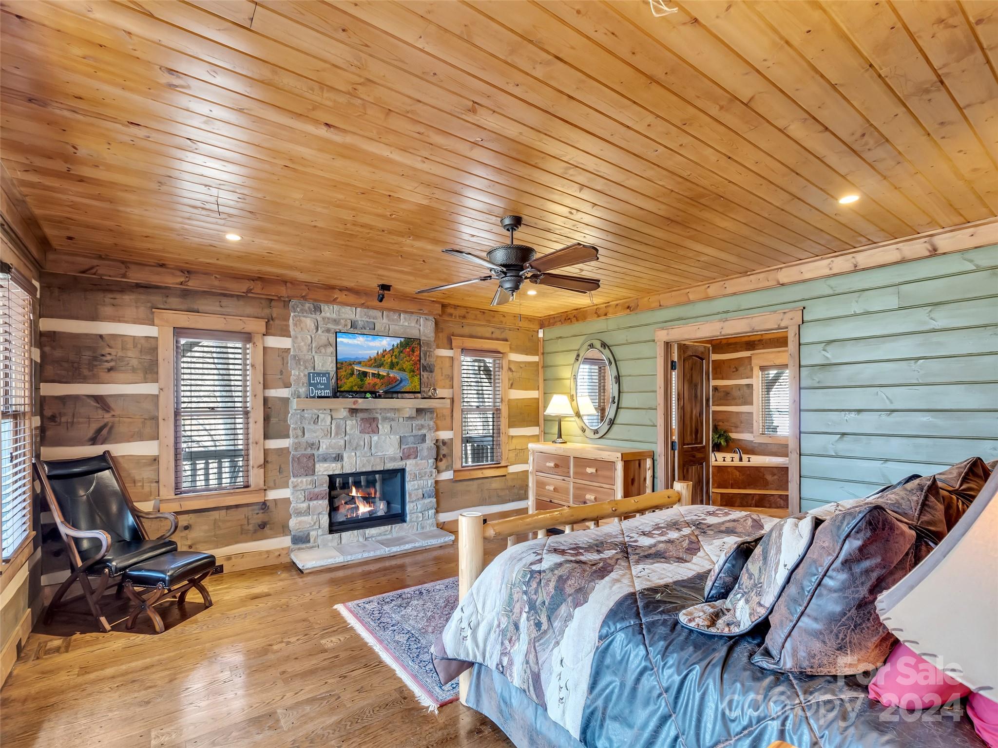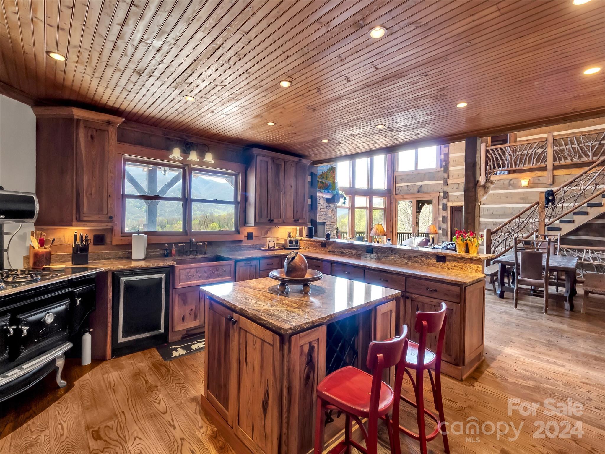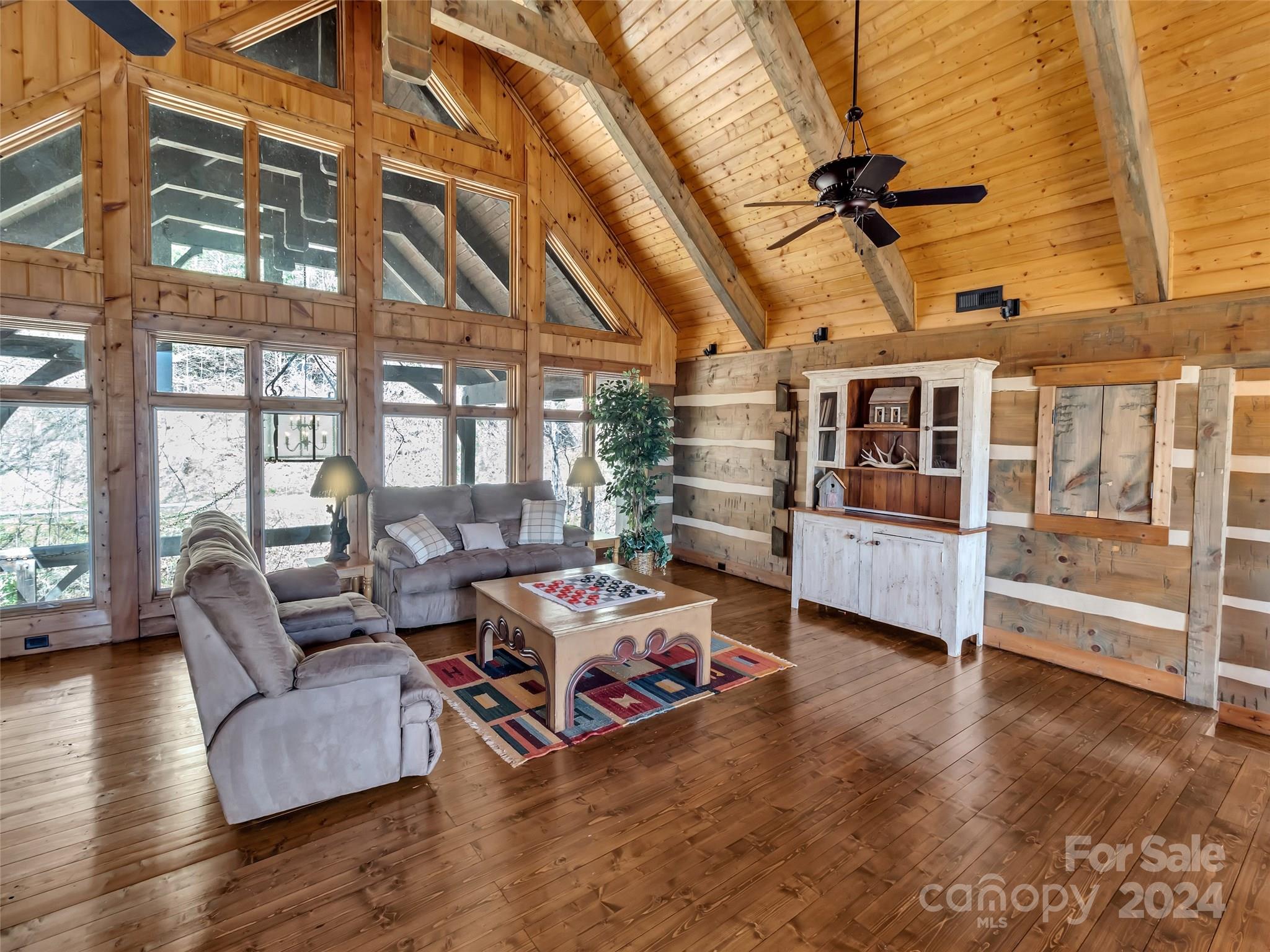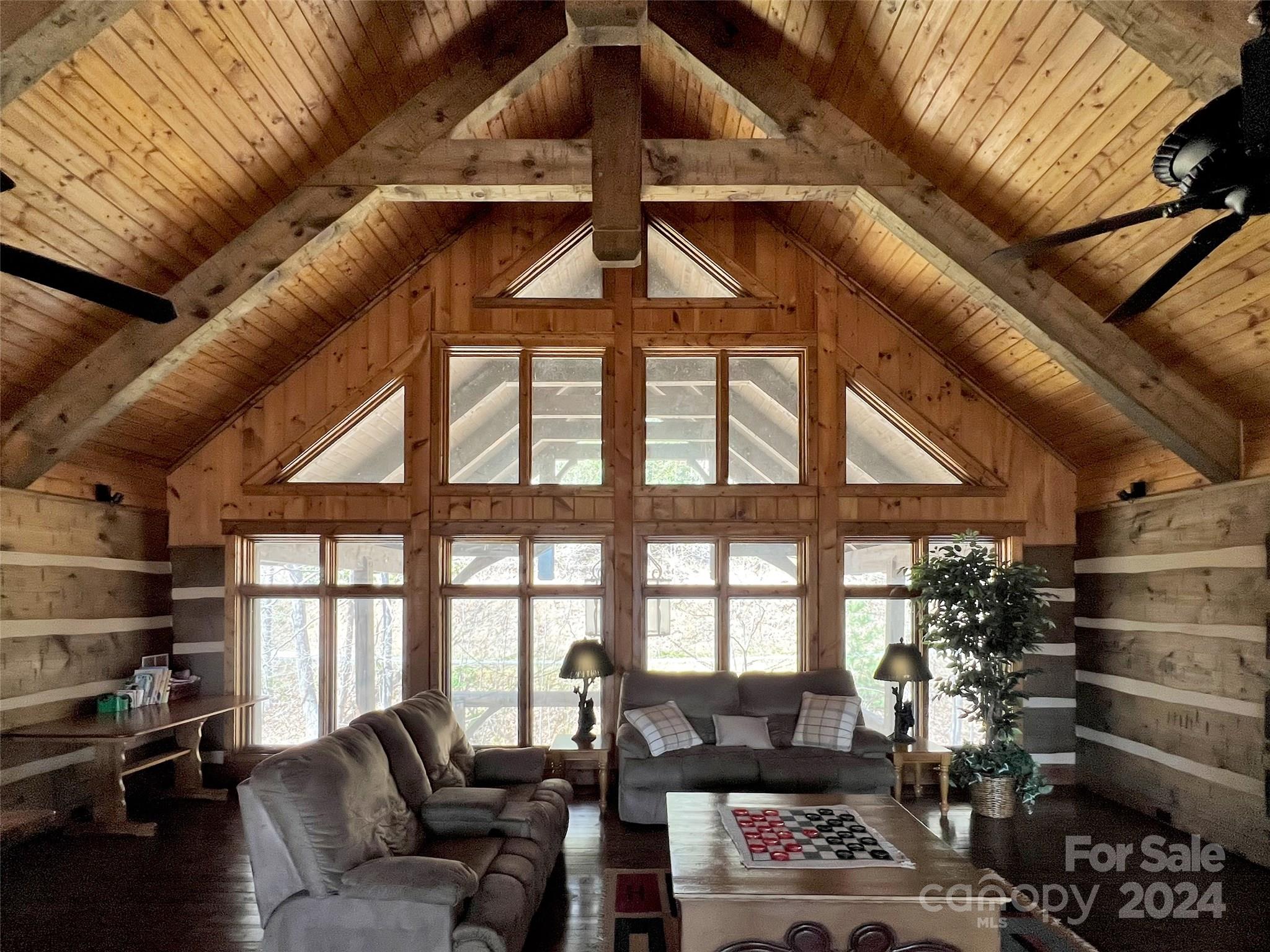 Price drop $555k/($3.3m+ recent appraisal), IMMEDIATE EQUITY & STR $100k+ per year,extraordinary 5 BR/5.5 bath log home, sprawling 8,300+ sq ft on 2.11-acres in tranquil Scarlet Oaks community nestled within Maggie Valley CC amenities. This architectural masterpiece embodies luxurious mtn. living w/open, airy floor plan, private library, bathed in natural light, complements the awe-inspiring 29+ ft floor-to-ceiling custom stone FP, gourmet kitchen features grand island w/built-in wine rack, bespoke cabinetry, granite counter tops, breakfast bar, & top-tier appliances, flowing effortlessly to generous din area & great rm showcasing panoramic mountain vistas. The primary suite is a sanctuary w/own stone FP, decadent jet soaker tub,spacious walk-in shower. Upper level offers 3 BR 2 baths, versatile open loft overlooking the expansive great rm. The basement elevates entertainment w/large family rm featuring another striking stone fireplace,2 rec rooms, bonus room, & full bath.