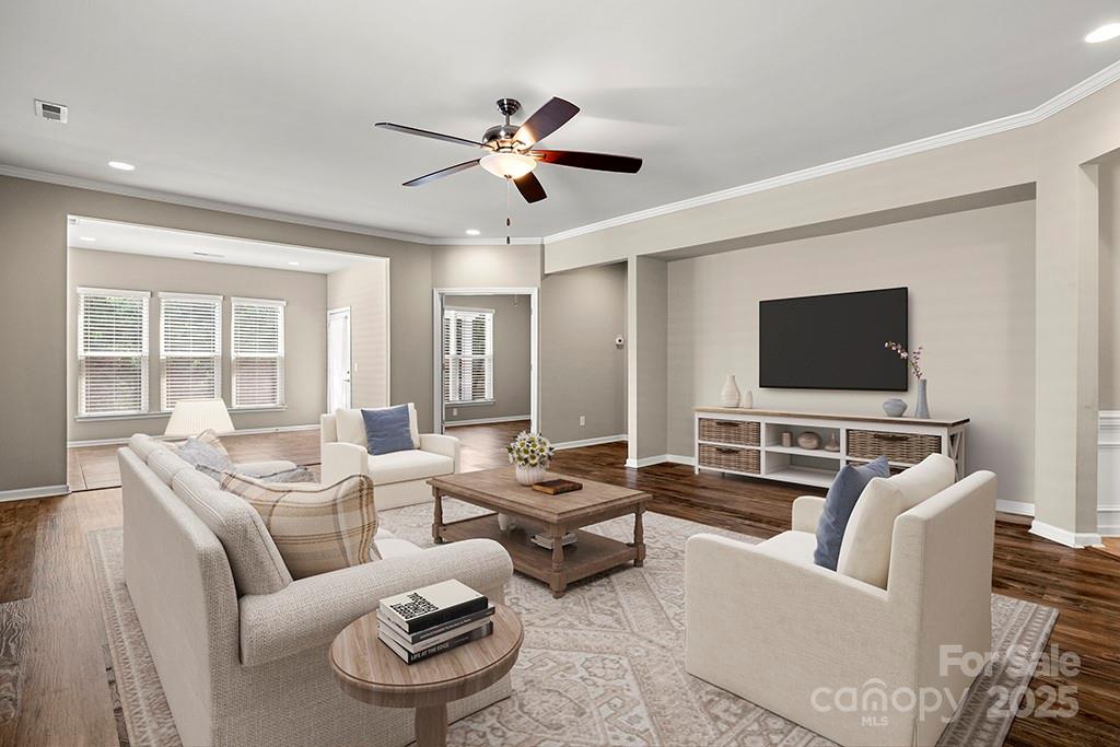 Discover the perfect blend of comfort and functionality in this beautifully maintained 1.5-story home, featuring 3 spacious bedrooms and 3 full bathrooms. Step inside to find luxurious LVP flooring throughout the main level living areas, crown molding, and elegant plantation shutters that elevate the home's style. The open-concept living space is wired for surround sound and highlighted by recessed lighting, creating a warm and inviting atmosphere. The kitchen and living areas flow effortlessly into the private, fenced backyard—ideal for entertaining under the custom pergola-covered patio. Kitchen boasts granite countertops and tile flooring for easy maintance. Upgrades abound, including a brand-new HVAC system (Summer 2024), a new water heater, and a newer garage door. The finished garage is a standout feature, complete with a utility sink, providing added convenience for hobbies or projects.
