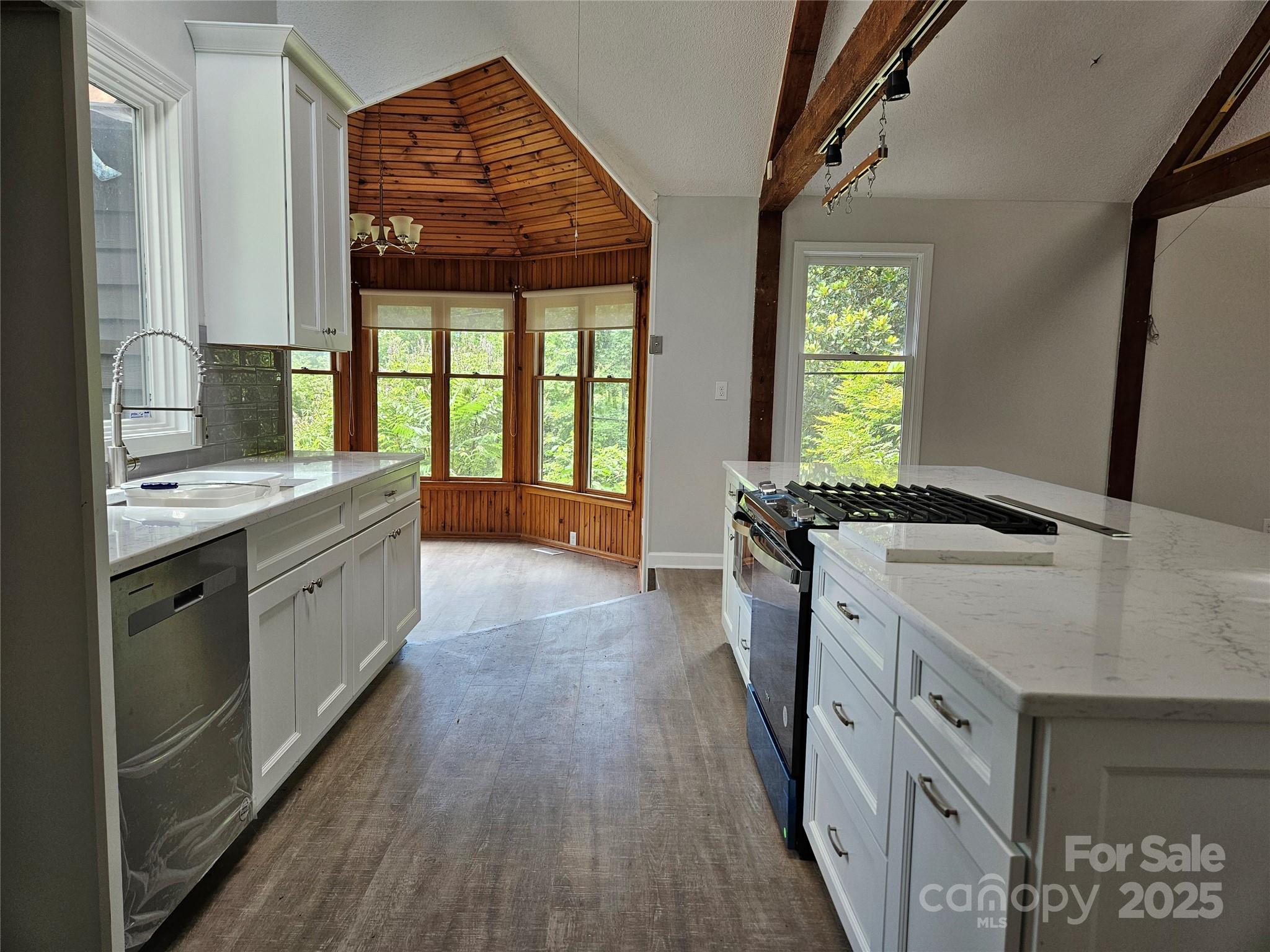 Tucked away on over 6 private, wooded acres in scenic North Carolina, this beautifully renovated 4-bed, 3-bath home offers unmatched privacy. Enjoy nature from multiple decks and balconies, framed by vibrant seasonal foliage. Inside, you'll find new flooring, a stunning kitchen with new cabinets, countertops, appliances, and a gas range. All three baths feature tiled showers/baths, updated cabinets, fixtures, plumbing, and toilets. Filled with natural light from skylights, the home also boasts dual water heaters—including a new electric and an on-demand system—plus a brand new water filtration system with softener. There is also an additional room that could be turned into a 5th bedroom or office. The solar-powered gated driveway adds security. The massive detached garage fits 4+ vehicles and has a loft ideal for a workshop. This serene retreat offers exceptional value and is an ideal peaceful residence. Opportunity meets tranquility here.