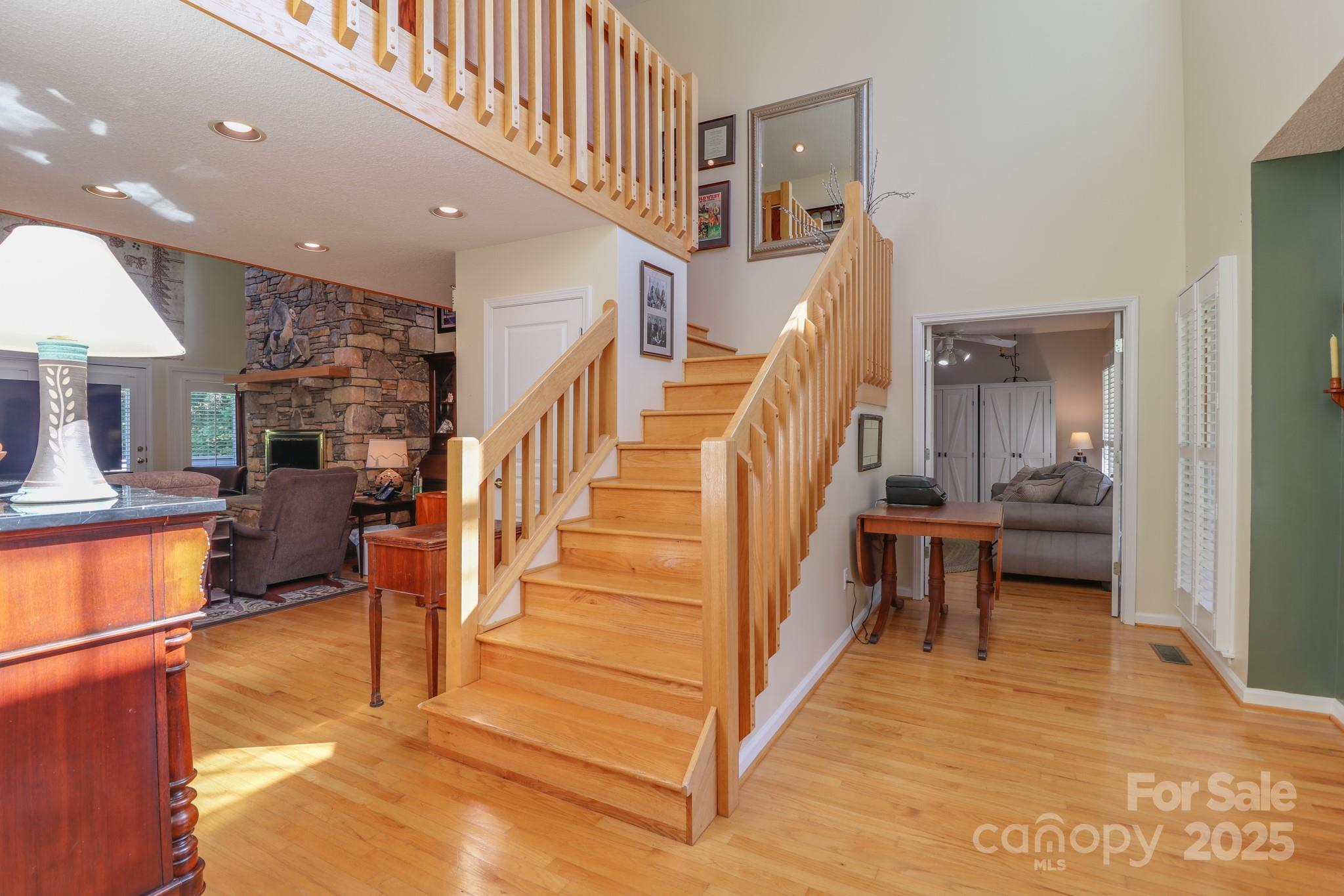 Welcome to this well-maintained 4-bedroom, 3.5-bath home nestled on 1.58 acres. Step inside and enjoy the warmth of the beautiful oak hardwood floors that flow throughout. This home features a large open kitchen to the living room, the living room has over 20ft ceilings and a full length floor to ceiling stone fireplace. You'll also enjoy the formal dining area for those family dinners during the holidays. The spacious primary suite is a true oasis, featuring a walk-in closet, large luxurious ensuite with a soaking tub and separate shower. Both guest rooms upstairs have their own private full bathrooms with a nice lofted sitting area to share. The home also offers a beautiful back deck overlooking the partially fenced yard, as well as a charming full length front porch ideal for enjoying quiet mornings. The unfinished basement features 10 ft ceilings and is ready to expand into if needed, but currently offers great storage space. The outside offers plenty of usable yard to play, fenced area for the pets, and there is also a power pole for RV parking if needed for a visiting guest's camper. This home also features a whole house generator. Just a great family property with plenty of space inside and out, this home blends comfort, style, and tranquility.