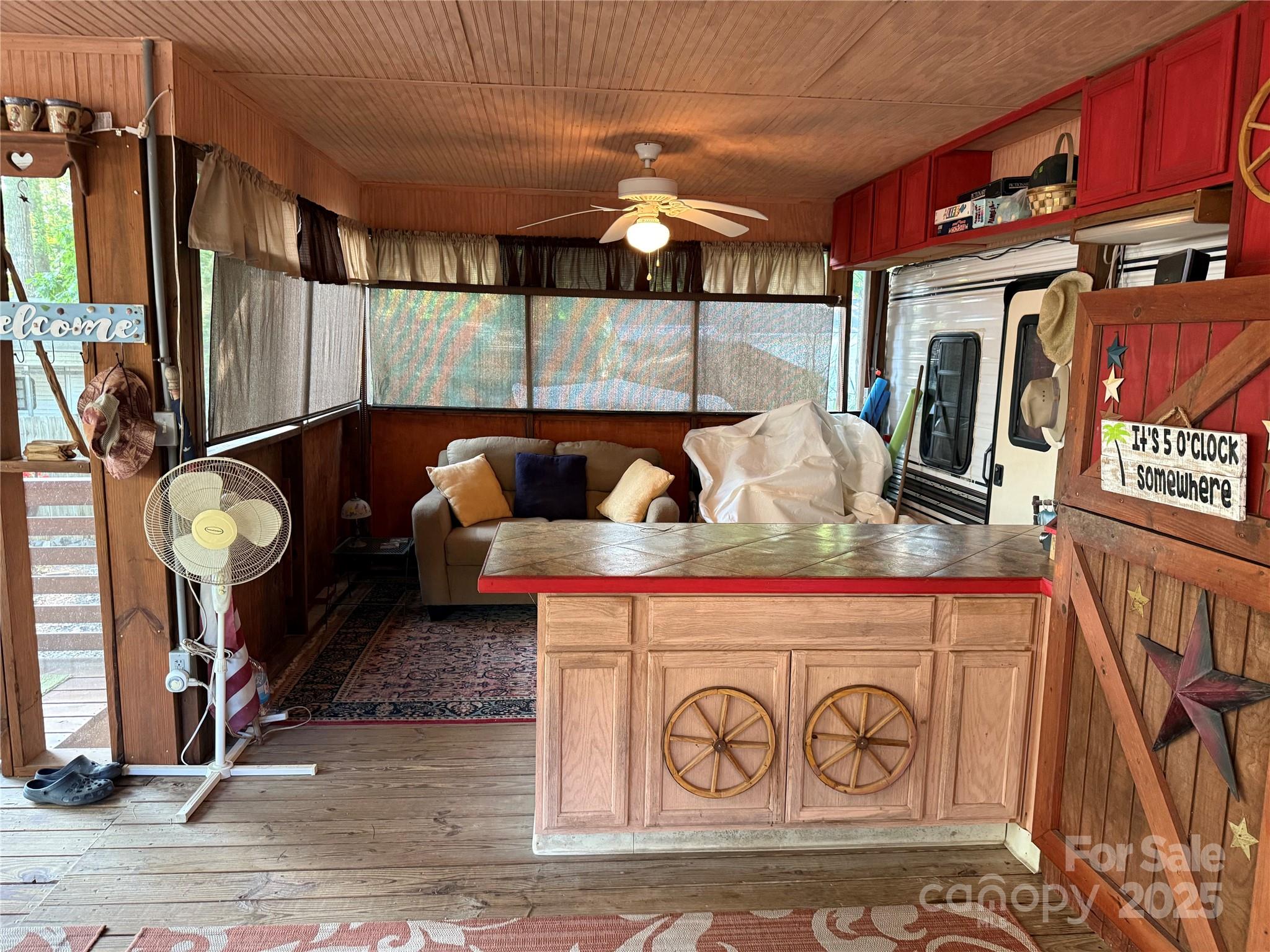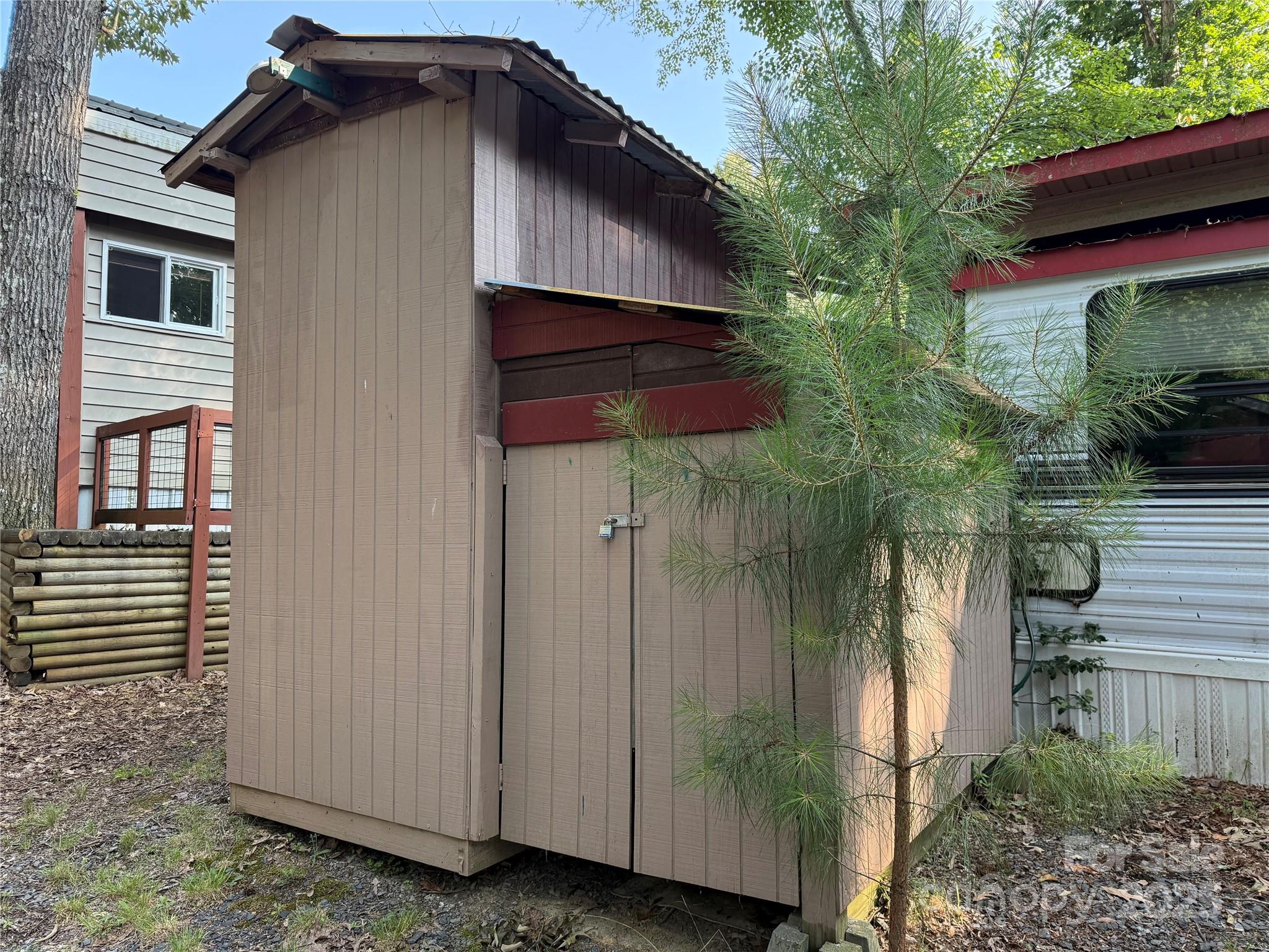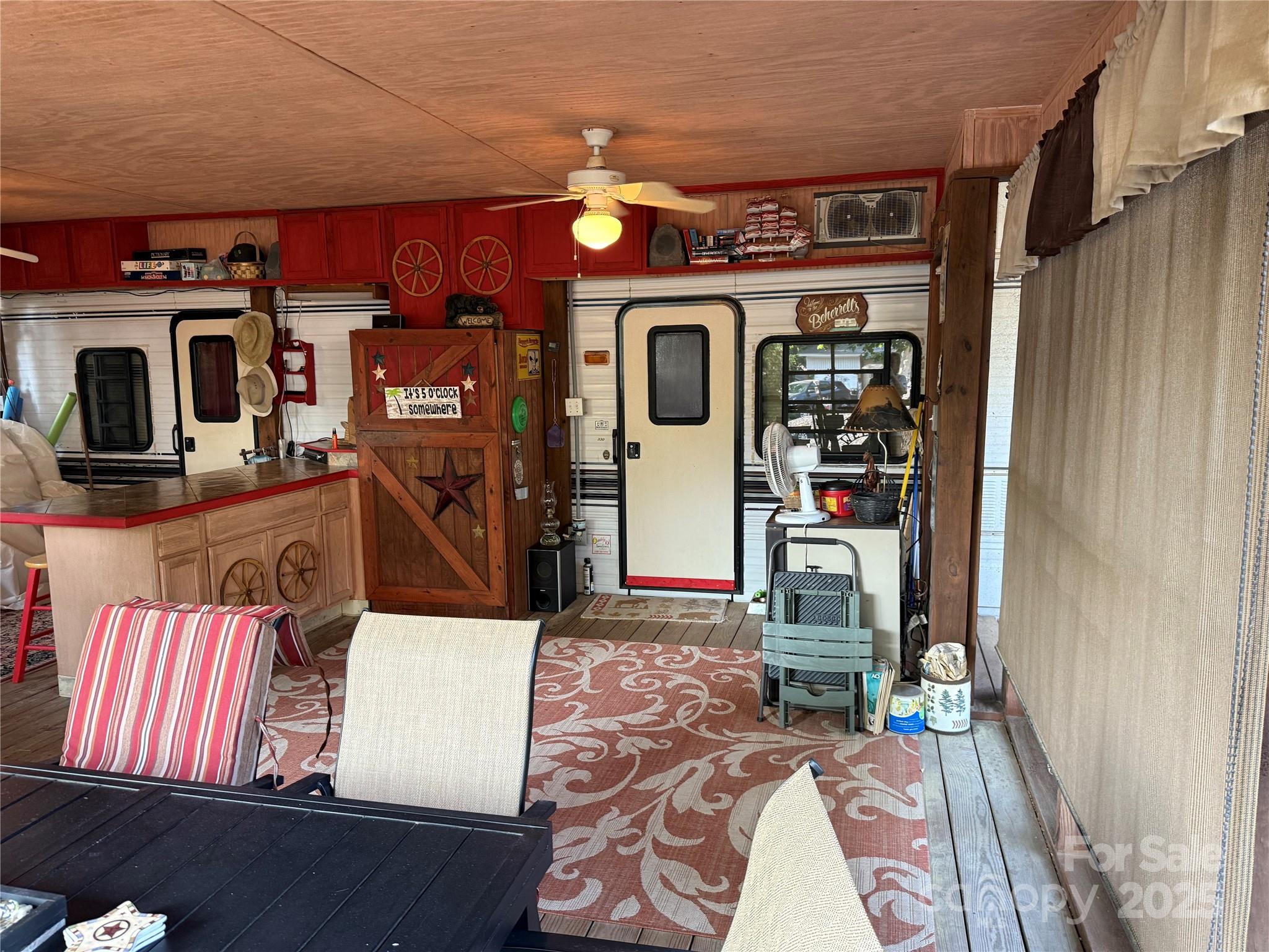 Welcome to a fabulous deck with great shade trees. Double lots for plenty of parking for all your lake toys. This well maintain 1995 30' Dutchmen is ready for you to come enjoy. Front end kitchen always give additional space, wall mounted propane heater, newer flooring and refrigerator inside. Big refrigerator on Porch. Nice sitting area, bar area and dining area all on this oversized covered front porch. Owner has installed a cut off switch for the 12v lights. real potty, small outbuilding with enclosed lean to. Most furnishings to remain. All clients must be with a realtor to gain access to the community.