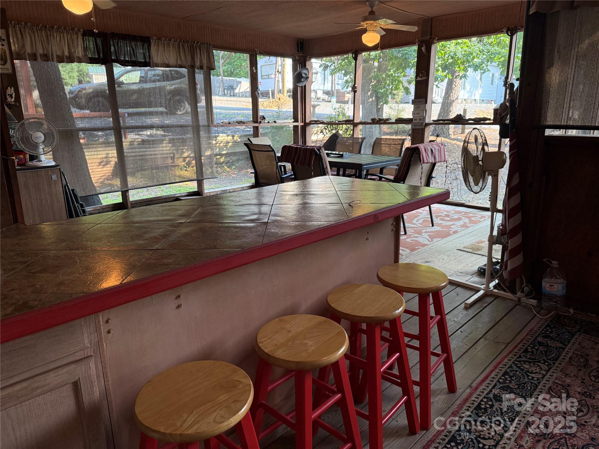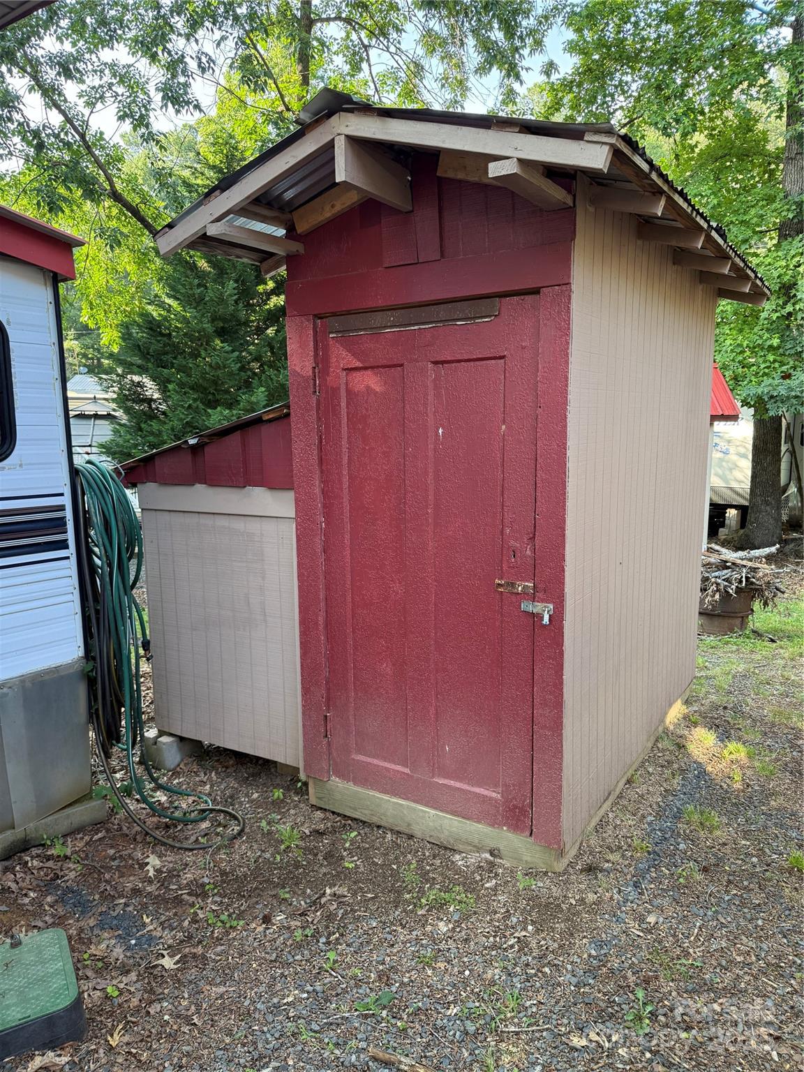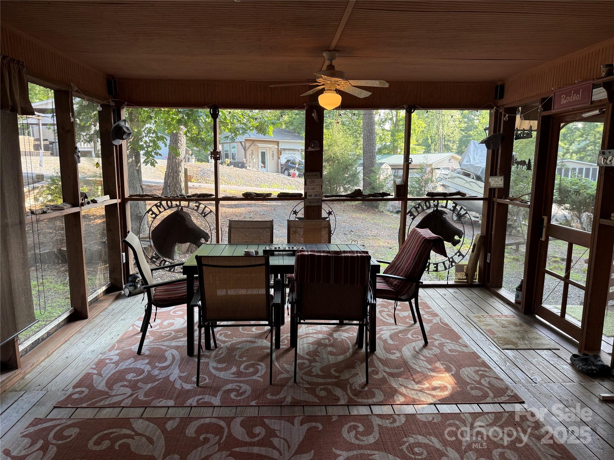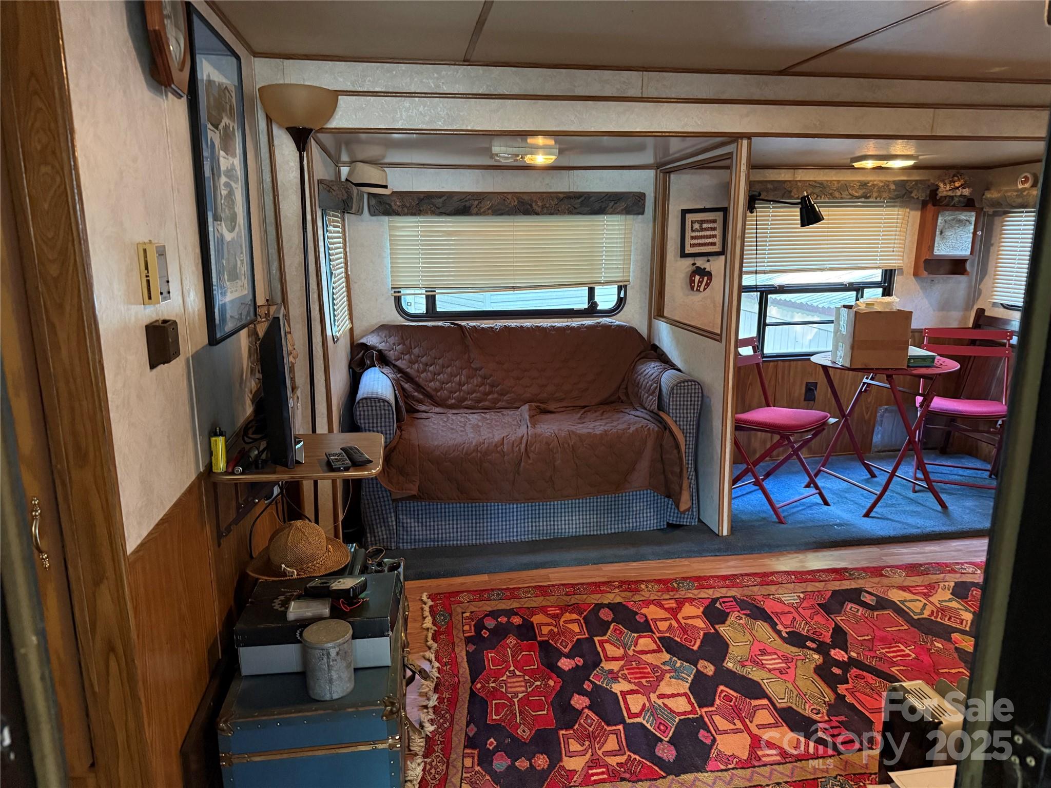 Welcome to a fabulous deck with great shade trees. Double lots for plenty of parking for all your lake toys. This well maintain 1995 30' Dutchmen is ready for you to come enjoy. Front end kitchen always give additional space, wall mounted propane heater, newer flooring and refrigerator inside. Big refrigerator on Porch. Nice sitting area, bar area and dining area all on this oversized covered front porch. Owner has installed a cut off switch for the 12v lights. real potty, small outbuilding with enclosed lean to. Most furnishings to remain. All clients must be with a realtor to gain access to the community.