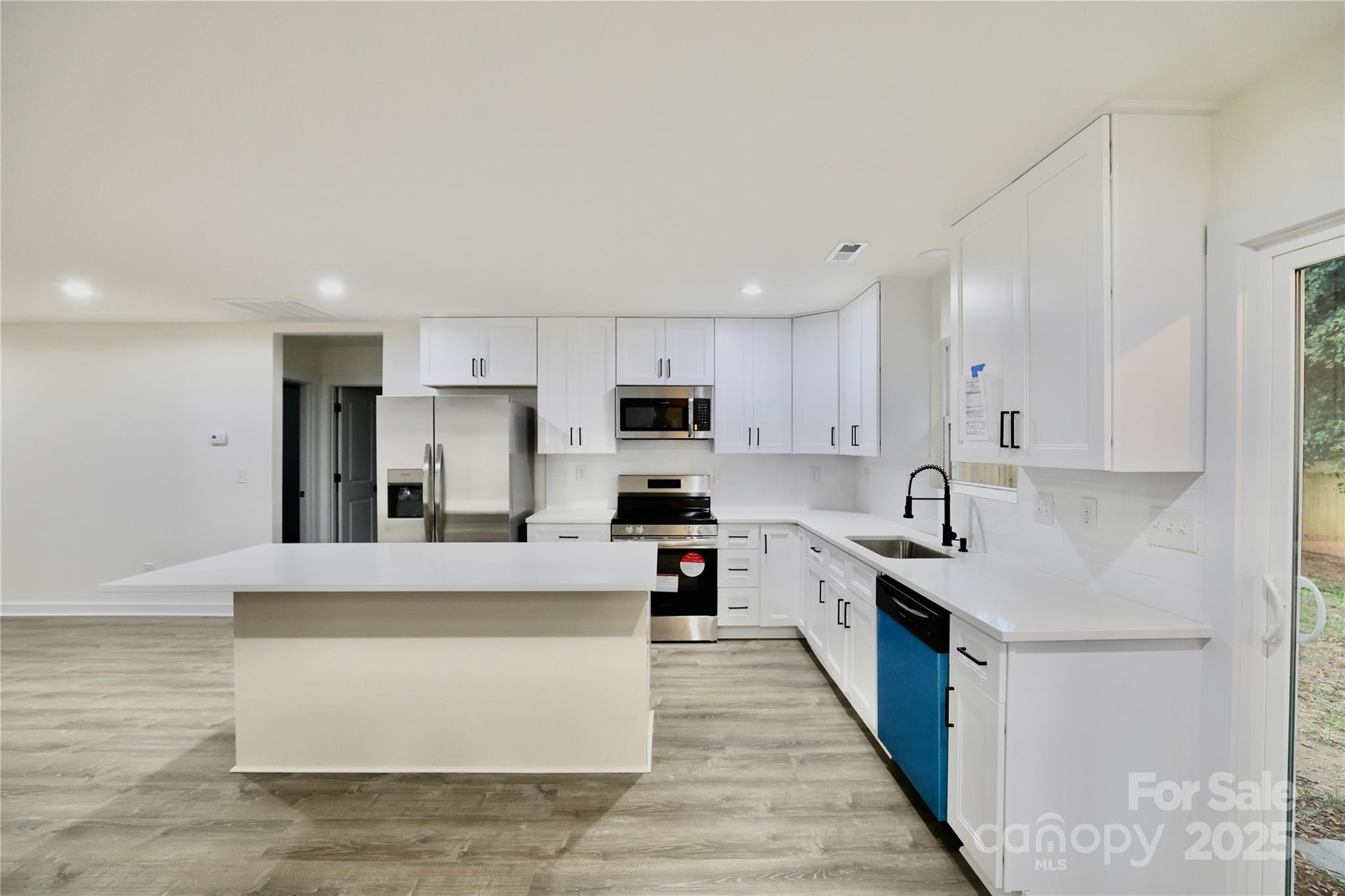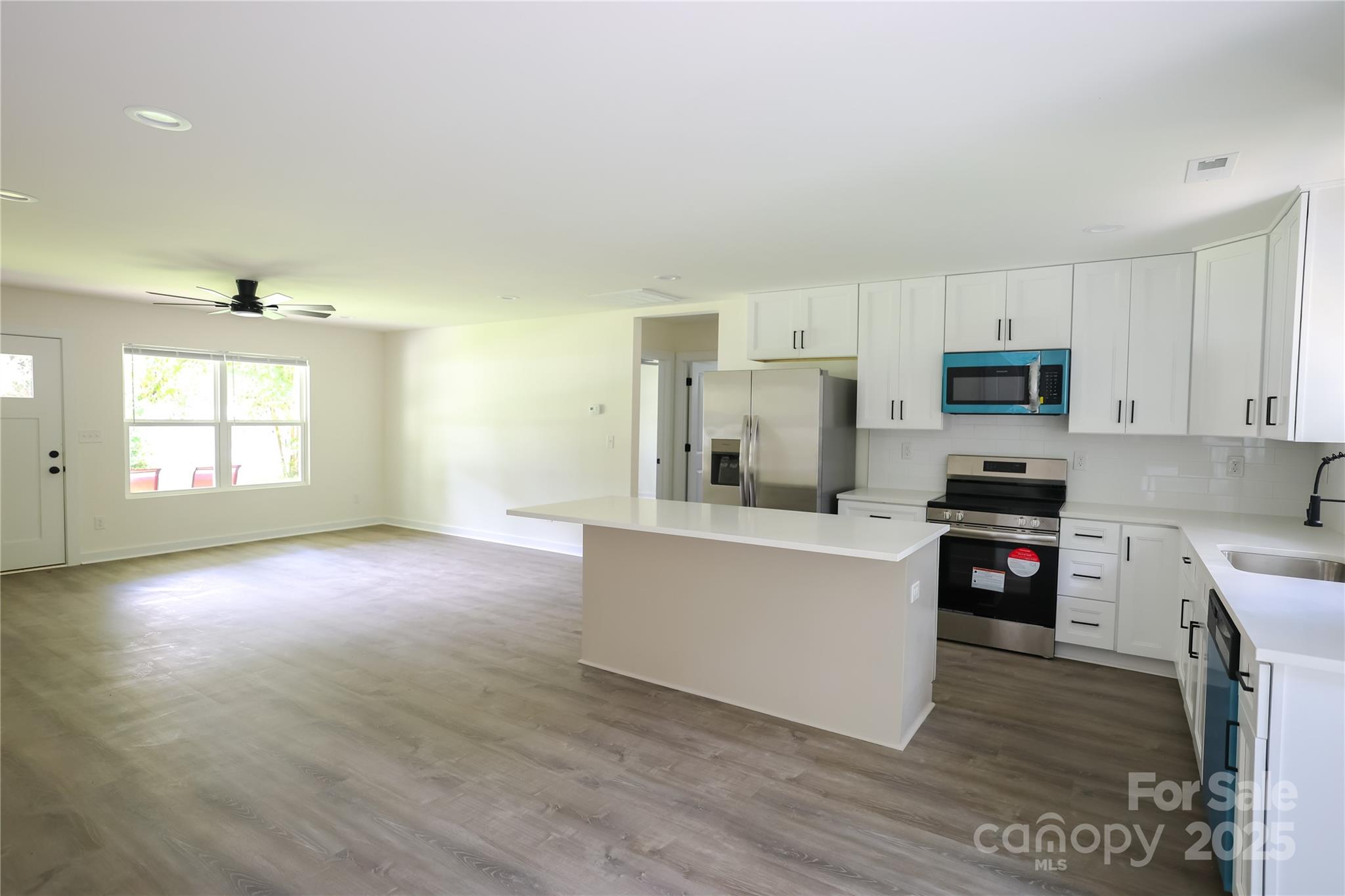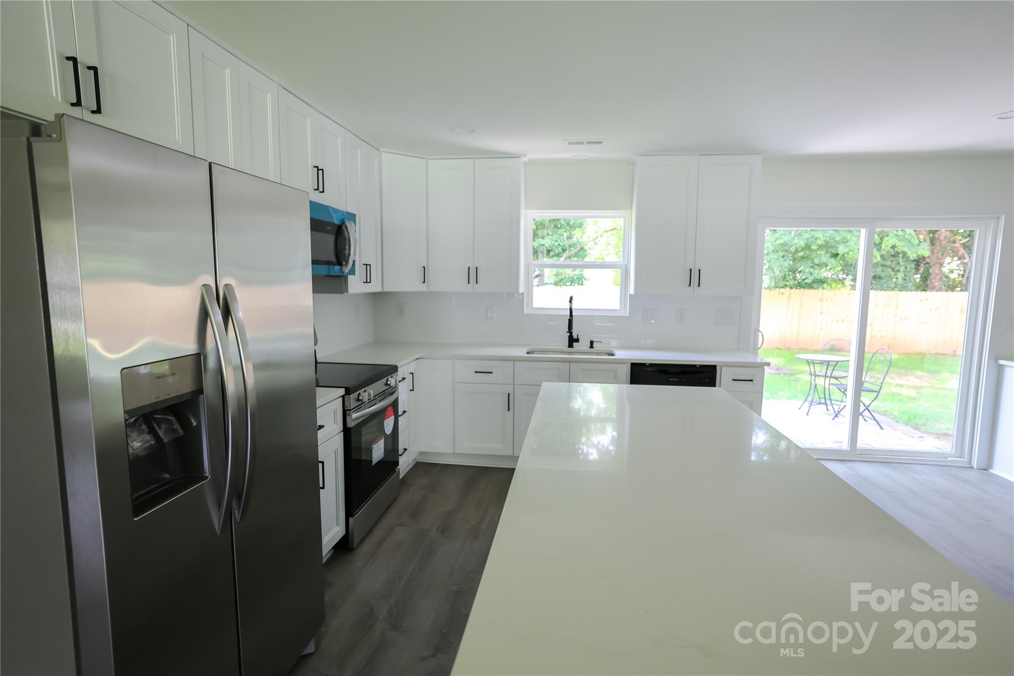 25k Price Drop!!! NEW CONSTRUCTION only 8 minutes from downtown Huntersville! This lovely, single-level home has 3 bedrooms, 2 full baths, large driveway & fully FENCED BACKYARD. Front covered patio welcomes you into the spacious living area with gorgeous LVP flooring throughout. Kitchen boasts quartz countertops, soft-close cabinets & APPLIANCES INCLUDED: refrigerator w/ ice maker, dishwasher, disposal, oven & microwave. Dining area beside kitchen island looks out onto stone patio & private backyard. The primary suite sits off the living room with a double vanity & tile shower/floor in bathroom and walk-in closet w/ built-in shelving. Next to dining area is a useful office or entertaining nook, kitchen pantry & laundry w/ built-in shelving. Two additional bedrooms lay on the other side of the living area with large closets & a luxurious full bath including tile shower/floor. Ceiling fans installed in living area & all bedrooms as well. Elegant black hardware package & blinds also throughout. READY NOW!!!