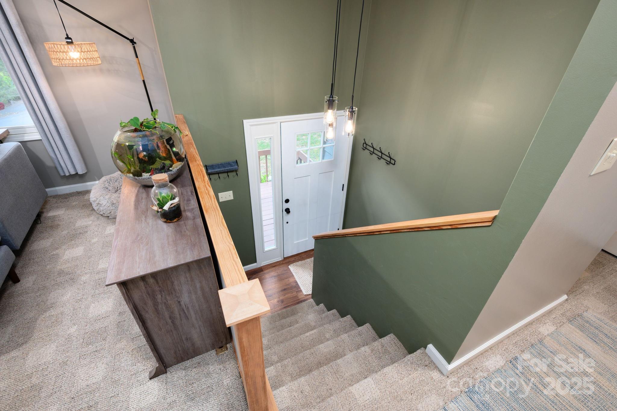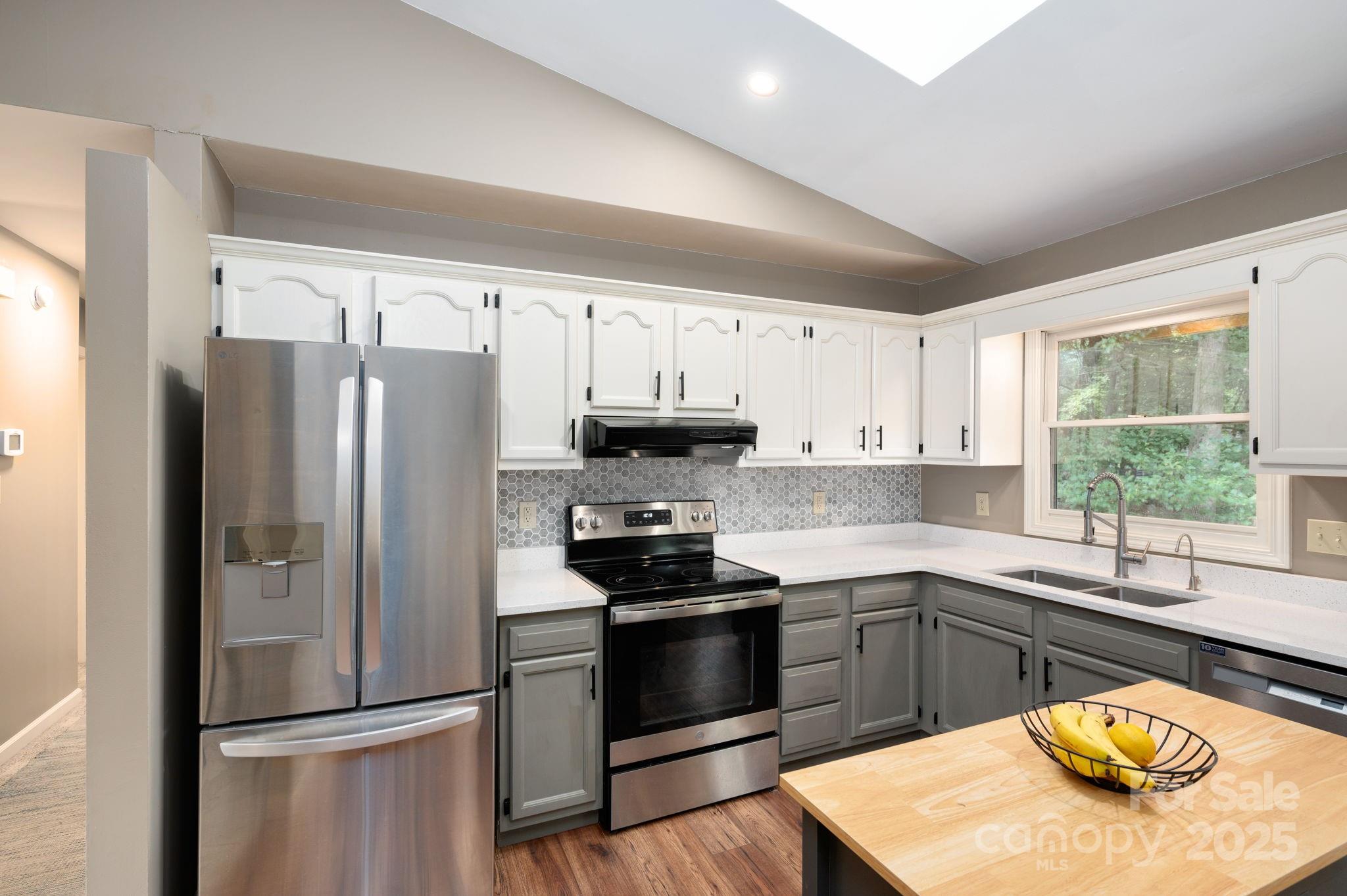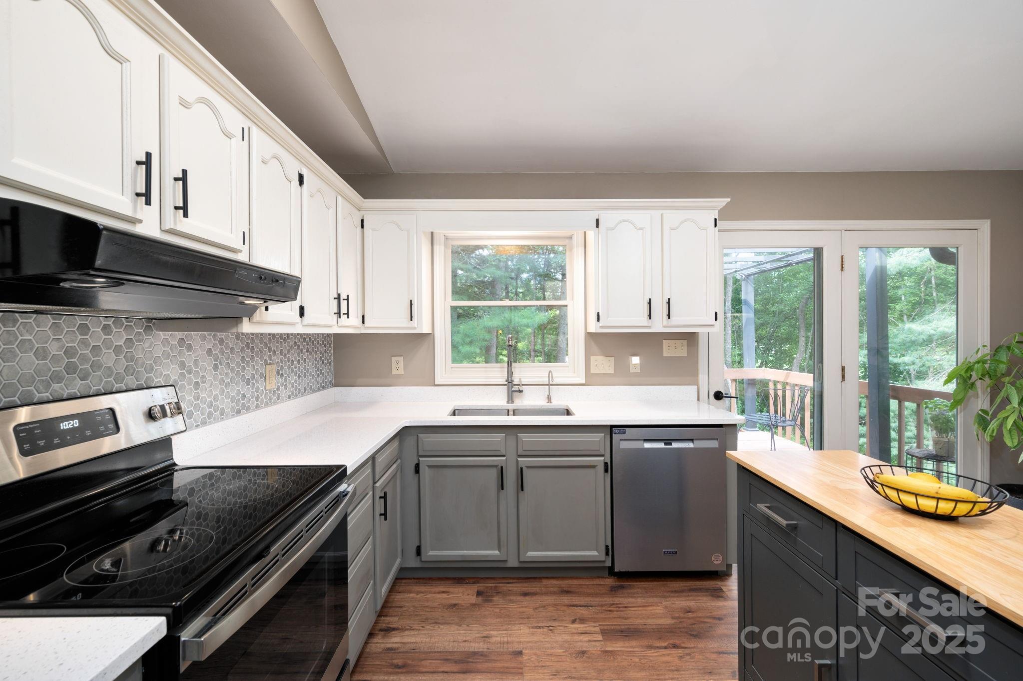 Seller leaving the country! Priced to sell. Priced below appraisal! This private, spacious home blends comfort and versatility on a serene, wooded lot. The main level features a bright, open layout where the living room, with its tiled fireplace, flows into a spacious kitchen with quartz counters, new backsplash, newer appliances, and a freestanding island that conveys. The dining area sits under fresh lighting and opens to the back deck—perfect for morning coffee overlooking the trees. A large primary bedroom with ceiling fan connects to an ensuite bathroom, while an additional upstairs bedroom offers flexible space for guests or a home office. The lower level expands the living area with a second family room featuring a kitchenette, a full bath, and an additional bedroom—an ideal setup for multigenerational living, extended stays, or potential rental income if desired. A single-car garage with laundry, extra driveway parking, and a storage outbuilding add everyday convenience. Minutes away to Mills Gap Road and South Asheville amenities.