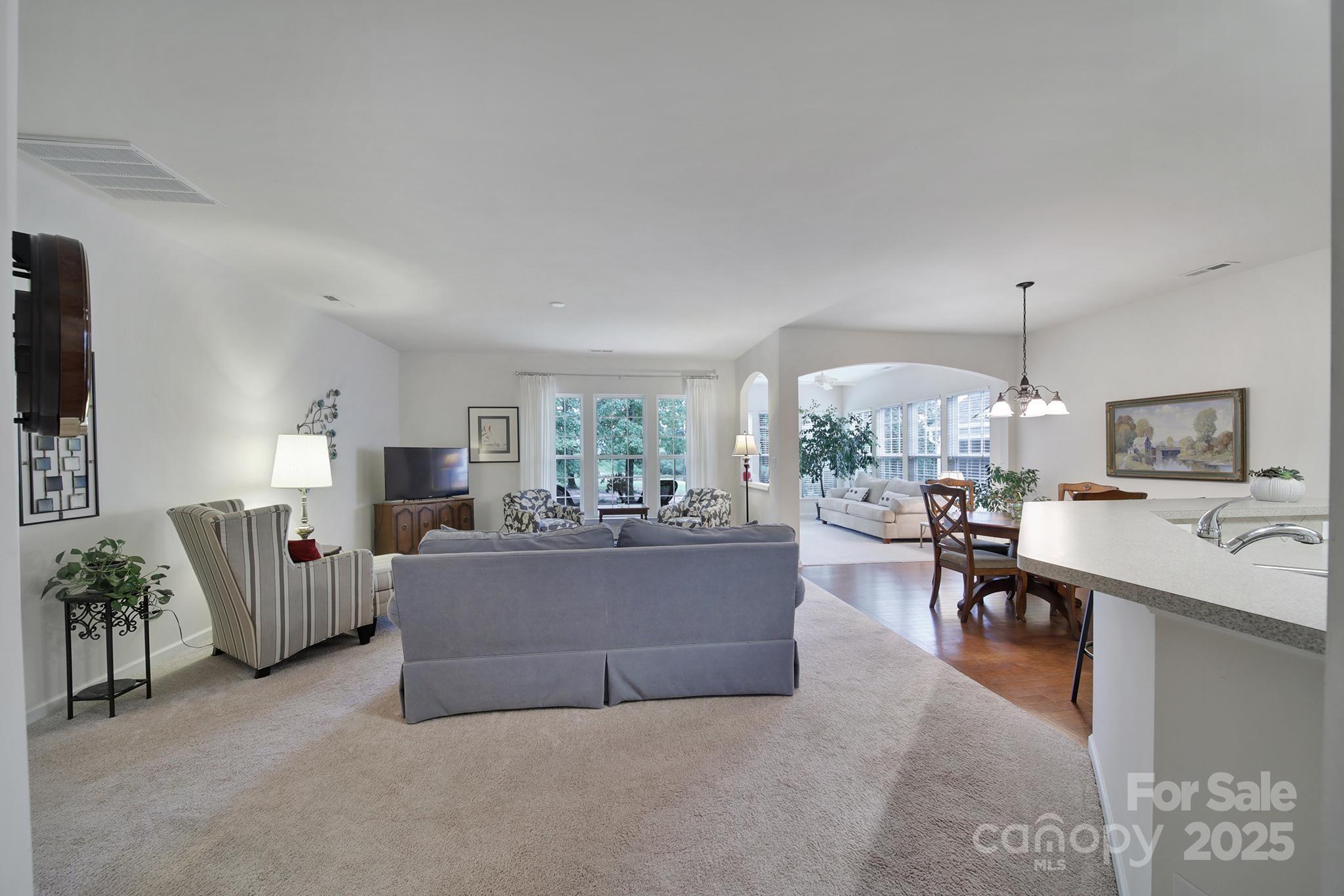 Nestled along the 8th fairway, this well-maintained Copper Ridge home w/2 bedrooms, 2 baths, and an office/den offers scenic golf course views from your private covered porch and stamped concrete patio—ideal for relaxing or entertaining. Inside, a bright guest bedroom sits at the front of the home, with easy access to a hall bath featuring tile floors & a solar tube for natural light. A decorative glass front door welcomes you into a spacious foyer with engineered wood flooring that flows through the kitchen & dining room. The kitchen features classic white appliances, easy to maintain countertops, & convenient bar seating. Plush carpeting is throughout the living areas, bedrooms, sunroom, and office. The primary suite boasts serene fairway views, an en-suite bath with a garden tub, walk-in shower, dual-sink vanity, and a large walk-in closet. All of this, plus the award-winning amenities of Sun City Carolina Lakes: resort-style pools, walking trails, golf course, clubhouse, & more!
