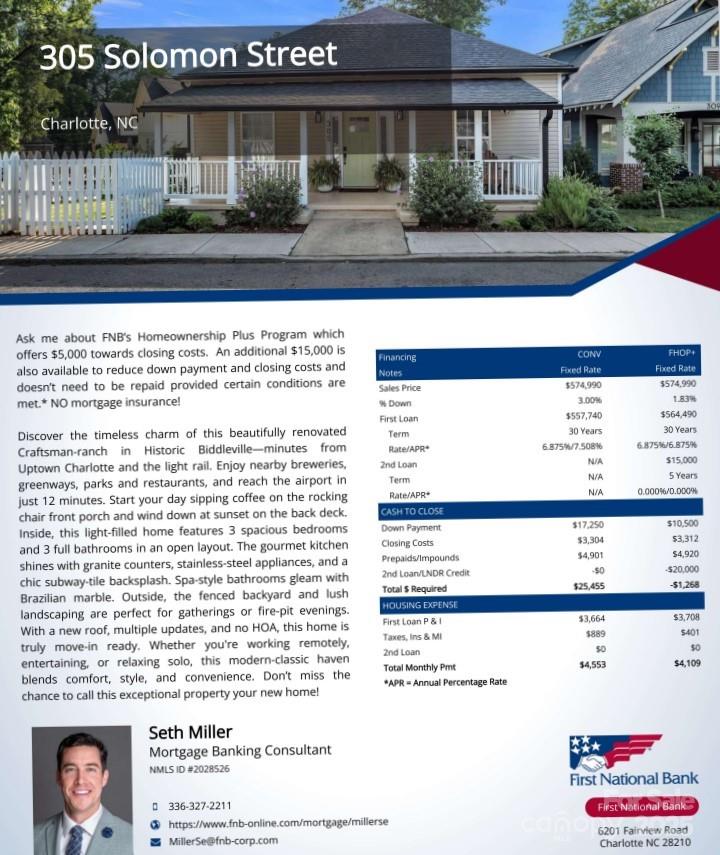 **Preferred Lenders offering options from $7,500 to $15,000 in closing cost incentives** Discover the timeless charm of this beautifully renovated Craftsman-ranch—minutes from Uptown Charlotte, Bank of America stadium and SouthEnd, and a short walk to the light rail. Enjoy nearby breweries, greenways, parks and restaurants, and reach the airport in just 15 minutes. Start your day sipping coffee on the rocking chair front porch and wind down at sunset on the back deck. Inside, this light-filled home features 3 spacious bedrooms and 3 full bathrooms in an open layout. The gourmet kitchen shines with granite counters, stainless-steel appliances, and a chic subway-tile backsplash. Spa-style bathrooms gleam with Brazilian marble. Outside, the newly fenced backyard and lush landscaping are perfect for gatherings or fire-pit evenings. With a brand new roof (30 year warranty), 3 year old HVAC, new tankless water heater, new 2-car concrete driveway parking and multiple updates, plus no HOA, this home is truly move-in ready. *Plus, the Seller is offering a Home Warranty up to $600 for the buyer* This peaceful neighborhood, with its scenic sidewalks, is perfect for leisurely strolls and just minutes from the Thrift Road Corridor’s coffee shops, restaurants, and the newly opened Savona Mill multi-use space. Enjoy being less than a mile from the Greenway, light rail station, and a local park with tennis courts. Whether you're working remotely, commuting into the city, entertaining guests, or simply unwinding, this modern-classic haven offers the perfect blend of comfort, style, and convenience. This beautiful home also has options from preferred lenders for incentives such as 100% Financing, up to $15,000 in closing costs and many more incentives and financial grants. See flyer for lending example or contact listing agent for lender contact information. This is an opportunity you won't want to miss!! Additional bonus...*Outdoor storage shed conveys with sale. *Refrigerator, Washer & Dryer may convey with an acceptable offer.