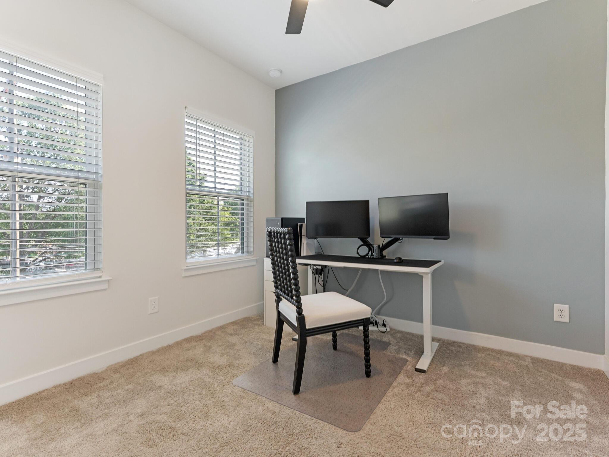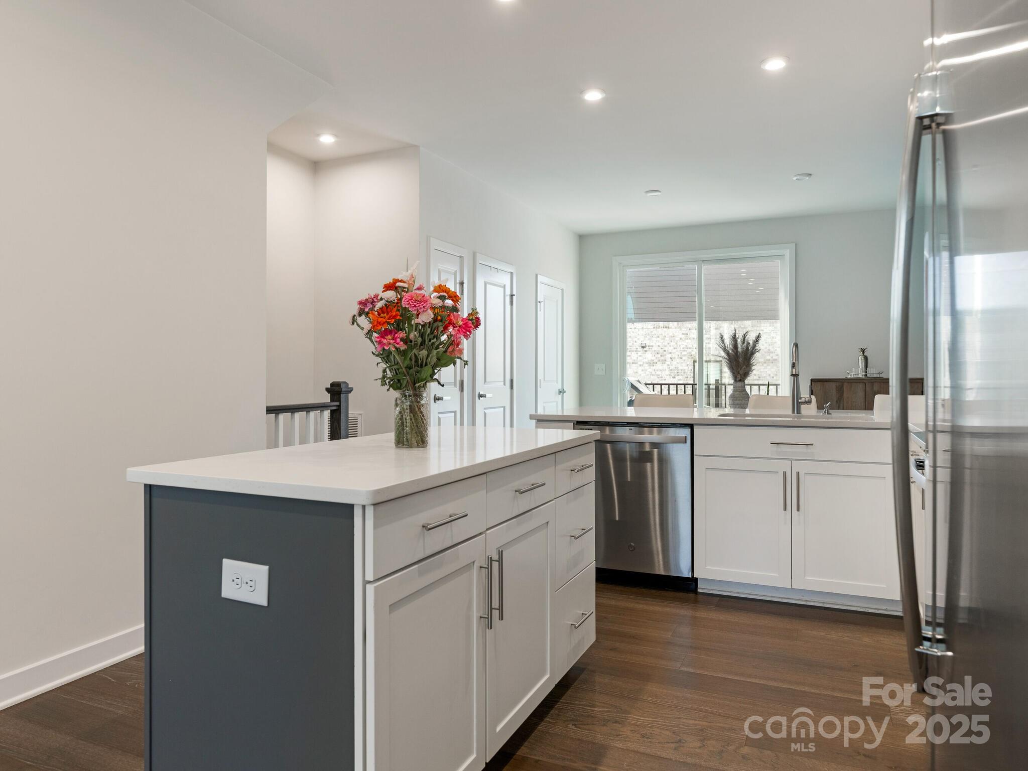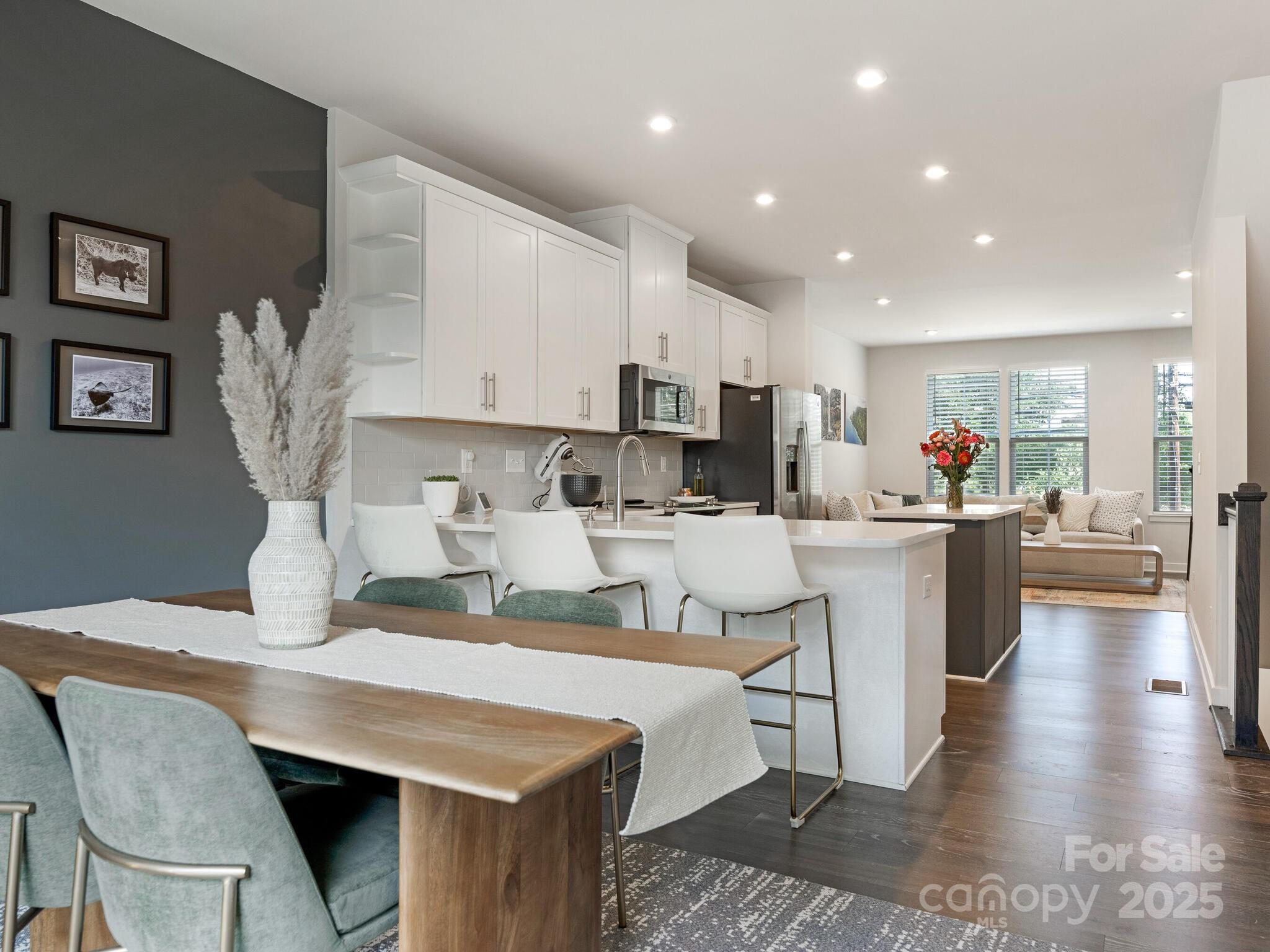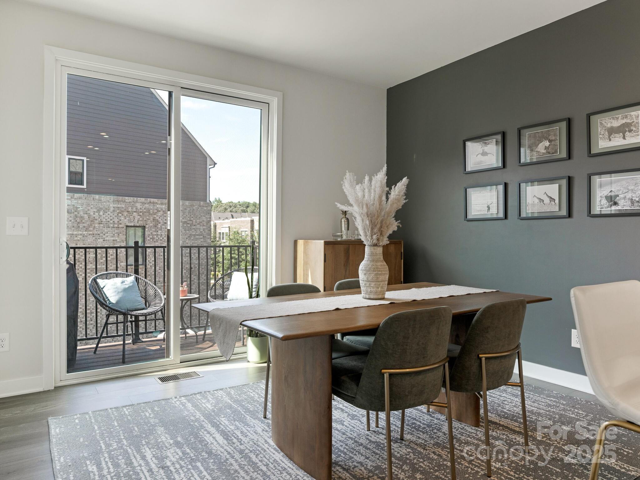 Priced below tax value! Best floorplan in the complex! This gorgeous urban condo shines in so many ways. First, it's off the main roads, meaning no noisy traffic outside your windows. Second, aside from the 2-car tandem garage, the home is right next to guest parking and Uwharrie Rd, which offers loads of extra parking for visitors. The interior floorplan can't be beat: the first level is the garage, so all of your main living area—including all bedrooms—is conveniently upstairs. Light-filled interior with large kitchen island, gleaming white cabinets, and wide plank luxury vinyl "wood" floors. The top level features a great entertaining space with bar, beverage fridge, and rooftop terrace with seasonal city views. This top floor could also double as a 3rd bedroom with its full bathroom. All appliances remain with the home. Sellers prefer mid-September closing or earlier with rent-back. Monthly HOA fee includes water, exterior maintenance. Community amenities include 1 acre of tree save, trails and dog park.