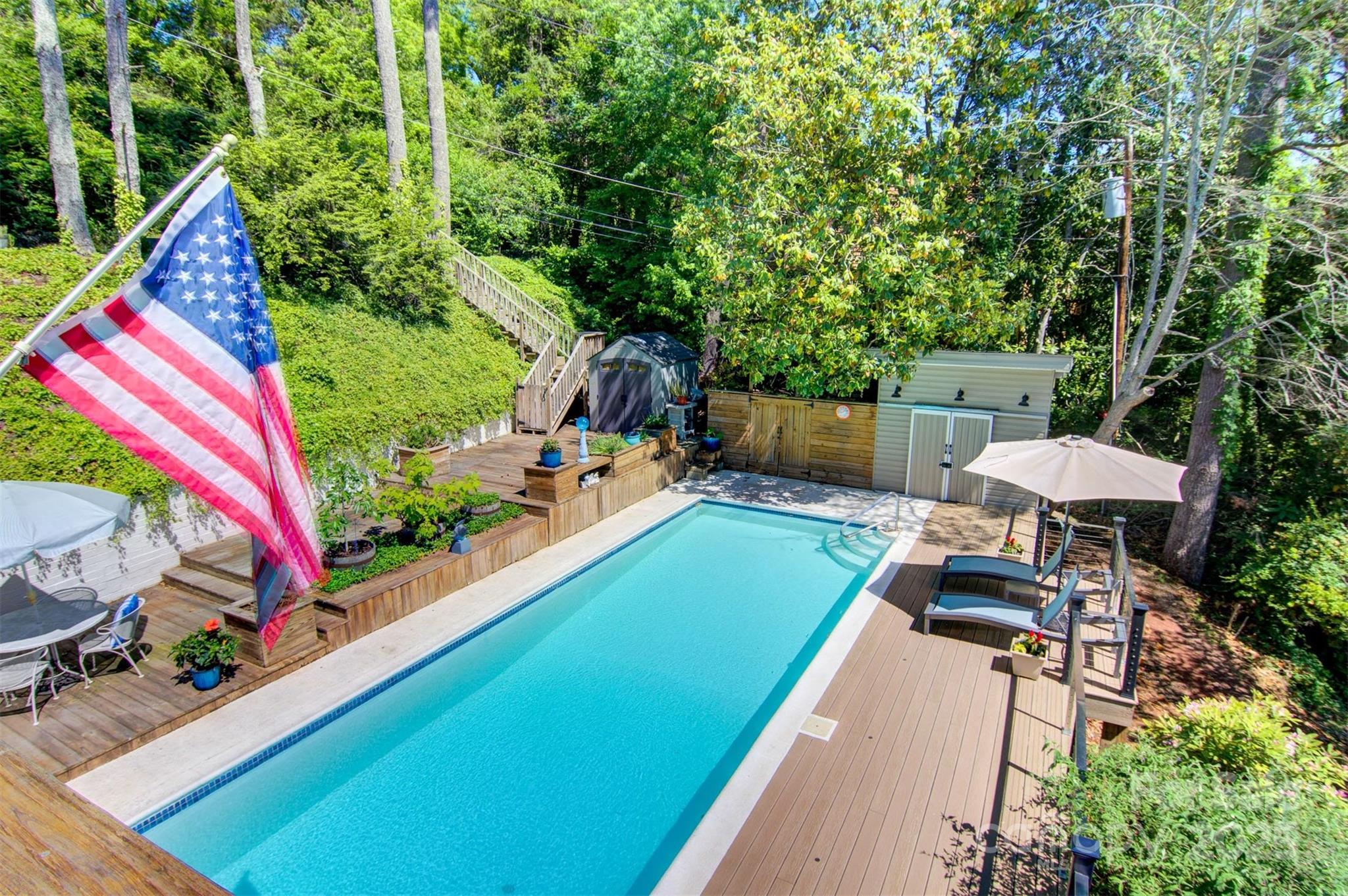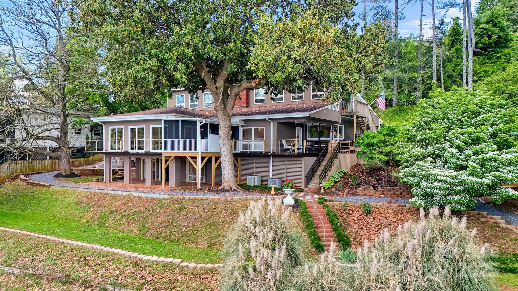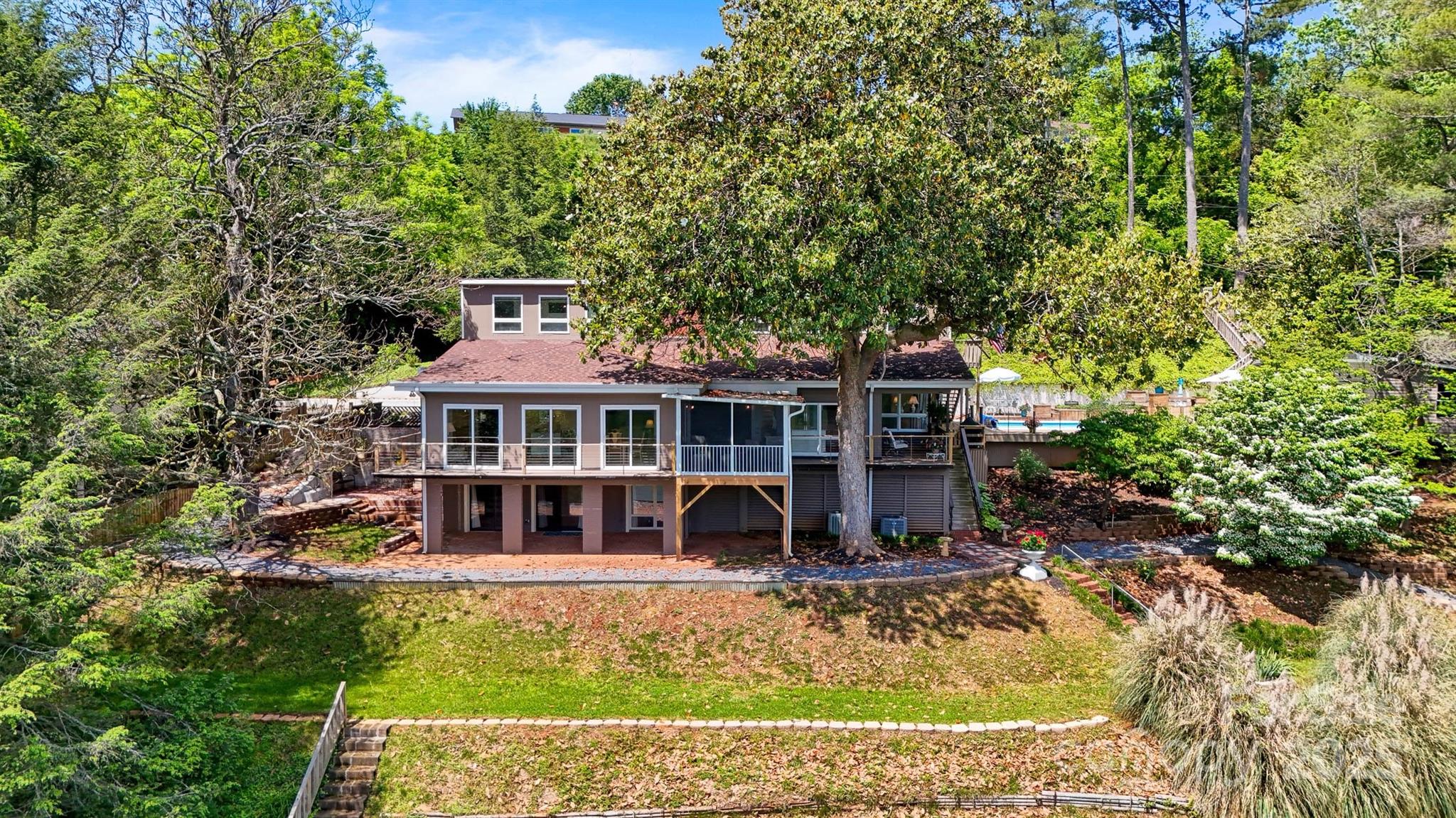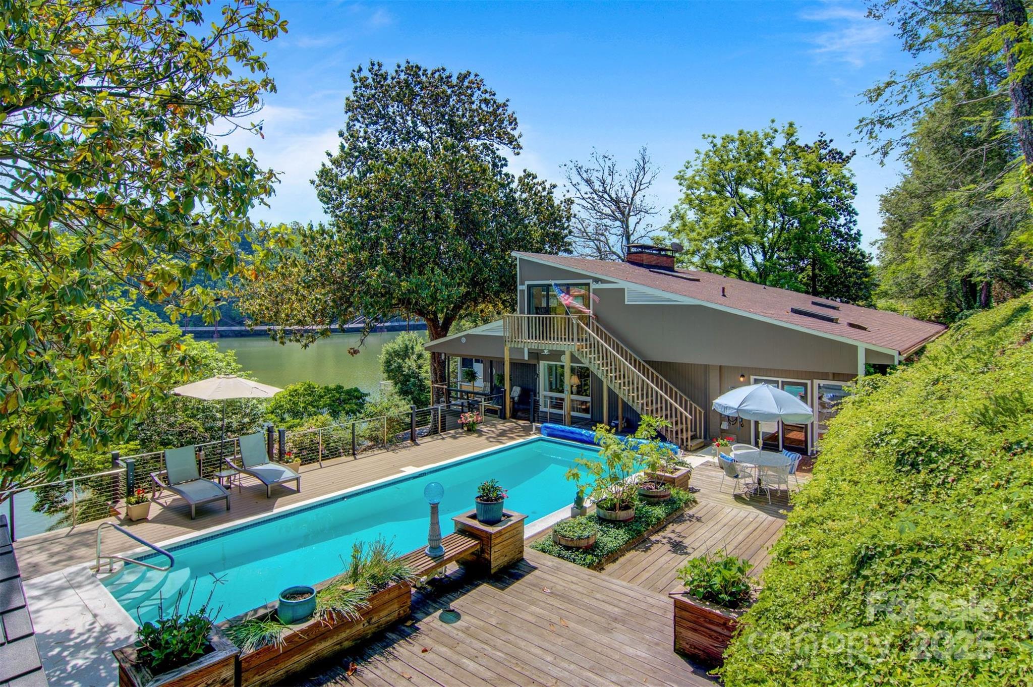 Exquisite Lake Hickory waterfront estate on a double lot featuring a stunning inground pool with panoramic views. This refined retreat offers meticulously landscaped grounds, a professional garage with workshop, elegant wrap-around decking, protective seawall, and a private floating dock. The interior showcases expansive entertaining spaces with floor-to-ceiling windows framing breathtaking 180-degree lake views. Upstairs, discover an impressive master suite with private living area, spiral staircase, and kitchenette. The main floor includes two additional bedrooms, one ideal as a secondary master. The finished basement features a versatile bunk room with dedicated bathroom and patio access. Recent luxury renovations totaling over $250,000 include a brand new gourmet kitchen, covered porch, custom deck, and completely reimagined bathroom—all finished to the highest standards with premium materials and craftsmanship. An extraordinary lakefront lifestyle awaits.