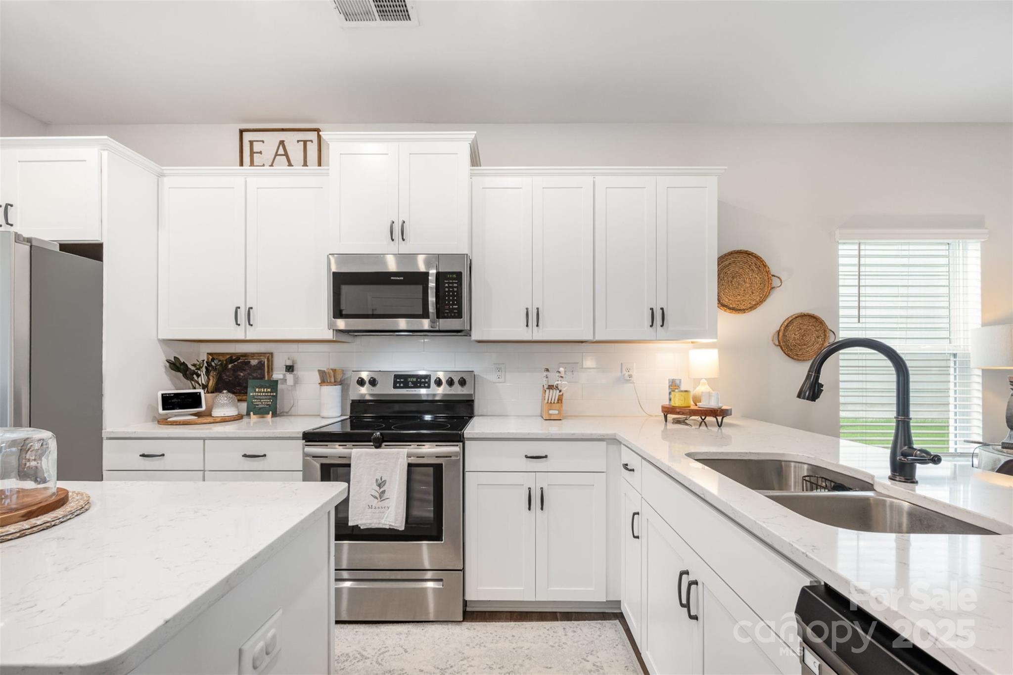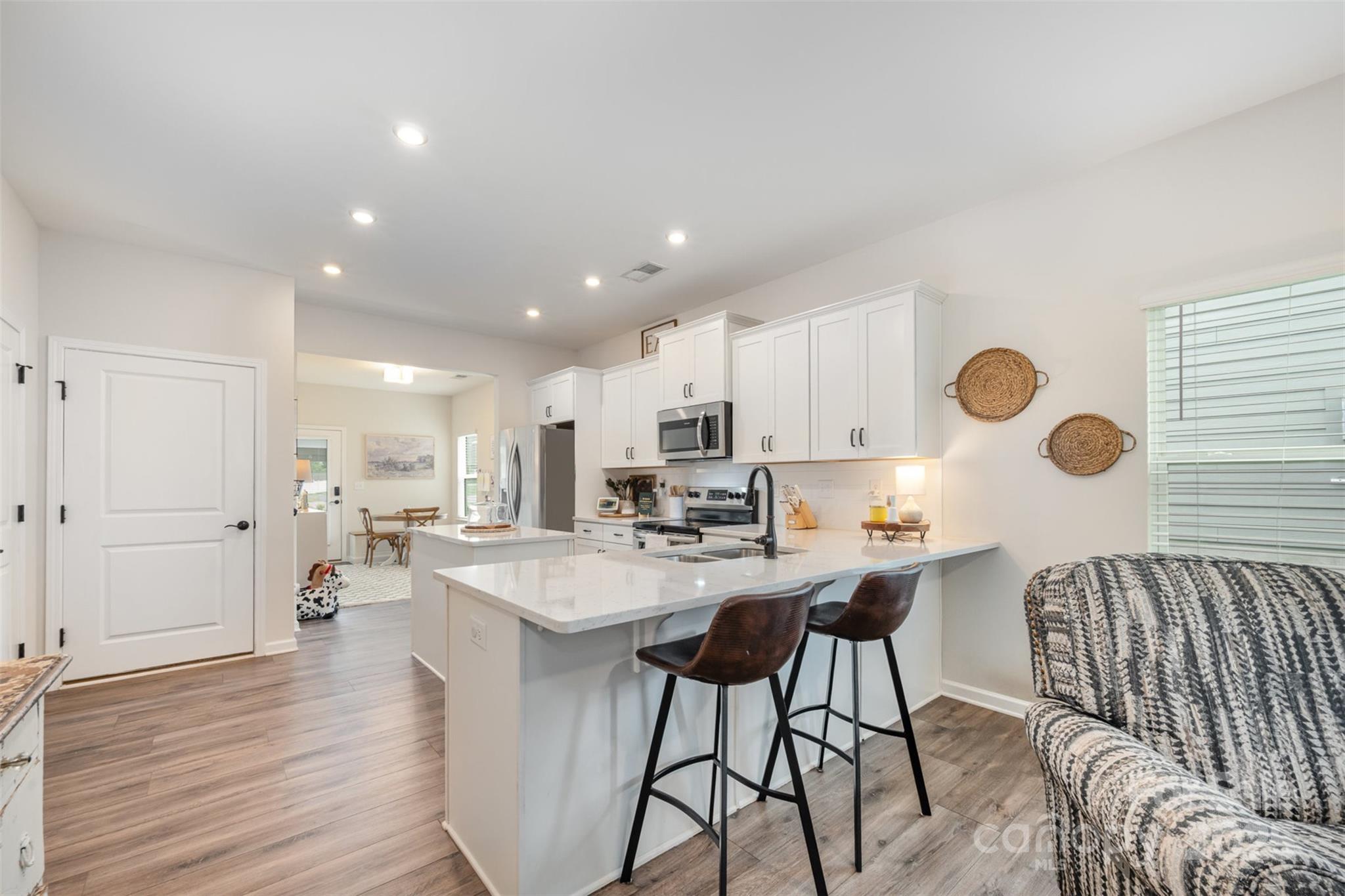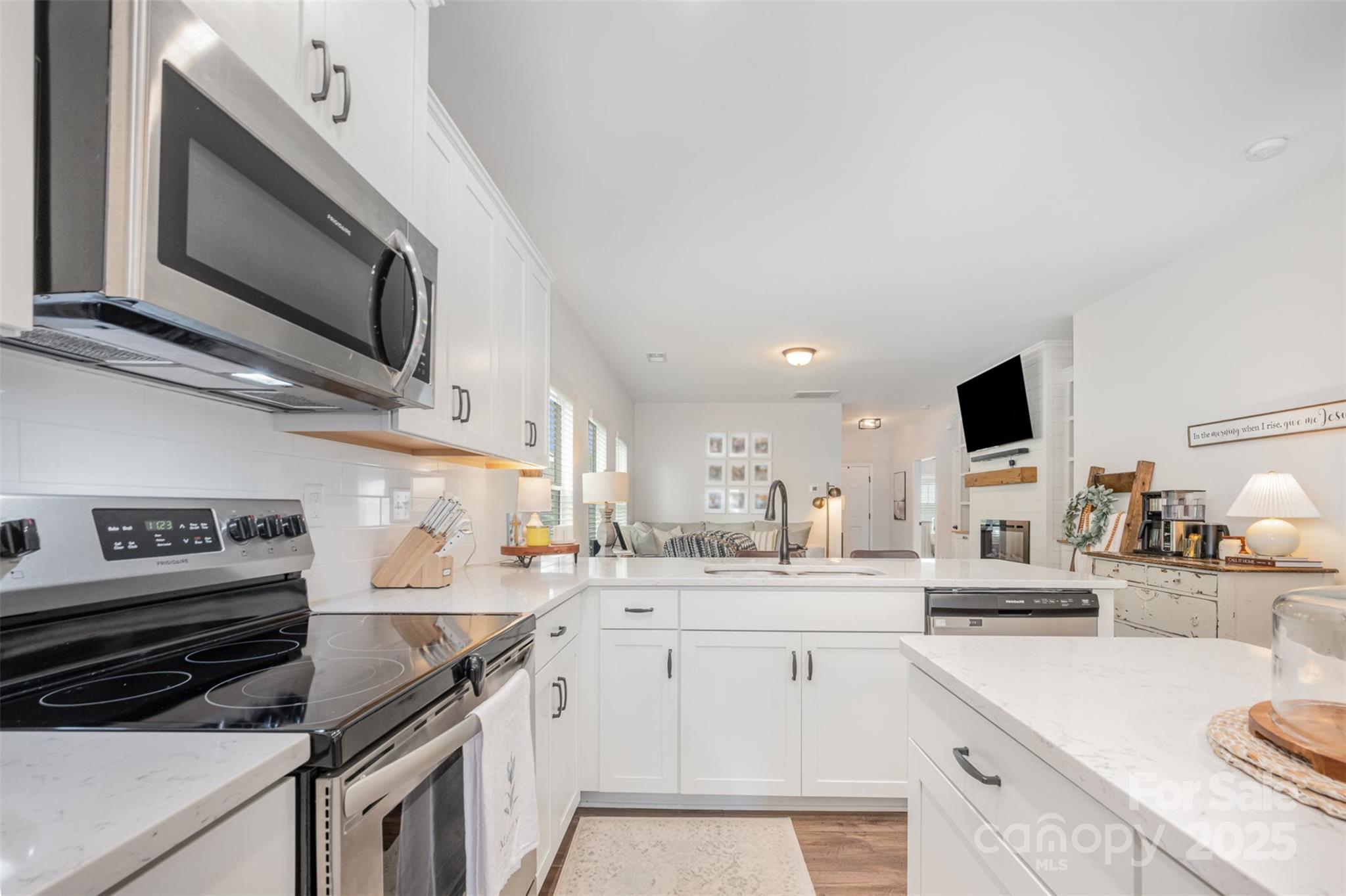 Step into this thoughtfully designed single-story home where every detail has been curated for comfort, function, and style. Built in 2021, this residence features a bright, open-concept layout perfect for modern living. Highlights include: A stunning all-white kitchen with upgraded quartz countertops, island, and stainless steel appliances. Custom designer touches throughout from the built-ins in the living room that adds warmth and character. Detailed trim-work and wallpaper in bedrooms that elevates each space. Enjoy built-in garage shelving, an extended driveway, and a covered rear patio — all crafted for comfort and convenience. Stylish, functional, and move-in ready — this home is perfectly prepared for its next owner to make it theirs.