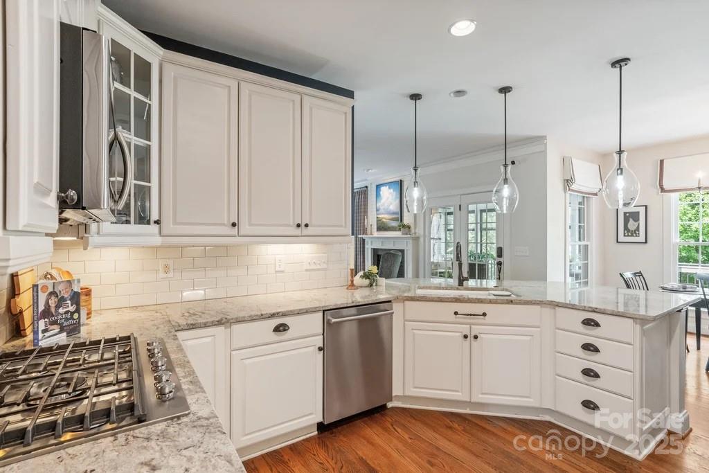 Nestled within the highly desirable Baxter Village community, this 5-bedroom, 4-bath residence offers refined living on a private, wooded lot in the heart of Fort Mill. Designed with a balance of elegance and comfort, this home showcases solid oak floors, plantation shutters on every window, soaring ceilings, and sun-filled living spaces throughout. The main level opens with a welcoming office, a formal dining room enhanced by custom millwork, new designer wallpaper, and a stylish ceiling fan. A butler’s pantry with custom pullouts and upgraded storage connects seamlessly to the chef’s kitchen, which boasts remodeled countertops, a large Kohler ceramic sink, double oven, new gas cooktop, designer lighting, and upgraded hardware. Anchored by a spacious breakfast bar, the kitchen flows effortlessly into the breakfast area and family room. Here, custom millwork frames the fireplace and bar, complemented by a newer fireplace insert and designer ceiling fan, creating a warm gathering space. Walls of windows in the sunroom invite wooded views, while the adjacent deck and large screened-in porch with new EZBreeze windows provide year-round enjoyment. Upstairs, the primary suite is a retreat with a new custom walk-in closet and spa-inspired bath. Each secondary bedroom features its own walk-in closet, offering both comfort and function. A downstairs ¾ bath has been tastefully updated with granite counters, a new mirror, lighting, wallpaper, and custom drapery, while all bathrooms throughout the home feature upgraded lighting. Additional highlights include a two-car garage with 220 power, custom stonework at the front entry, and a fenced backyard with three gated access points. The home’s thoughtful upgrades—such as dual-option heating for the porch—blend seamlessly with its timeless architecture and private wooded setting. Nestled in one of Fort Mill’s most desirable communities and minutes from shopping, dining, and award-winning schools, this residence offers the perfect combination of sophistication, functionality, and location.