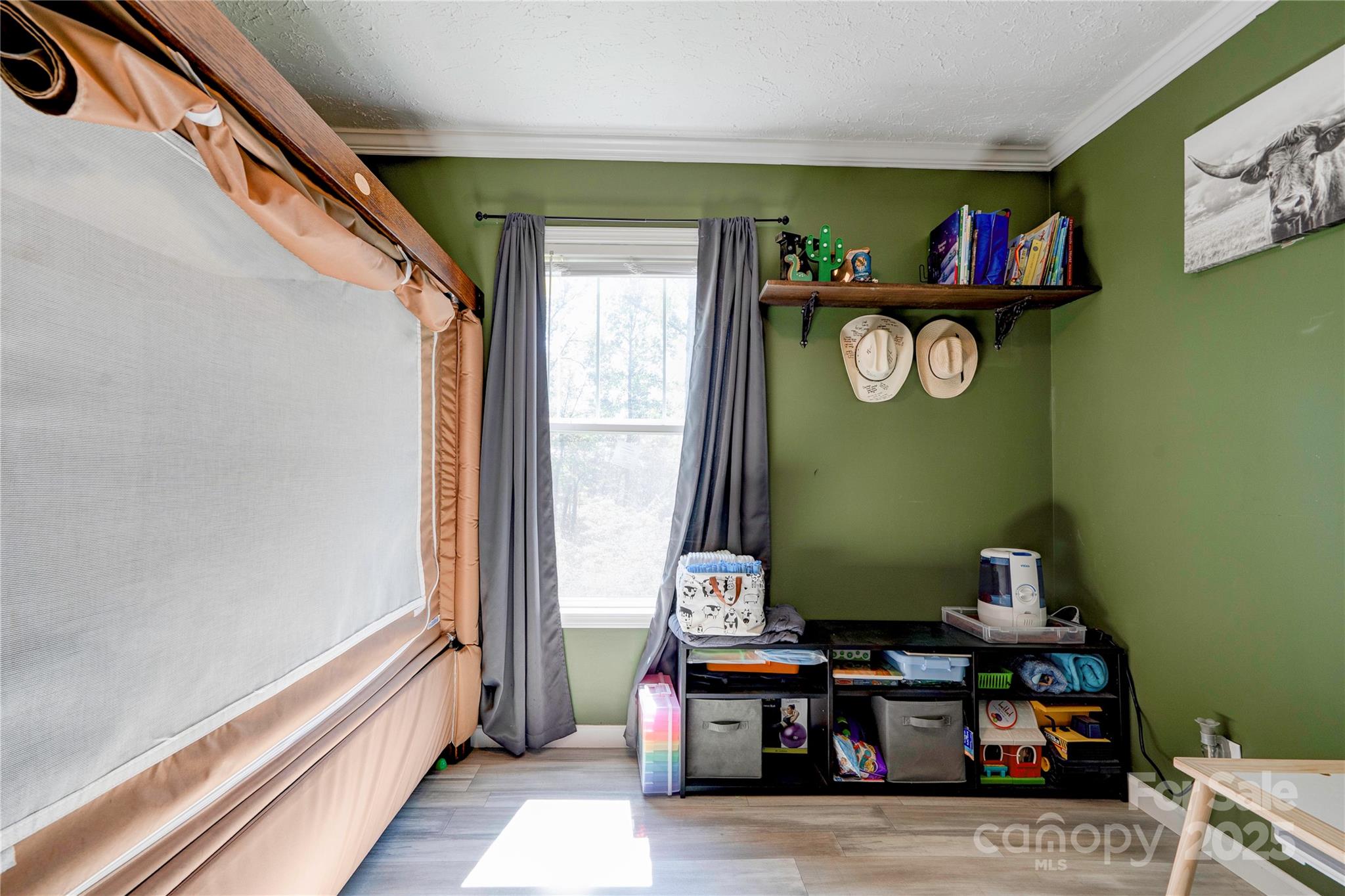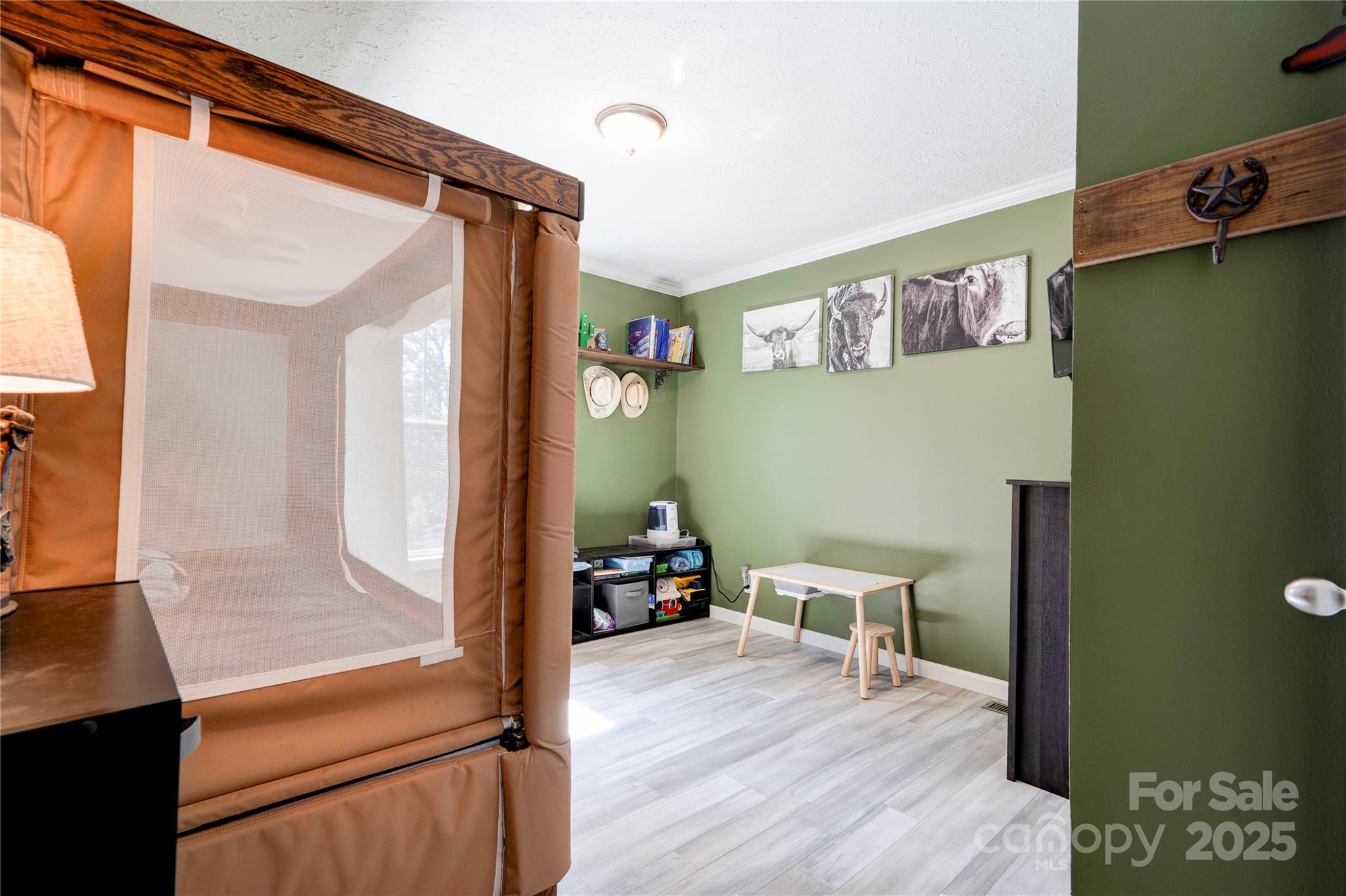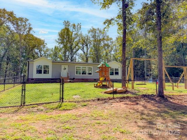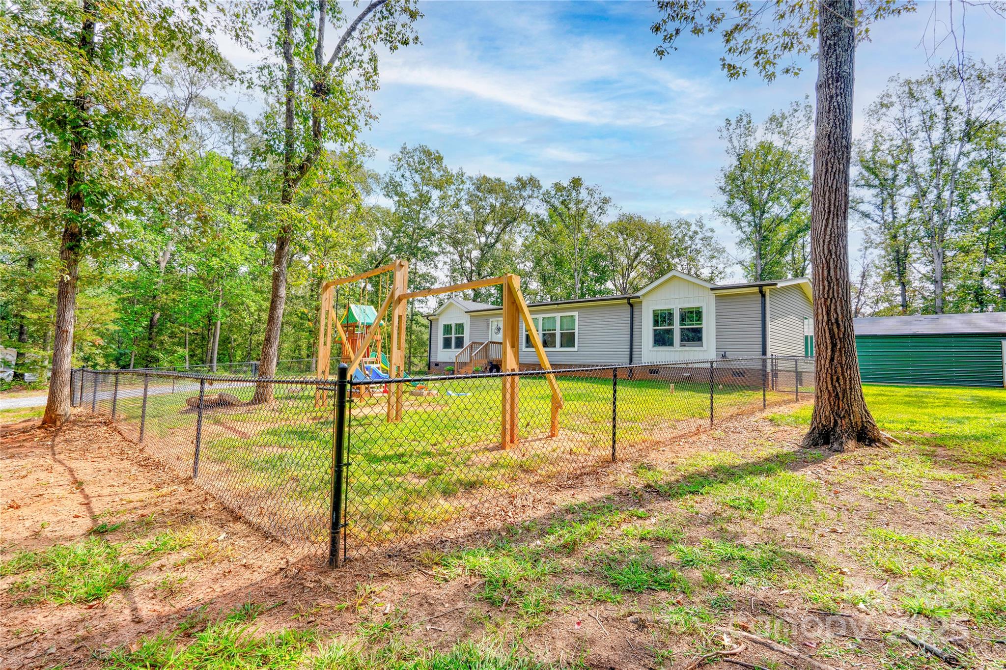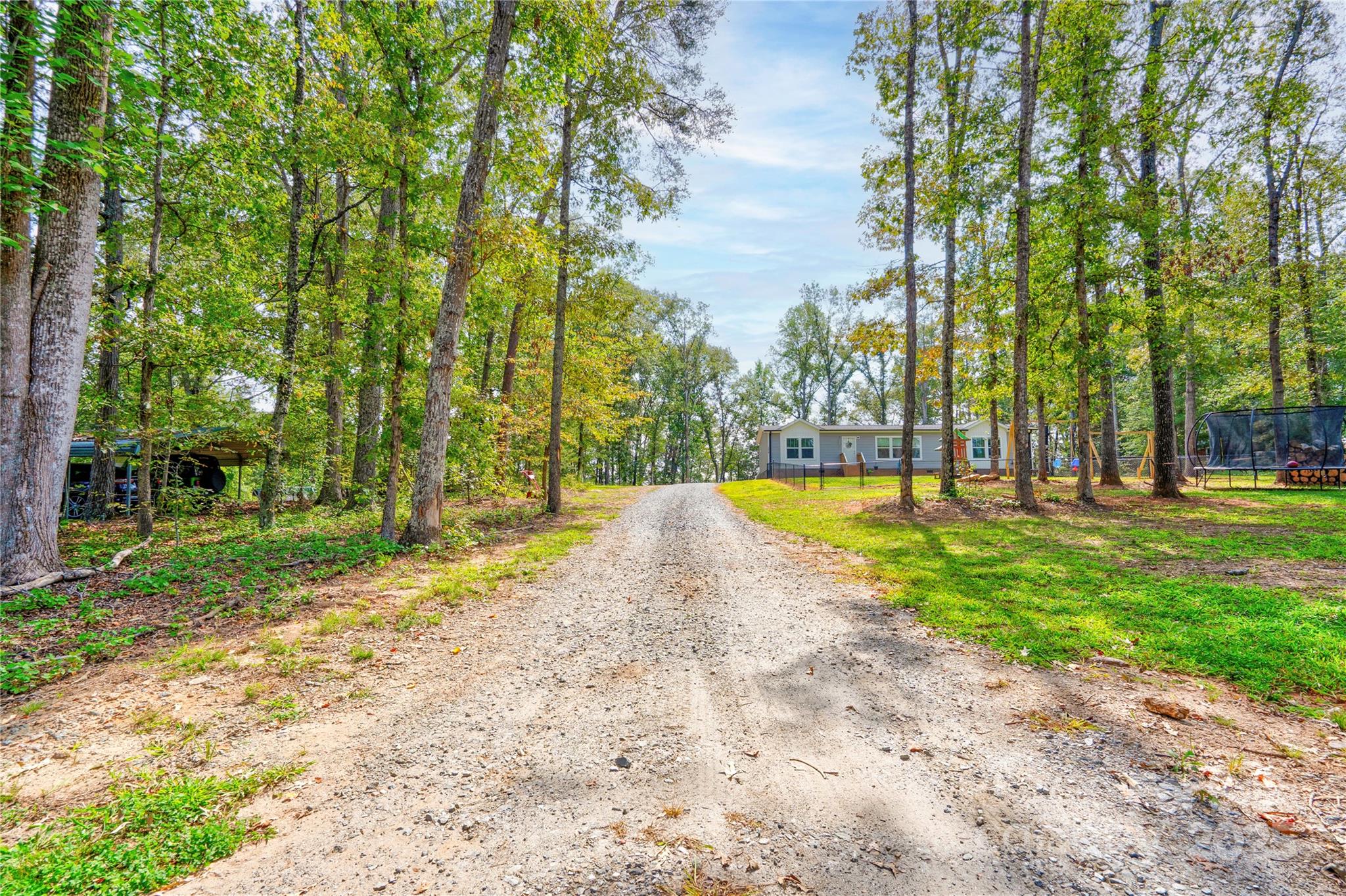 Don't miss this home nestled back in the trees. It is a split bedroom plan and also an open floor plan. The living, dining and kitchen are open with tall windows in the dining kitchen and master bath area lending to good natural lighting. The primary bath has a large walk-in shower and the vanity has double sinks plus a linen closet. The walls are sheetrock. There is crown moulding and some recessed lighting. There is also a double vanity in the 2nd bathroom. On the front of the home there is a fenced section the length of the home with a drive thru gate plus two walk thru gates. In the back you will find a 24x39 garage type workshop with the back portion being sectioned off for storage. It has a single garage door and two exterior doors.