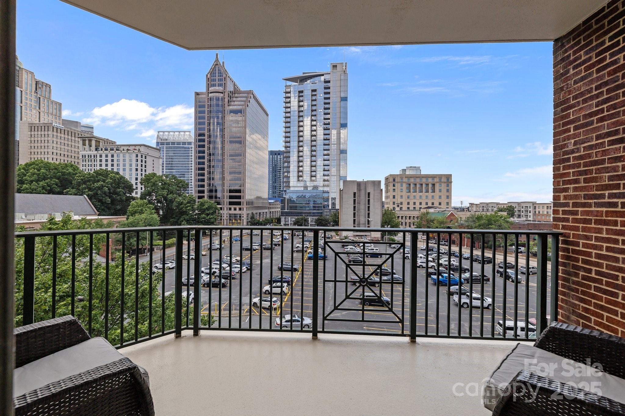 Experience life at Fifth & Poplar - Uptown Charlotte’s premier condo community. This spacious 1-bedroom condo features an open layout with beautiful hardwood floors, freshly painted walls, custom closet built-ins, and new carpet. Enjoy the unobstructed views of the Queen City skyline from your private patio, which fills the space with natural light. Conveniently located near an elevator which takes you straight to the corner of 5th and Poplar, just steps from all the dining, shopping, and entertainment one will need. The community offers amenities including a private courtyard, swimming pool, a fitness center, a fireside terrace, a pet park, and a media room. Feel secure and welcomed with the 24/7 concierge service in the main lobby. HVAC units were replaced 4 years ago, and the barely used Samsung washer & dryer conveys.
