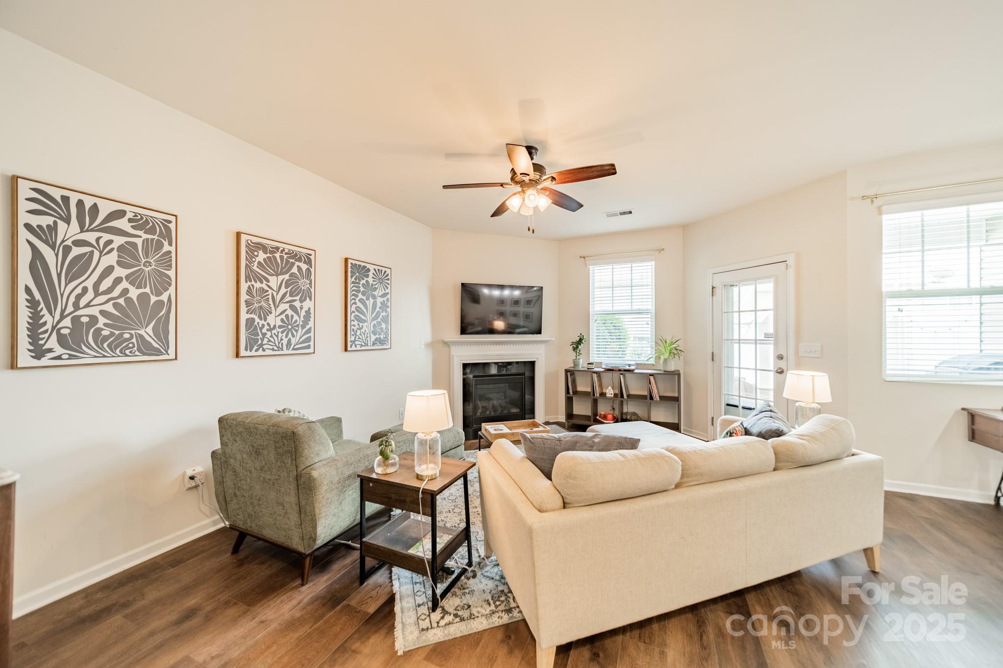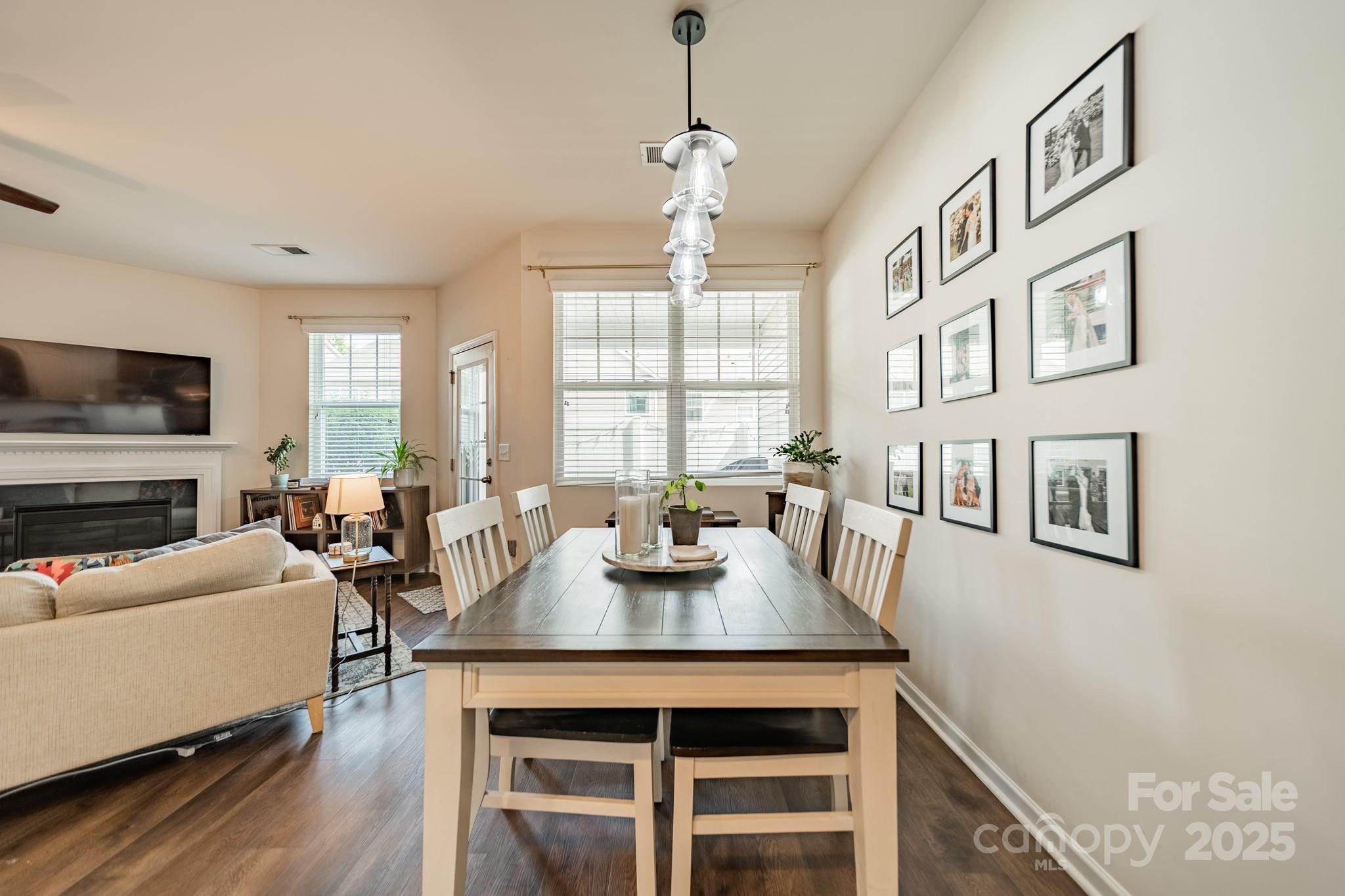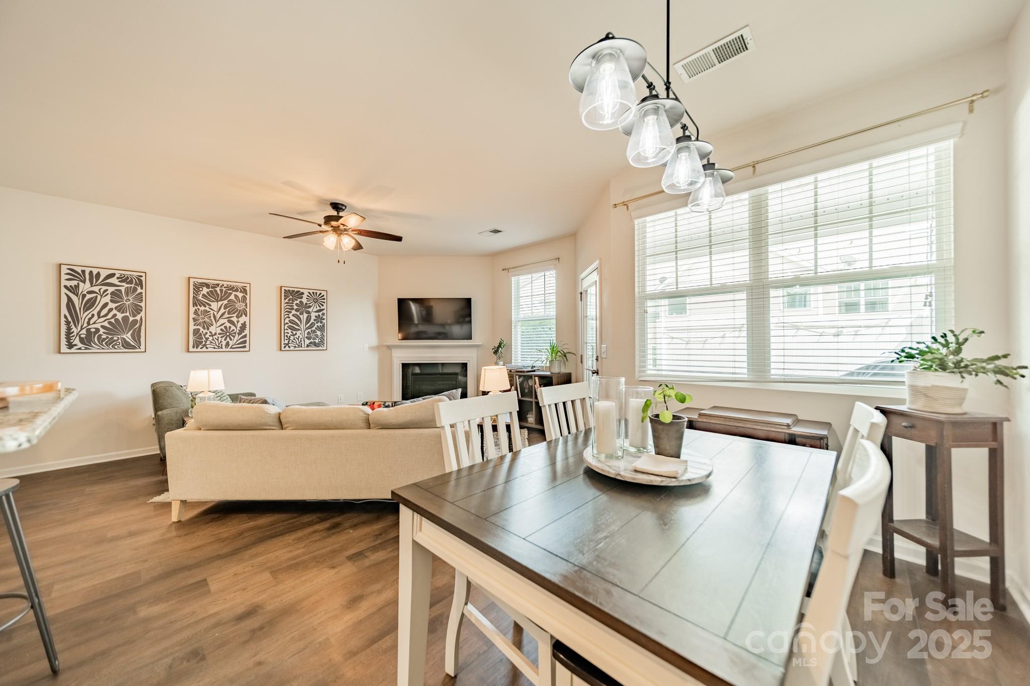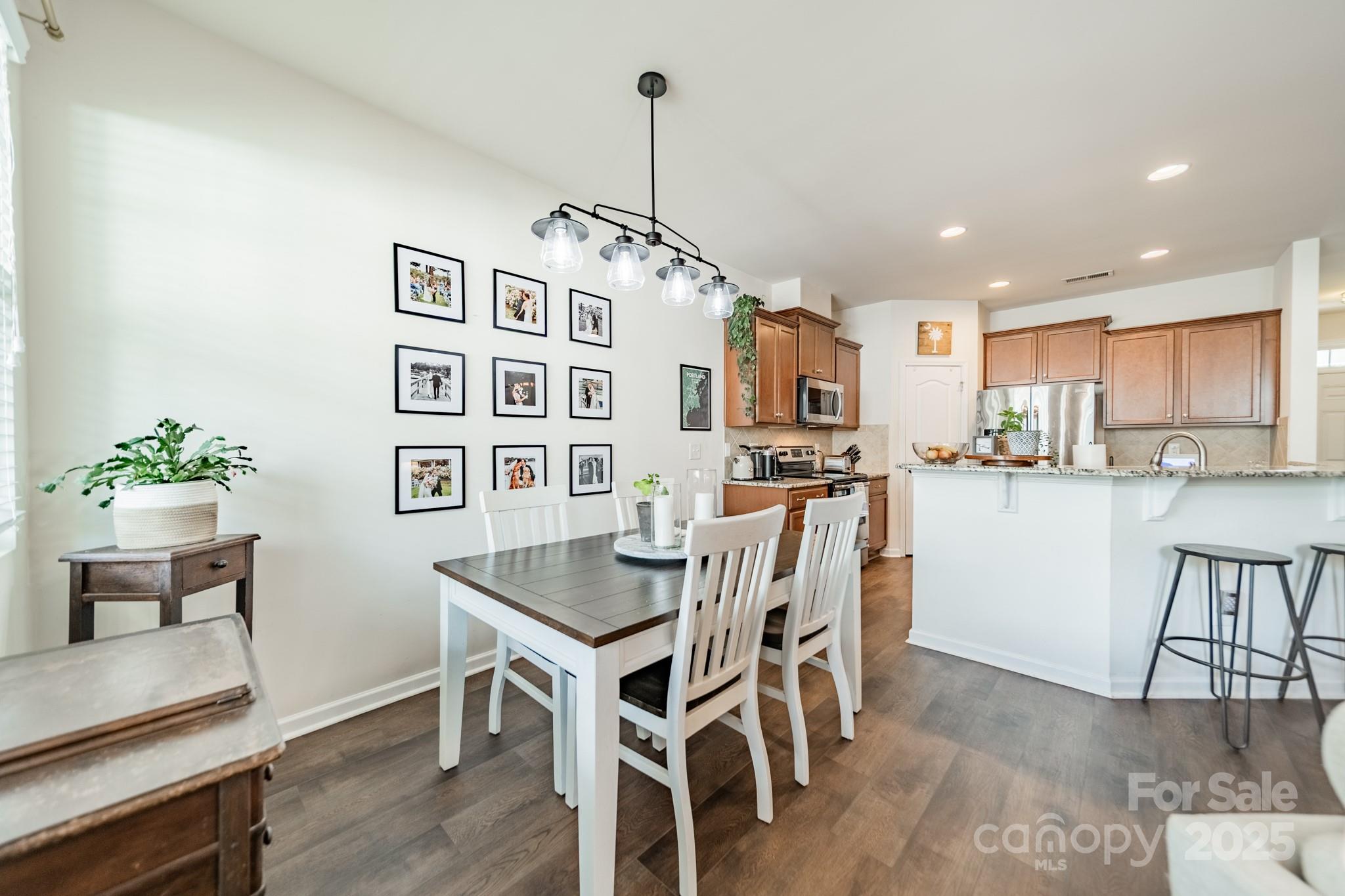 Beautifully maintained 3BR, 2.5BA townhome in the desirable Woodlands community. Open-concept layout with hardwood floors on the main level, spacious great room with gas log fireplace, and natural light throughout. The kitchen features granite countertops, tile backsplash, stainless steel appliances, recessed lighting, and a large island with bar seating—great for entertaining. Upstairs, the primary suite offers a tray ceiling, walk-in closet, and en-suite bath with soaking tub, tiled shower, and dual vanities. Two more bedrooms, full bath, and laundry complete the upper level. Notable updates include LVP flooring (2021) and new HVAC (2022). Enjoy the fenced patio and welcoming front porch. Additional features: fresh paint, upgraded fixtures, and one-car garage. Community amenities include pool, clubhouse, and walking trails. Convenient to Lake Wylie, shopping, dining, and India Hook Elementary.
