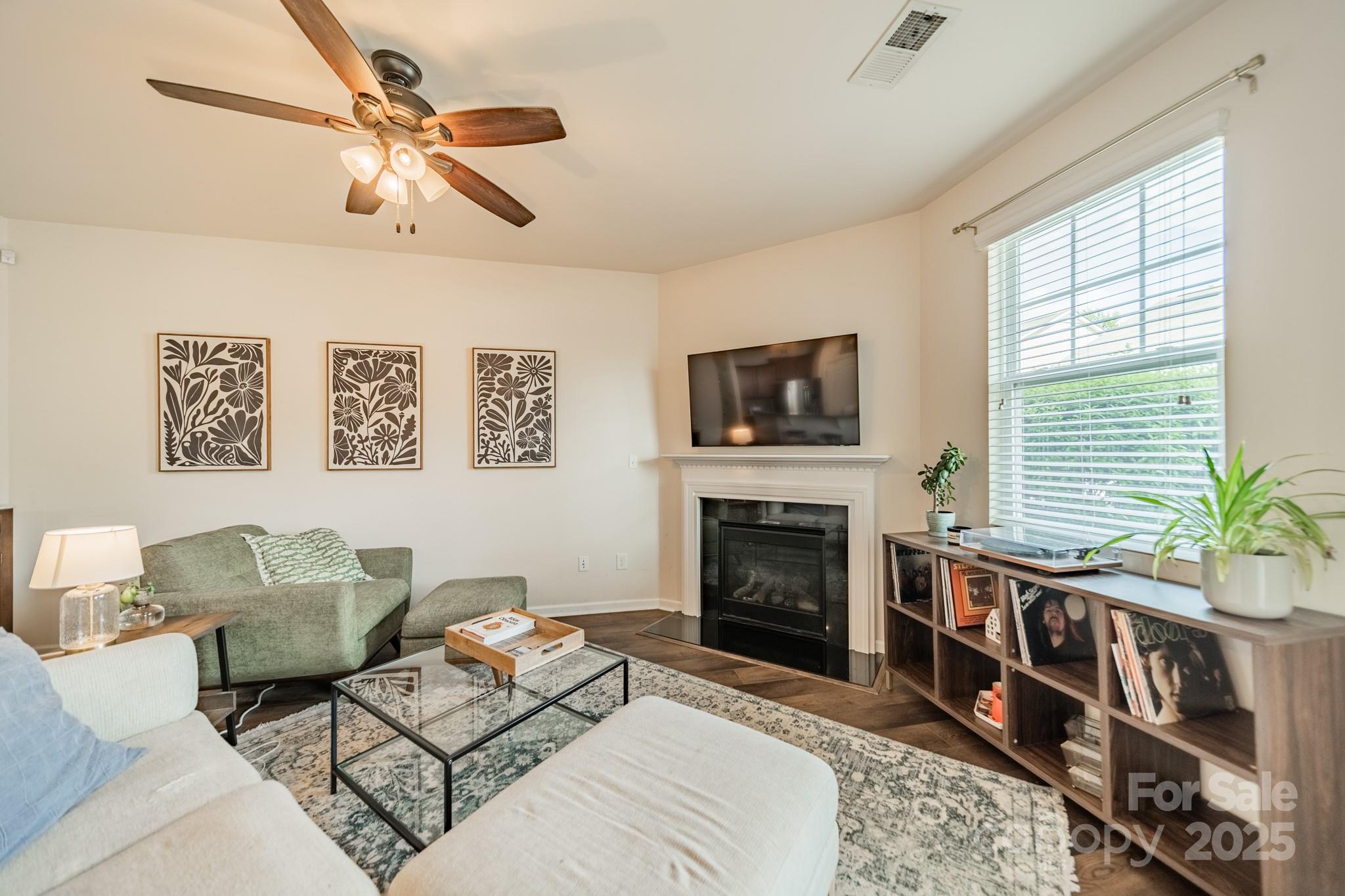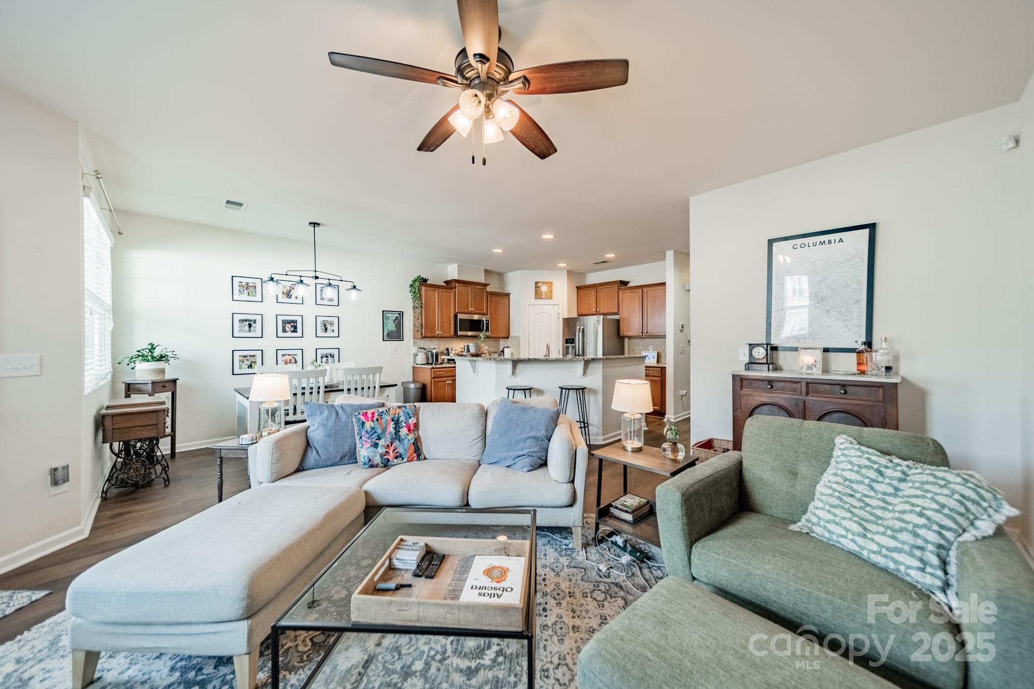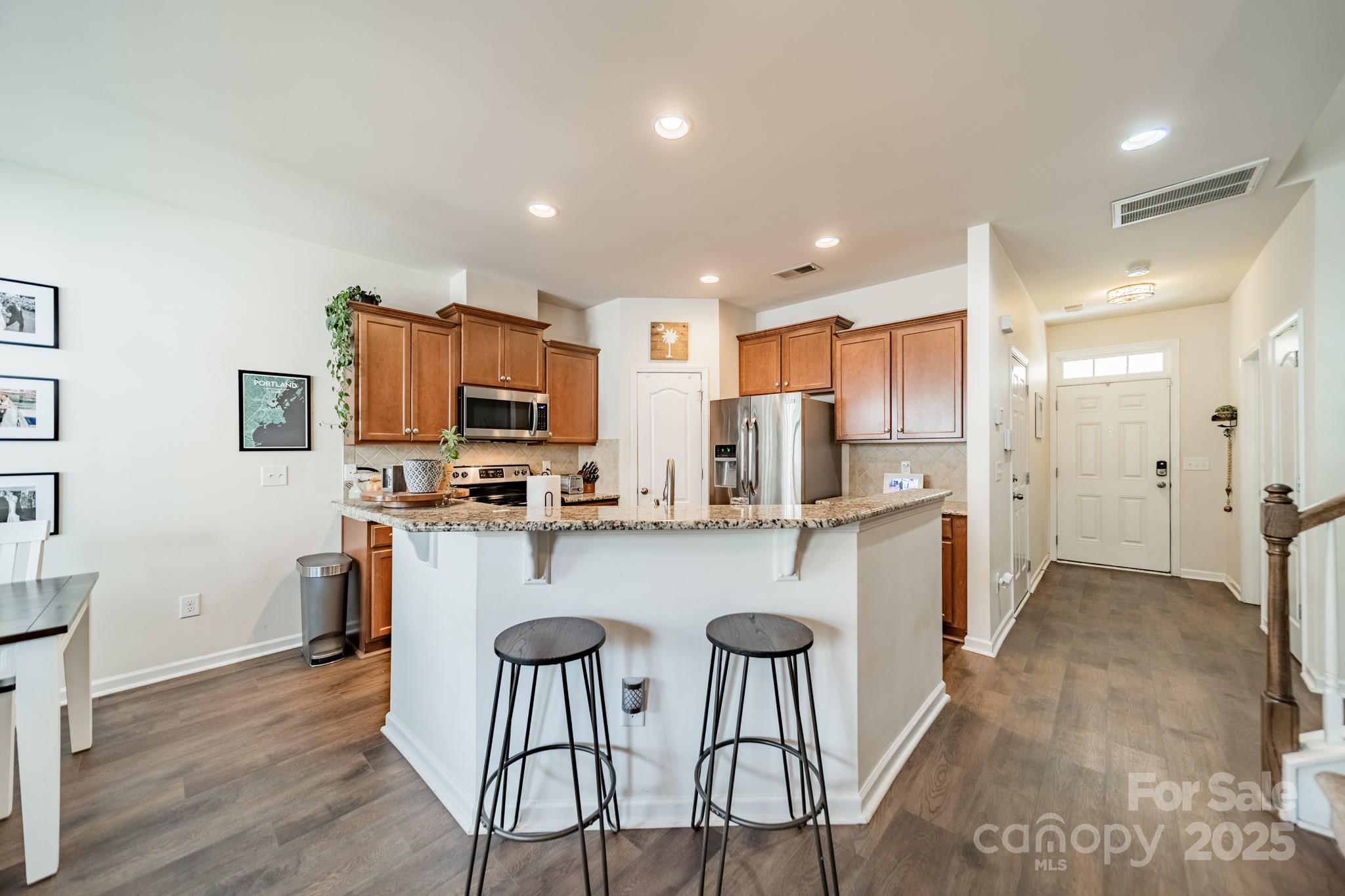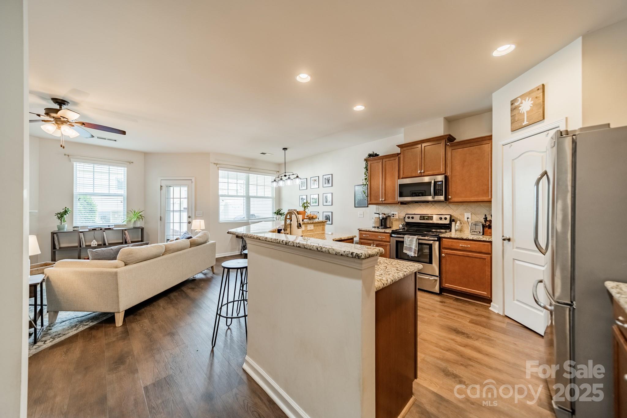 Beautifully maintained 3BR, 2.5BA townhome in the desirable Woodlands community. Open-concept layout with hardwood floors on the main level, spacious great room with gas log fireplace, and natural light throughout. The kitchen features granite countertops, tile backsplash, stainless steel appliances, recessed lighting, and a large island with bar seating—great for entertaining. Upstairs, the primary suite offers a tray ceiling, walk-in closet, and en-suite bath with soaking tub, tiled shower, and dual vanities. Two more bedrooms, full bath, and laundry complete the upper level. Notable updates include LVP flooring (2021) and new HVAC (2022). Enjoy the fenced patio and welcoming front porch. Additional features: fresh paint, upgraded fixtures, and one-car garage. Community amenities include pool, clubhouse, and walking trails. Convenient to Lake Wylie, shopping, dining, and India Hook Elementary.