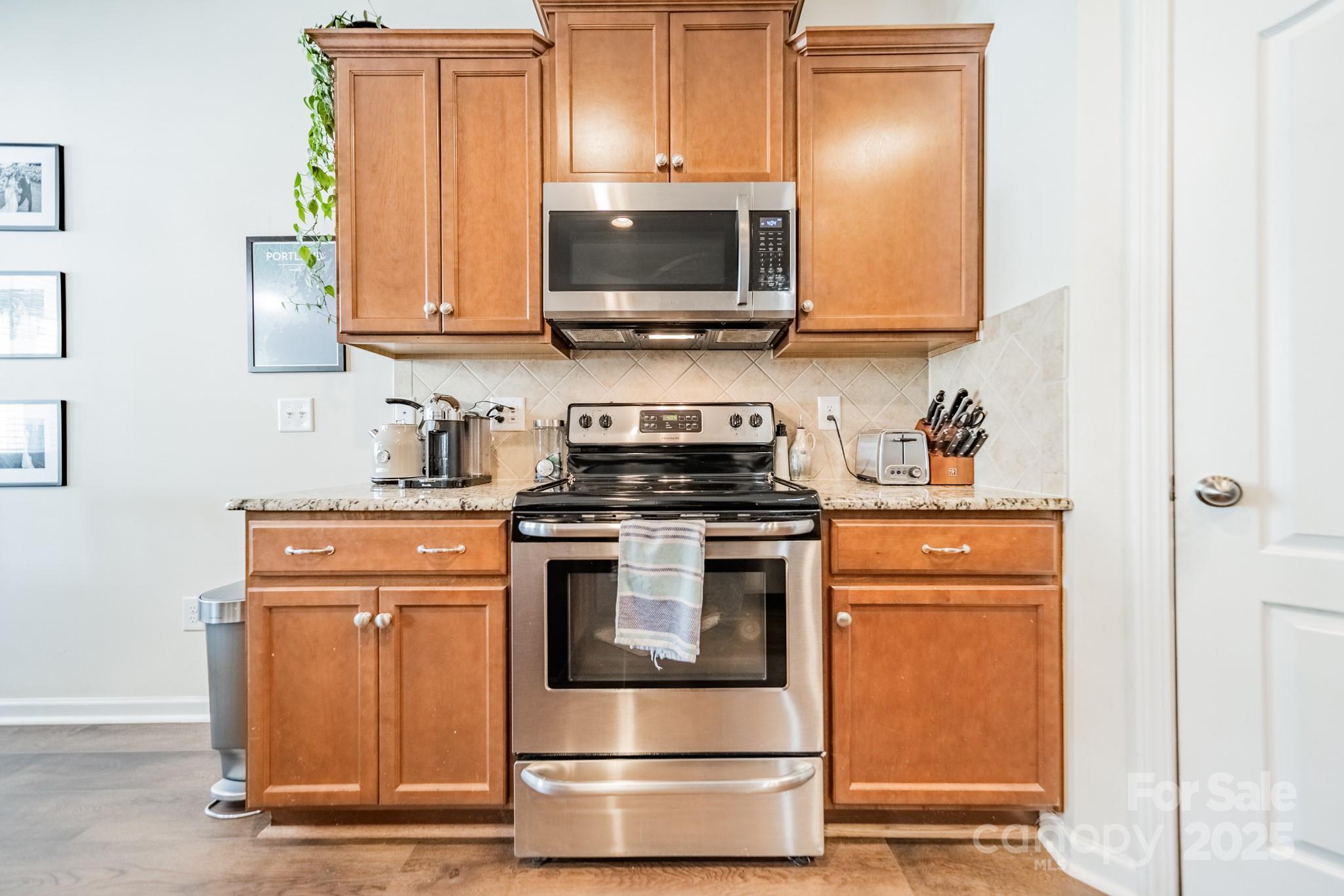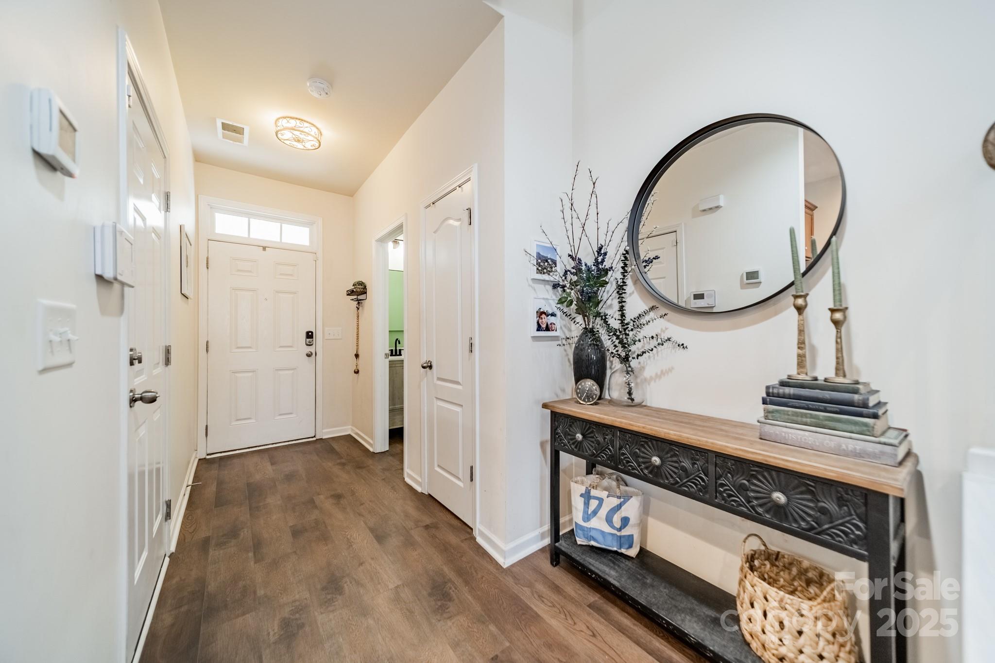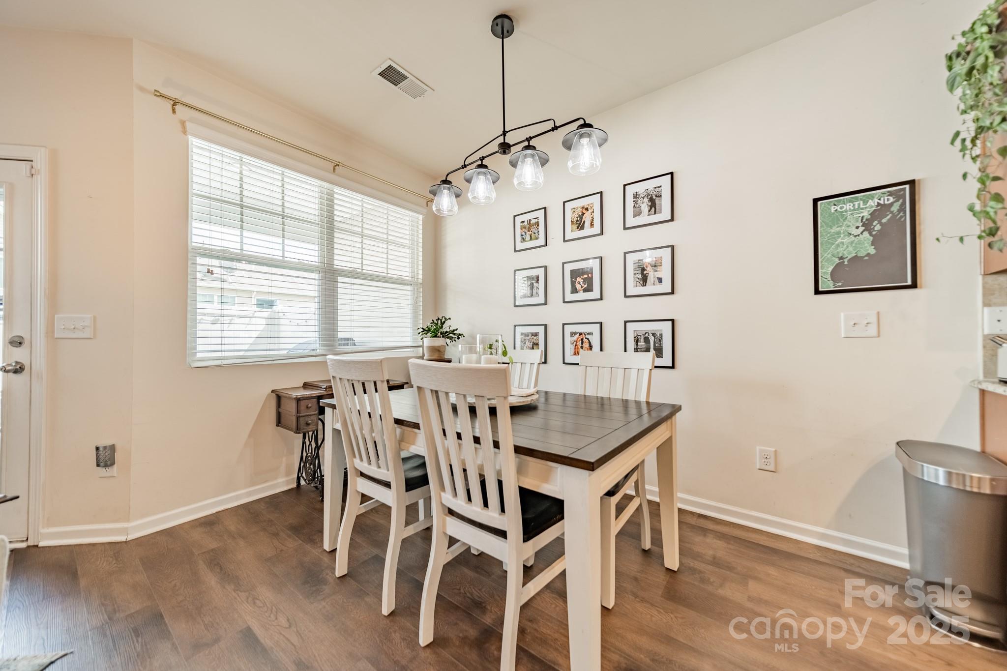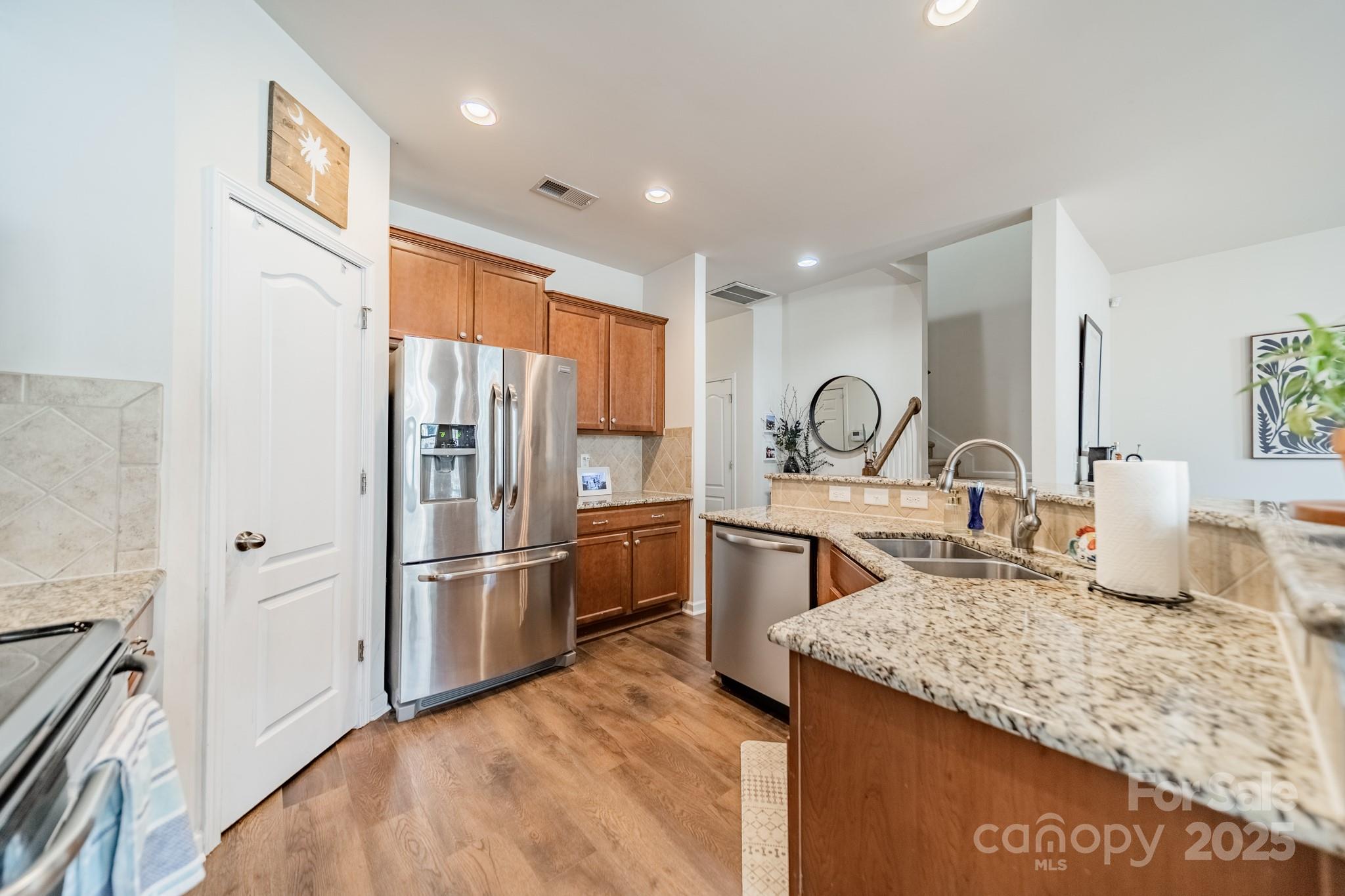 Beautifully maintained 3BR, 2.5BA townhome in the desirable Woodlands community. Open-concept layout with hardwood floors on the main level, spacious great room with gas log fireplace, and natural light throughout. The kitchen features granite countertops, tile backsplash, stainless steel appliances, recessed lighting, and a large island with bar seating—great for entertaining. Upstairs, the primary suite offers a tray ceiling, walk-in closet, and en-suite bath with soaking tub, tiled shower, and dual vanities. Two more bedrooms, full bath, and laundry complete the upper level. Notable updates include LVP flooring (2021) and new HVAC (2022). Enjoy the fenced patio and welcoming front porch. Additional features: fresh paint, upgraded fixtures, and one-car garage. Community amenities include pool, clubhouse, and walking trails. Convenient to Lake Wylie, shopping, dining, and India Hook Elementary.