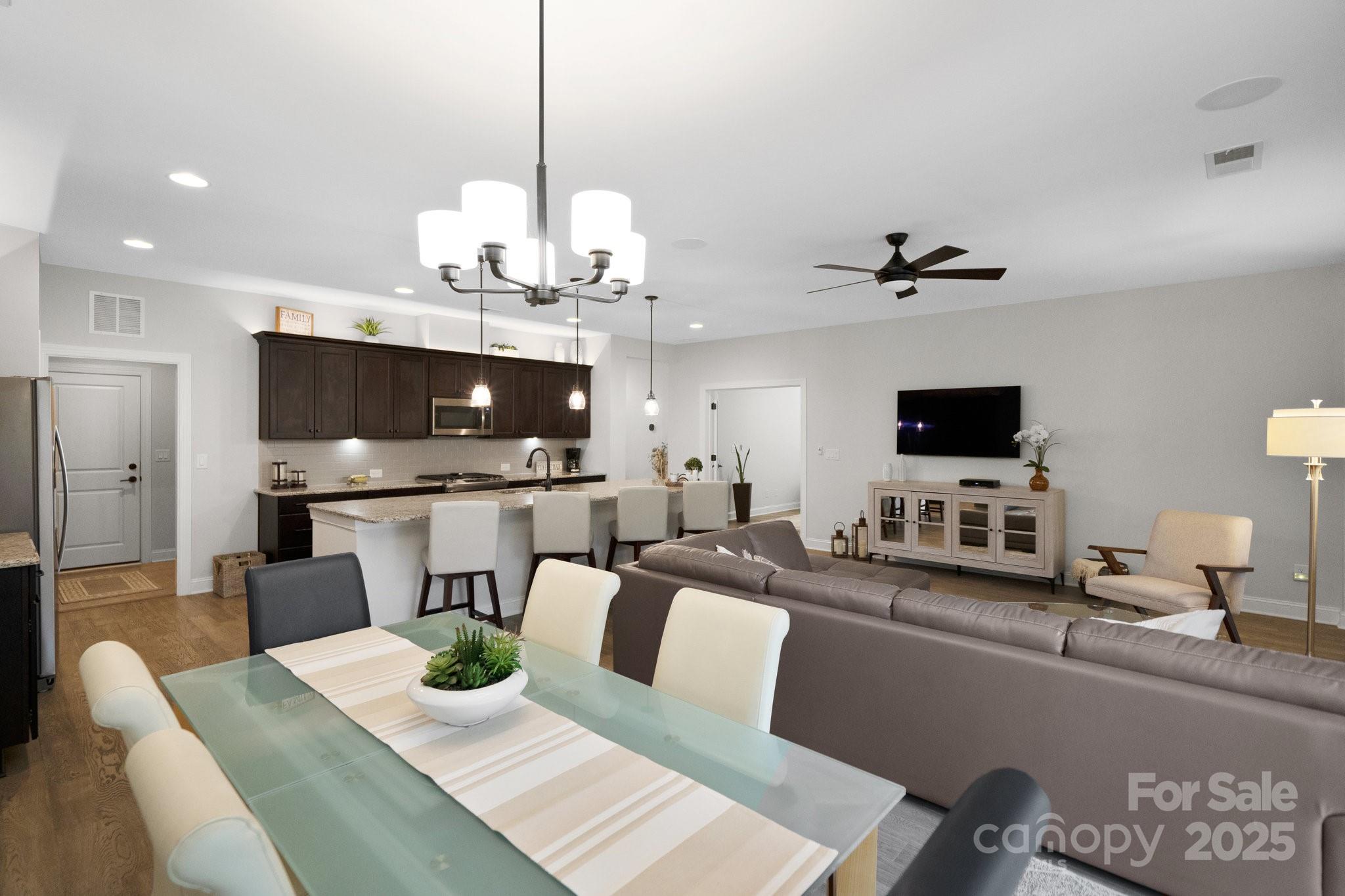 Enjoy the private, park like, wooded, grassy knoll views from this well maintained Connect w/open concept living and multi use floor plan. Wood and tile floors for easy maintenance. Exceptional kitchen features amazing storage and counter space, plus a gas range, tile back splash, over cabinet lighting and huge island complete with solid surface counter tops. Adjoining dining area for large gatherings opens to the covered screened Lanai that features an extended paver patio plus a relaxing stone fire pit with seating wall for added entertaining options. Great room has built in speakers, recessed and designer lighting. Grand primary bedroom and en-suite bath with dual sink vanity, tiled shower, walk in and linen closets. Added bonus: office/den flex room offers imaginative use of the space for your creative endeavors. 2 ample guest bedrooms with central bath. Custom blinds throughout. Trilogy Membership include Freedom Boat Club on Lake Norman plus award winning amenities