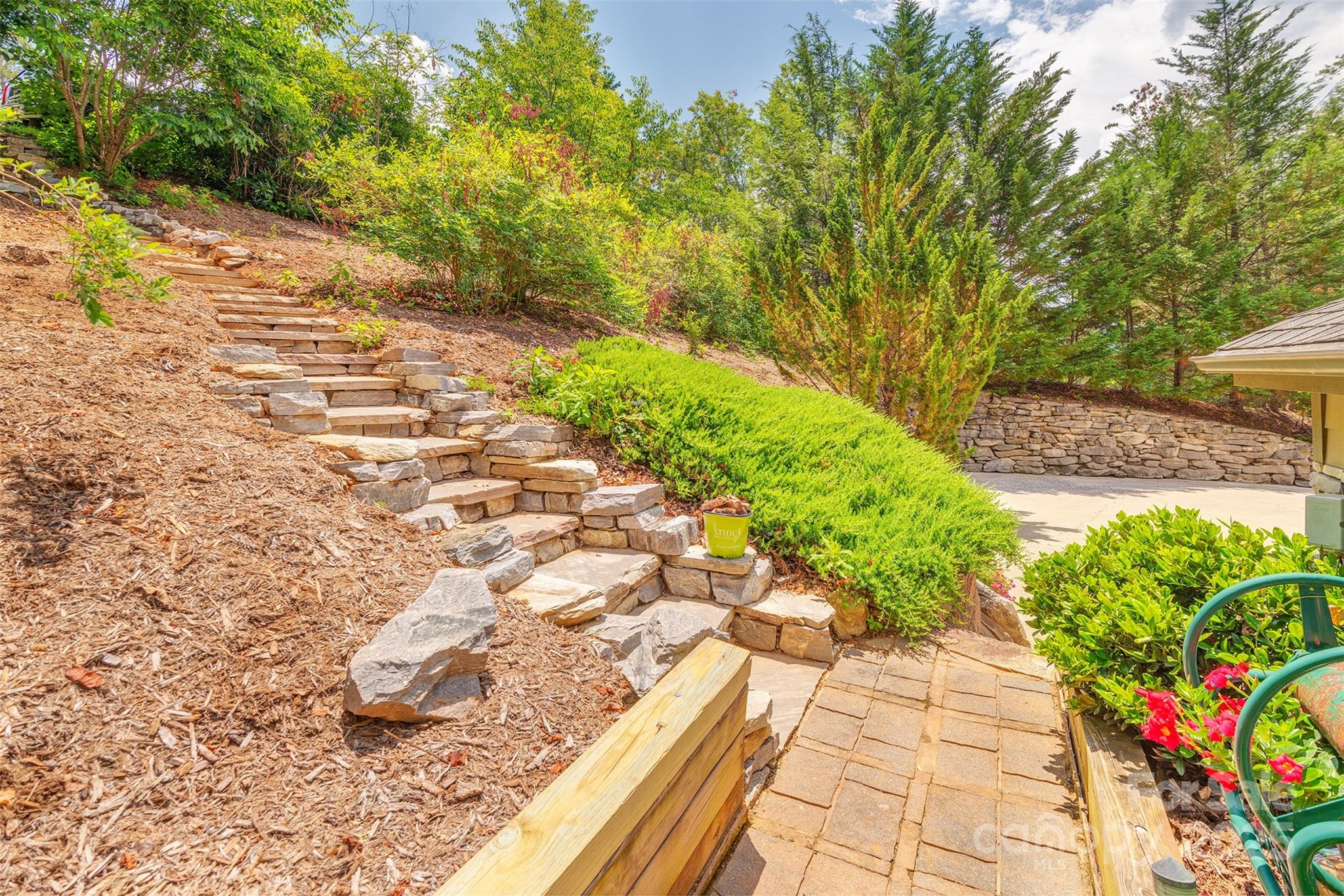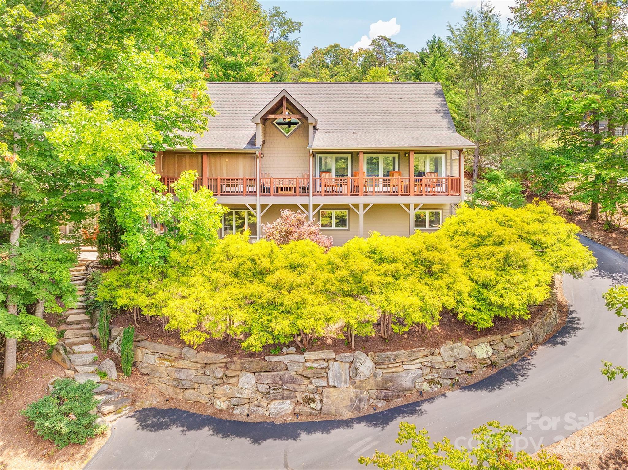 This Reems Creek Golf Community beauty has fabulous curb appeal and sits up a gentle meandering driveway that wraps around to courtyard parking and a spacious 2-car garage & no steps from your car - you enter through the laundry room to the kitchen! 4167 finished sqft on 2 levels with a loft plus decks/patios off each side/level. Vaulted pickled pine ceilings on the main, gorgeous hardwood floors, lots of windows and natural light, gas fireplace with a floor-to-ceiling brick hearth, huge open kitchen to dining & living rooms. Lots of areas for privacy including a primary suite addition with access to private back patio (wired for hottub). Upstairs is great for work-from-home office, Expansive lower level has 3 more bedrooms, porch/patios & a family room! Sellers recently refinished the kitchen cabinetry with solid maple doors along with lots of other updates over the years including new driveway, massive landscaping stones and landscaping stairs, shrubs, retaining walls, the primary suite addition, new interior staircase, bathrooms, windows, ipe decking, porches, patios (ask re the full list). The golf community membership is optional and reasonable with a welcoming social community for spectacular golf, pool, clubhouse with a restaurant, pickleball & more. Furnishings may convey!