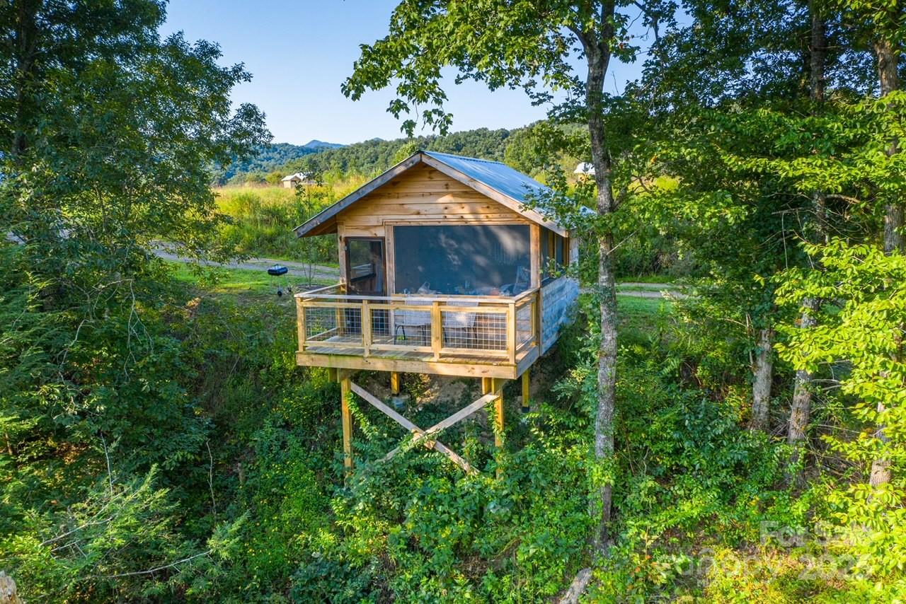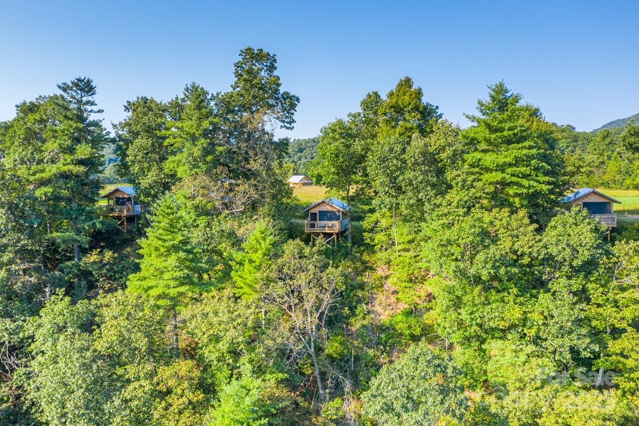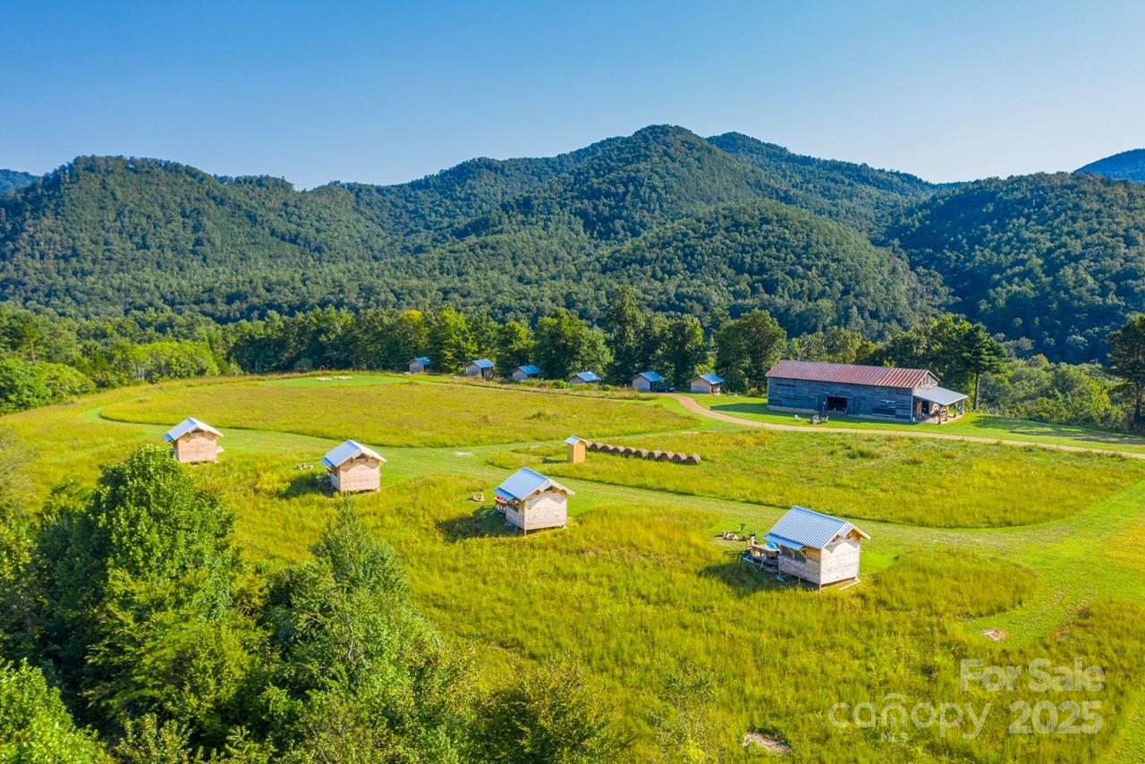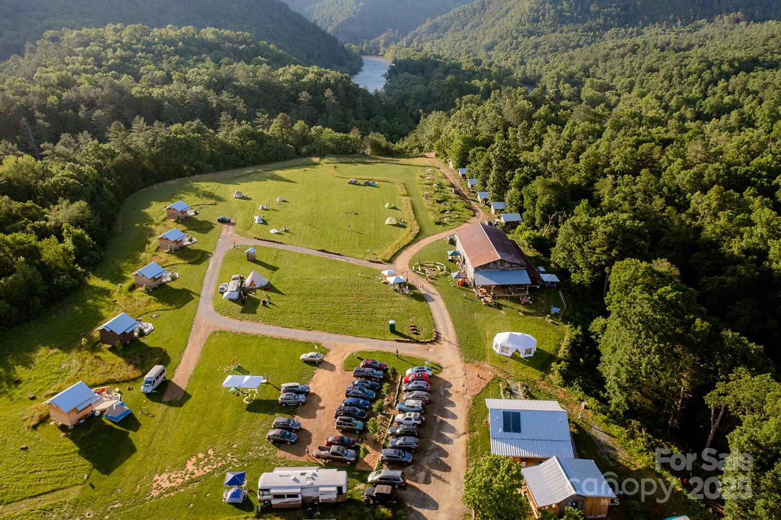 Nestled on 150+/- pristine acres along the French Broad River, Paint Rock Farm is a rare and remarkable retreat surrounded by the Cherokee and Pisgah National Forests. This private estate offers breathtaking views, unmatched serenity, and a climate-resilient location safely out of the floodplain, with comfortable off-grid living potential. With 111 acres protected under a Conservation Easement, the property preserves its natural beauty while offering abundant opportunities for sustainable living and recreation. Improvements include ten 196 sq ft glamping cabins, a 3,200 sq ft renovated event barn ideal for events and gatherings, a 1,200 sq ft solar-heated bathhouse with showers, restrooms, and laundry, and a 400 sq ft tiny house. Foot trails wind through the conserved forest, connecting guests with nature. Graveled driveways and parking. Perfect for weddings, retreats, agritourism, or an estate, Paint Rock Farm offers a unique blend of privacy and potential. No drive bys!
