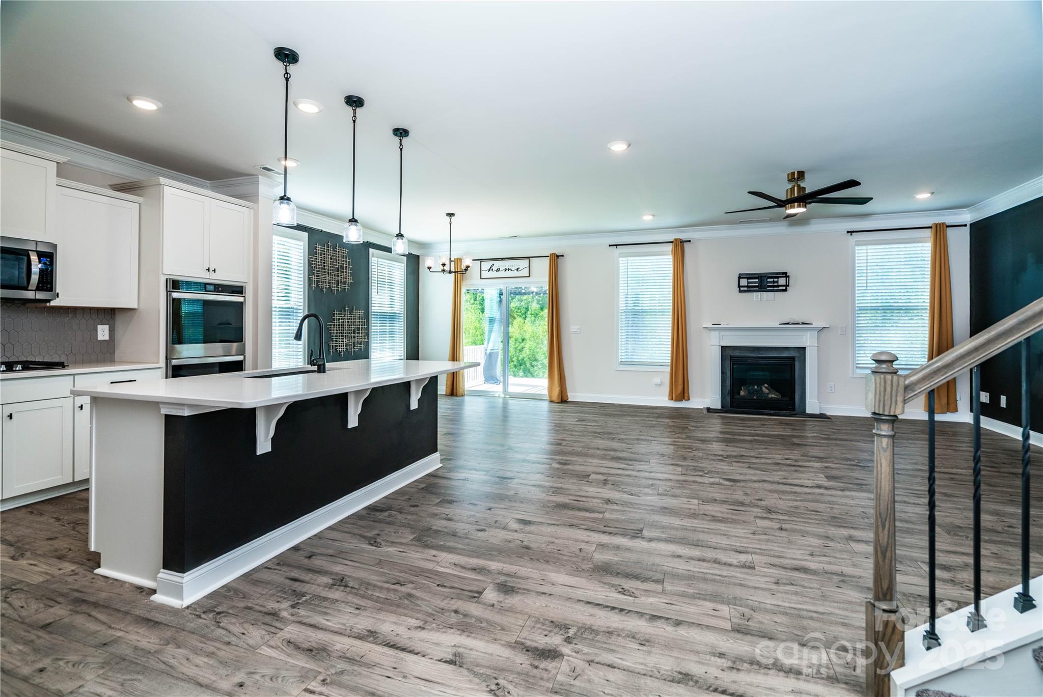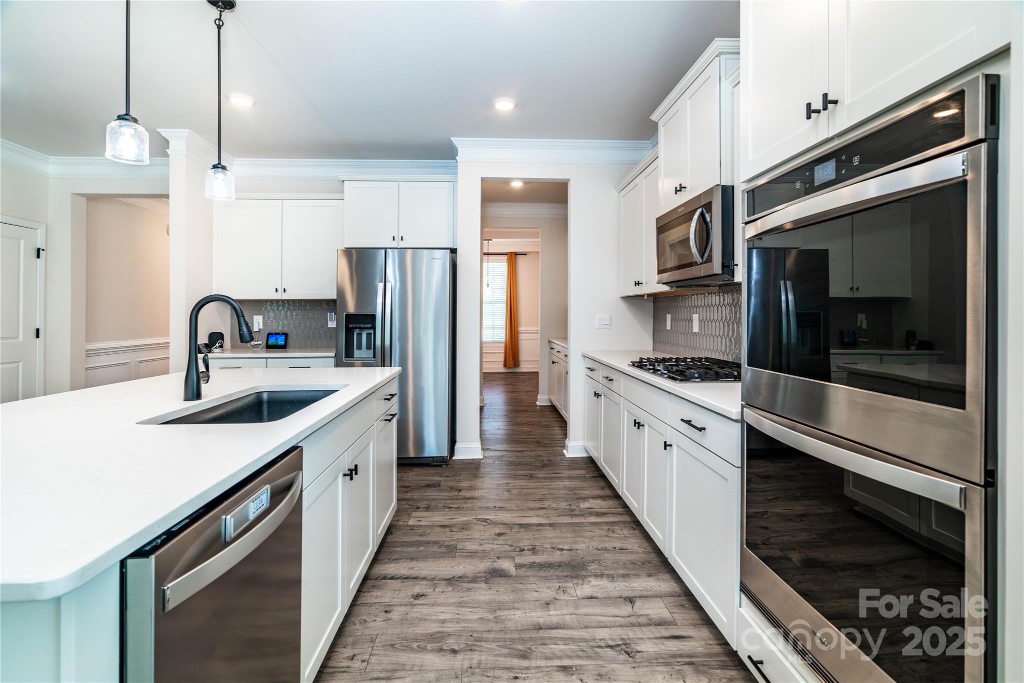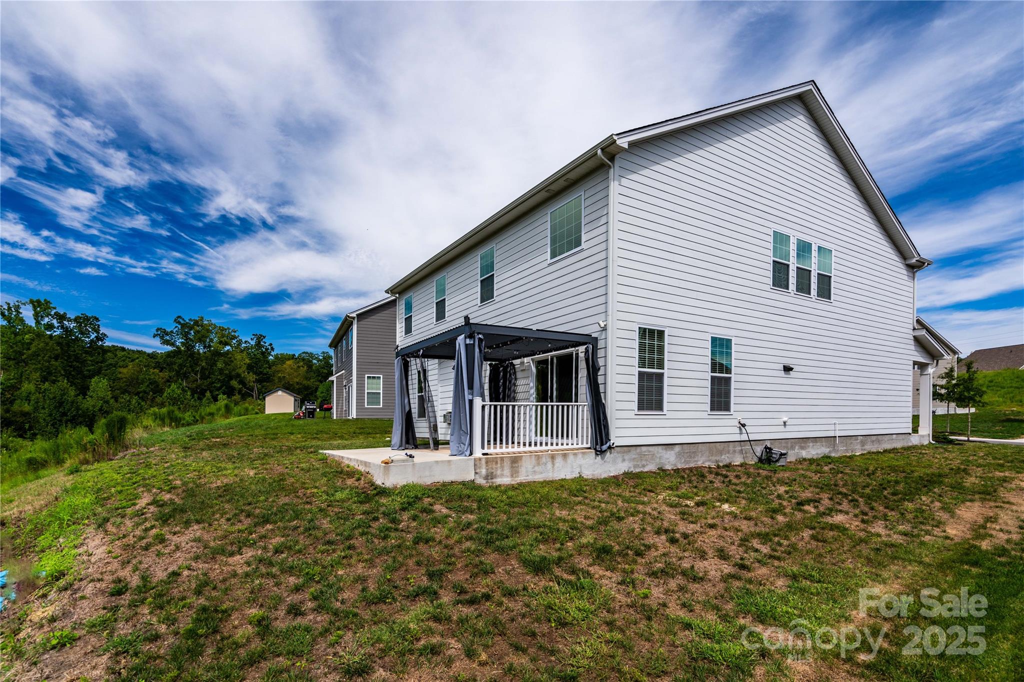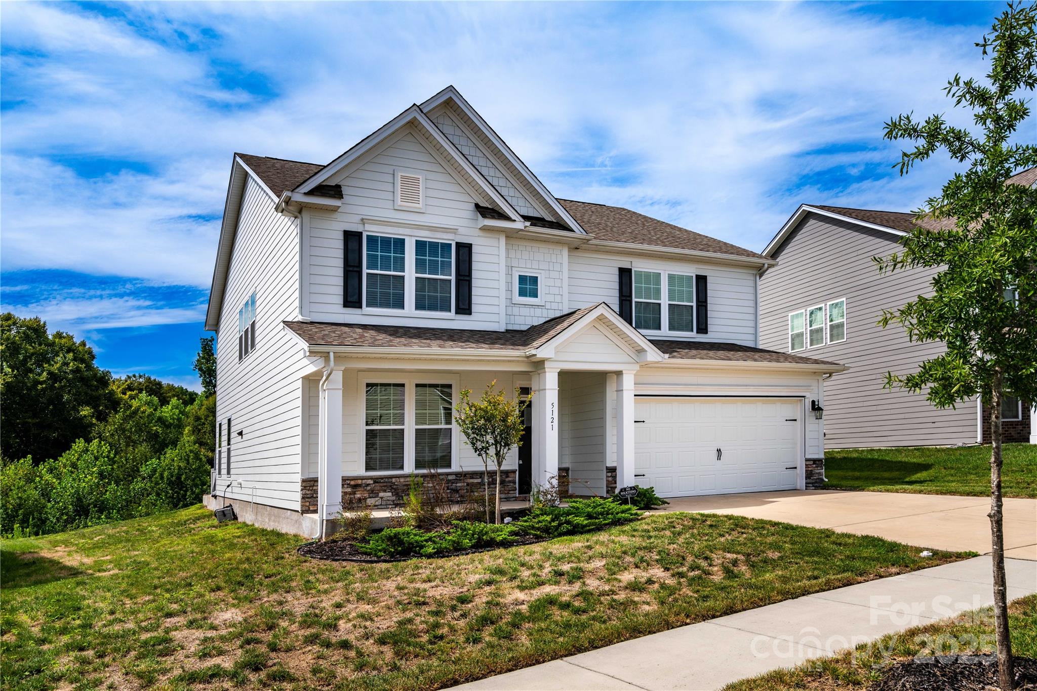 Wow, what a house! Enter through your rocking chair front porch and be greeted by elegant trim work in the foyer, 9ft ceilings on the main level, and a coffered ceiling in the dining with butler's pantry leading towards your beautiful kitchen with a huge island, quartz tops, SS appliances with gas stove, SS refrigerator is included. Kitchen opens to a large family room with cozy gas fireplace, adjacent to a guest room with private bath. Expansive primary bedroom retreat with a sitting area, large primary bath with dual vanities, shower with semi-frameless glass, and huge walk in closet. The awesome bonus/loft has a built in projector and large screen, this room is big and presents as more of a bonus room than a loft.The yard backs to woods for the ultimate privacy while enjoying your expanded patio with pergola. Exterior features included low maintenance fiber cement siding with beautiful stone accents. Also includes a tankless water heater.
