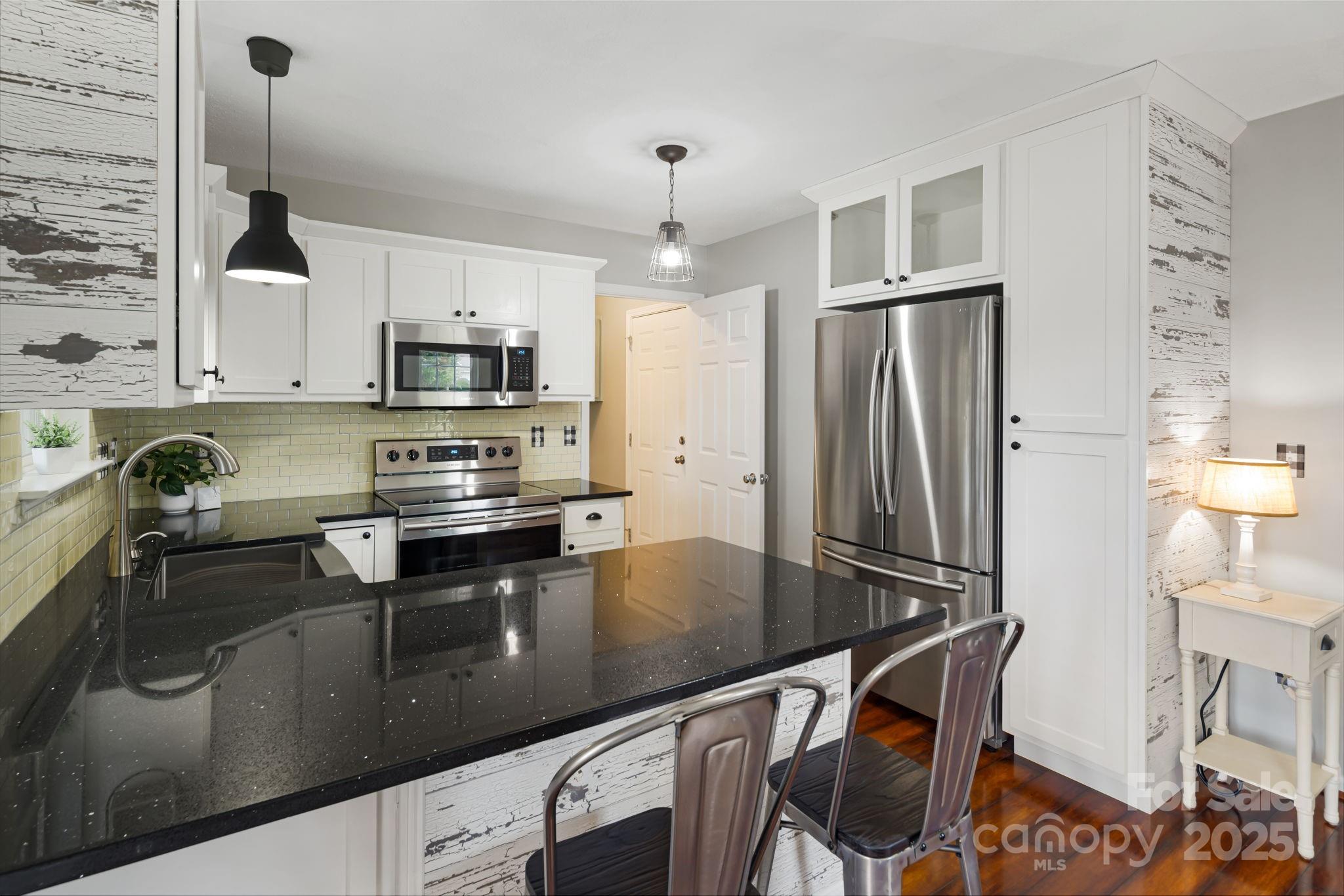 Lock & Leave, light-filled condo offering 3 Bedrooms, 2.5 baths, one car garage with numerous upgrades throughout. The kitchen features a farm sink, custom-crafted cabinetry, quartz countertops, and stainless steel appliances, creating a stylish and functional space for everyday living. A cozy gas fireplace and surround sound (equipment included) enhance the inviting living room. Smart home features include a Nest thermostat and Nest doorbell for added comfort and security. Located next to an extra parking area, this end-unit also enjoys a relatively flat side yard—private back patio with vinyl privacy fencing and concrete tile pavers. Thoughtfully designed for comfort and convenience, this home stands out as one of the best-located end units in Stafford Hills. Perfect for the year-round owner, traveler, or income-producing owner. Enjoy easy access to I-26, Asheville Regional Airport, WNC Agricultural Center, and a variety of nearby shopping and dining options.