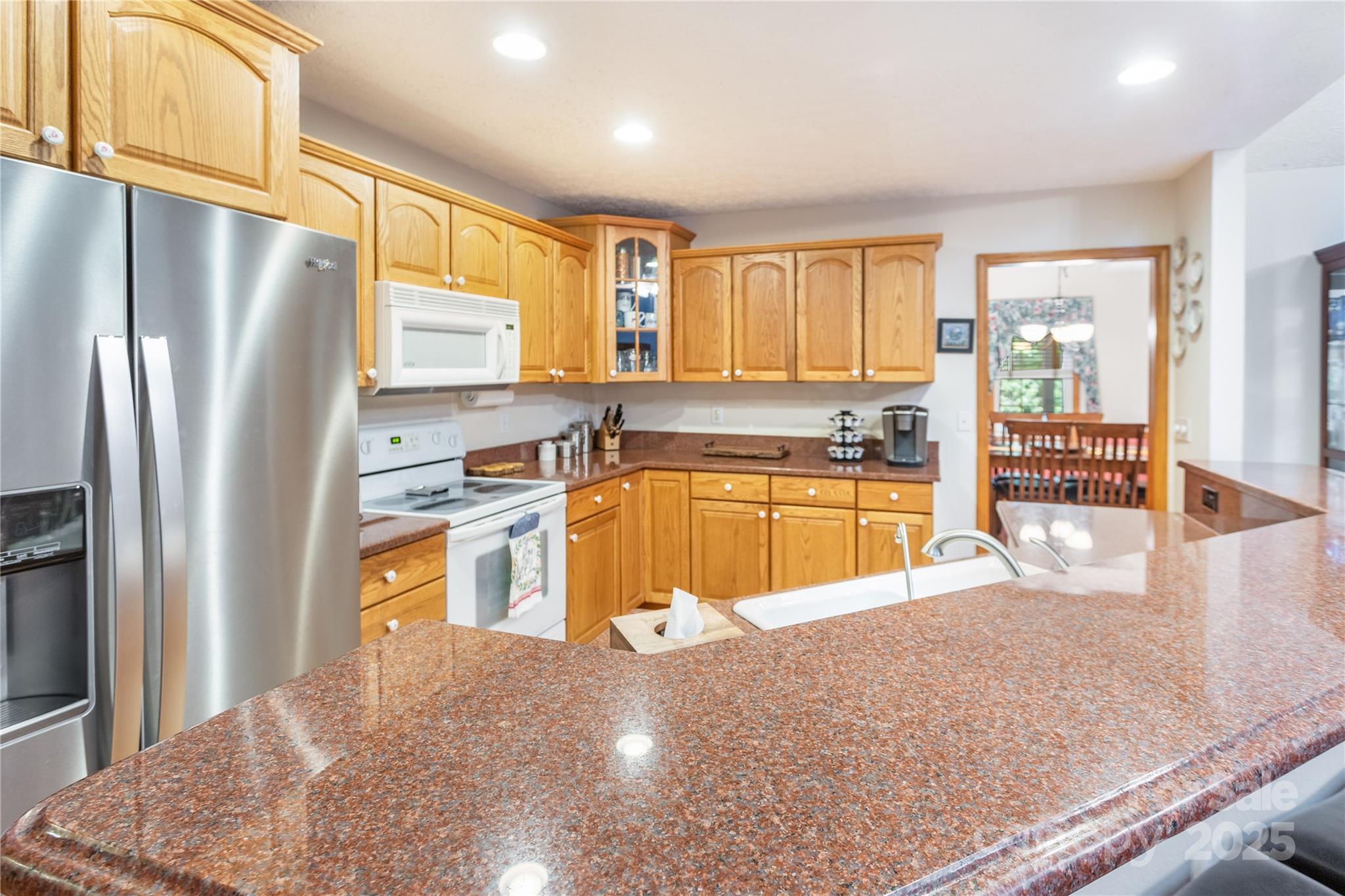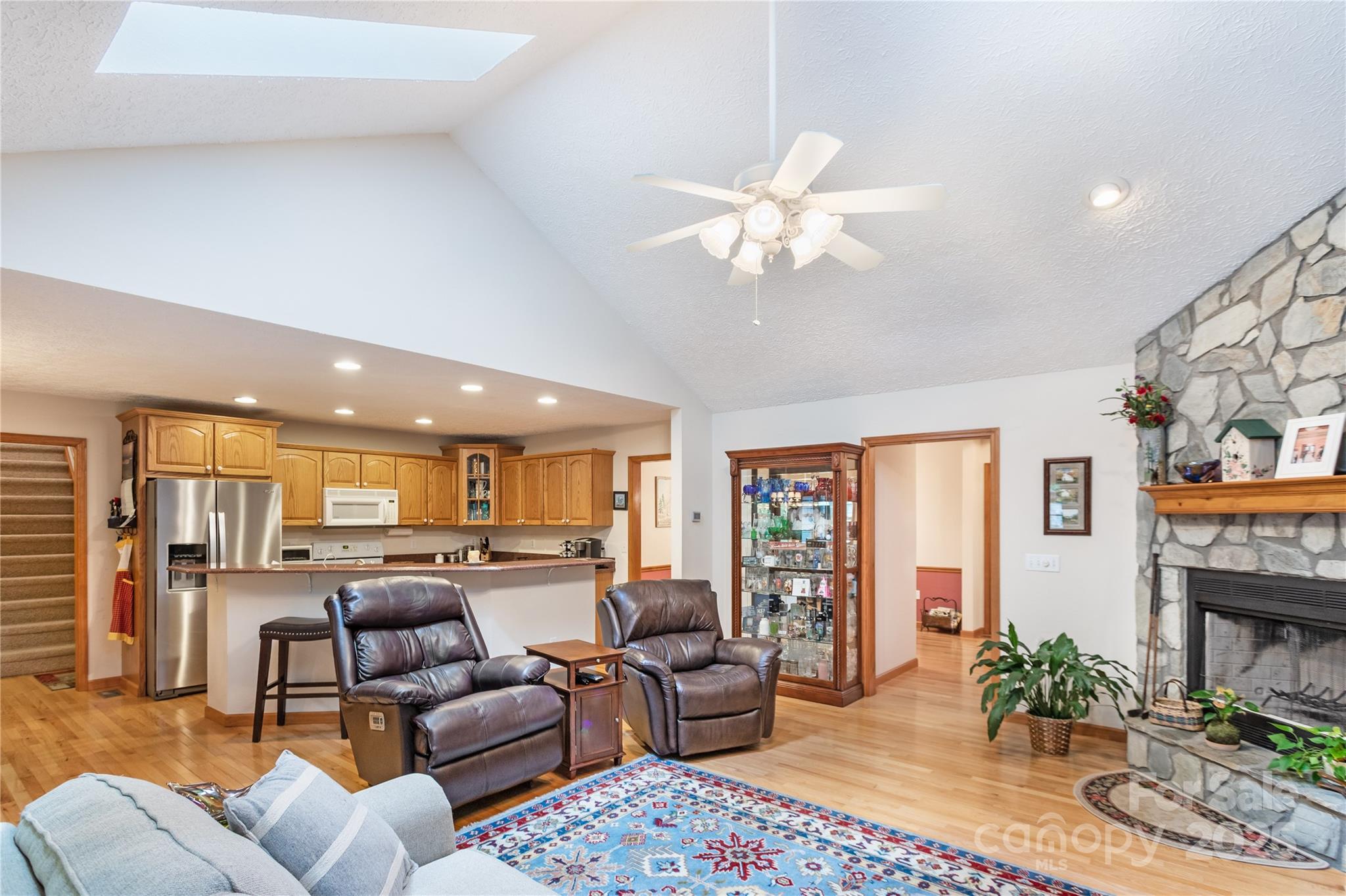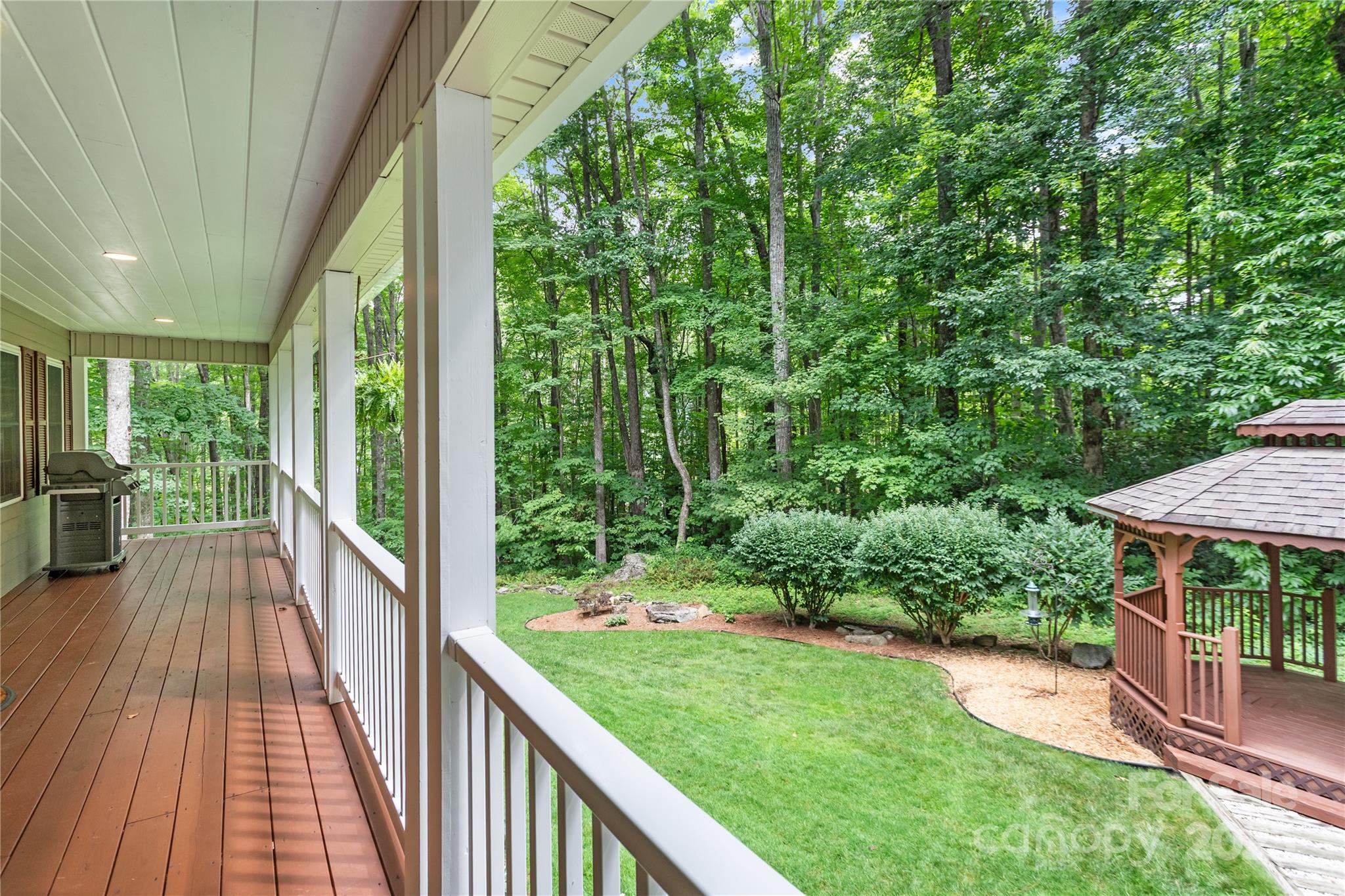 Immaculately maintained 3BR/2BA home exudes charm and offers all one-level living in a stunning park-like setting in the heart of Maggie Valley. The open floor plan features a great room with vaulted ceiling, breakfast nook, and kitchen island seating—perfect for entertaining—along with gleaming hardwood floors and a cozy wood-burning fireplace. The dedicated dining room adjacent to the kitchen boasts a fabulous storage pantry with a myriad of uses. A versatile bonus room is ideal for crafts, play, or a home office. The primary bedroom suite opens to a covered back deck and features a whirlpool tub and walk-in shower. A smart split bedroom plan ensures privacy and comfort for occupants and guests. The oversized 2-car garage includes workspace, while the expansive crawl space boasts a separate workshop and storage. Lush landscaping, a charming gazebo and ample parking complete this private retreat, just minutes from town with convenient year-round access.