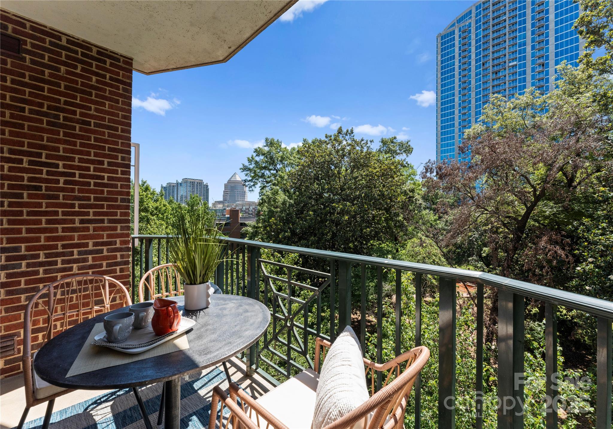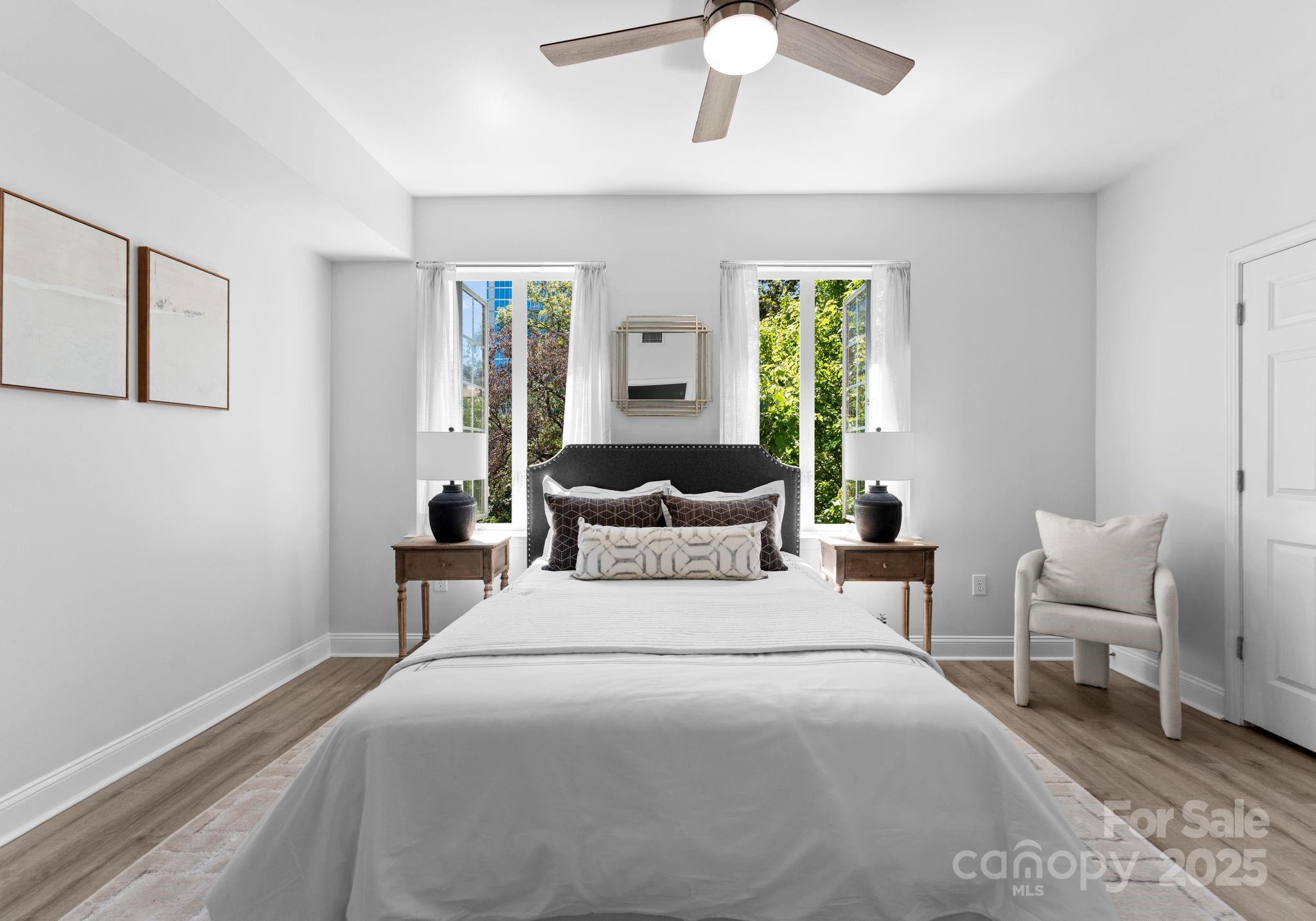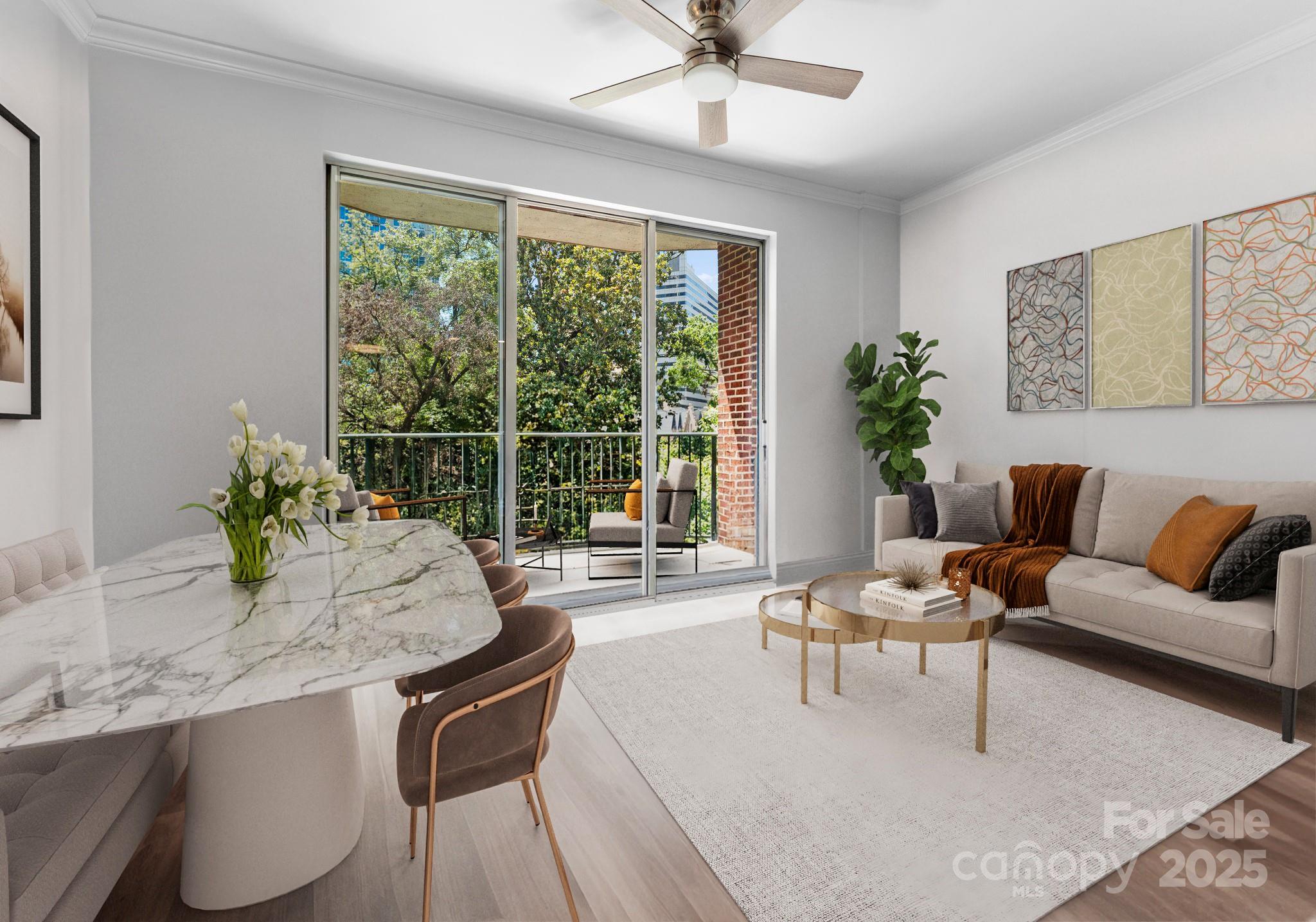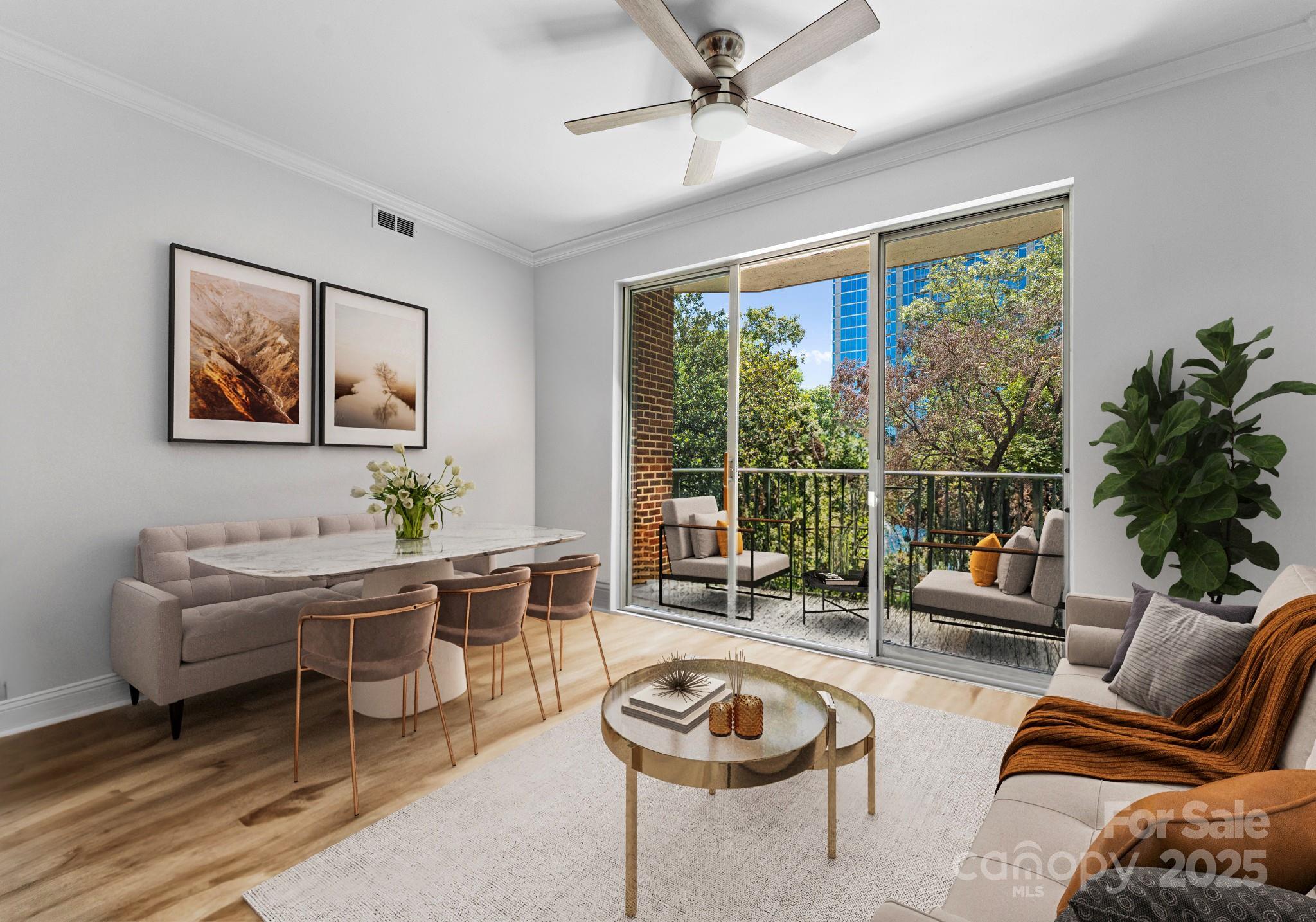 Downsizing? Right-sizing? 1st time homebuyer? Remote worker or work in Uptown? This 2 bed 2 bath updated split layout home at sought after 5th and Poplar, has been virtually staged for today's lifestyle. Though compact in size at 1029 square feet, the open concept kitchen/ living /dining area can accommodate a number of guests. The second bedroom has been staged as TV room/office. This light filled airy living space extends through sliding glass doors to the balcony that is perched above historic tree canopied Settler's Park. The perfect spot to enjoy your morning coffee, check your emails, or unwind at days end! The original bar height counter has been lowered and expanded. The tasteful quartz countertop island anchors kitchen/great room. New Samsung & LG appliances, quartz sink, ceiling fans & lighting. Walk in pantry/laundry with new stackable LG washer/dryer. Baths w new quartz countertops. Elegant neutral toned LVP throughout. Secure deeded parking. Meticulous homeowners replaced water tank & HVAC condenser 2023, window hardware, sliding door rollers & hardware. New roof 2023, hall carpet & paint 2022. No planned assessments. LIVE THE TURN KEY RESORT LIFESTYLE AT 5TH & POPLAR: FULL TIME ON SITE CONCIERGE & AWARD WINNING ON SITE HOA management., pool w outdoor kitchen, professionally landscaped gated courtyard w putting green, fountain, dog park, state-of-art fitness center, cozy library w gas fireplace, fireside terrace w TV & grills, media room, cyber & coffee cafes& resident car wash. 2 full time supers & maintenance staff, HARRIS TEETER, NAIL SALON & DRY CLEANERS in the building.
