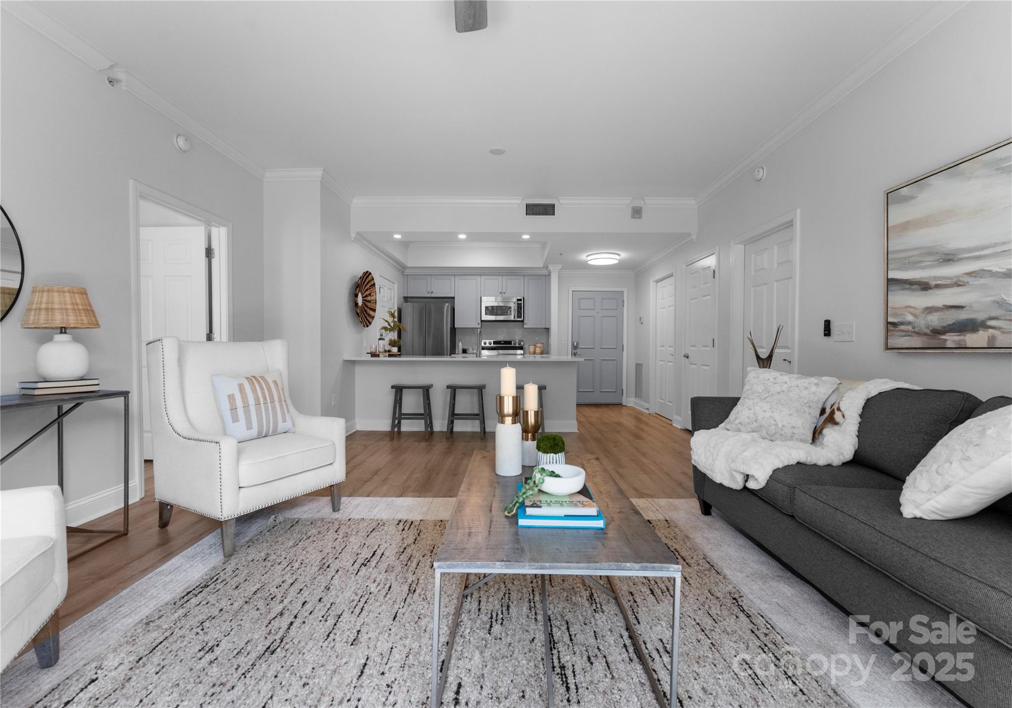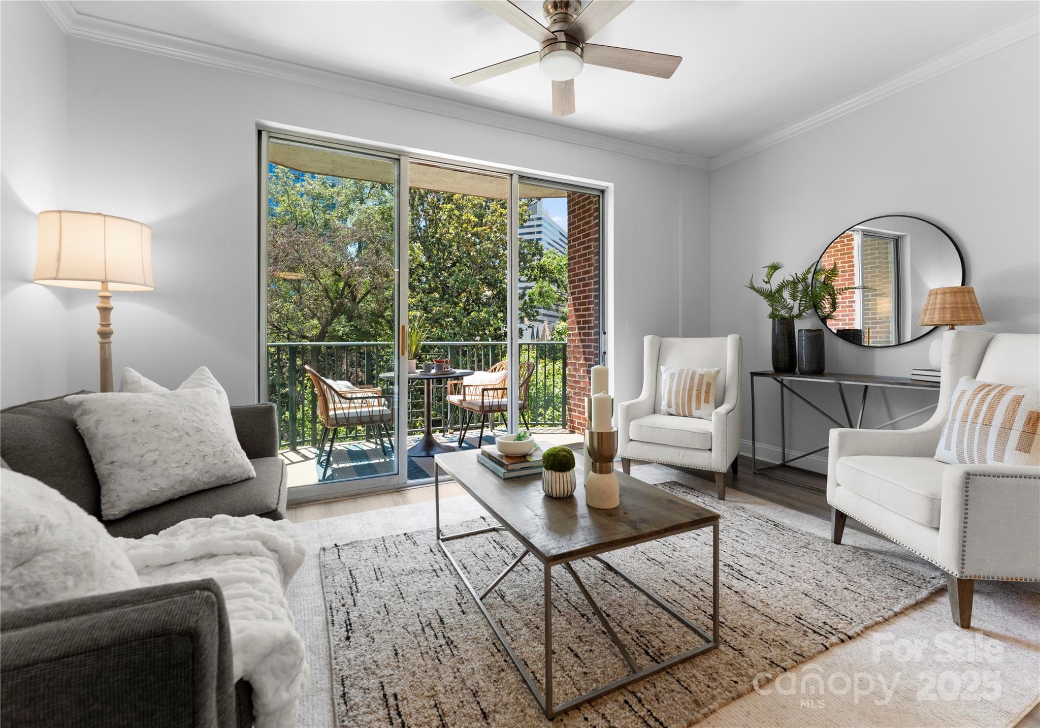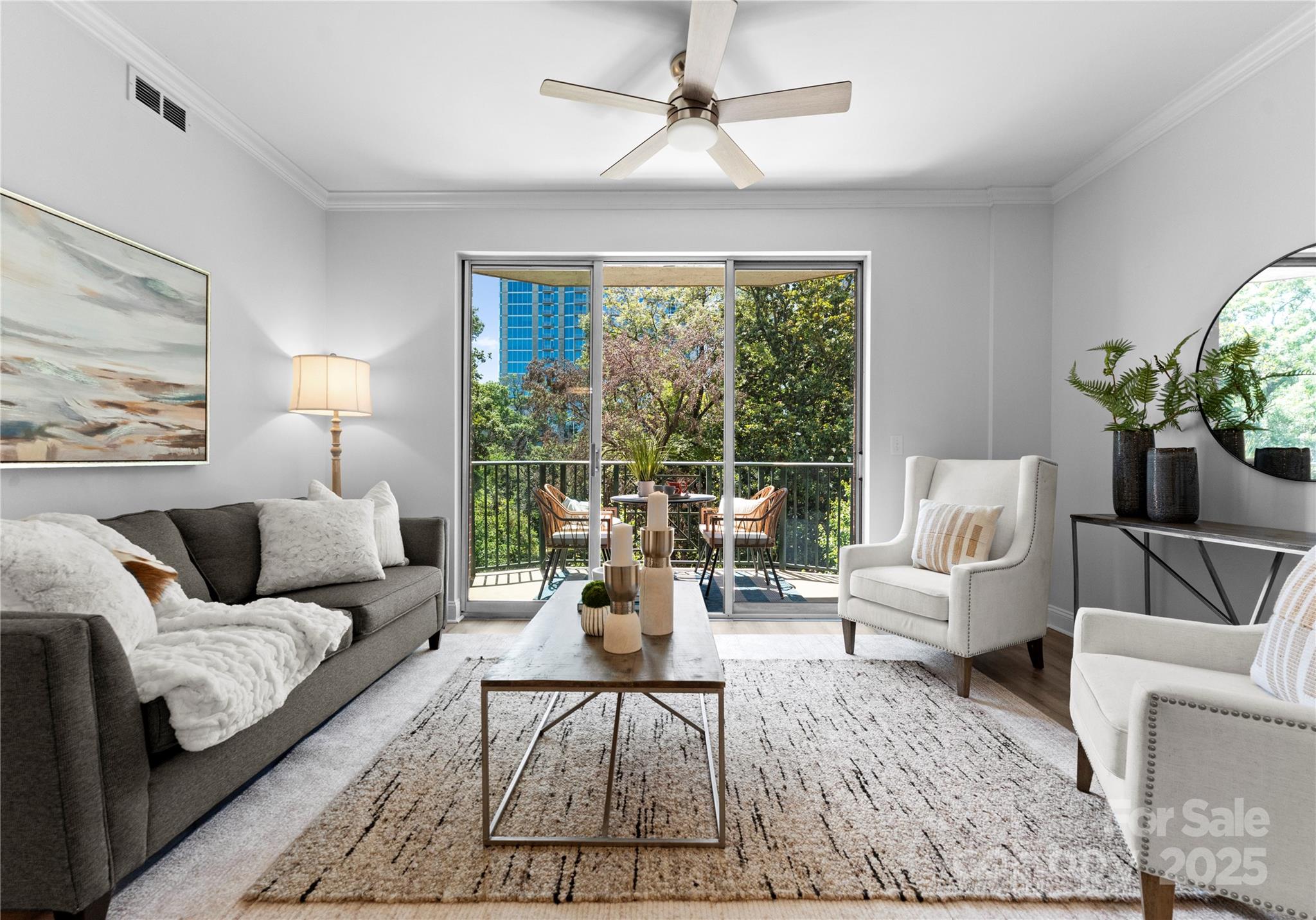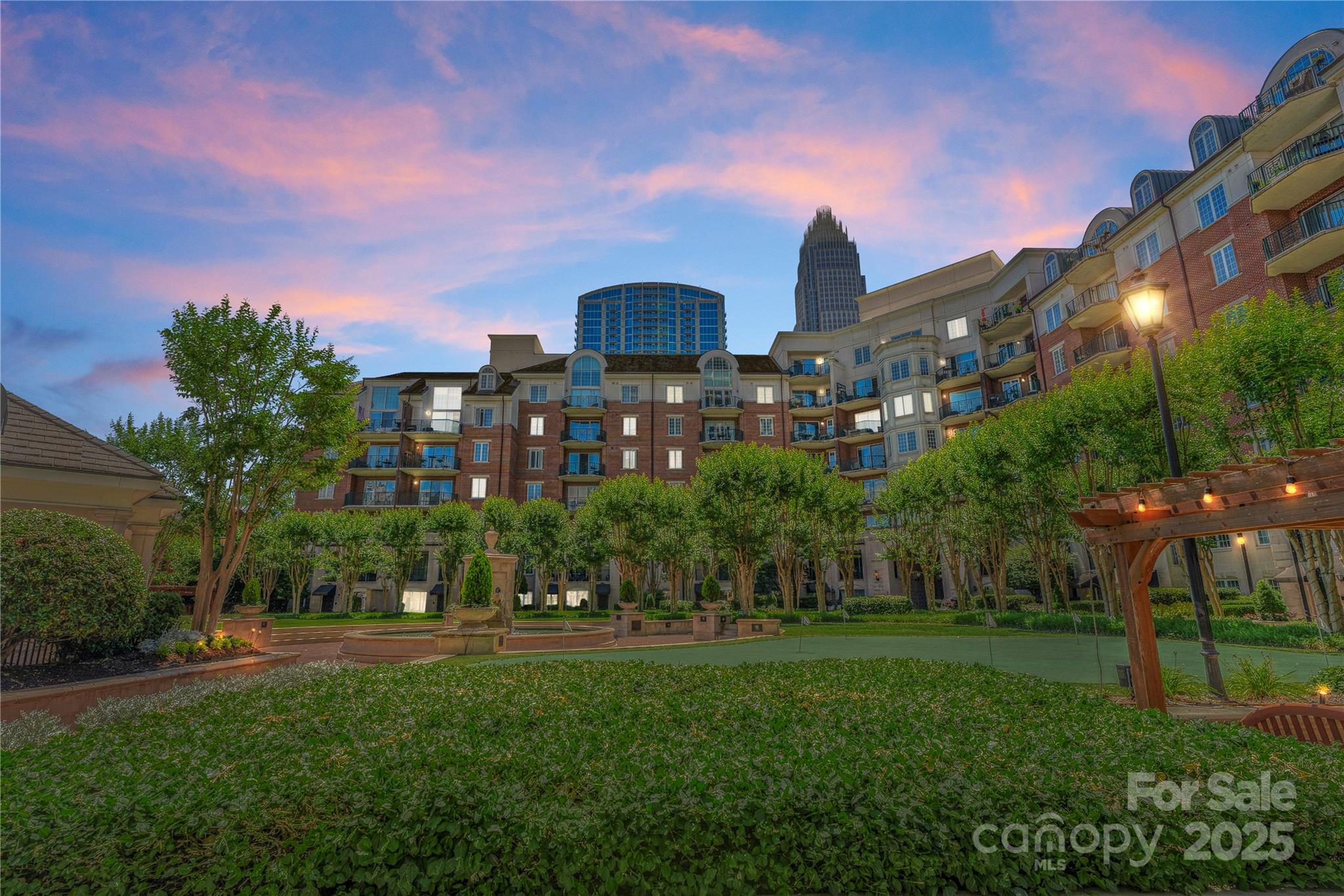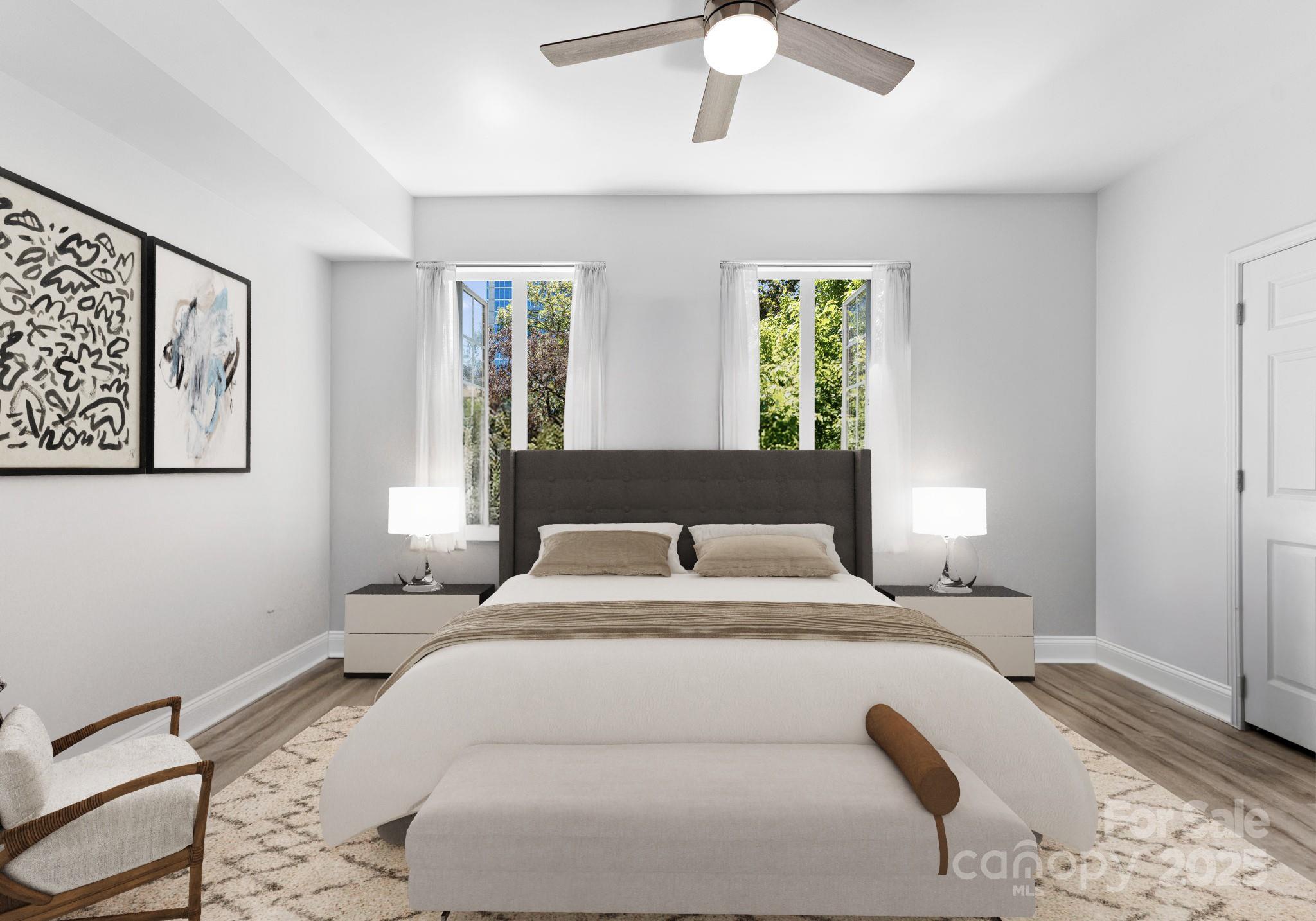 Downsizing? Right-sizing? 1st time homebuyer? Remote worker or work in Uptown? This 2 bed 2 bath updated split layout home at sought after 5th and Poplar, has been virtually staged for today's lifestyle. Though compact in size at 1029 square feet, the open concept kitchen/ living /dining area can accommodate a number of guests. The second bedroom has been staged as TV room/office. This light filled airy living space extends through sliding glass doors to the balcony that is perched above historic tree canopied Settler's Park. The perfect spot to enjoy your morning coffee, check your emails, or unwind at days end! The original bar height counter has been lowered and expanded. The tasteful quartz countertop island anchors kitchen/great room. New Samsung & LG appliances, quartz sink, ceiling fans & lighting. Walk in pantry/laundry with new stackable LG washer/dryer. Baths w new quartz countertops. Elegant neutral toned LVP throughout. Secure deeded parking. Meticulous homeowners replaced water tank & HVAC condenser 2023, window hardware, sliding door rollers & hardware. New roof 2023, hall carpet & paint 2022. No planned assessments. LIVE THE TURN KEY RESORT LIFESTYLE AT 5TH & POPLAR: FULL TIME ON SITE CONCIERGE & AWARD WINNING ON SITE HOA management., pool w outdoor kitchen, professionally landscaped gated courtyard w putting green, fountain, dog park, state-of-art fitness center, cozy library w gas fireplace, fireside terrace w TV & grills, media room, cyber & coffee cafes& resident car wash. 2 full time supers & maintenance staff, HARRIS TEETER, NAIL SALON & DRY CLEANERS in the building.