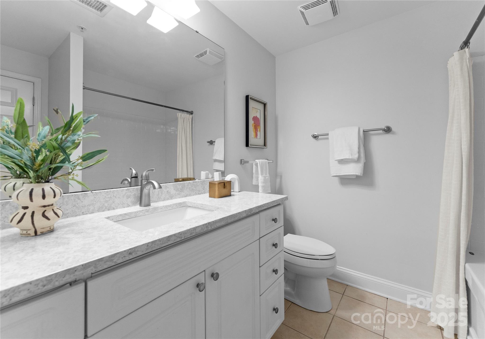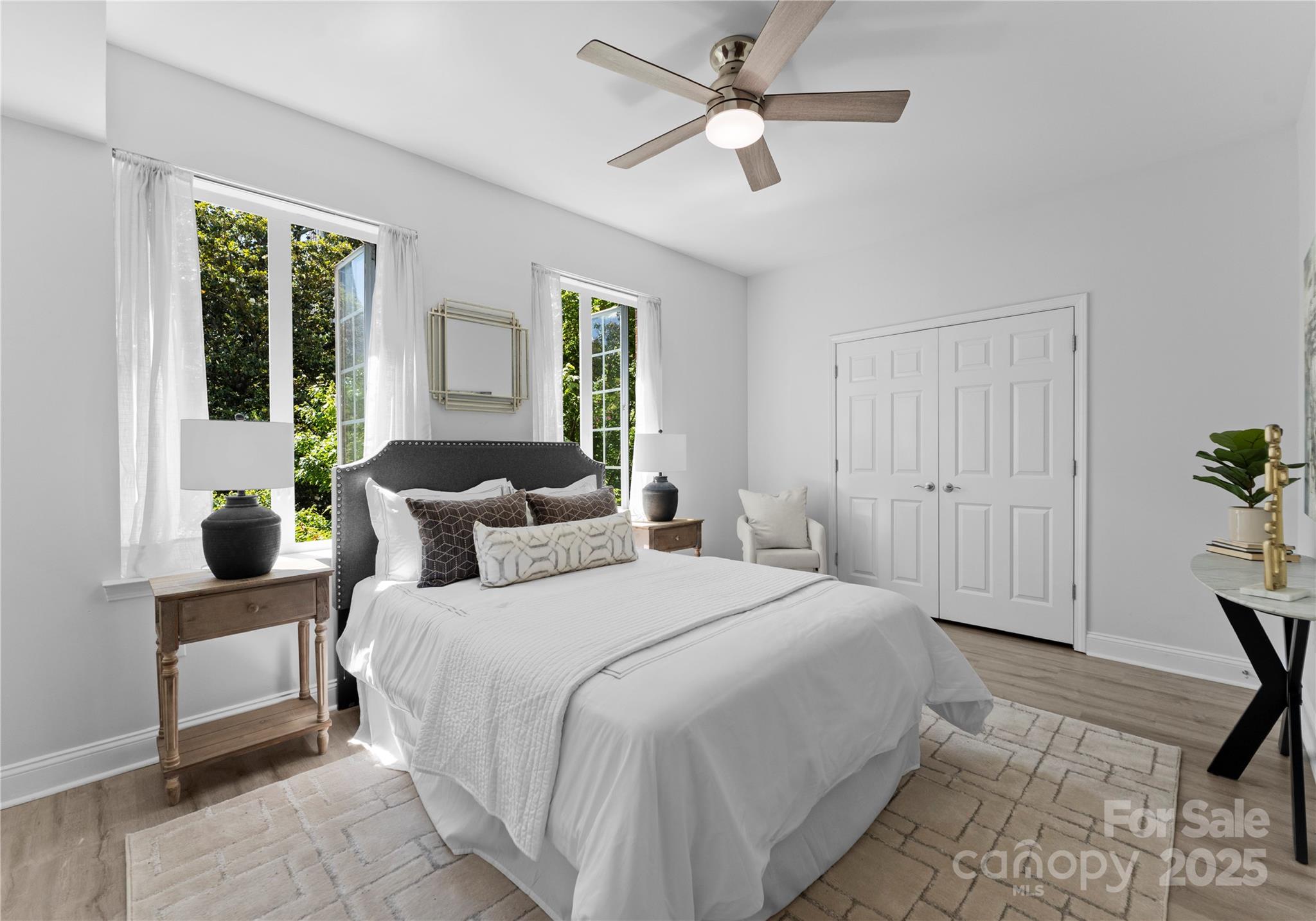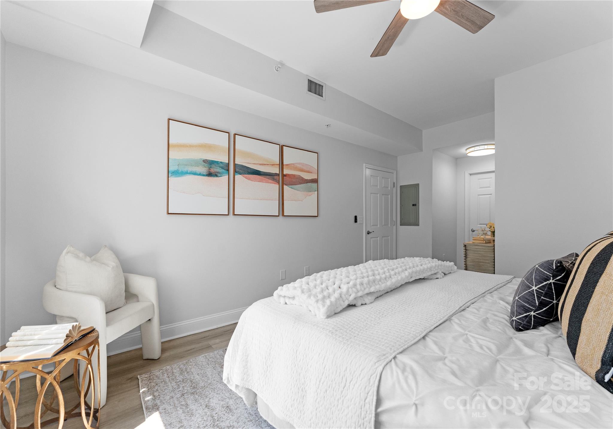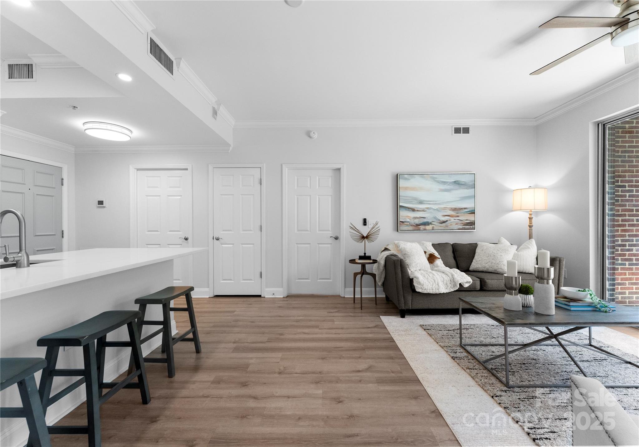 Downsizing? Right-sizing? 1st time homebuyer? Remote worker or work in Uptown? This 2 bed 2 bath updated split layout home at sought after 5th and Poplar, has been virtually staged for today's lifestyle. Though compact in size at 1029 square feet, the open concept kitchen/ living /dining area can accommodate a number of guests. The second bedroom has been staged as TV room/office. This light filled airy living space extends through sliding glass doors to the balcony that is perched above historic tree canopied Settler's Park. The perfect spot to enjoy your morning coffee, check your emails, or unwind at days end! The original bar height counter has been lowered and expanded. The tasteful quartz countertop island anchors kitchen/great room. New Samsung & LG appliances, quartz sink, ceiling fans & lighting. Walk in pantry/laundry with new stackable LG washer/dryer. Baths w new quartz countertops. Elegant neutral toned LVP throughout. Secure deeded parking. Meticulous homeowners replaced water tank & HVAC condenser 2023, window hardware, sliding door rollers & hardware. New roof 2023, hall carpet & paint 2022. No planned assessments. LIVE THE TURN KEY RESORT LIFESTYLE AT 5TH & POPLAR: FULL TIME ON SITE CONCIERGE & AWARD WINNING ON SITE HOA management., pool w outdoor kitchen, professionally landscaped gated courtyard w putting green, fountain, dog park, state-of-art fitness center, cozy library w gas fireplace, fireside terrace w TV & grills, media room, cyber & coffee cafes& resident car wash. 2 full time supers & maintenance staff, HARRIS TEETER, NAIL SALON & DRY CLEANERS in the building.