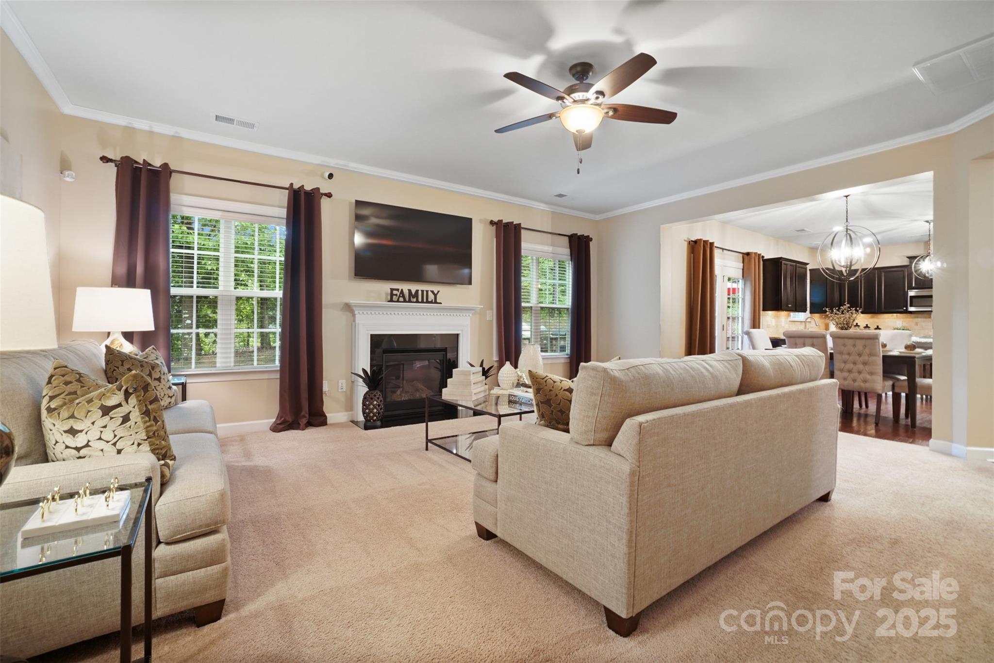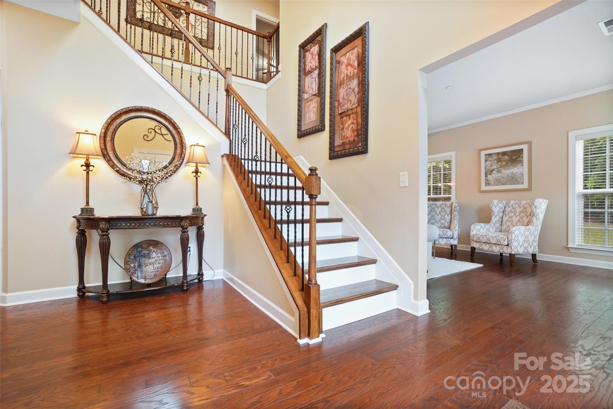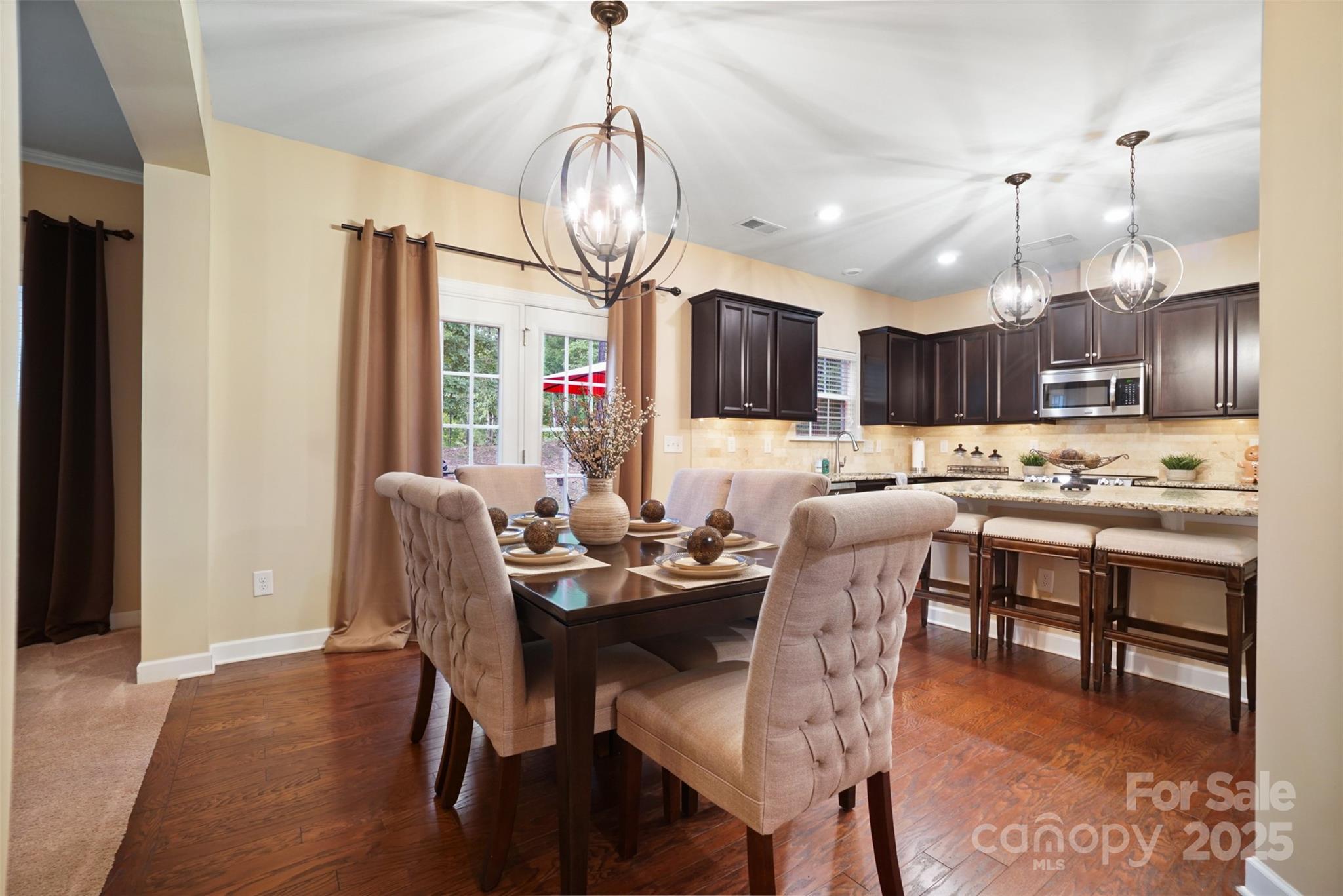 This BEAUTIFUL home offers 4 bedrooms, 3.5 baths and over 3,800 sq. ft of living space. Enjoy all the formals—living room, dining room, and family room—designed for gathering, relaxing, and making memories. The main level showcases a lovely 2 story foyer, gleaming hardwood floors with dual staircases. Front staircase upgraded to hardwood stairs. Spacious kitchen with an oversized island, serving as the centerpiece of the room, generous counter space, and plenty of cabinets with under cabinet lighting. Upgraded lighting package in the kitchen, dining room, foyer and upstairs bathrooms. All bedrooms have ceiling fans. Upstairs features 4 bedrooms and a large bonus room that can be used as a 5th bedroom. Large primary bedroom includes a sitting area. The primary bathroom offers separate vanities, an oversized upgraded frameless shower, garden tub and a large walk-in closet. Head out back and enjoy the outdoors on the extended 21x13 patio, complete with beautiful paver stones and a built in grill. The exterior uplighting shows the true beauty of the home at night. The community features include a swimming pool, pool house, walking trails and playground area.