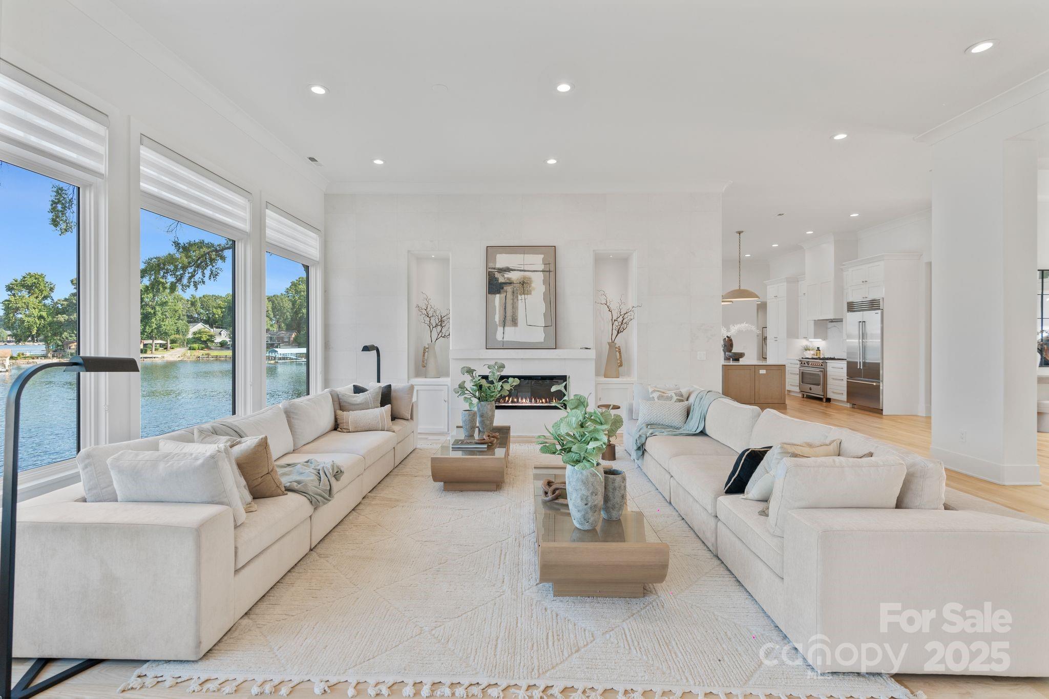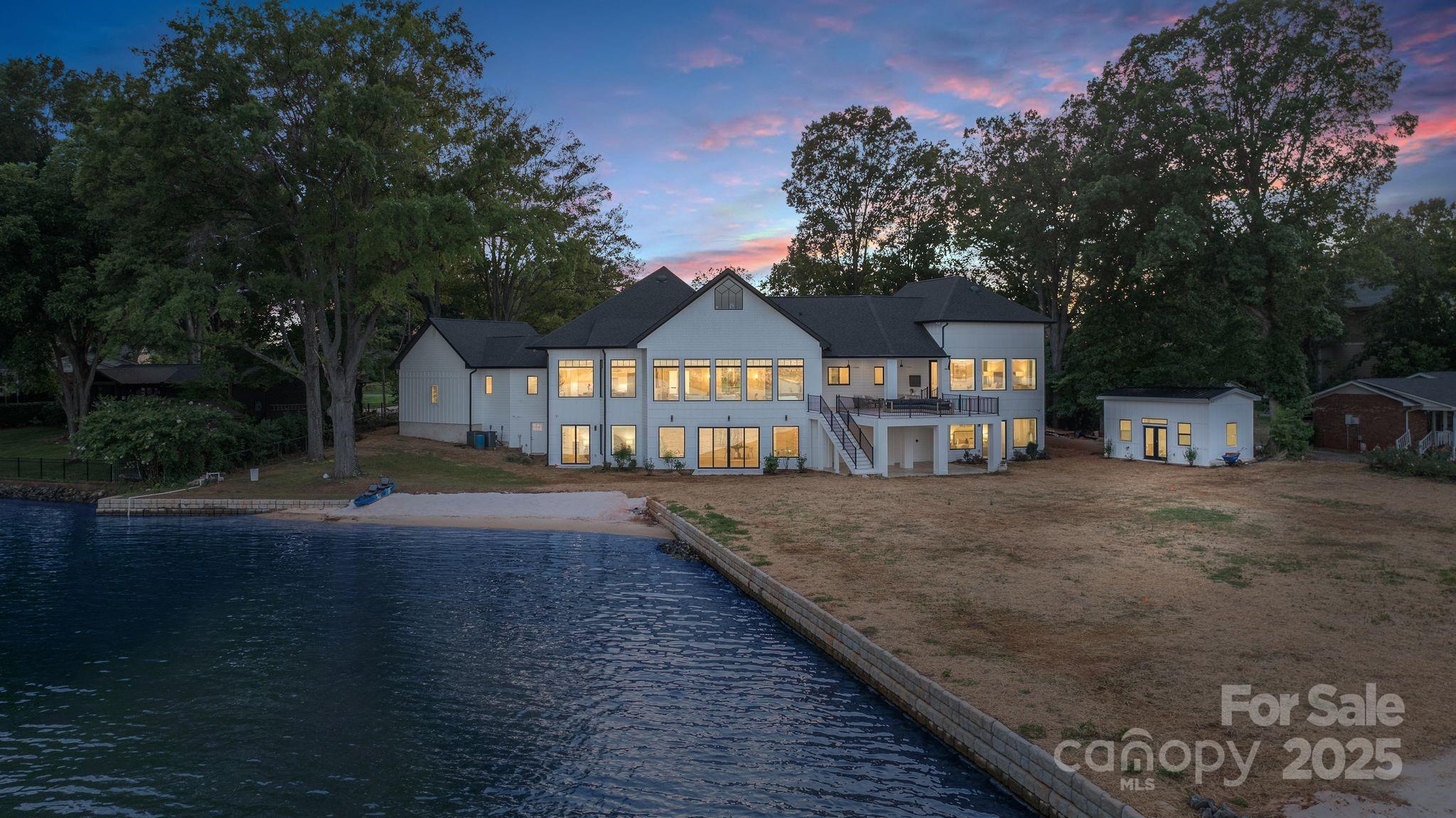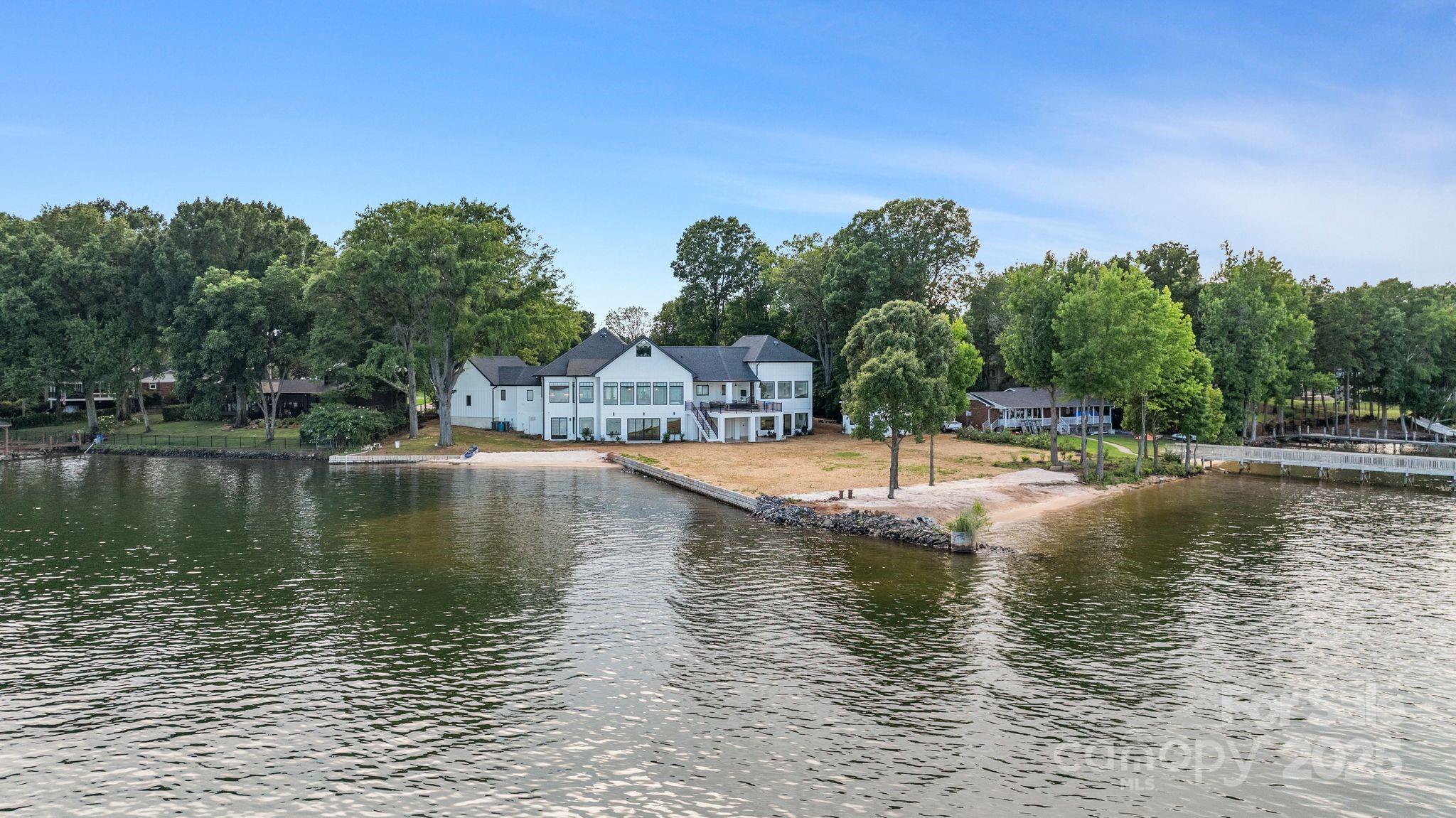 Brand new dock to be built and included. New designer landscaping to offer a private oasis in progress. Set on over 300 feet of pristine shoreline, this breathtaking Hamptons-inspired estate captures panoramic lake views from nearly every room. Completely rebuilt from the footings up in 2022 to maintain setbacks—and refreshed in 2025 with all-new designer finishes—this estate features soaring ceilings, living spaces flooded with light, and two stunning kitchens: a statement-making show kitchen and a fully equipped scullery, ideal for effortless entertaining. Enjoy spa-inspired baths, expansive gathering areas, and two 2-car garages with EV. The lower-level garage offers private downstairs access—perfect for multigenerational living. Outdoors, enjoy two natural sandy beaches, a brand new seawall, irrigation system, newly placed seed and straw, and a brand-new two-level dock soon to be completed. Plans/permits for an optional pool are in place, offering endless potential.