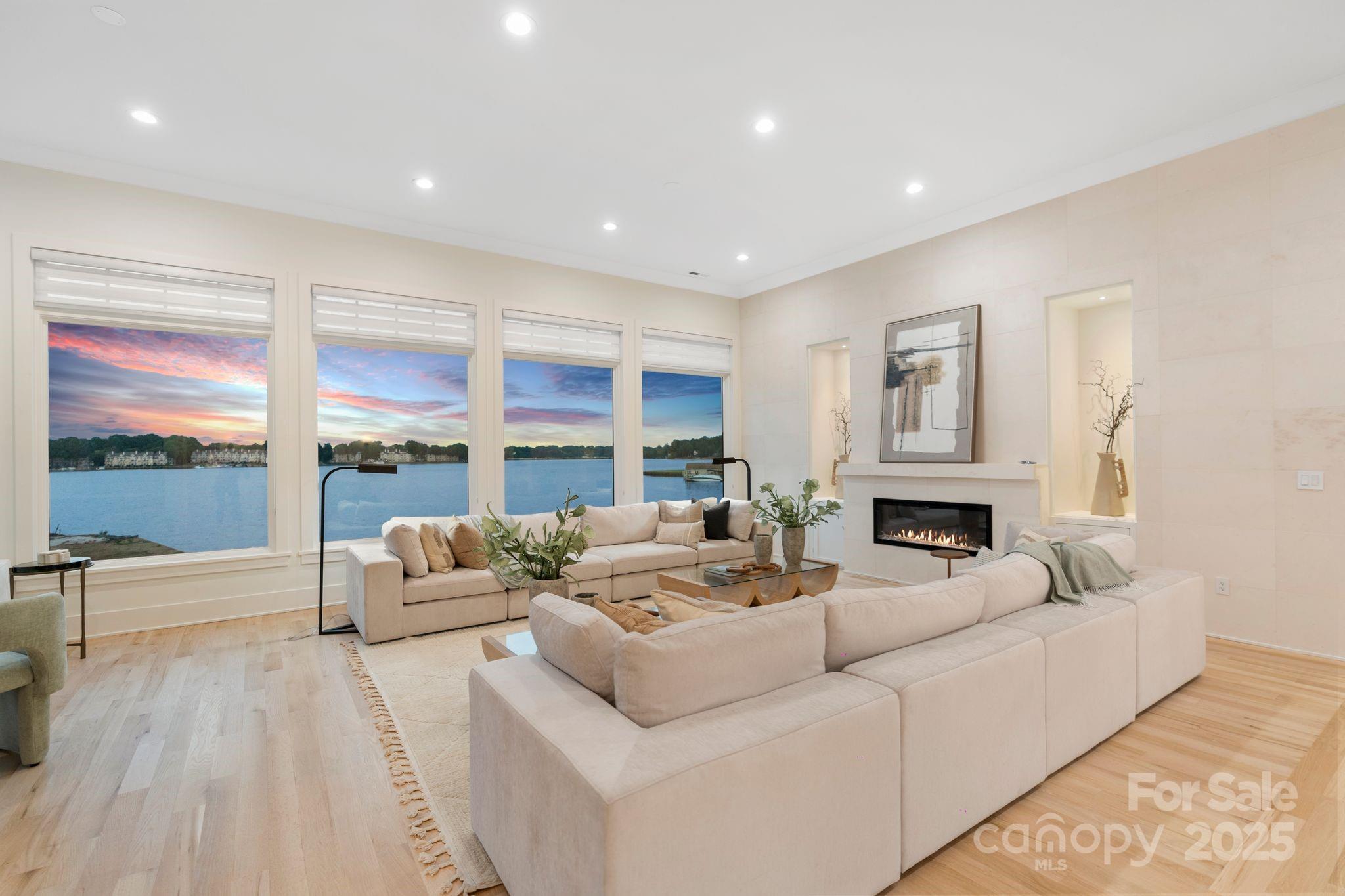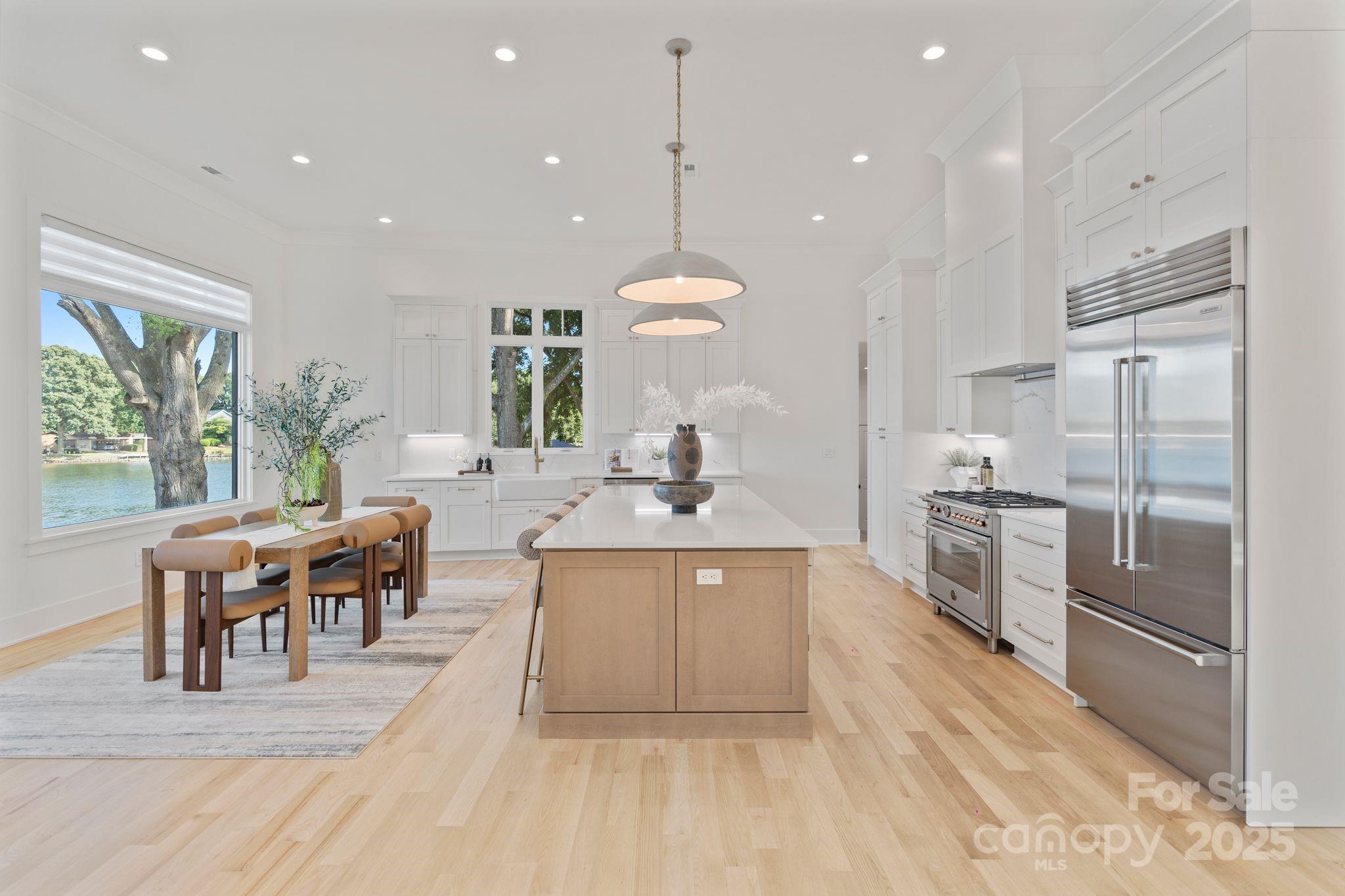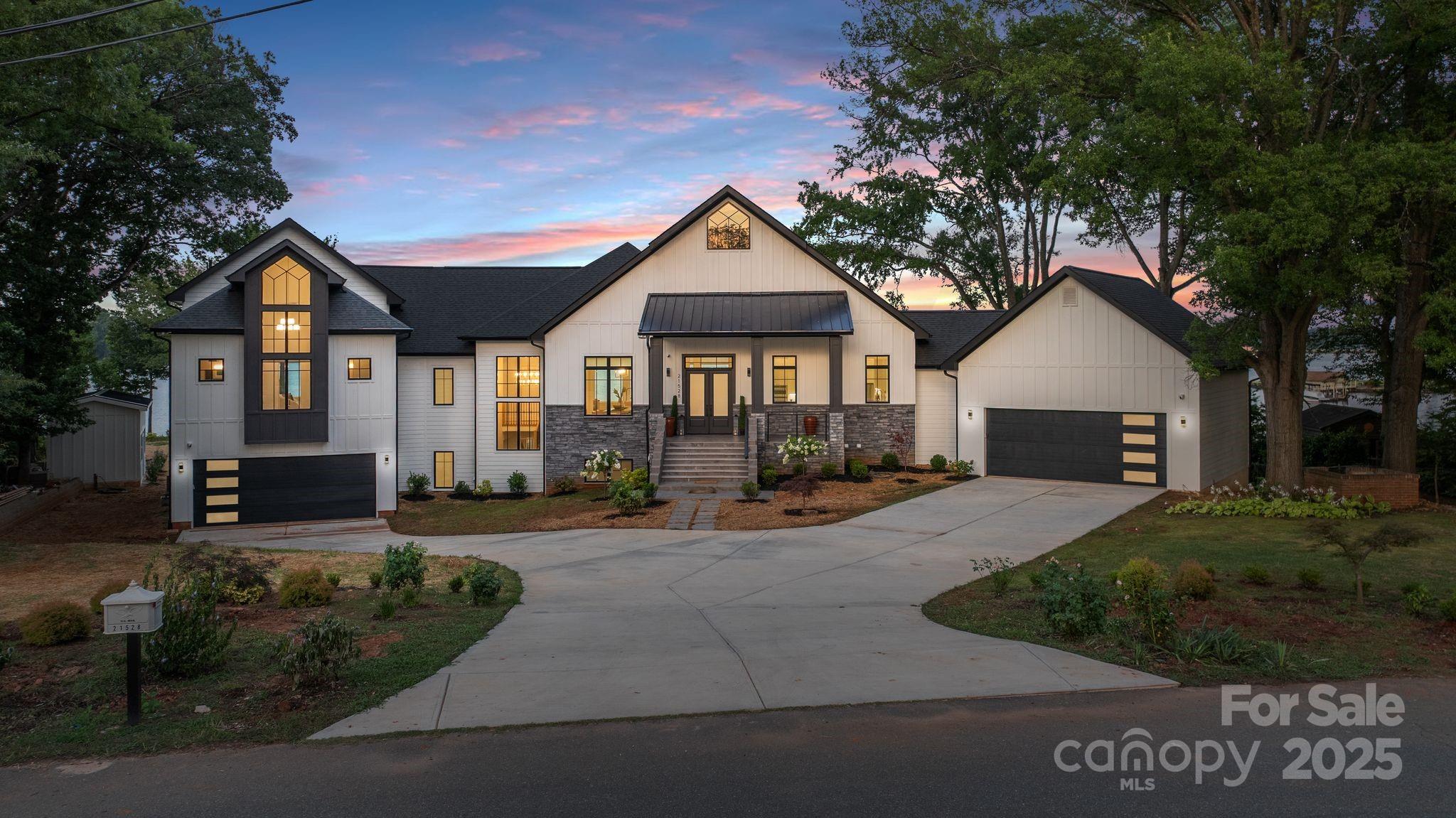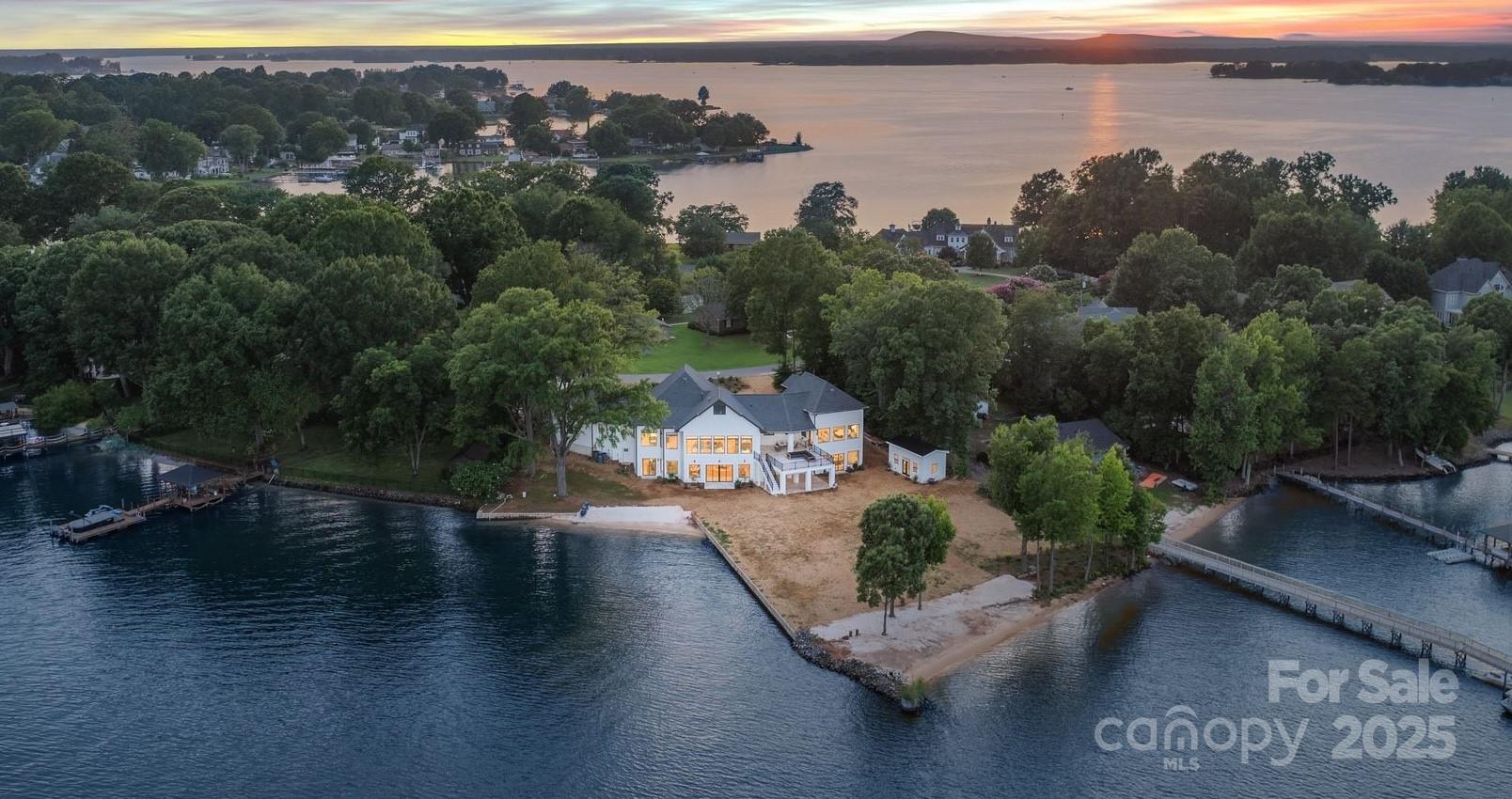 Brand new dock to be built and included. New designer landscaping to offer a private oasis in progress. Set on over 300 feet of pristine shoreline, this breathtaking Hamptons-inspired estate captures panoramic lake views from nearly every room. Completely rebuilt from the footings up in 2022 to maintain setbacks—and refreshed in 2025 with all-new designer finishes—this estate features soaring ceilings, living spaces flooded with light, and two stunning kitchens: a statement-making show kitchen and a fully equipped scullery, ideal for effortless entertaining. Enjoy spa-inspired baths, expansive gathering areas, and two 2-car garages with EV. The lower-level garage offers private downstairs access—perfect for multigenerational living. Outdoors, enjoy two natural sandy beaches, a brand new seawall, irrigation system, newly placed seed and straw, and a brand-new two-level dock soon to be completed. Plans/permits for an optional pool are in place, offering endless potential.
