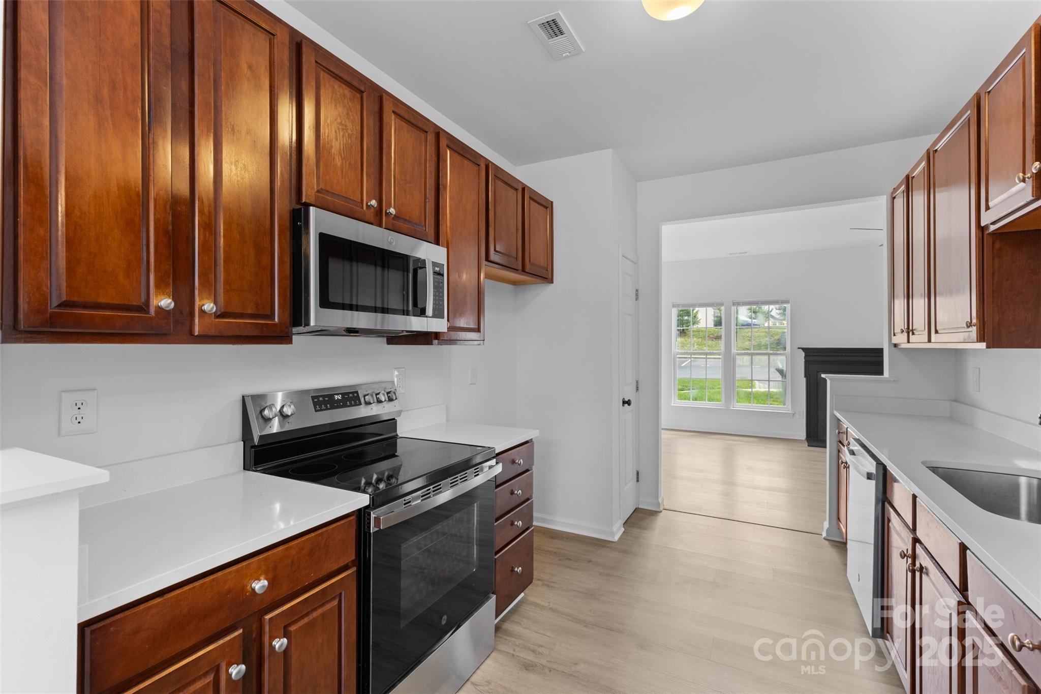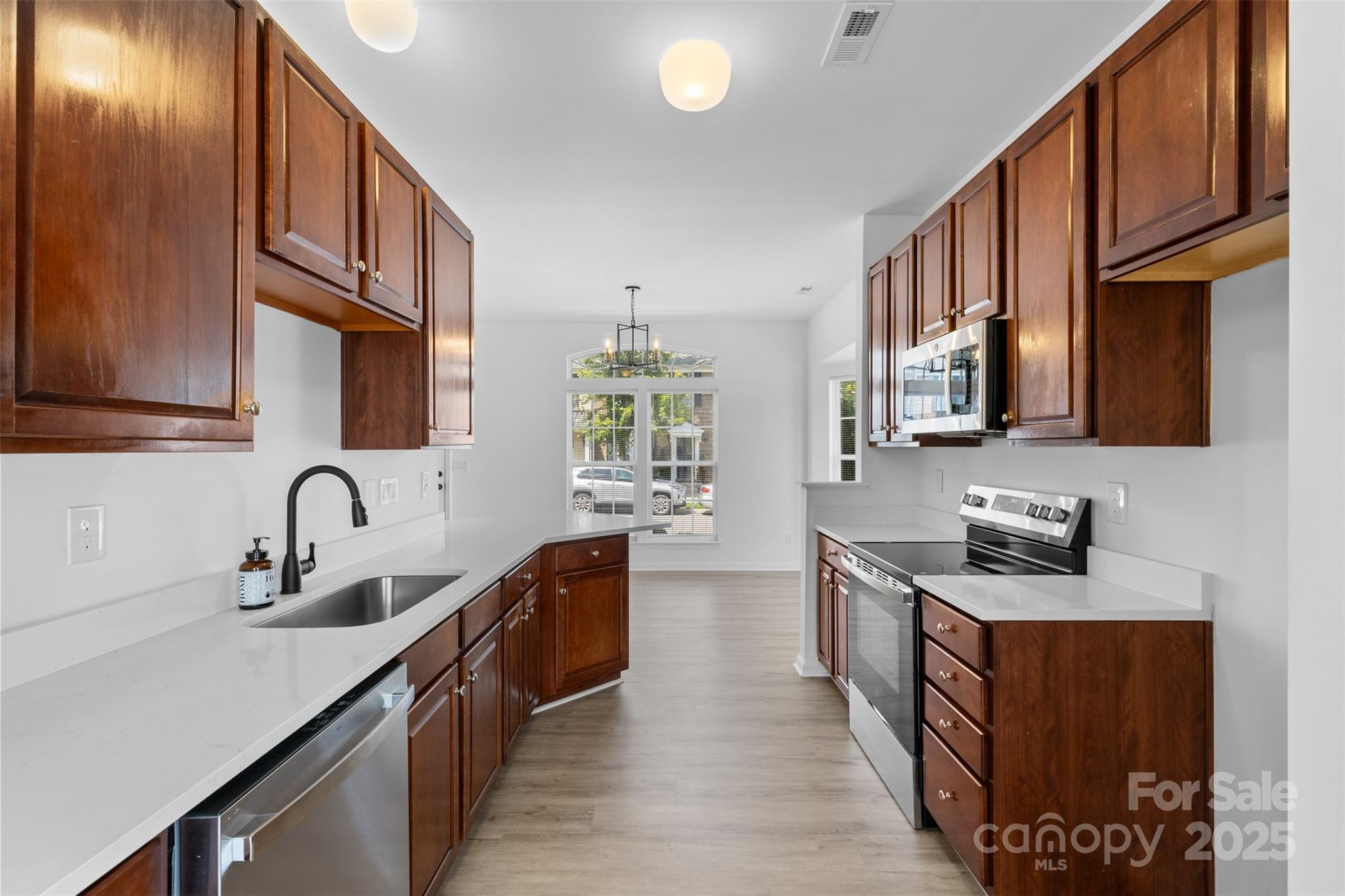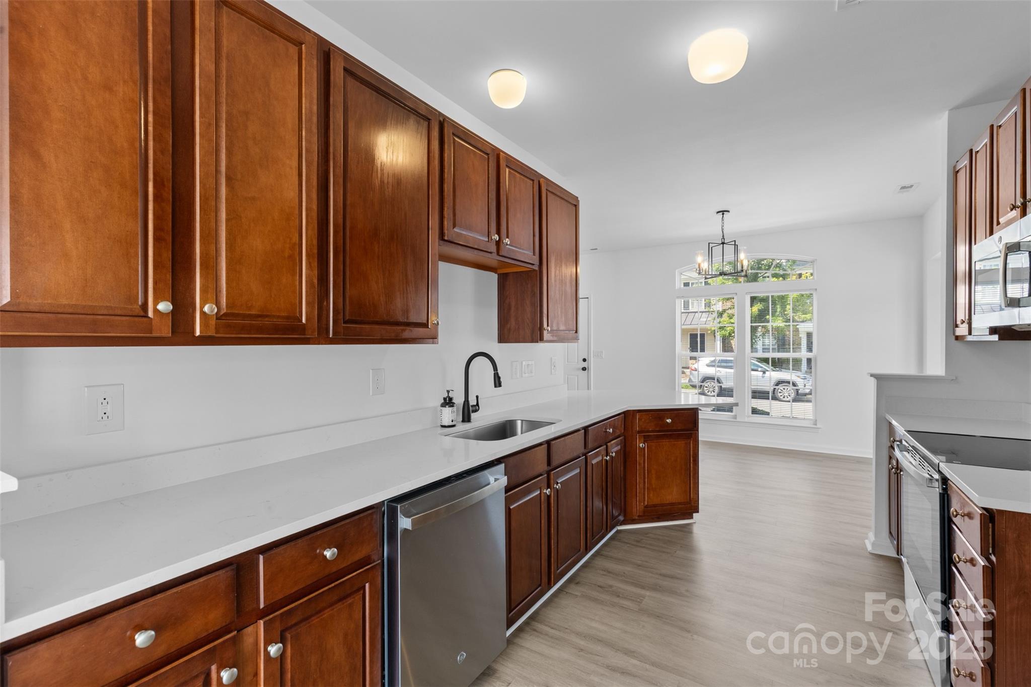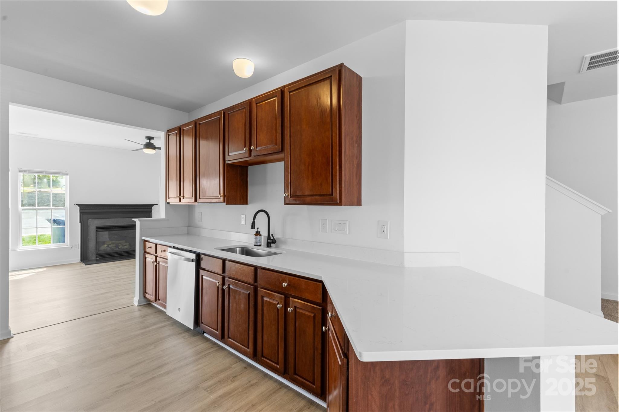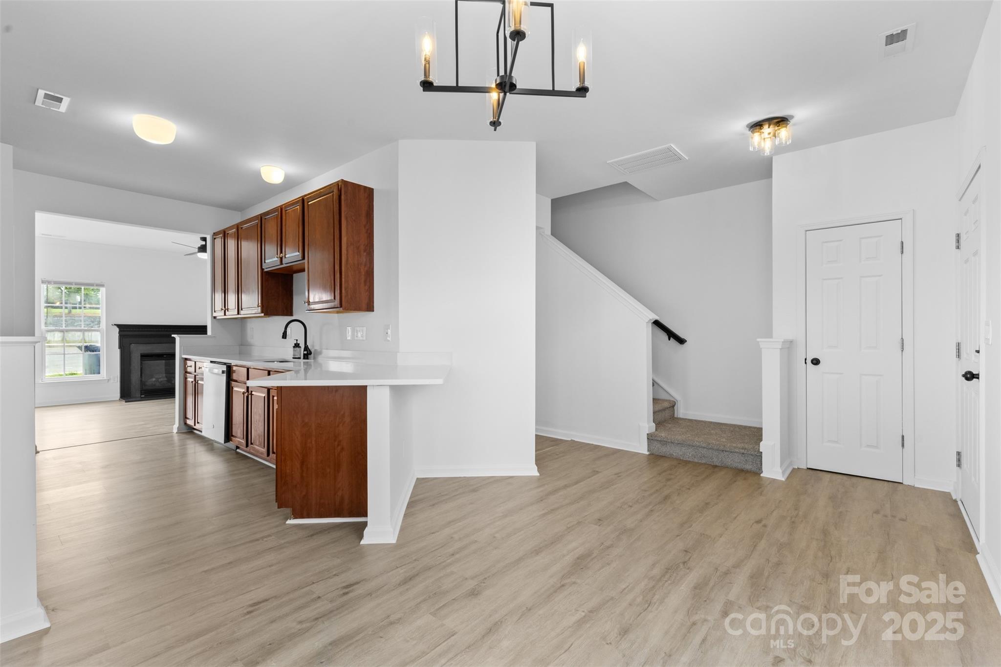 Step into this beautifully updated end-unit townhome, where modern elegance greets you at the door. Gleaming new flooring and stylish lighting set the tone, flowing into an open-concept kitchen featuring sleek quartz countertops and stainless steel appliances. The updated half bath boasts a new vanity and sink, adding a touch of sophistication. Relax in the spacious family room, warmed by a cozy gas fireplace. Upstairs, new plush carpeting leads to a stunning owner’s suite with a fully renovated primary bath, complete with a chic new vanity, cabinet, and flooring. Freshly painted throughout, with new lighting and updated door hardware, this home is move-in ready and easy to show. Schedule your visit today!