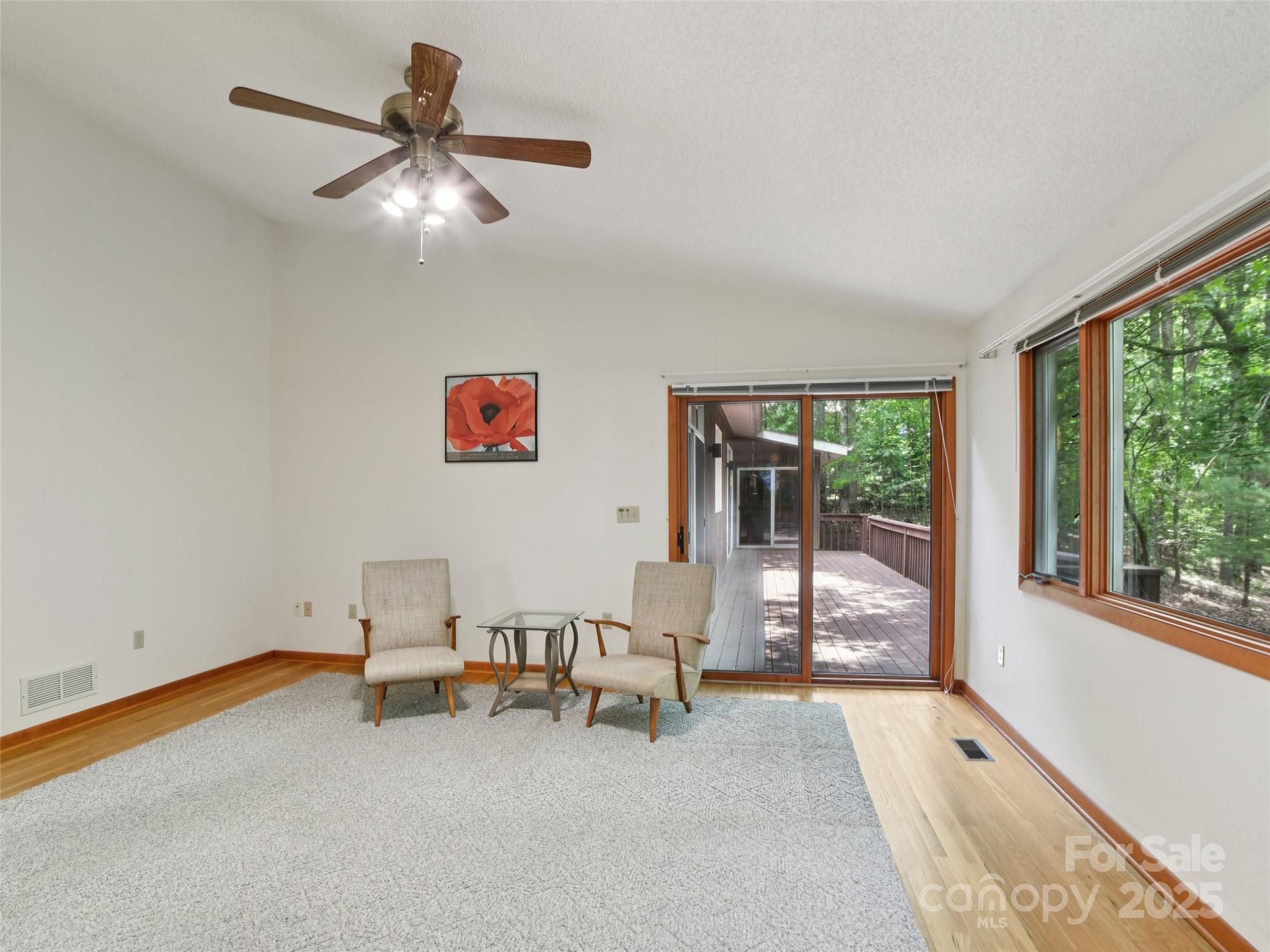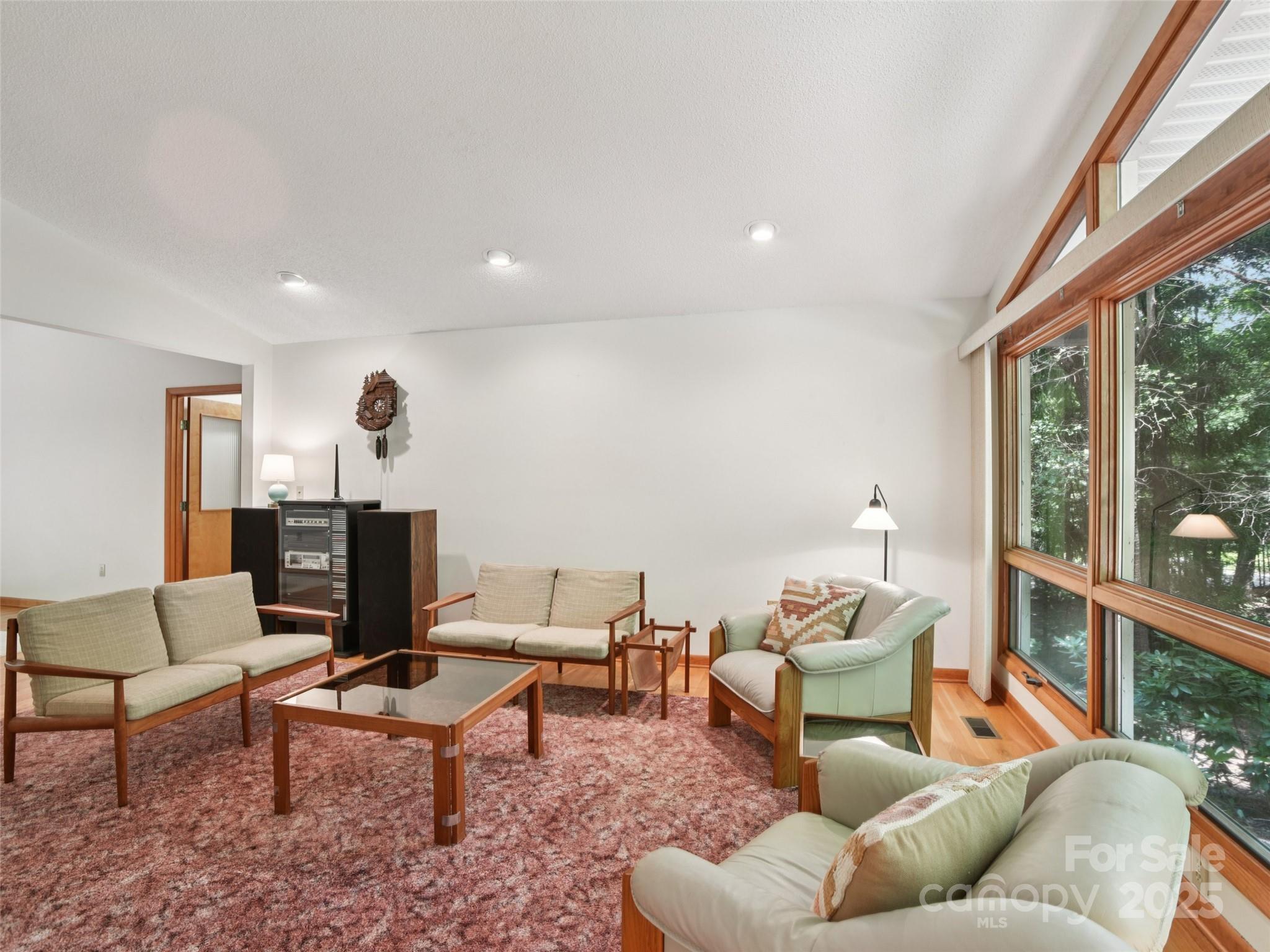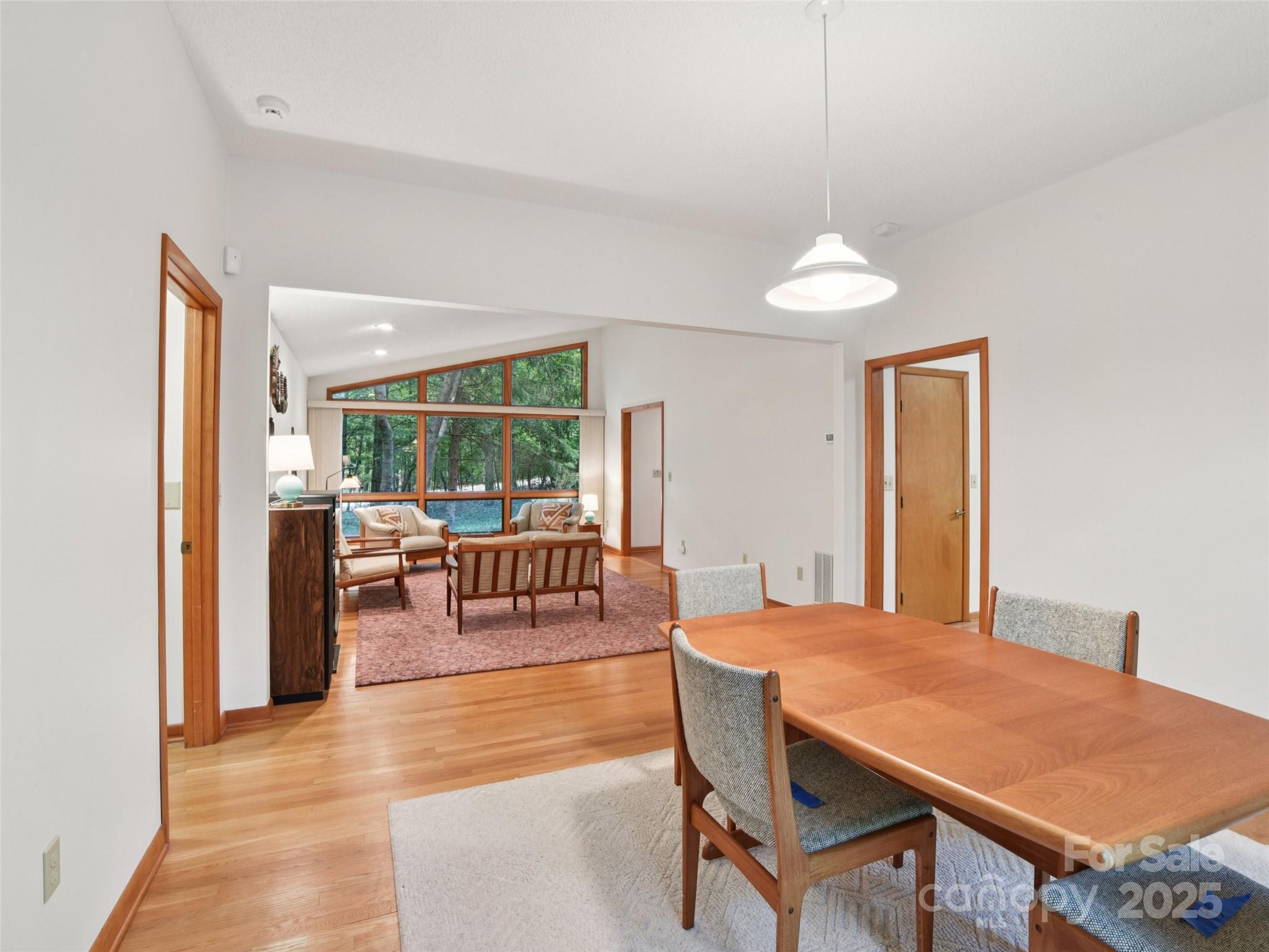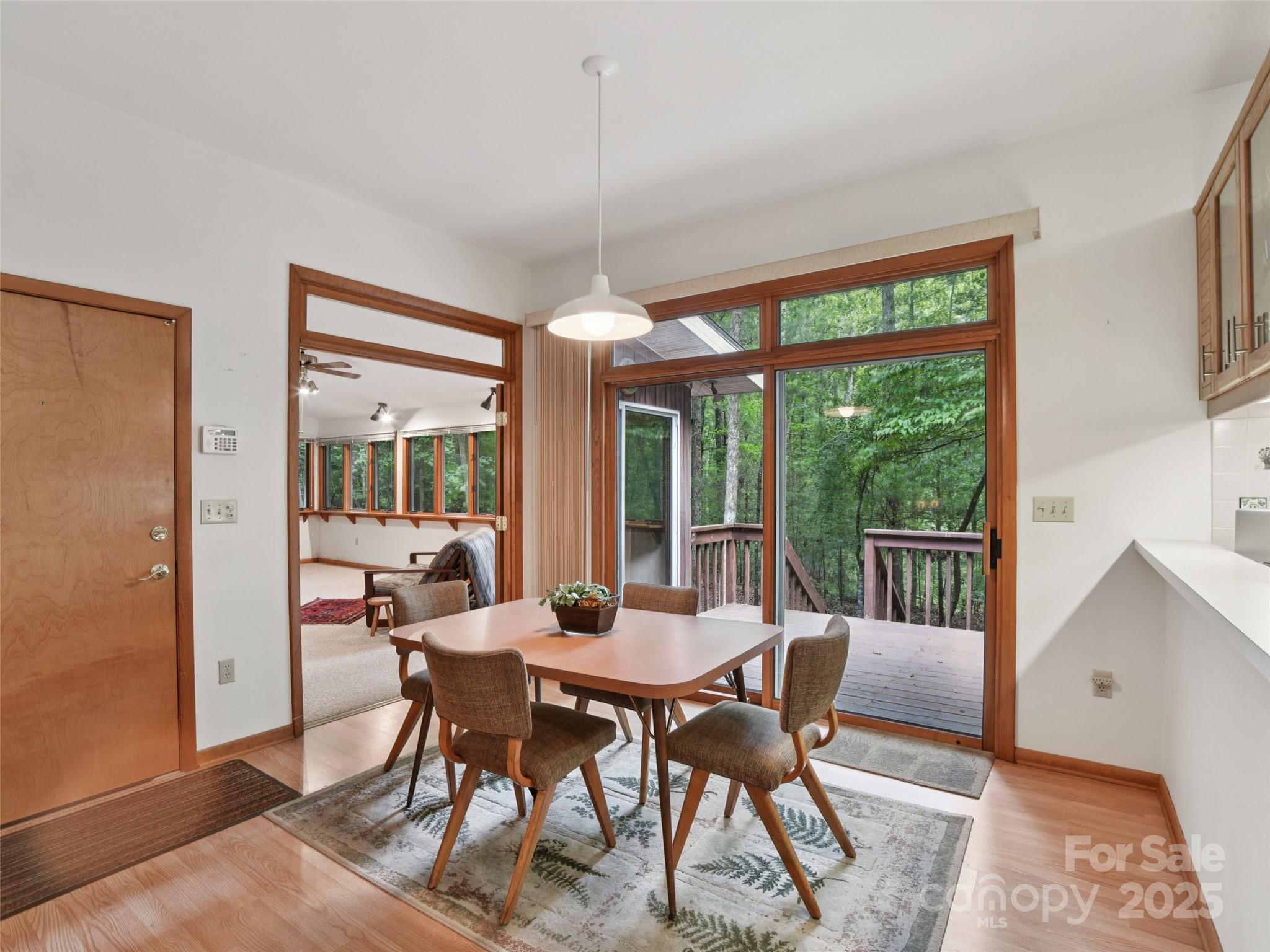 One level living at its finest in the heart of Historic Flat Rock! With a mid-century vibe, vaulted ceilings and numerous floor to ceiling windows, this home is nestled on a spacious, natural lot in the sought-after Claremont neighborhood. With 3 bedrooms, 2.5 baths, a wood-burning fireplace in the cozy family room and with hardwood floors in the main living areas and all the bedrooms, this home offers both character and comfort. Enjoy the expansive living and dining rooms, a large eat-in kitchen, and an absolutely fabulous, oversized sunroom that brings the outdoors in. Step outside to a generous deck perfect for relaxing or entertaining. A poured concrete basement is ready for storage, a work shop or finishing off for extra living space - already plumbed for an extra bath and a 4 bedroom septic system. A whole house generator ensures comfort and peace of mind. Enjoy low-maintenance living surrounded by natural beauty!