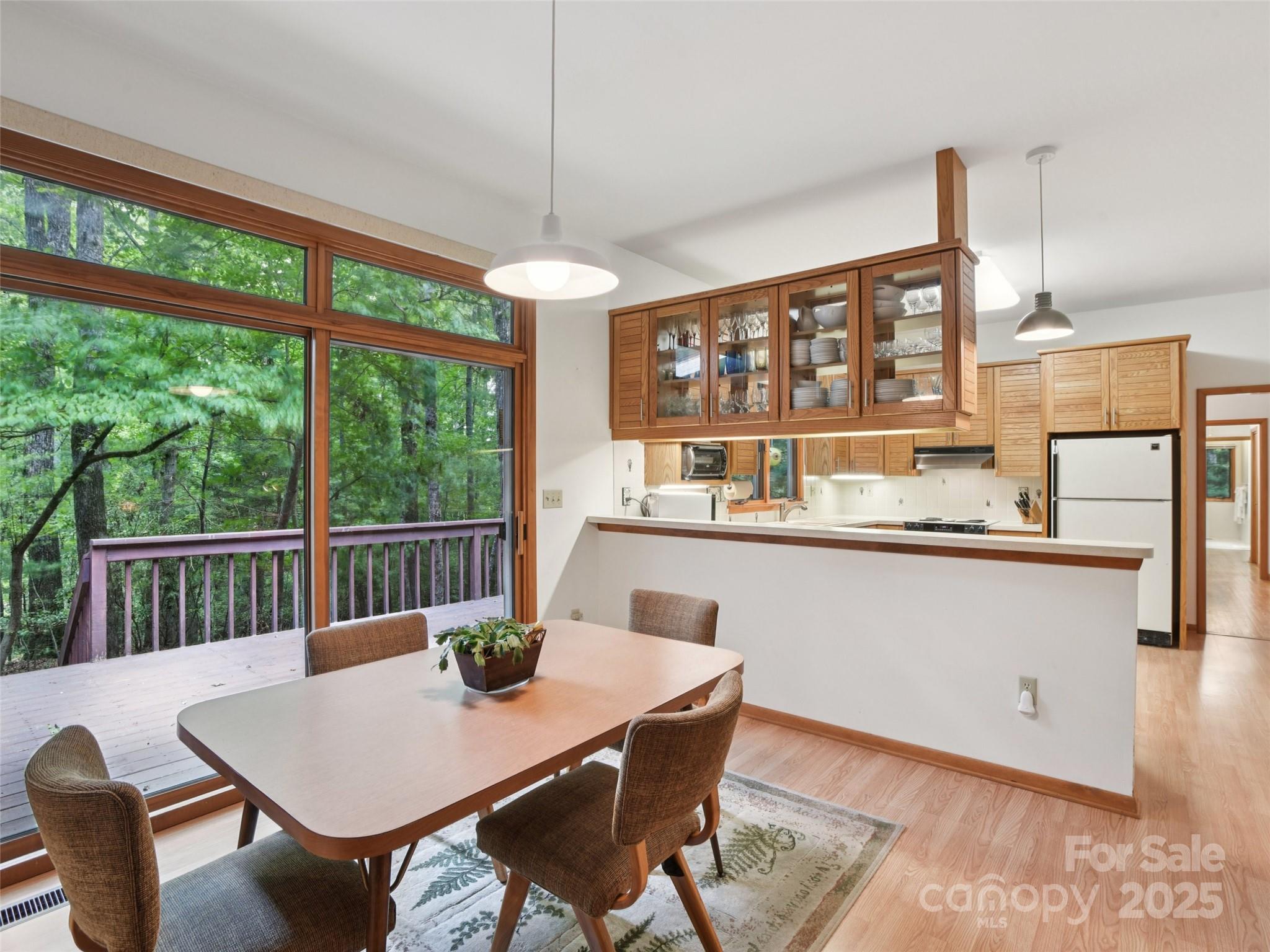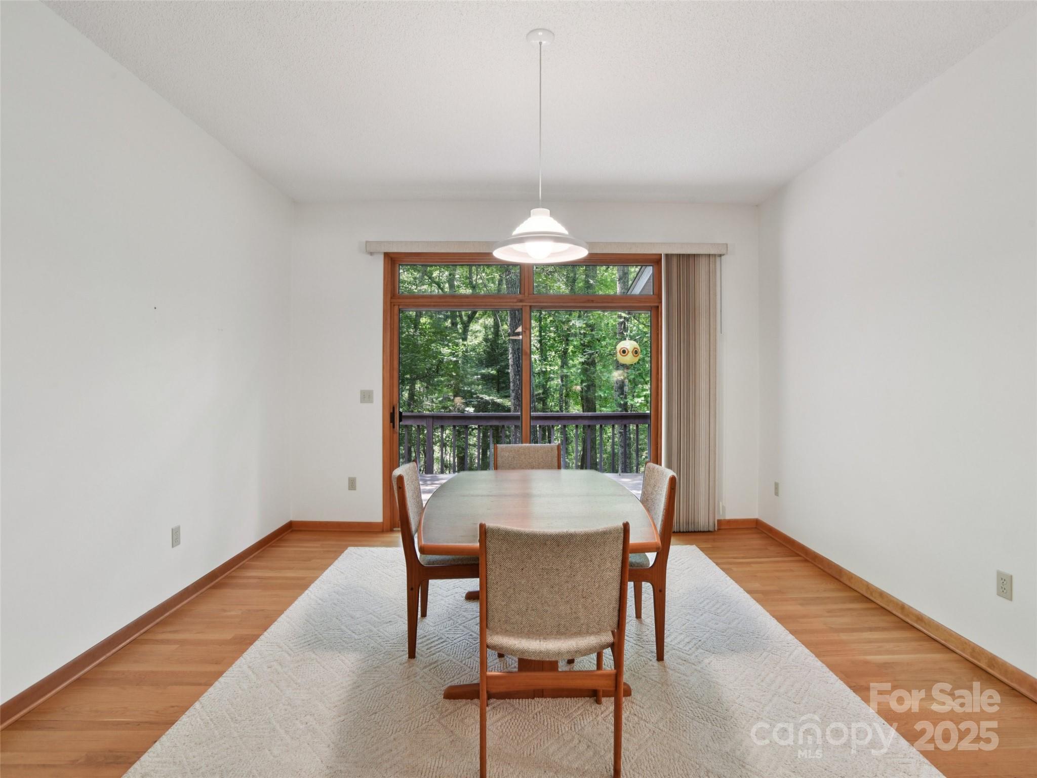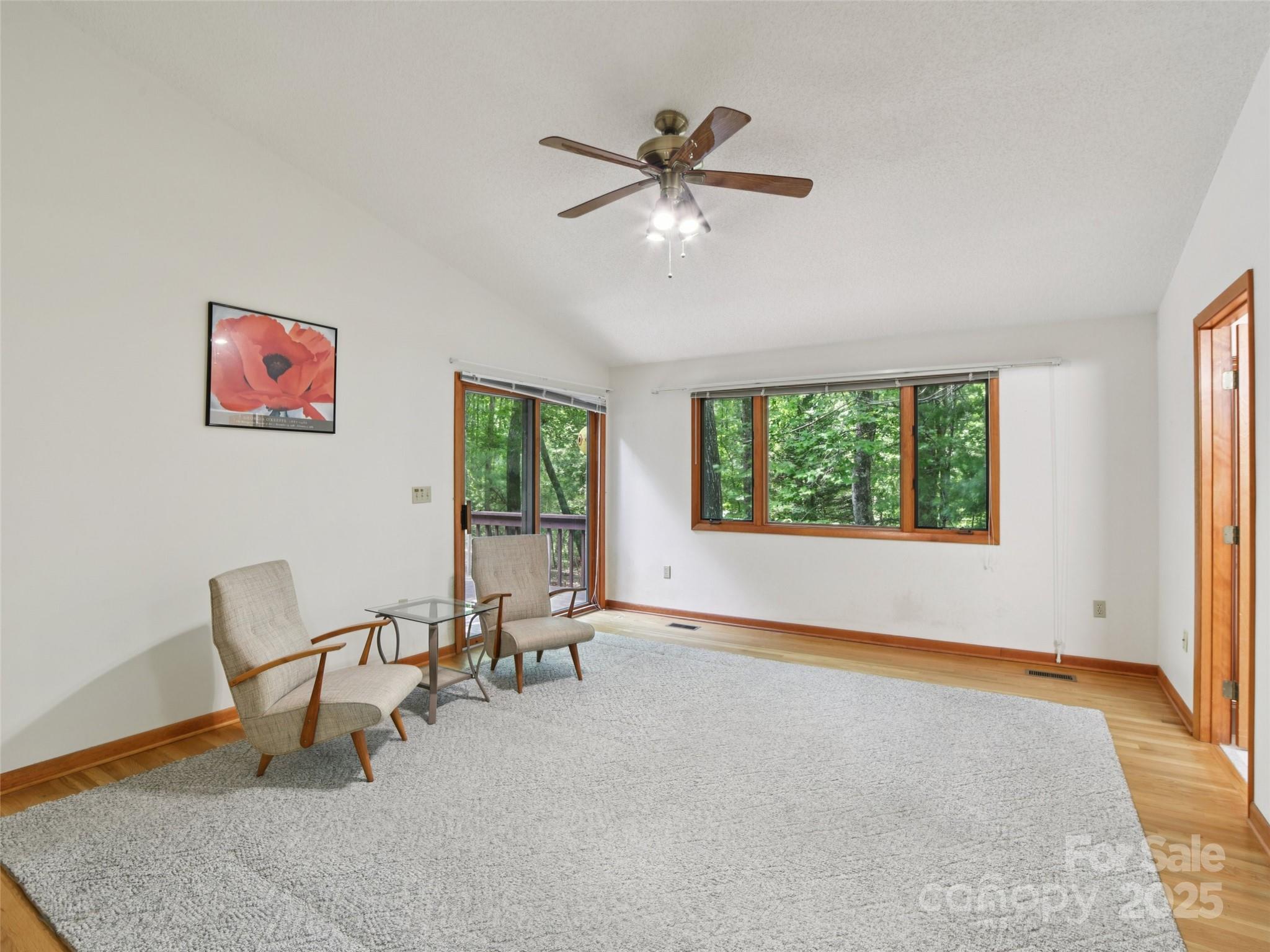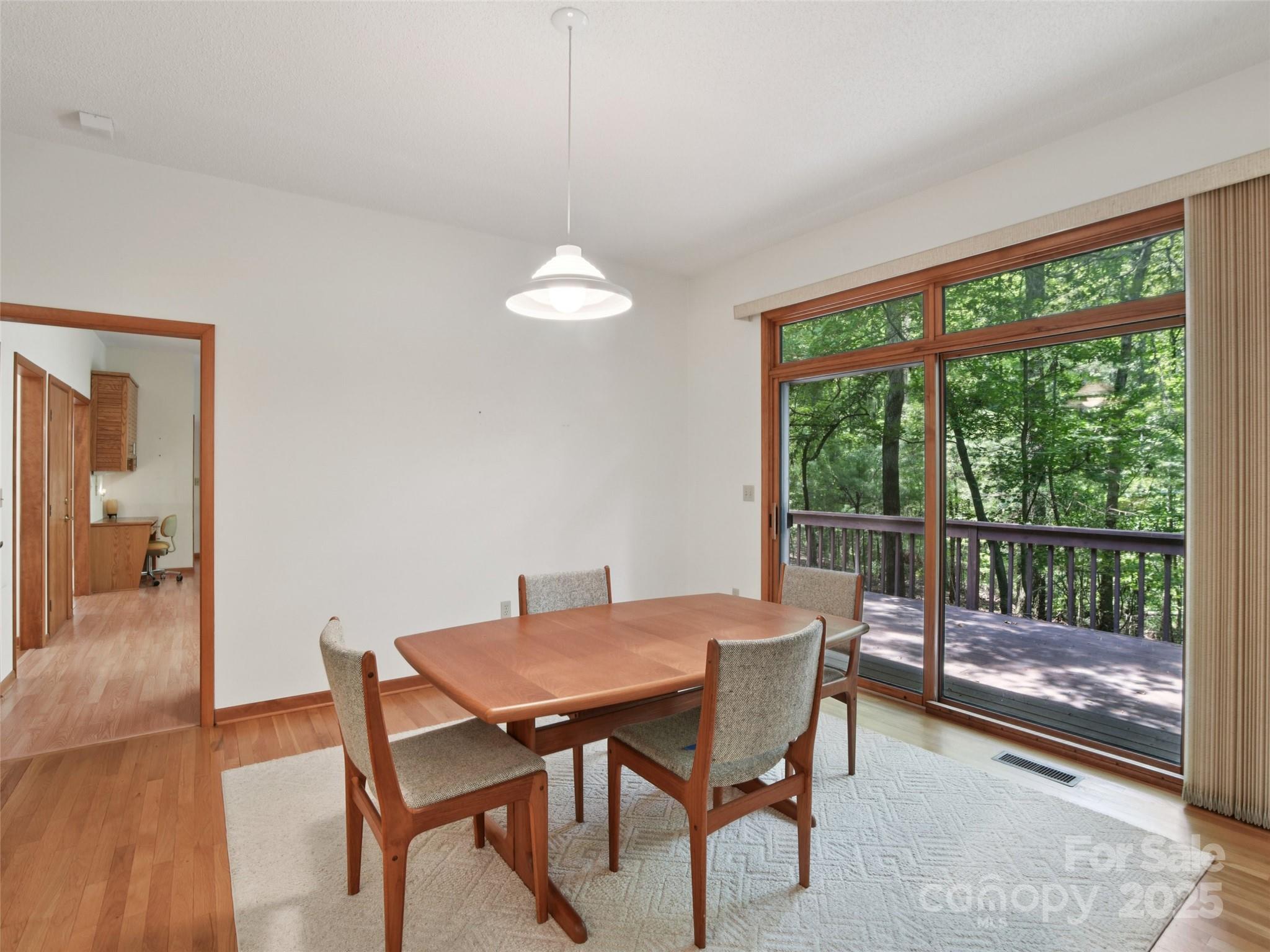 One level living at its finest in the heart of Historic Flat Rock! With a mid-century vibe, vaulted ceilings and numerous floor to ceiling windows, this home is nestled on a spacious, natural lot in the sought-after Claremont neighborhood. With 3 bedrooms, 2.5 baths, a wood-burning fireplace in the cozy family room and with hardwood floors in the main living areas and all the bedrooms, this home offers both character and comfort. Enjoy the expansive living and dining rooms, a large eat-in kitchen, and an absolutely fabulous, oversized sunroom that brings the outdoors in. Step outside to a generous deck perfect for relaxing or entertaining. A poured concrete basement is ready for storage, a work shop or finishing off for extra living space - already plumbed for an extra bath and a 4 bedroom septic system. A whole house generator ensures comfort and peace of mind. Enjoy low-maintenance living surrounded by natural beauty!