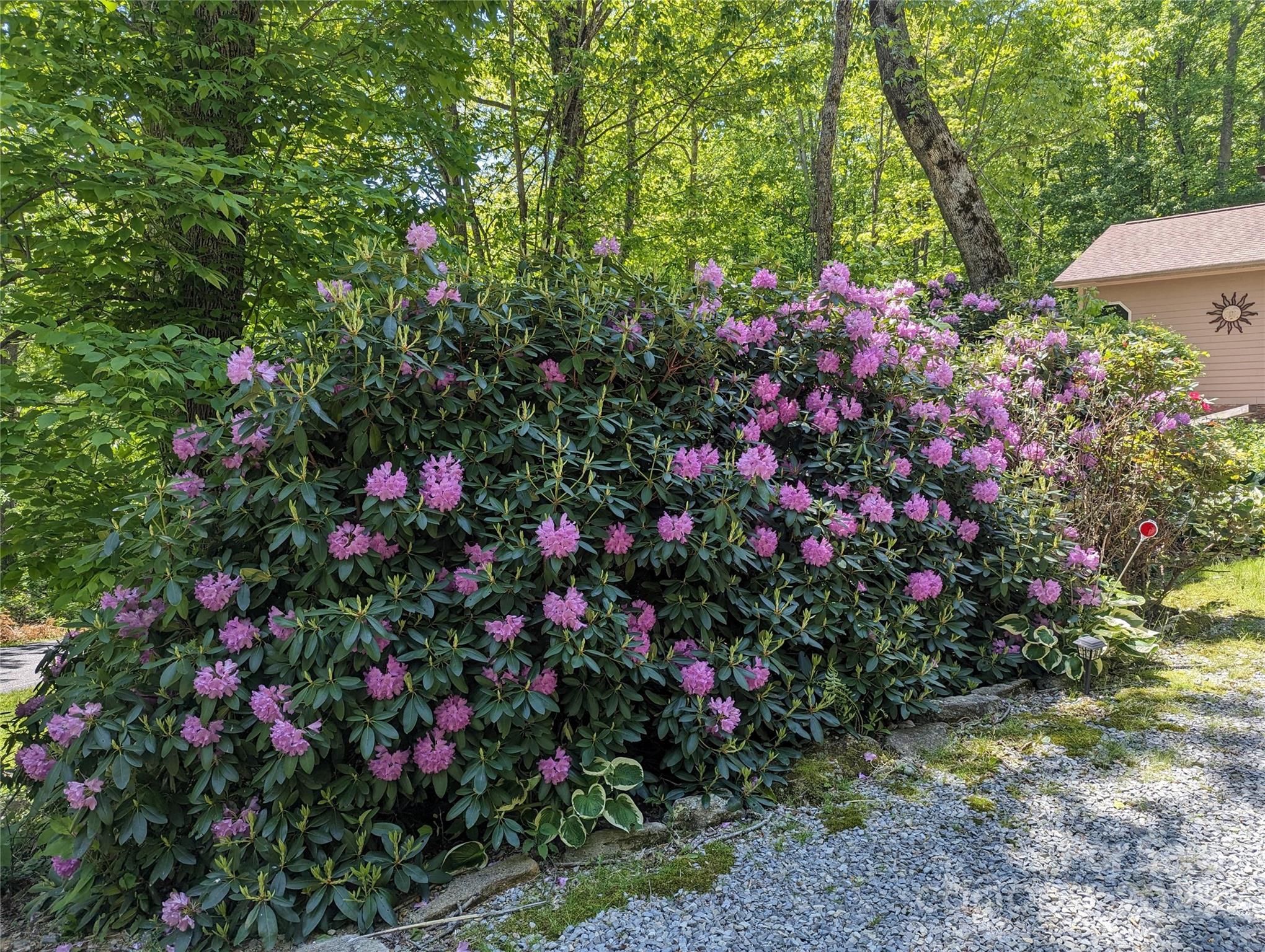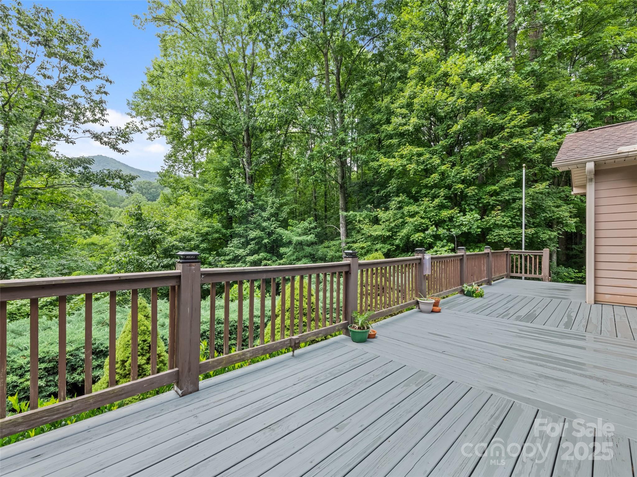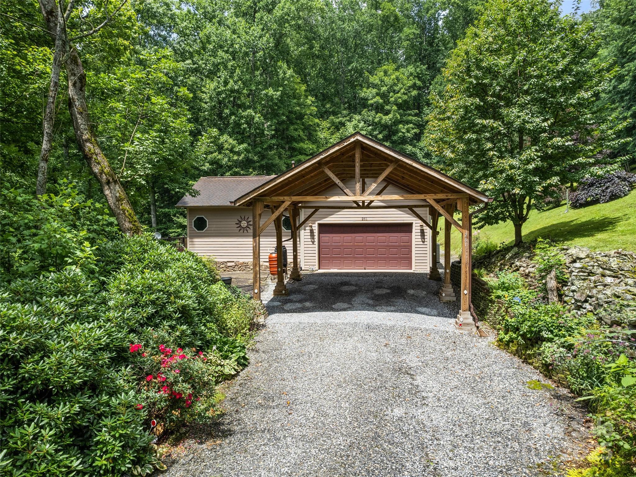 Enjoy privacy and breathtaking mountain views all year round in this custom-built, one-story home from 2005. Blend of modern amenities and rustic mountain charm, this home features 9ft ceilings, oak hardwood floors, exposed beam, vaulted ceiling, open floor plan with a cozy stone fireplace. The kitchen offers an island and breakfast bar with Corian countertops. Primary suite includes a double vanity and a tiled walk-in shower. A split layout places two bedrooms and a full bath on the opposite side. Views showcase Cataloochee Ski Slopes. Paved access leads you right to the home. A well-maintained community with a low $400/yr HOA fee and Fiber Optic Internet. It also boasts a 2-car garage, a 2-car carport, and ample driveway space for parking and easy turnarounds. Additional storage is available in the shed, and the lush landscaping includes black raspberries, strawberries, and blueberries. A year-round creek runs through the property, and lots of wildlife! No Rentals Allowed.