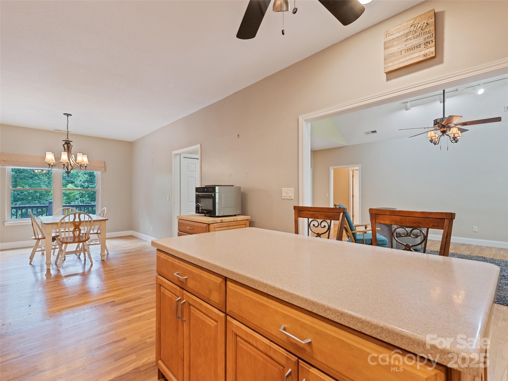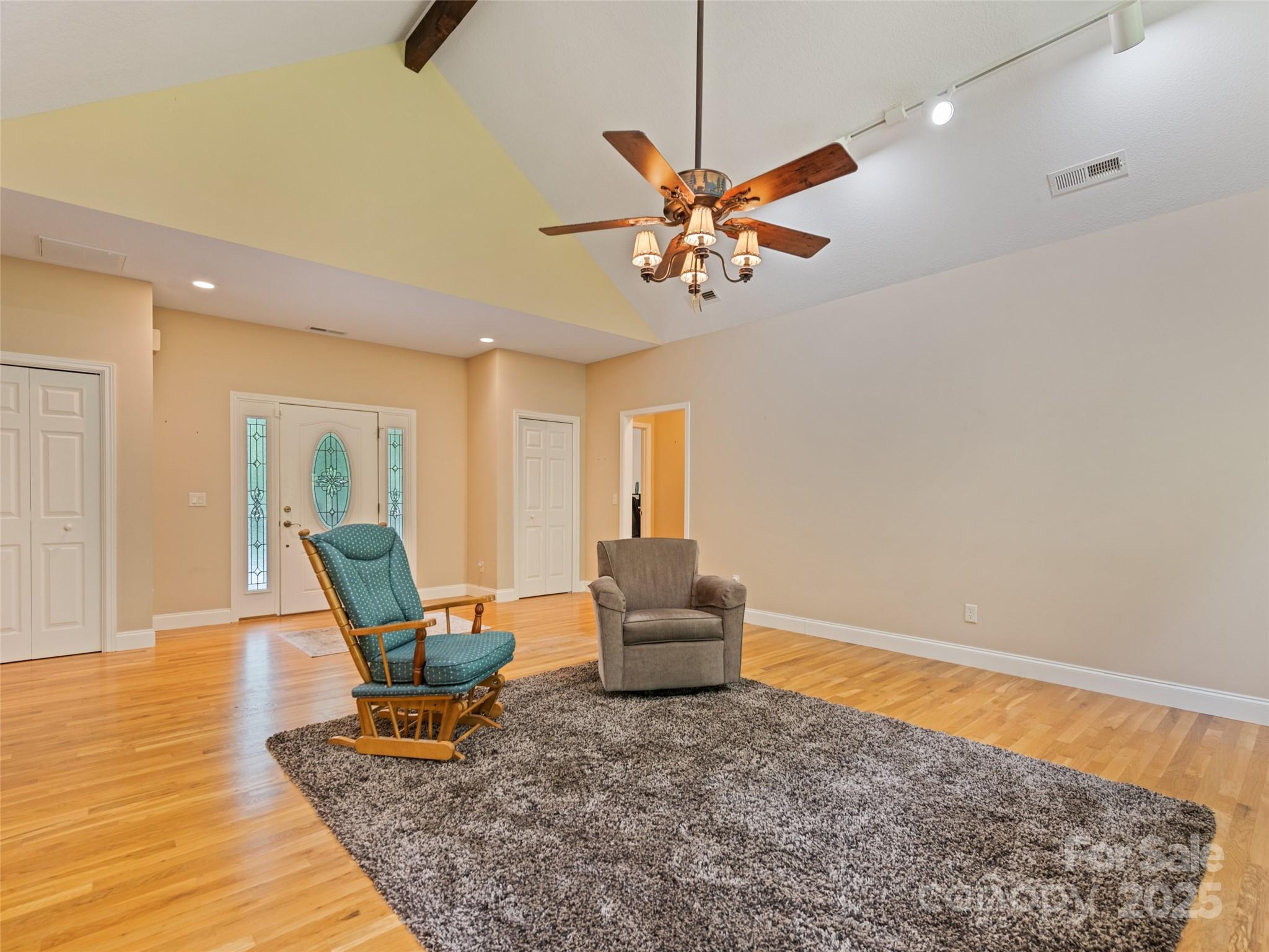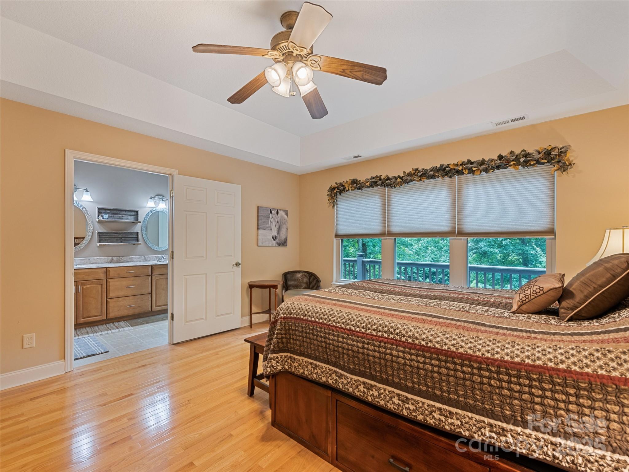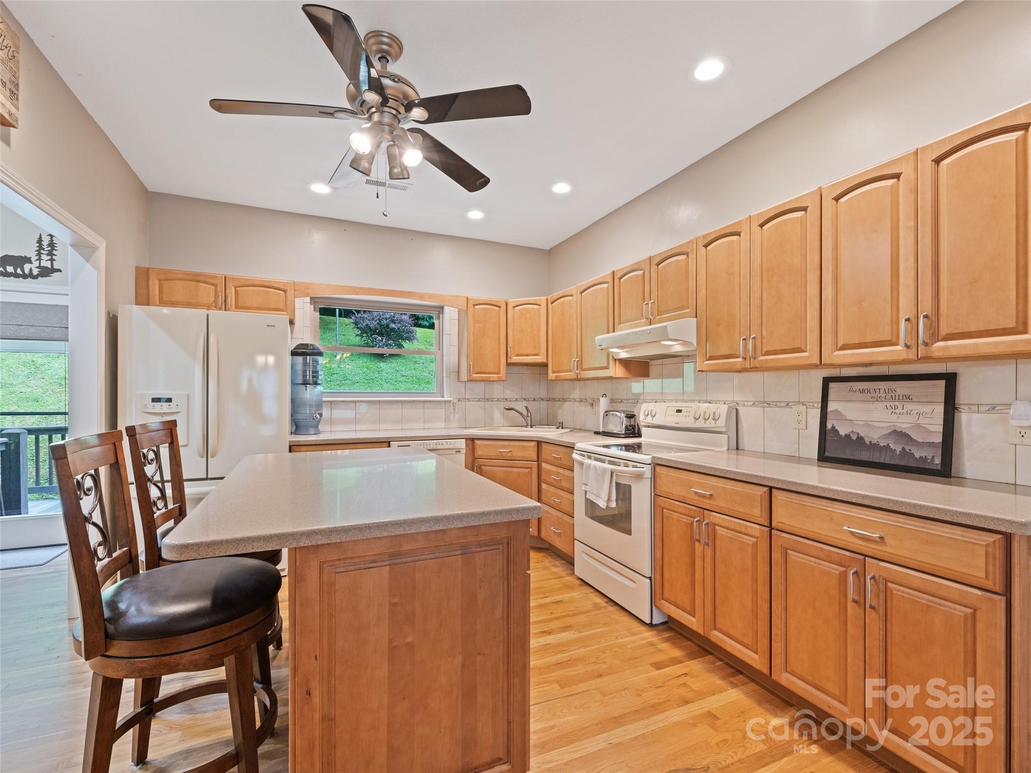 Enjoy privacy and breathtaking mountain views all year round in this custom-built, one-story home from 2005. Blend of modern amenities and rustic mountain charm, this home features 9ft ceilings, oak hardwood floors, exposed beam, vaulted ceiling, open floor plan with a cozy stone fireplace. The kitchen offers an island and breakfast bar with Corian countertops. Primary suite includes a double vanity and a tiled walk-in shower. A split layout places two bedrooms and a full bath on the opposite side. Views showcase Cataloochee Ski Slopes. Paved access leads you right to the home. A well-maintained community with a low $400/yr HOA fee and Fiber Optic Internet. It also boasts a 2-car garage, a 2-car carport, and ample driveway space for parking and easy turnarounds. Additional storage is available in the shed, and the lush landscaping includes black raspberries, strawberries, and blueberries. A year-round creek runs through the property, and lots of wildlife! No Rentals Allowed.