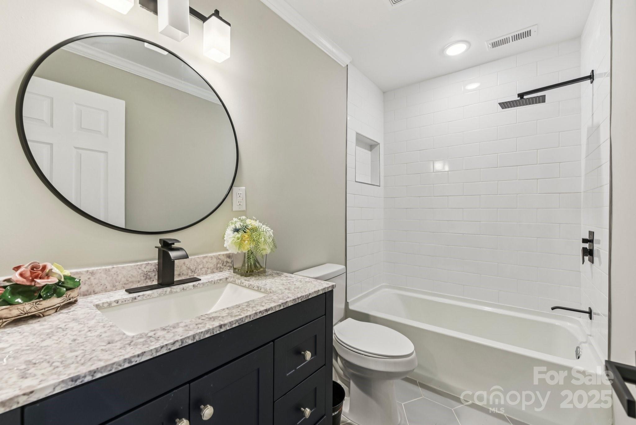 This beautifully designed two-story home offers four bedrooms and four bathrooms, combining modern comfort with thoughtful functionality. The heart of the home is a sleek, contemporary kitchen featuring quartz countertops, stainless steel appliances, stylish backsplash tile, and modern hardware throughout. The main-level primary suite provides a true retreat, complete with a luxurious en-suite bathroom and an expansive walk-in closet. The laundry room and powder room are conveniently located between the kitchen and the entry from the attached two-car side-load garage—making daily routines seamless and efficient. Upstairs, you'll find well-appointed secondary bathrooms with tile, vanities, and tub/shower combinations. A spacious open loft overlooks the second-story living room, perfect for lounging or study space. A large bonus/playroom offers versatile options for a quiet home office, media room, or entertainment space. Additional highlights include: Neutral paint tones and low-maintenance luxury vinyl plank (LVP) flooring throughout the main level, modern light fixtures and contemporary hardware, two staircases for added convenience and private access between living areas, custom accent wall in the dining room/foyer area, and an expansive yard fully enclosed with wood fencing—ideal for outdoor activities and entertaining. This home seamlessly blends space, style, and smart design—perfect for entertaining, or simply enjoying everyday comfort.