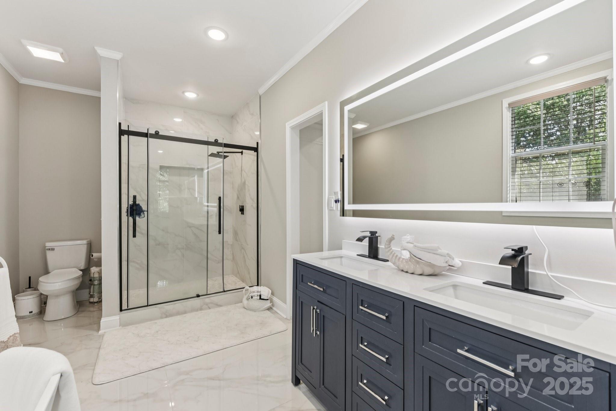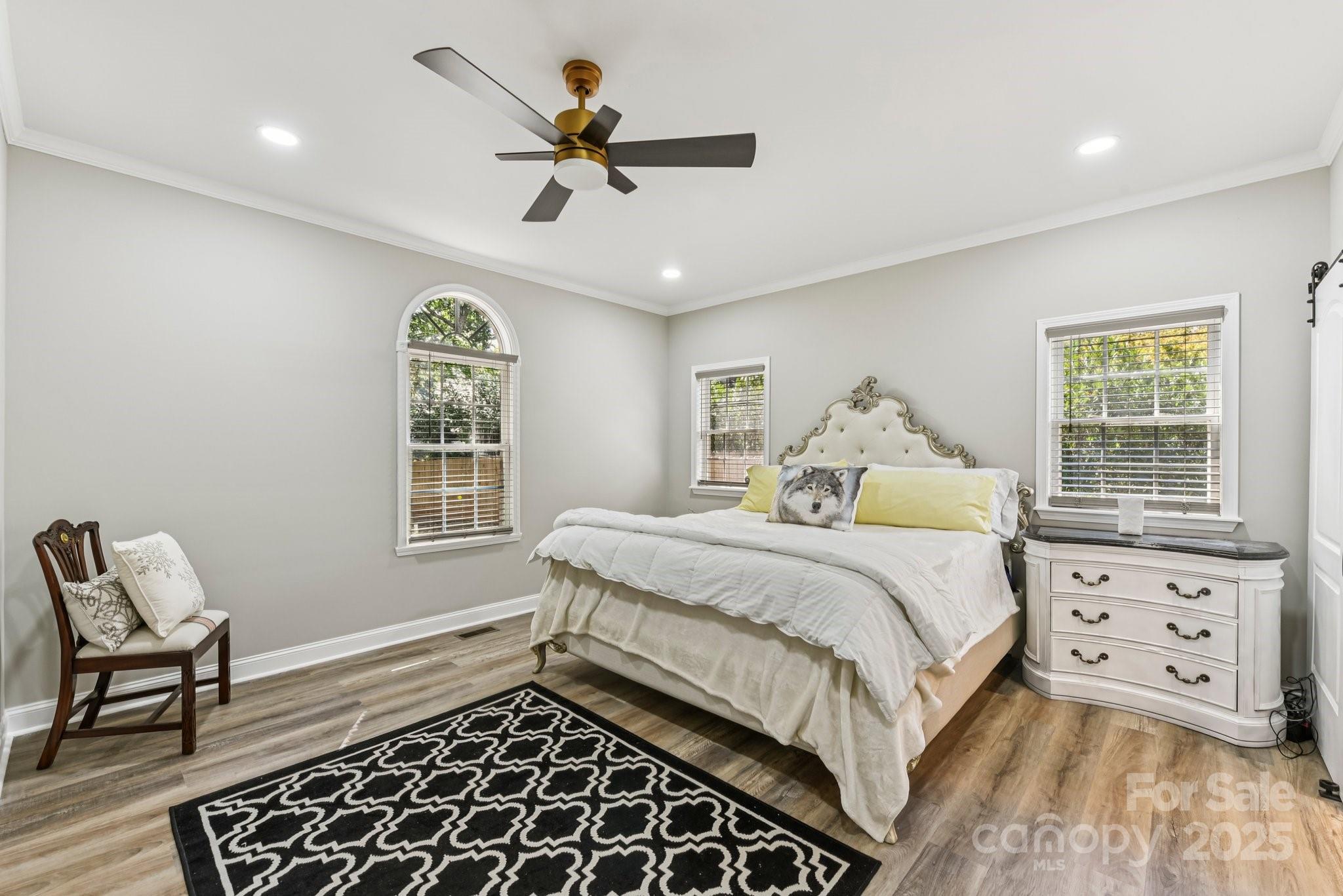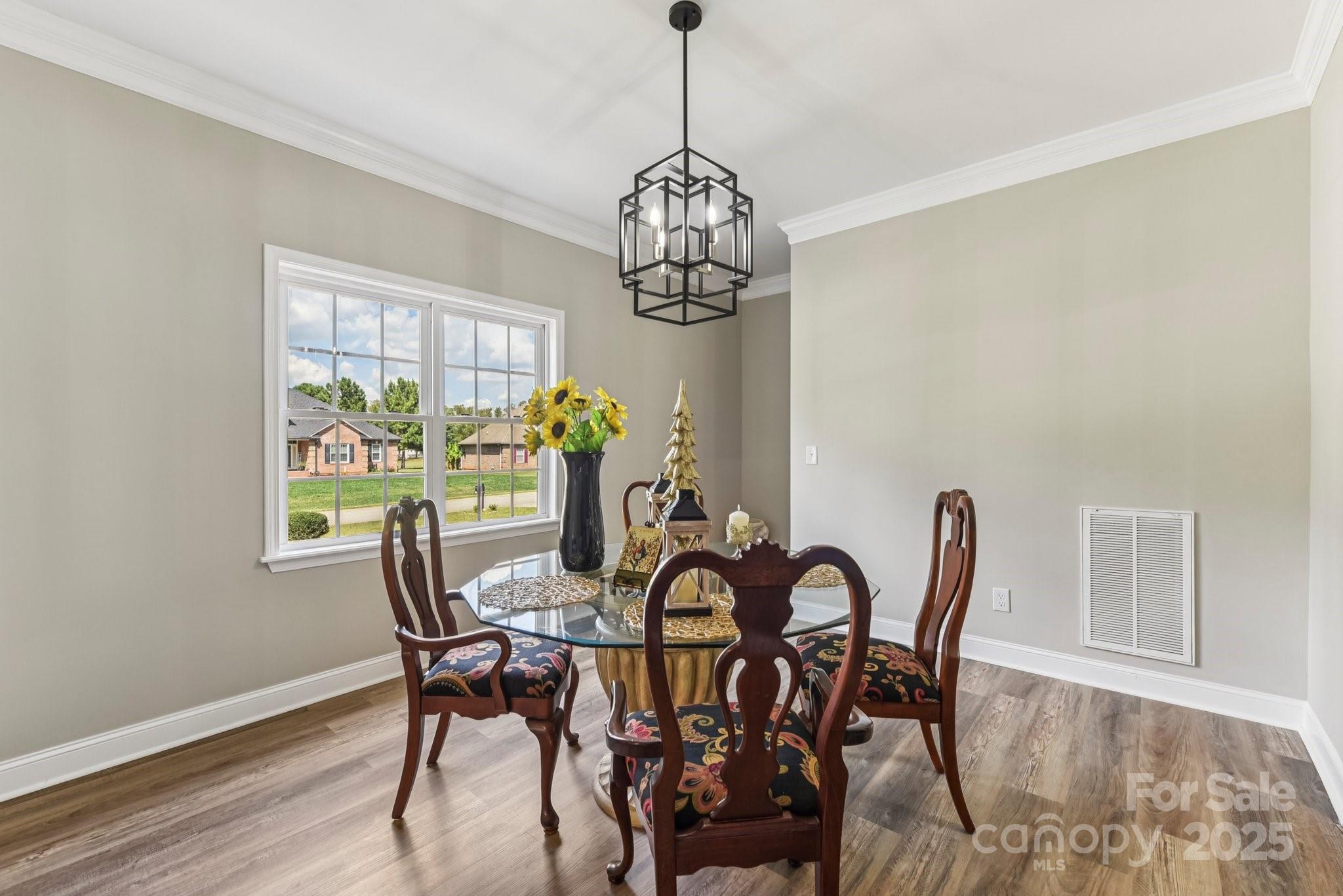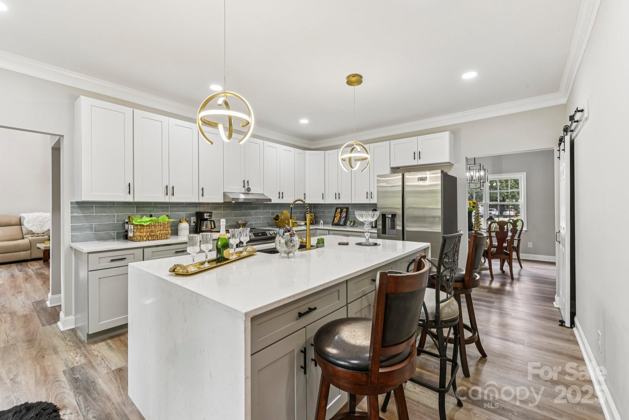 This beautifully designed two-story home offers four bedrooms and four bathrooms, combining modern comfort with thoughtful functionality. The heart of the home is a sleek, contemporary kitchen featuring quartz countertops, stainless steel appliances, stylish backsplash tile, and modern hardware throughout. The main-level primary suite provides a true retreat, complete with a luxurious en-suite bathroom and an expansive walk-in closet. The laundry room and powder room are conveniently located between the kitchen and the entry from the attached two-car side-load garage—making daily routines seamless and efficient. Upstairs, you'll find well-appointed secondary bathrooms with tile, vanities, and tub/shower combinations. A spacious open loft overlooks the second-story living room, perfect for lounging or study space. A large bonus/playroom with large skylight offers versatile options for a quiet home office, media room, or entertainment space. Additional highlights include: Neutral paint tones and low-maintenance luxury vinyl plank (LVP) flooring throughout the main level, modern light fixtures and contemporary hardware, two staircases for added convenience and private access between living areas, custom accent wall in the dining room/foyer area, and an expansive yard fully enclosed with wood fencing—ideal for outdoor activities and entertaining. This home seamlessly blends space, style, and smart design—perfect for entertaining, or simply enjoying everyday comfort.