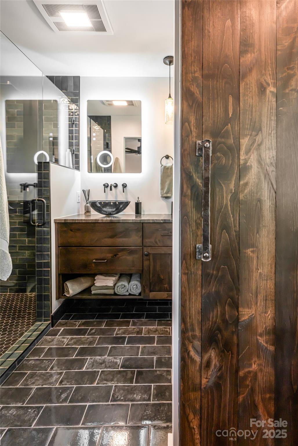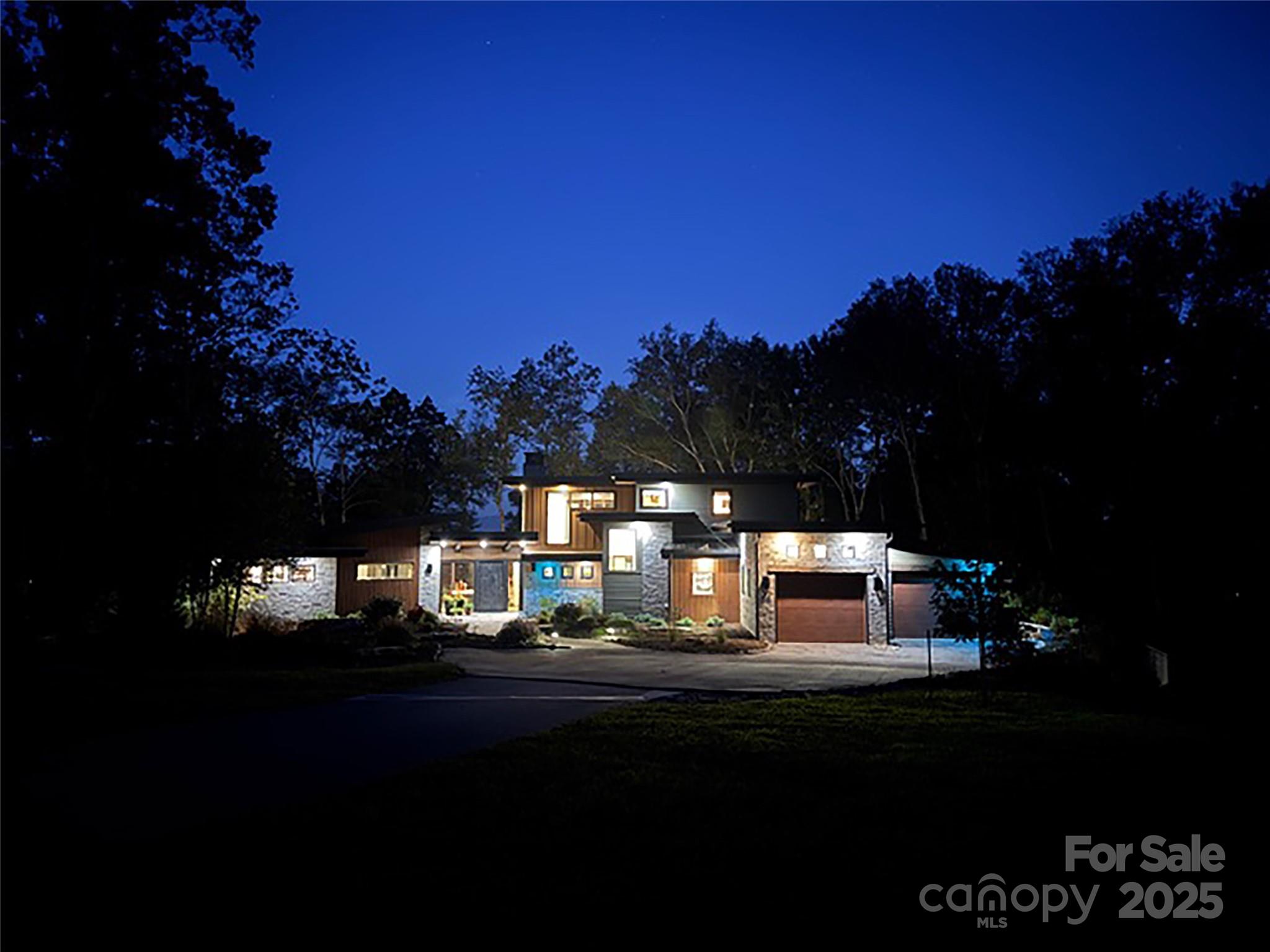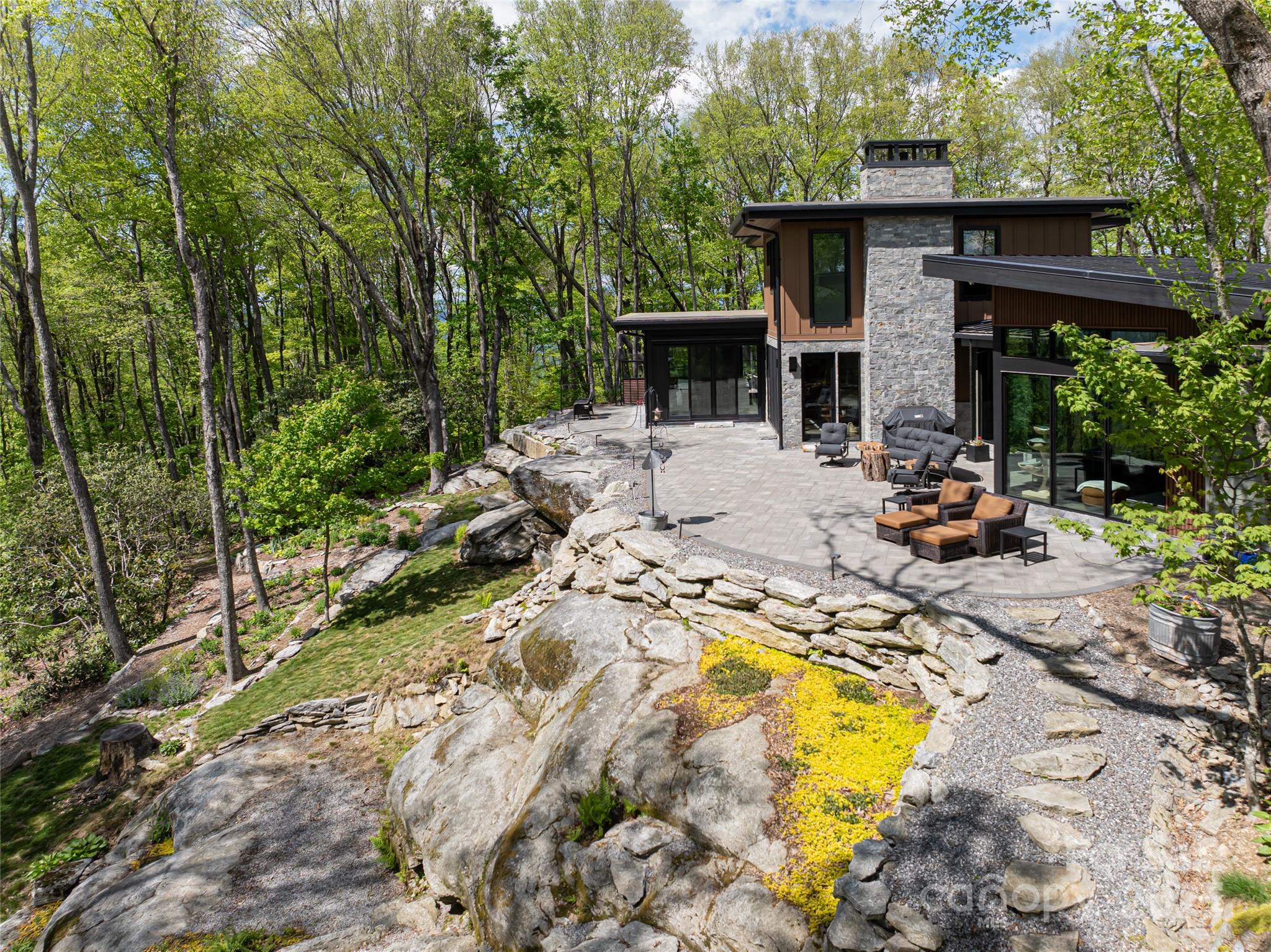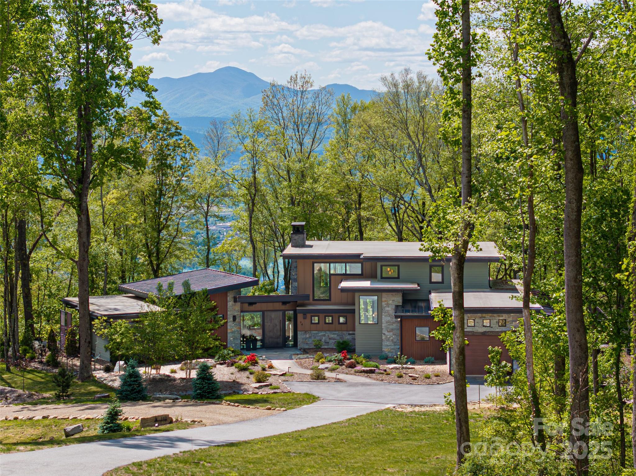 Embrace refined mountain living in this breathtaking contemporary estate where tranquility meets sophistication. Set atop a rare flat mountaintop lot, the home captures sweeping 180-degree vistas of the Blue Ridge while grounding itself in timeless craftsmanship. Vaulted 20-foot ceilings soar above the living room, where 125-year-old hand-hewn beams, salvaged from a Canadian barn, span overhead. Large exposed custom metal beams lend strength and artistry, while a floor-to-ceiling stacked-stone fireplace with a custom concrete hearth anchors the space with warmth and grandeur. Expansive walls of glass frame the mountain panorama, blurring boundaries between indoors and out. The gourmet kitchen is a culinary masterpiece, featuring Thermador stainless steel appliances, Italian quartzite countertops and bespoke rustic alder cabinetry. A walk-in pantry and coffee bar, tucked behind a sliding knotty alder barn door, add thoughtful function to the refined design. Flowing seamlessly into the dining area and sunroom, with its dramatic stone fireplace, this is a home designed for gathering and connection. The main-level primary suite is a private oasis, complete with an oversized shower, custom walk-in closet and breathtaking mountain views. Upstairs, two bedrooms with en suites showcase artisanal tile and custom finishes, offering guests comfort and distinction. Outdoors, nature and luxury intertwine across four-plus acres of landscaped serenity. Natural rock stairs wind past commanding boulders, trails and flower gardens, leading to a fenced vegetable garden with raised beds and berry bushes. Gentle topography invites quiet reflection and lively entertaining, an uncommon feature at this elevation. This retreat is part of Couch Mountain, a gated conservation community of just 81 homesites on 395 acres, offering miles of wooded recreational trails and two community gardens. Here, stewardship of the land is woven into daily life, creating a rare balance of privacy, sustainability and community. This mountaintop property is conveniently 15 minutes from the Asheville Airport, and halfway in between Asheville and Hendersonville for quick and easy access to both communities. With community allowed seven-day rentals, this home is ideal for a lock-and-leave lifestyle with opportunities for potential income when not in use. More than a home, this is a sanctuary where elegance and nature coexist, and where every day begins with the beauty of Blue Ridge unfolding before you.