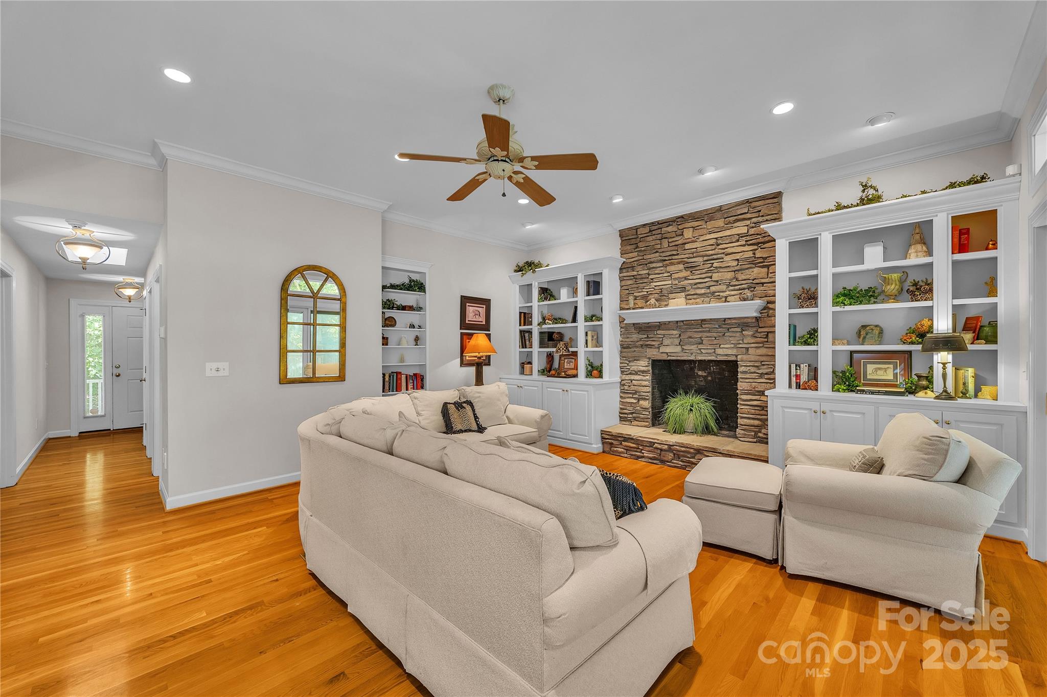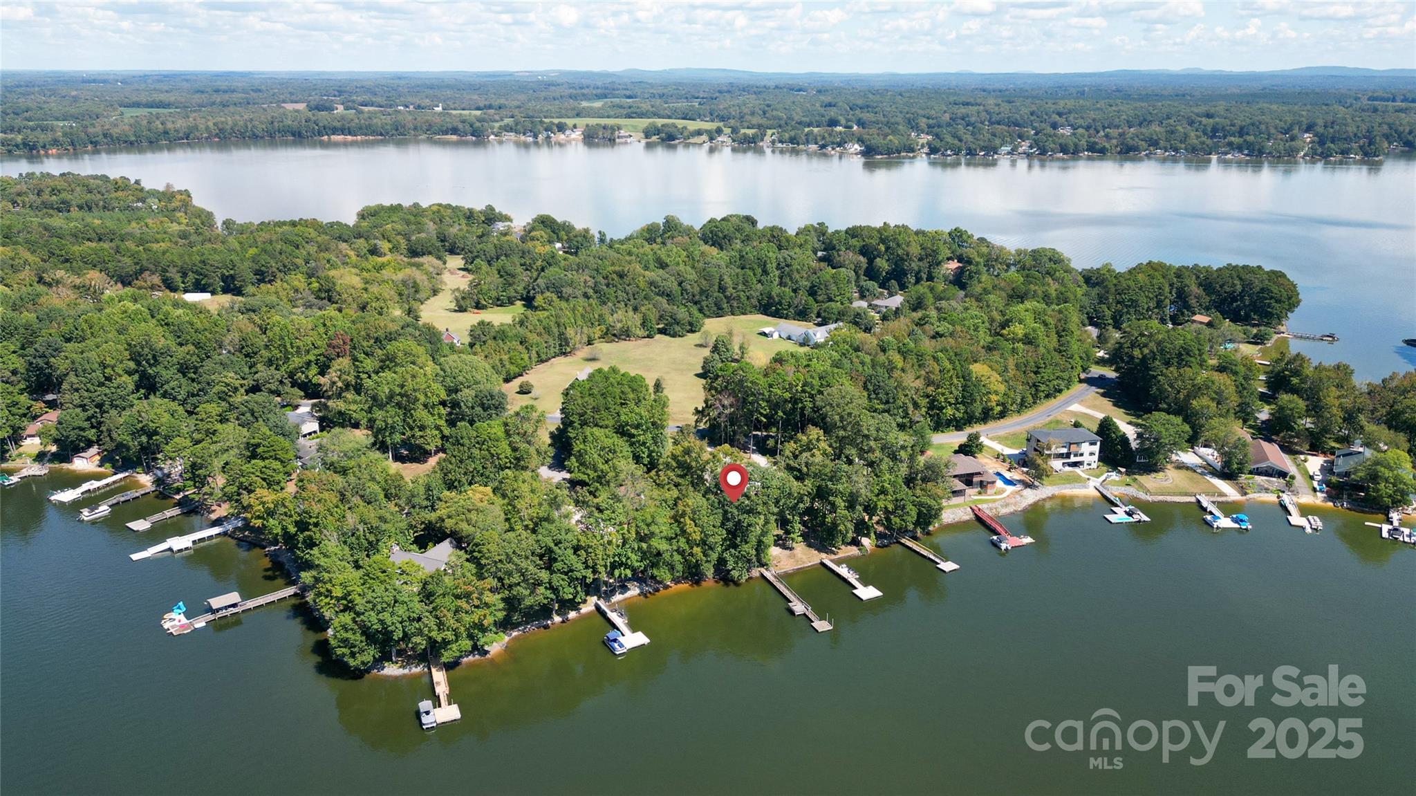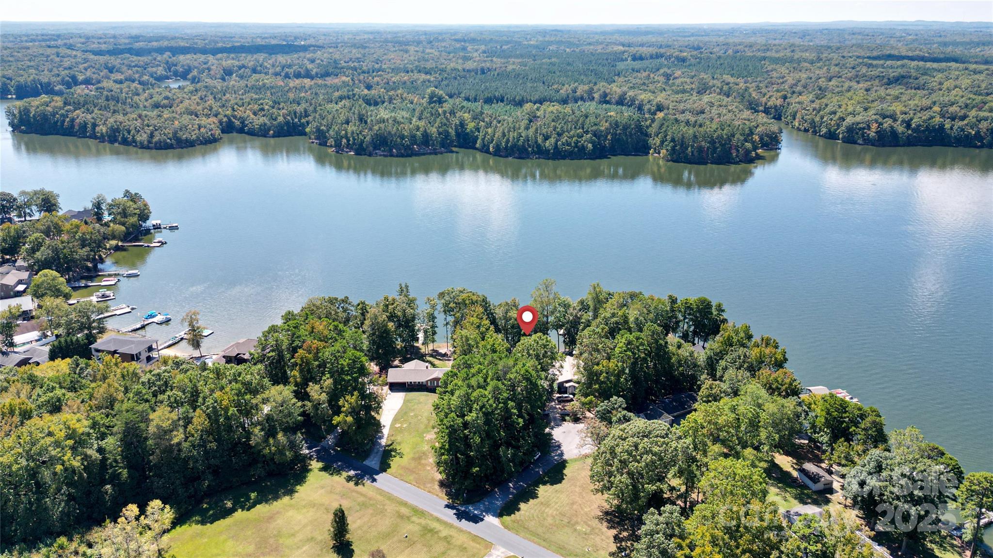 Waterfront with a long pier and exceptional water views! Tucked in an adorable cul-de-sac within popular Anchor Downs, this home is designed for lake living. A large deck overlooks the water, while a screened-in side porch and covered lower patio provide endless outdoor enjoyment. Newer stairs lead from the tall deck to the patio below. Inside, an open floor plan features a kitchen overlooking the great room, complete with a striking stone fireplace and exquisite built-ins. The dining area sits perfectly between the kitchen and great room — all enjoying expansive lake views. Hardwood flooring graces the main level, which includes two ensuite bedrooms. Downstairs, find two more bedrooms with a Jack & Jill bath, plus a second living area with fireplace and wet bar. Outdoor living, indoor charm, and lakefront lifestyle all in one!