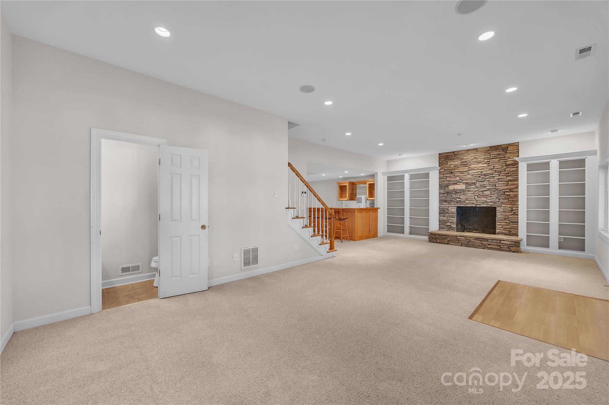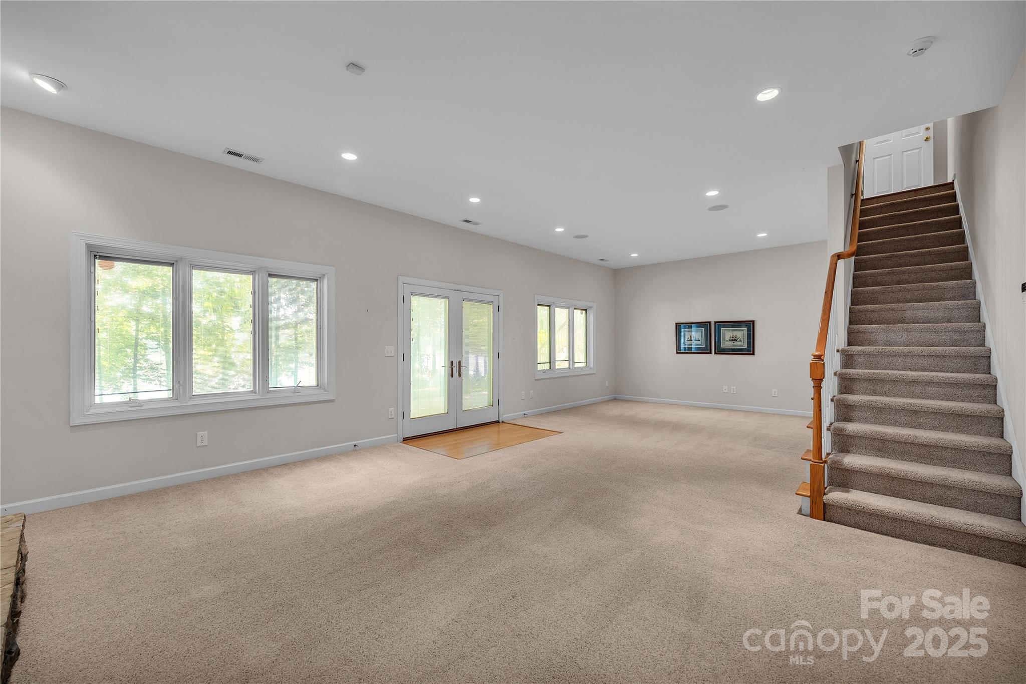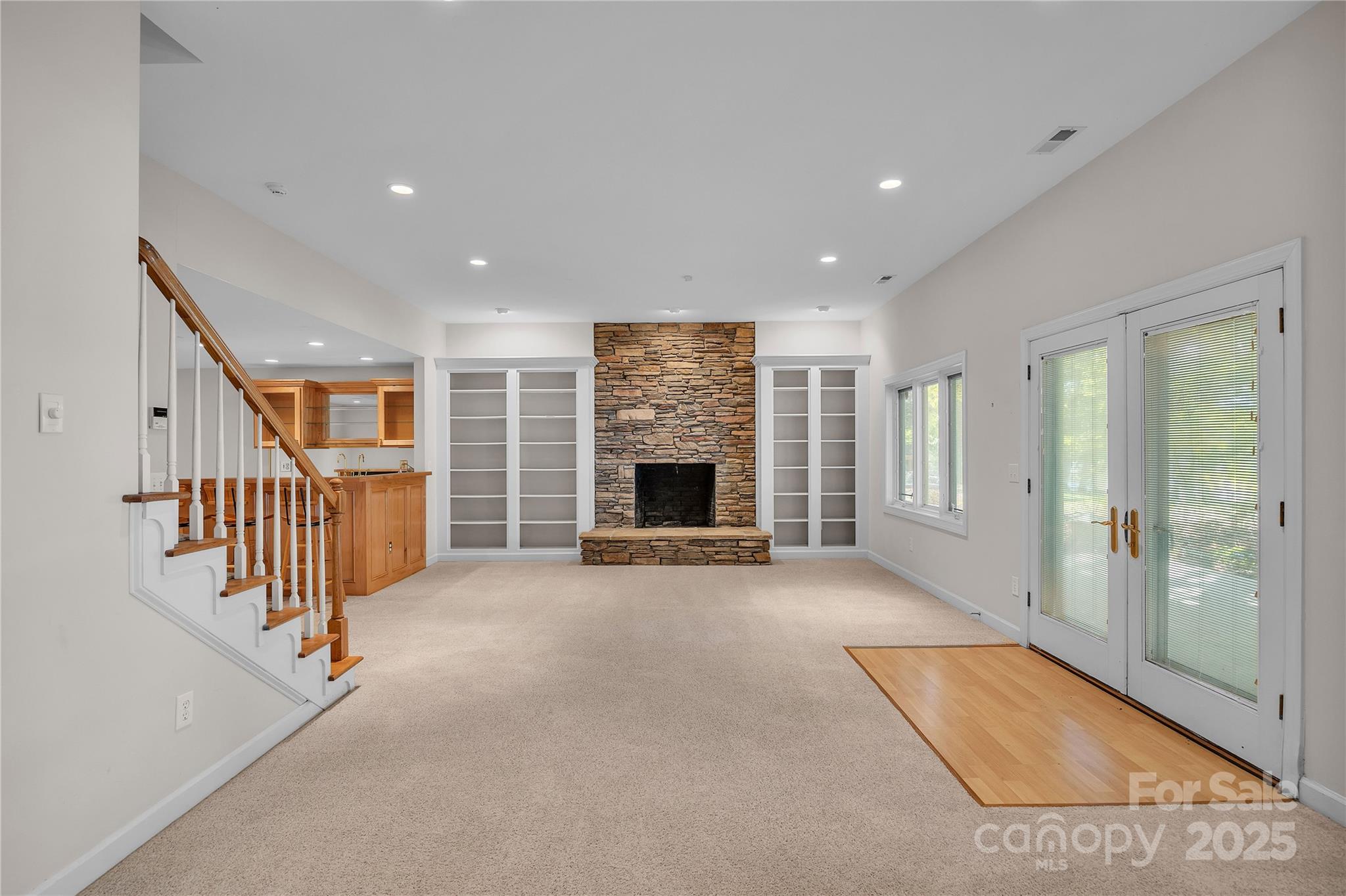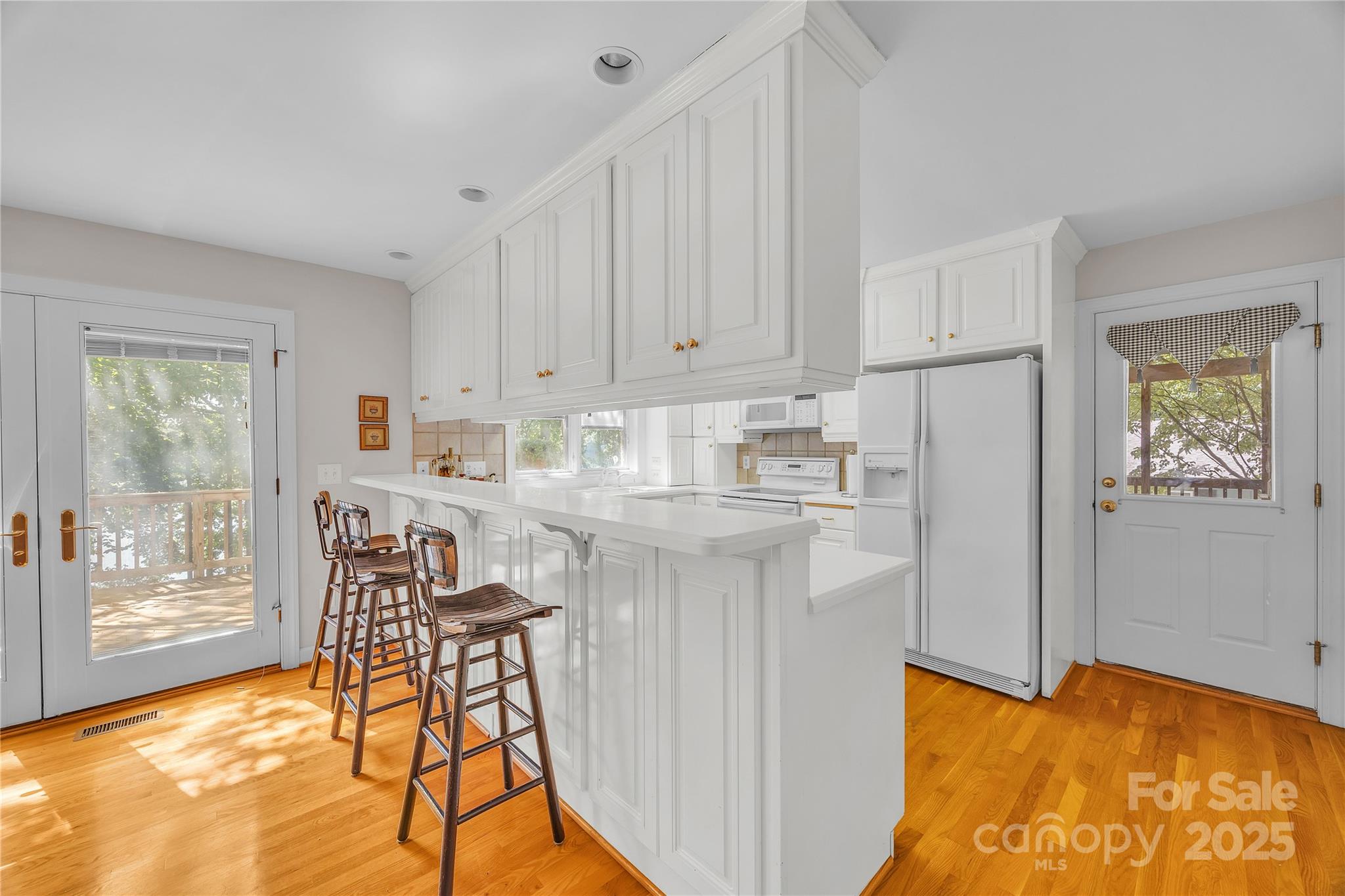 Waterfront with a long pier and exceptional water views! Tucked in an adorable cul-de-sac within popular Anchor Downs, this home is designed for lake living. A large deck overlooks the water, while a screened-in side porch and covered lower patio provide endless outdoor enjoyment. Newer stairs lead from the tall deck to the patio below. Inside, an open floor plan features a kitchen overlooking the great room, complete with a striking stone fireplace and exquisite built-ins. The dining area sits perfectly between the kitchen and great room — all enjoying expansive lake views. Hardwood flooring graces the main level, which includes two ensuite bedrooms. Downstairs, find two more bedrooms with a Jack & Jill bath, plus a second living area with fireplace and wet bar. Outdoor living, indoor charm, and lakefront lifestyle all in one!