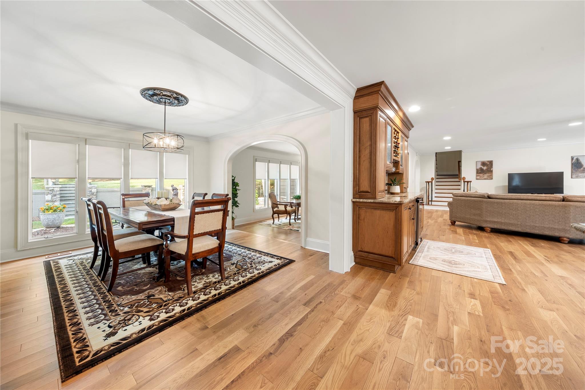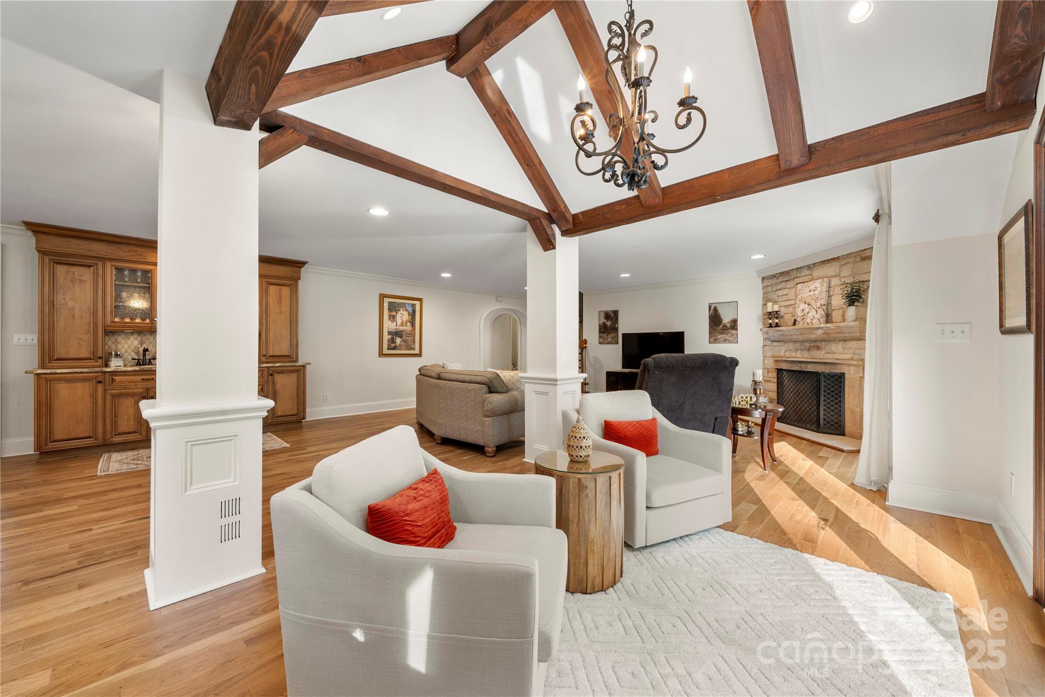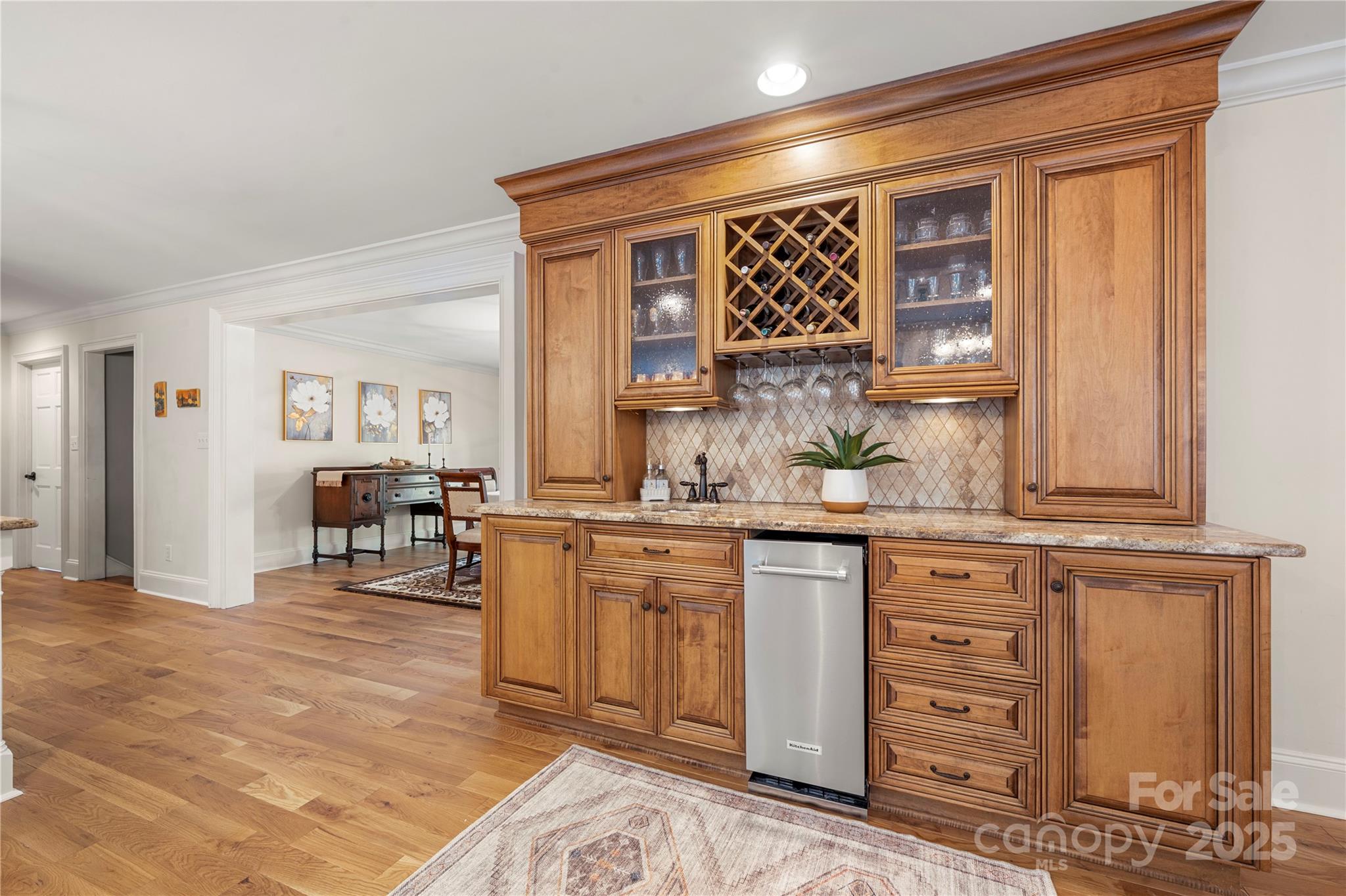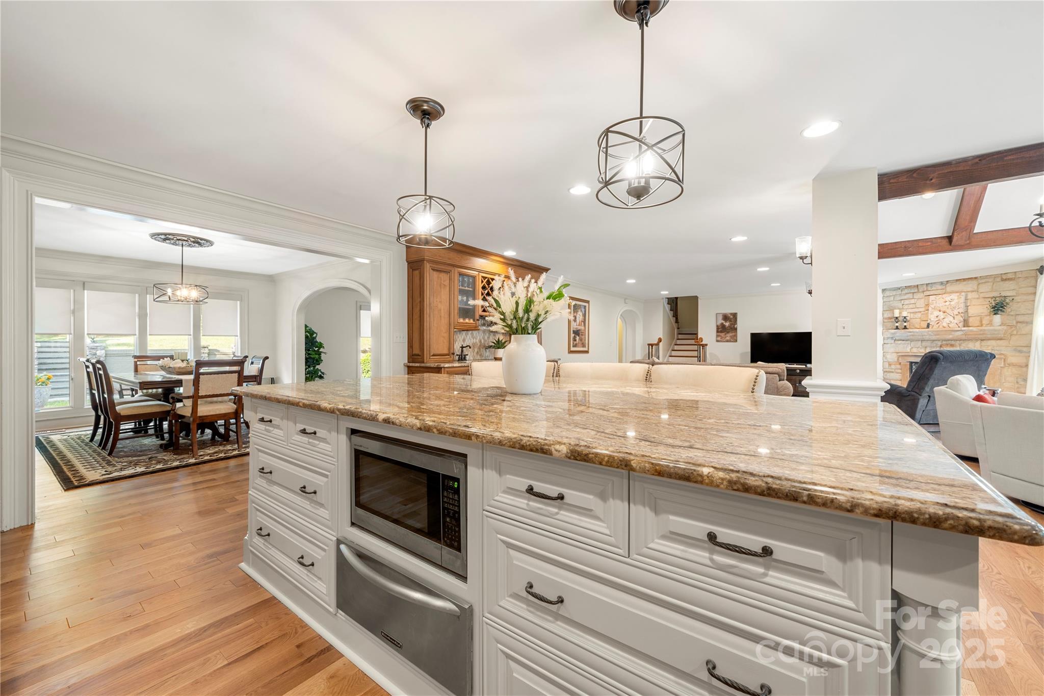 Seller recently invested over 60K in updates including new paint, flooring, lighting & carpets! Nestled on almost an acre, this home has features that are sure to impress. Step inside & be greeted by NEW hardwood flooring (7/25), crown moldings & craftsmanship throughout. Great room features a fireplace, wet bar & vaulted breakfast area. The kitchen has stainless steel appliances, granite counters, dual dishwashers & island that was just repainted. Main level owner's suite includes vaulted ceiling, wine/coffee bar, custom walk-in closet, washer/dryer & ensuite bath. Ensuite vanities and shelving was just repainted in July. Continue to the basement which features an office, laundry, full bath & rec room w/fireplace & wet bar! Relax on the glass enclosed porch or deck. The fenced in yard features a patio w/pergola, grilling station & firepit. With proximity to Ballantyne (~6 mi), South Park (~3 mi) & Carmel Country Club (~1 mi) this home has it all! Roof replaced in 2023.