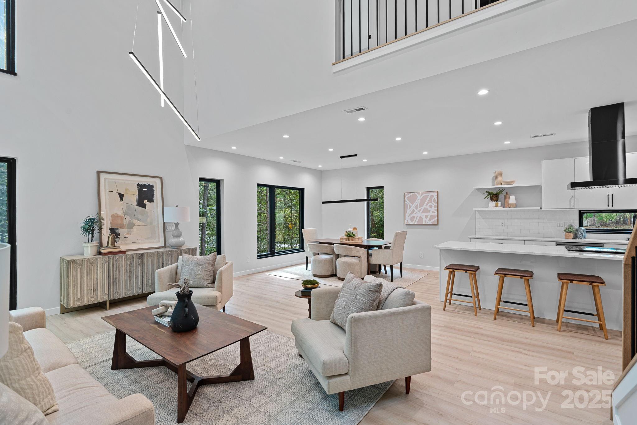 This architect-designed modern sanctuary sits on a private, oversized 0.76-acre wooded lot just 15 minutes from Uptown Charlotte, offering true seclusion for those who value peace and privacy. The open-concept main level features thoughtful craftsmanship, clean lines, and double-height windows that invite the outdoors in—creating a treehouse-like experience where you feel immersed in the woods. A spacious paver patio extends the living space outdoors, perfect for relaxing in a tranquil setting. Upstairs, three well-appointed bedrooms include a luxurious primary suite with a private balcony. The finished ground level offers a separate living area and a fourth bedroom with a private bath—ideal for guests or a dedicated work-from-home space. An attached two-car garage adds everyday convenience. Located directly across from the upcoming Cross Charlotte Trail extension, this home blends refined design, wooded views, and easy access to trails, greenways, and quiet connection with nature.