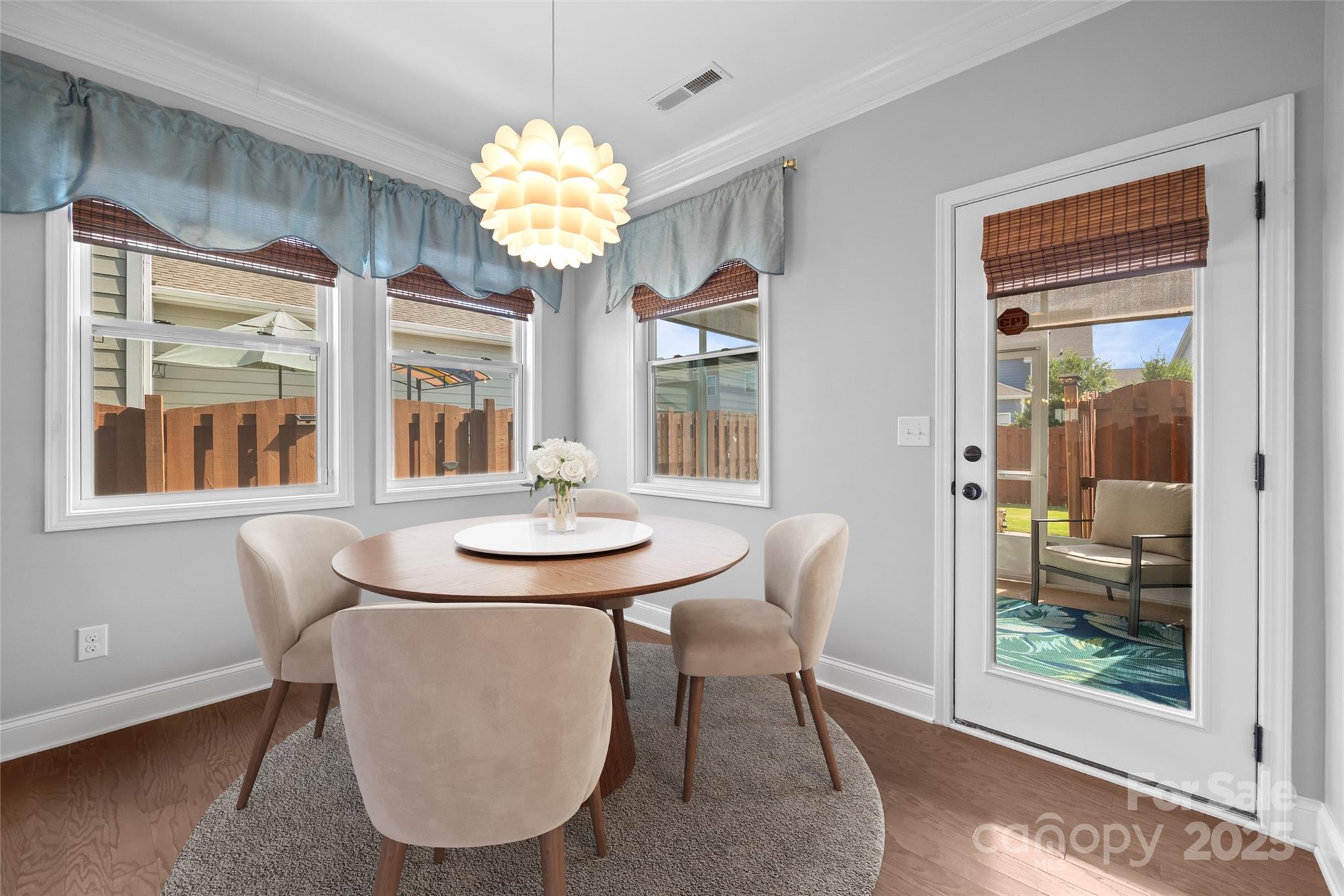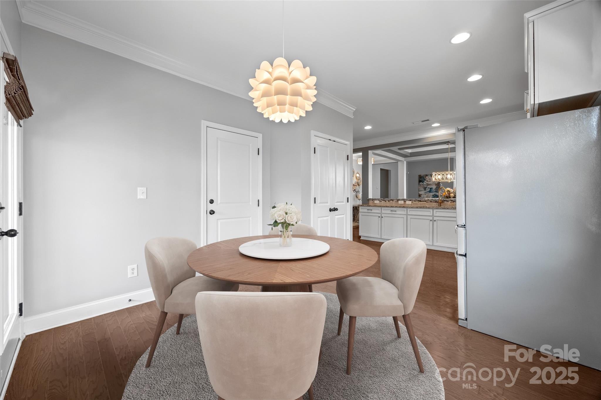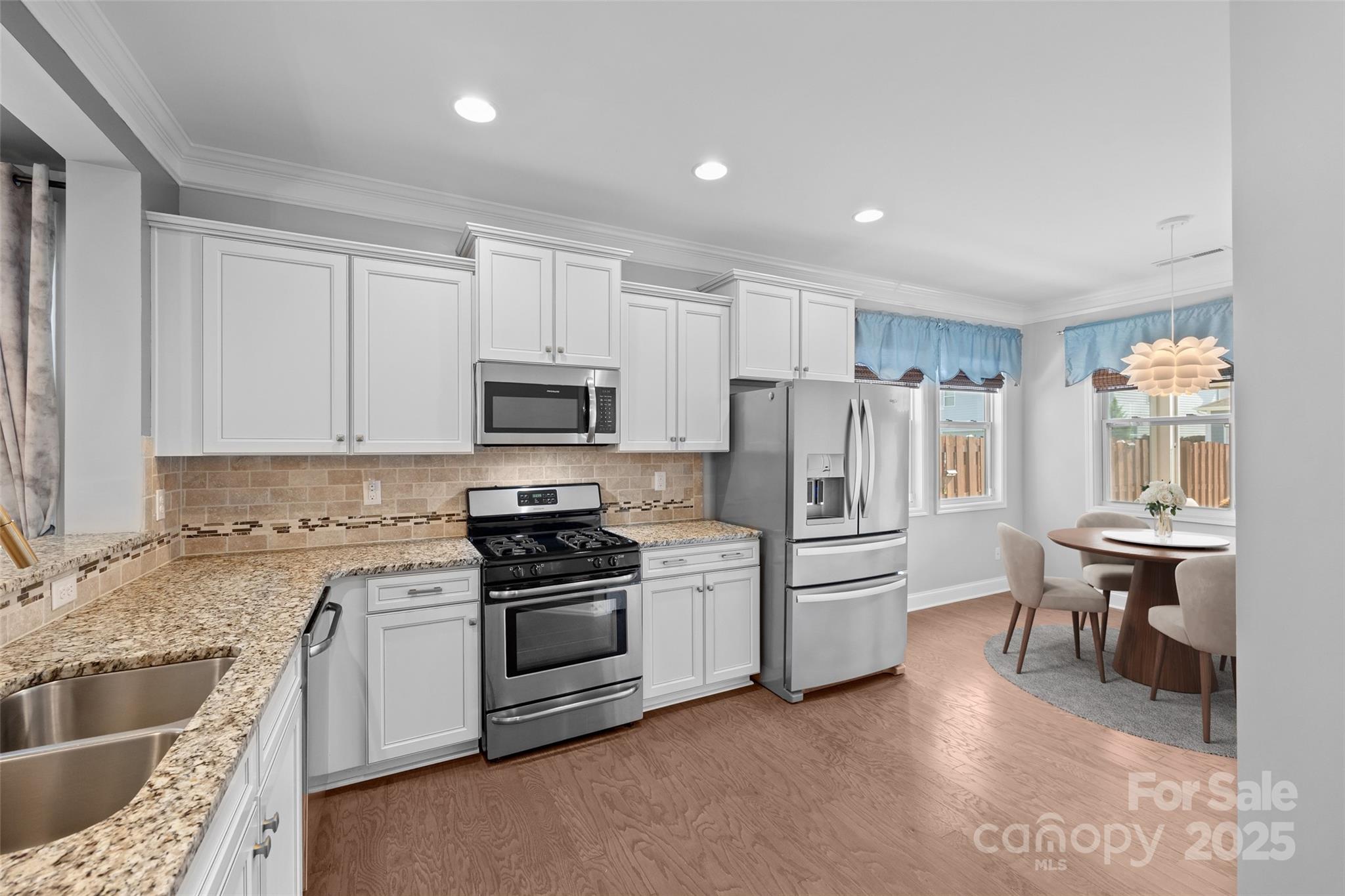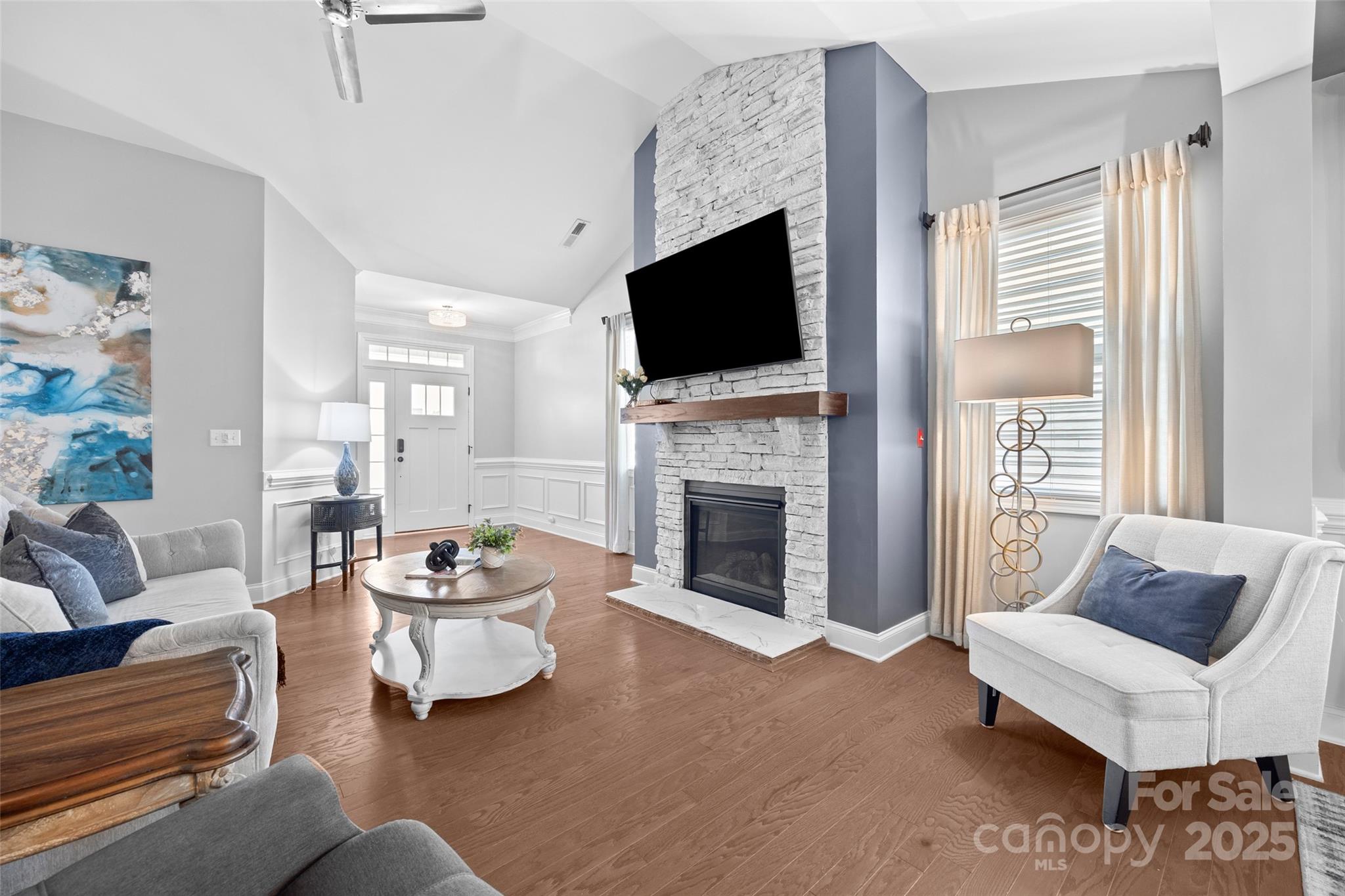 PRICE IMPROVEMENT - This picturesque, ranch home in the Arbormere community is sure to impress you with it's stunning designer details - a vaulted great room centered by a stacked stone gas fireplace, a coffered dining room ceiling, upgraded lighting, crown molding throughout, and custom closets and fans in all bedrooms! You are welcomed in from a rocking chair front porch onto hardwood floors that run throughout the common areas. The open floor plan provides tons of natural light and the the ideal layout for entertaining. The kitchen boasts gas cooking, stainless steel appliances, cabinet pull outs, double door pantry, granite counters, and more. The breakfast area looks into a serene screened porch with roller shades, and a fully fenced and private backyard (with hidden trash can area). The elegant primary suite has a tray ceiling, luxury carpet (in all 3 bedrooms), and a remodeled bathroom to include an extra large walk-in shower with tile detailing, double sinks, water closet, and a linen area. The 2 secondary bedrooms provide flexibility, and additional updated full bathroom has a granite counter. The 2 car garage includes details such as epoxy floors, finished walls, and extra storage space. And the home has a security system that features Ring doorbell, several cameras, and a smart thermostat and garage door opener. The Arbormere community amenities include an outdoor pool, playground, green spaces, and sidewalks, and is located just minutes from Lake Norman, shopping, the Novant hospital, and top rated dining - Welcome Home!