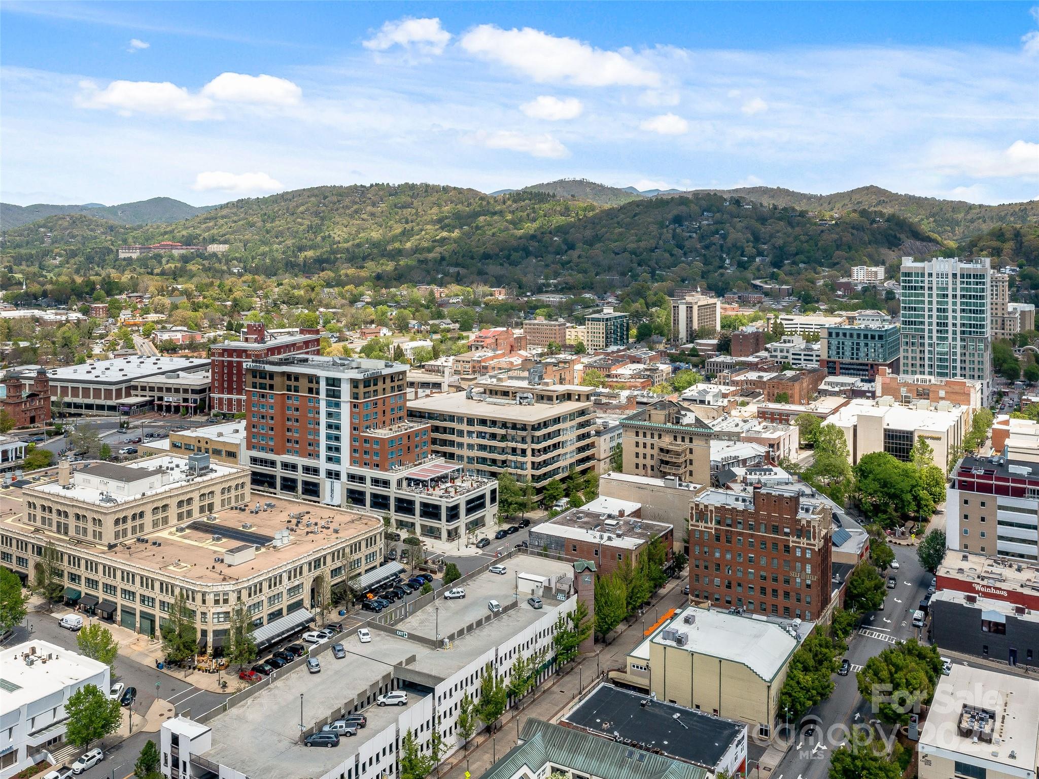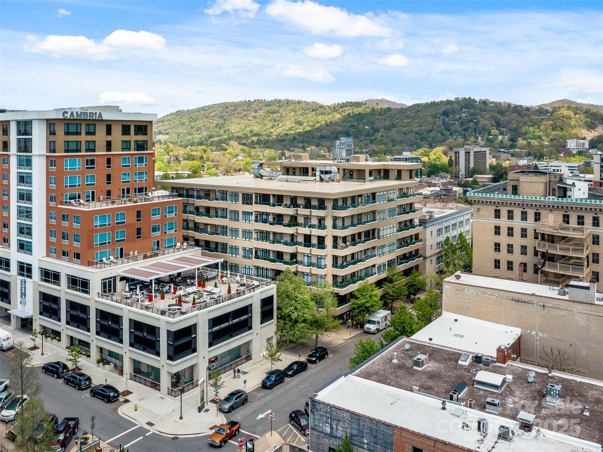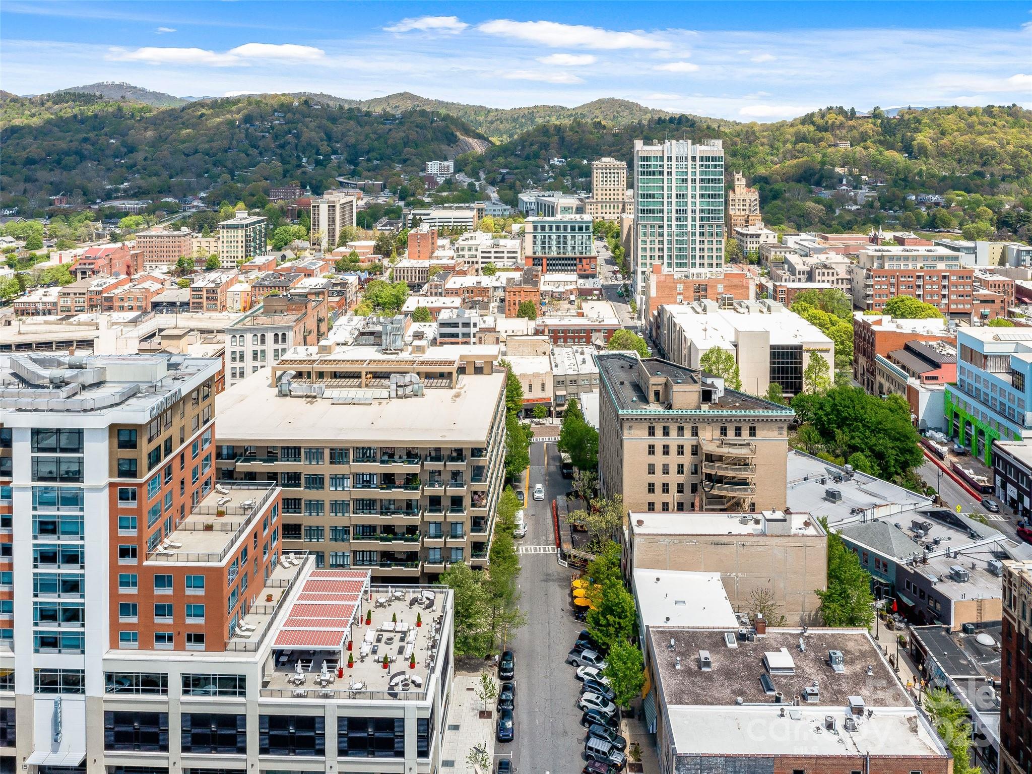 21 Battery Park is one of Asheville’s most premier condominiums, situated in the heart of downtown. Step outside your front door and immerse yourself with world-class dining, live music, boutique shopping, and vibrant nightlife. This large spacious one-bedroom residence is filled with natural light and offers an open, inviting floor plan. Primary bedroom flows to secondary space with access to the balcony, can remain a cozy guest room, or reimagined as a nursery, craft room or sun filled home office. Tiled shower, double sinks in bath. Large customized walk-in closet. A private balcony provides stunning views of downtown Asheville, the Grove Park Inn, and surrounding mountains making it the perfect spot for morning coffee watching the sunrises. Residents enjoy exclusive access to the rooftop terrace, complete with a fitness area, club room, and ample entertaining space. Additional features include a separately deeded, climate-controlled storage unit on 2nd floor and secure covered parking for ultimate convenience.