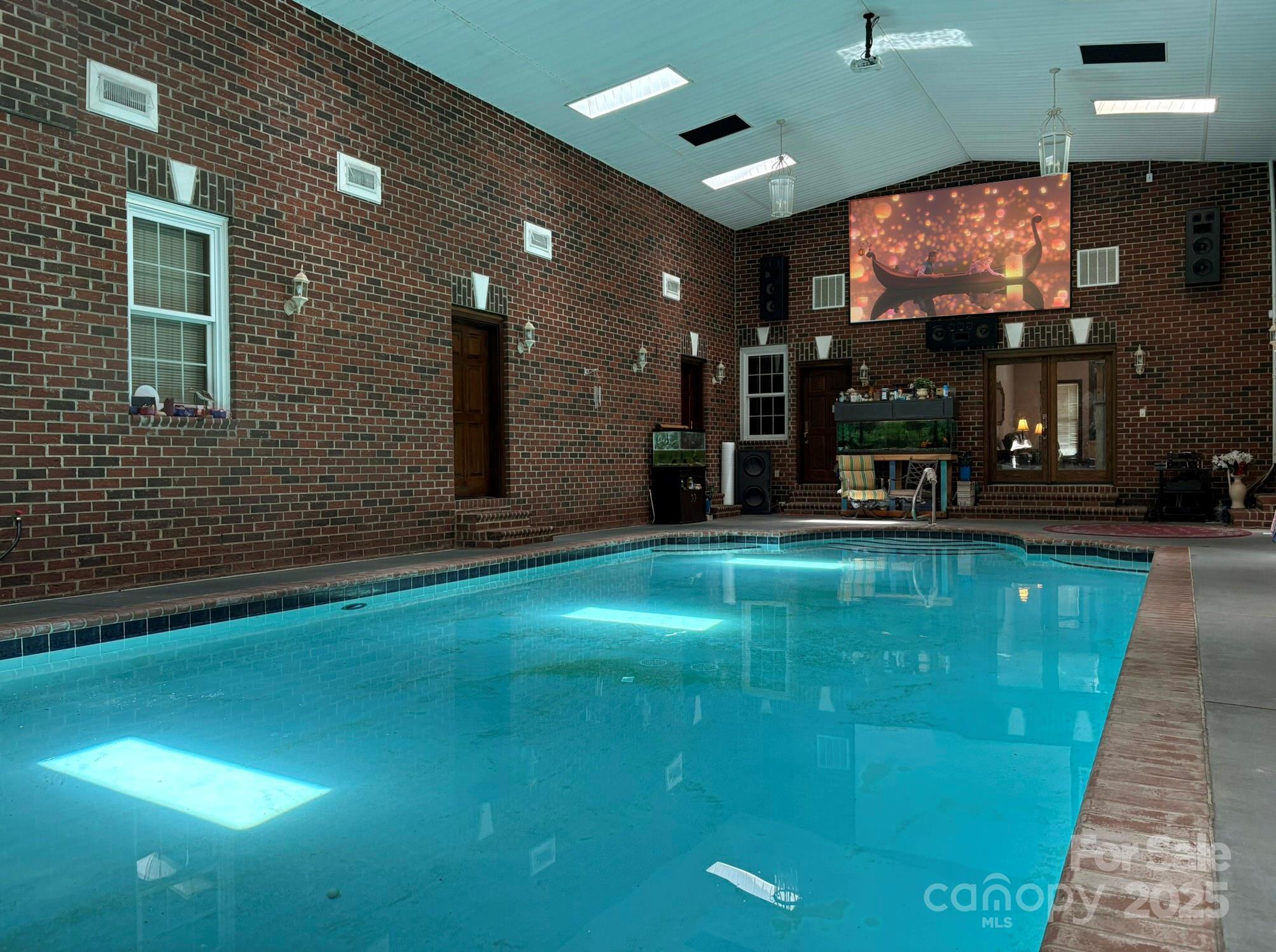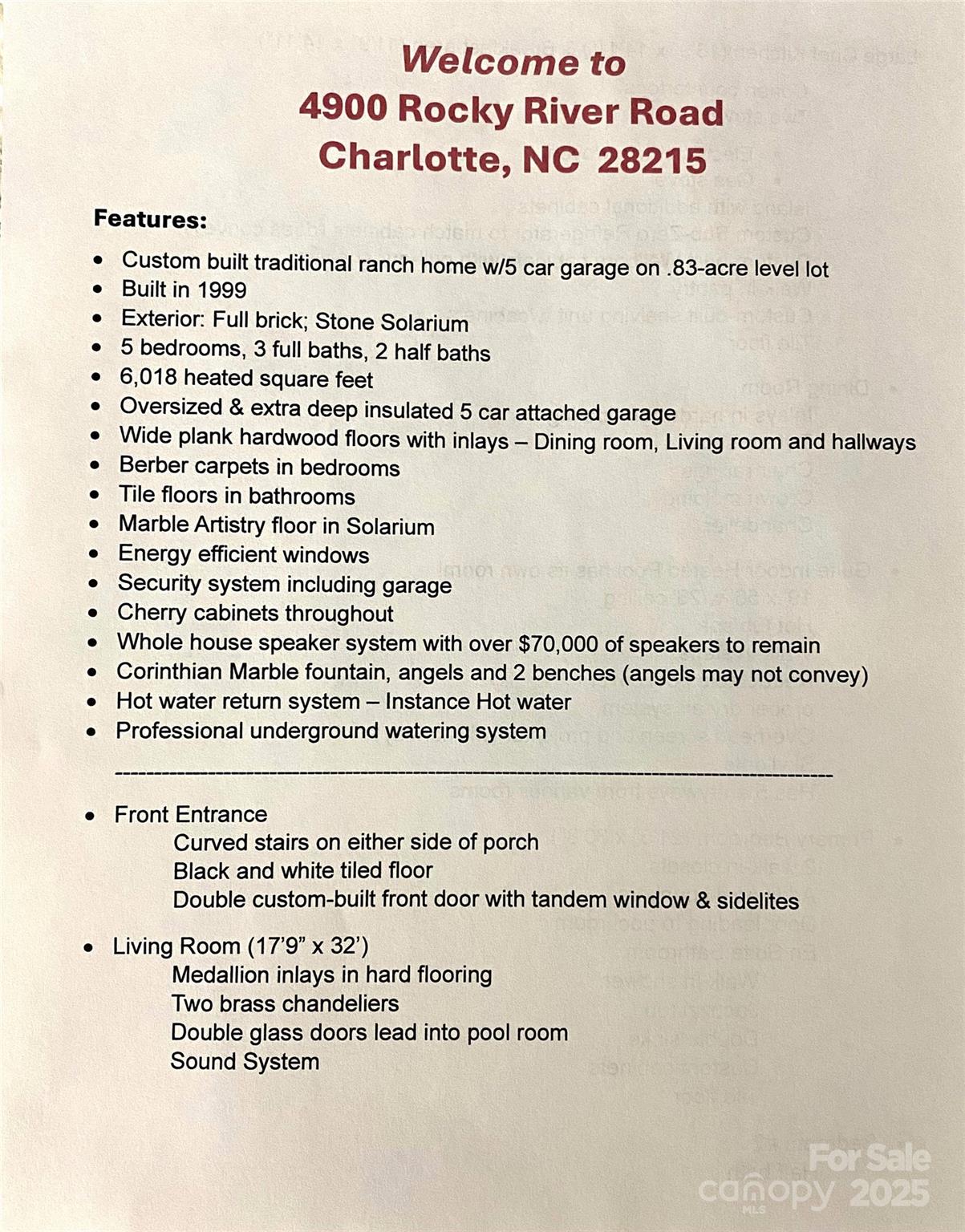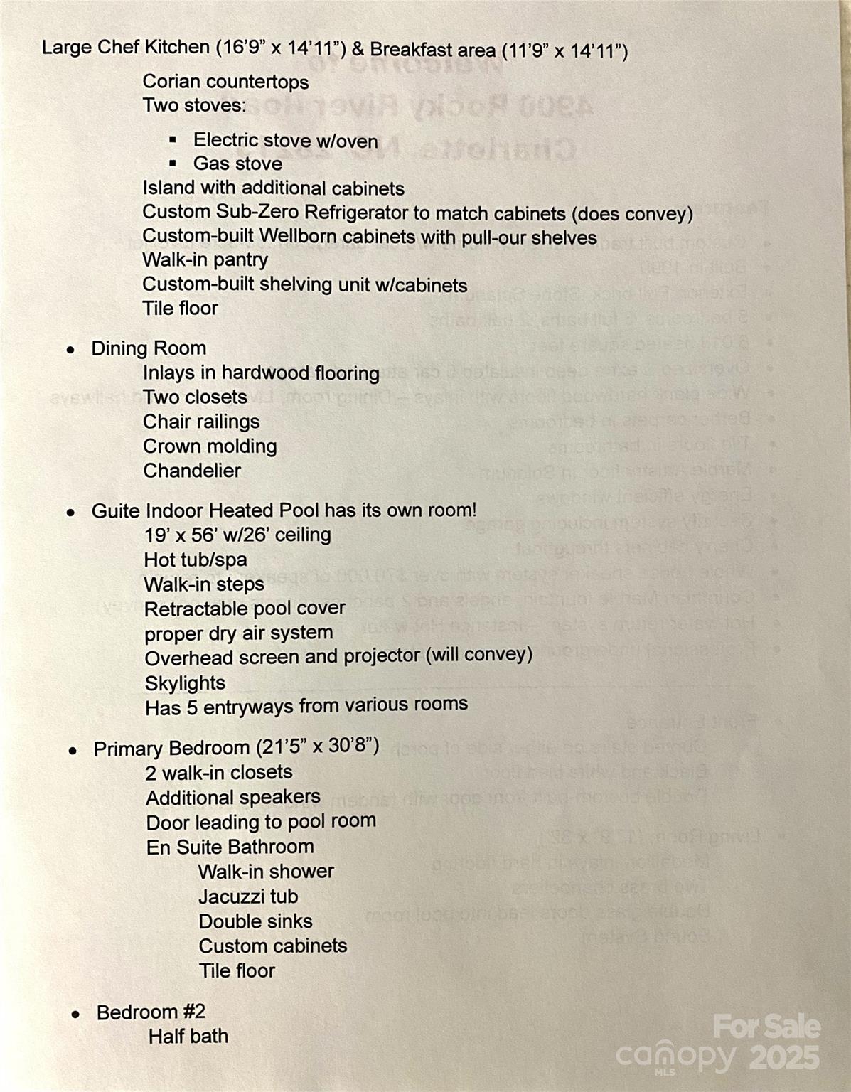 Welcome home! Price just reduced by $100,000! Also seller is offering $30,000 buyer credit at closing for updates with an acceptable offer! This home has many features to enjoy including the gourmet Kit w/ Sub Zero refrigerator which does convey, electric & gas stoves, custom cabinets & Corian c-tops for culinary versatility. The Living room & Dining room have wide plank hardwood floors w/inlays. hardwoods also in hallways. Cherry cabinets throughout add warmth & sophistication. The large indoor heated pool & spa with projector & screen creates your own private entertainment oasis, while the solarium showcases marble artistry floors & Brazilian cherry walls. A marble fountain adds elegant charm, & the grand slate roof ensures lasting durability. $70K+ surround sound system throughout the home enhances the home's entertainment value. The oversized 5-car finished garage (3 bays are heated) provides ample parking & storage, while the hot water return system & inground irrigation add modern convenience. Quality details incl premium materials & thoughtful design elements. This home provides an excellent foundation for creating your dream home. See extensive features list in photo section. Seller is providing a one-year 2-10 Supreme Home Warranty coverage. Outside angel statues may not convey. Tub in primary bath is a Jacuzzi, not garden tub. Located near UNC-Charlotte, Hospital, restaurants, shopping, Charlotte Motor Speedway, Concord Mills, PNC Music Pavilion & more! Close to I-485. This home be excellent for anyone affiliated with the Speedway. With no HOA the home would also be a perfect opportunity as an Airbnb or VRBO investment!